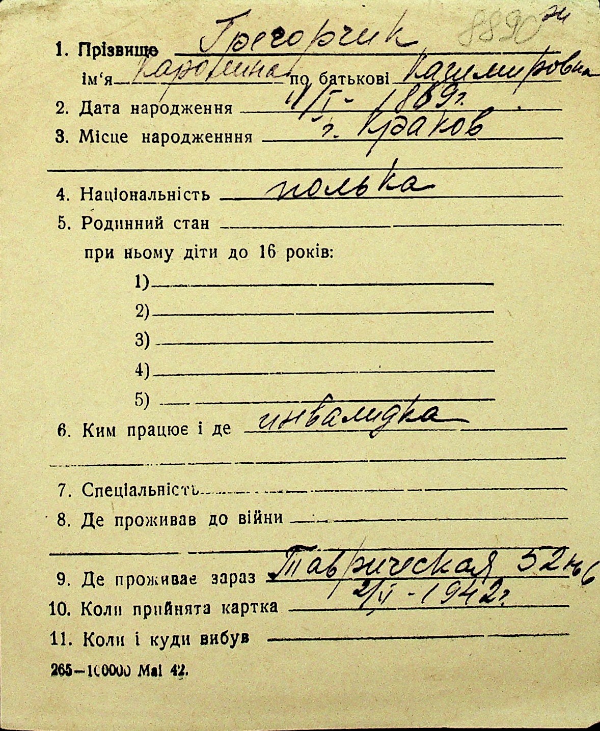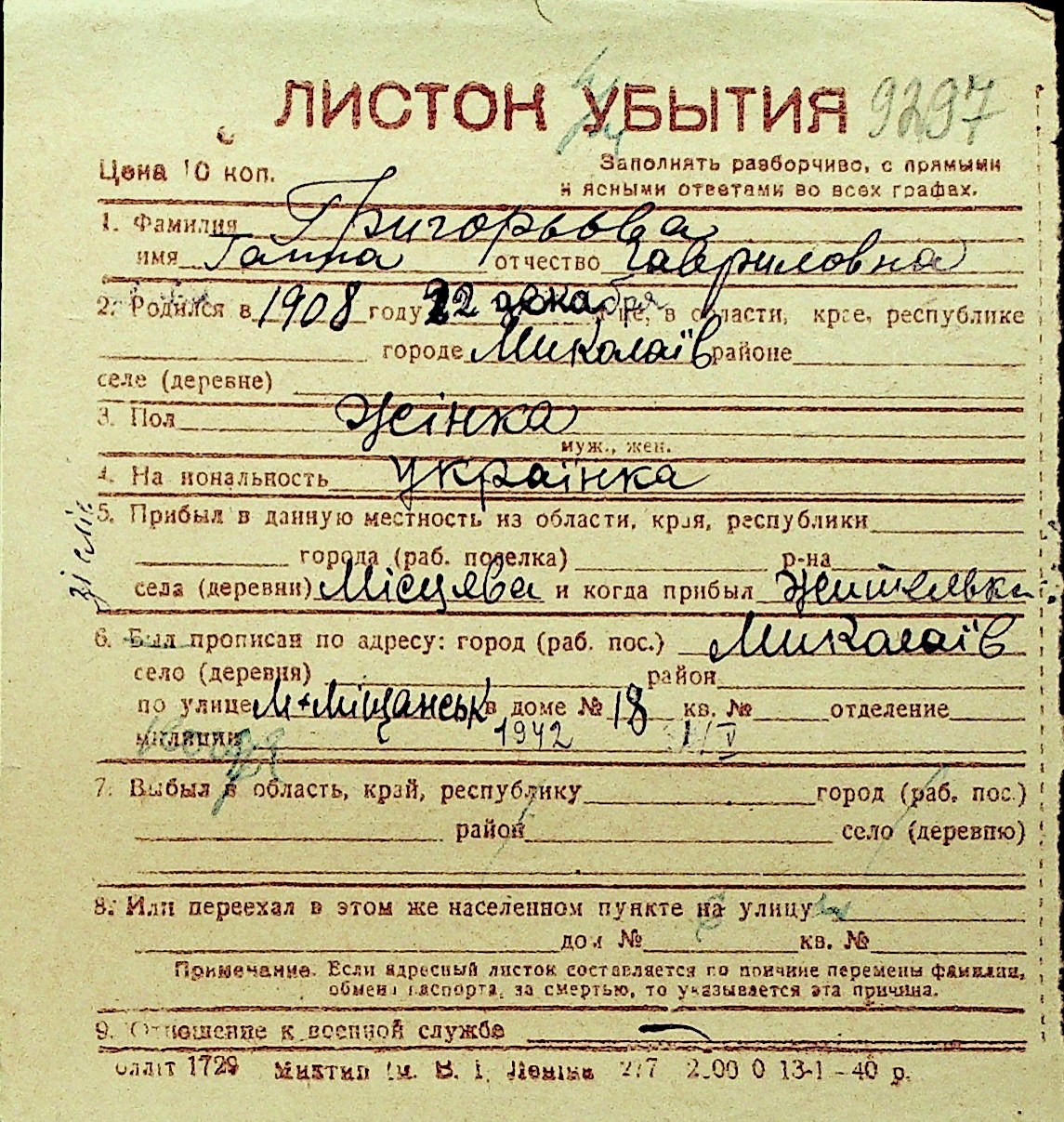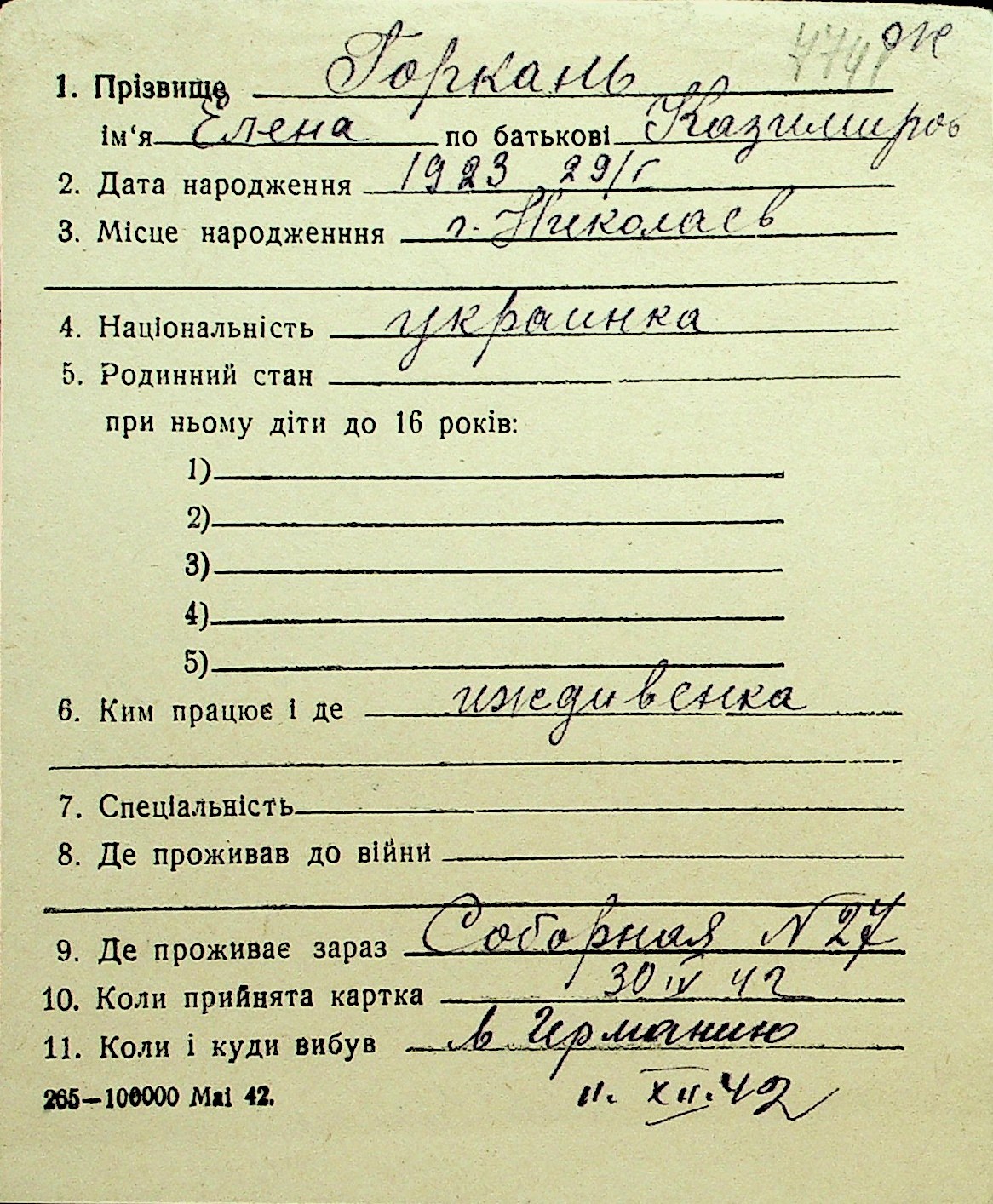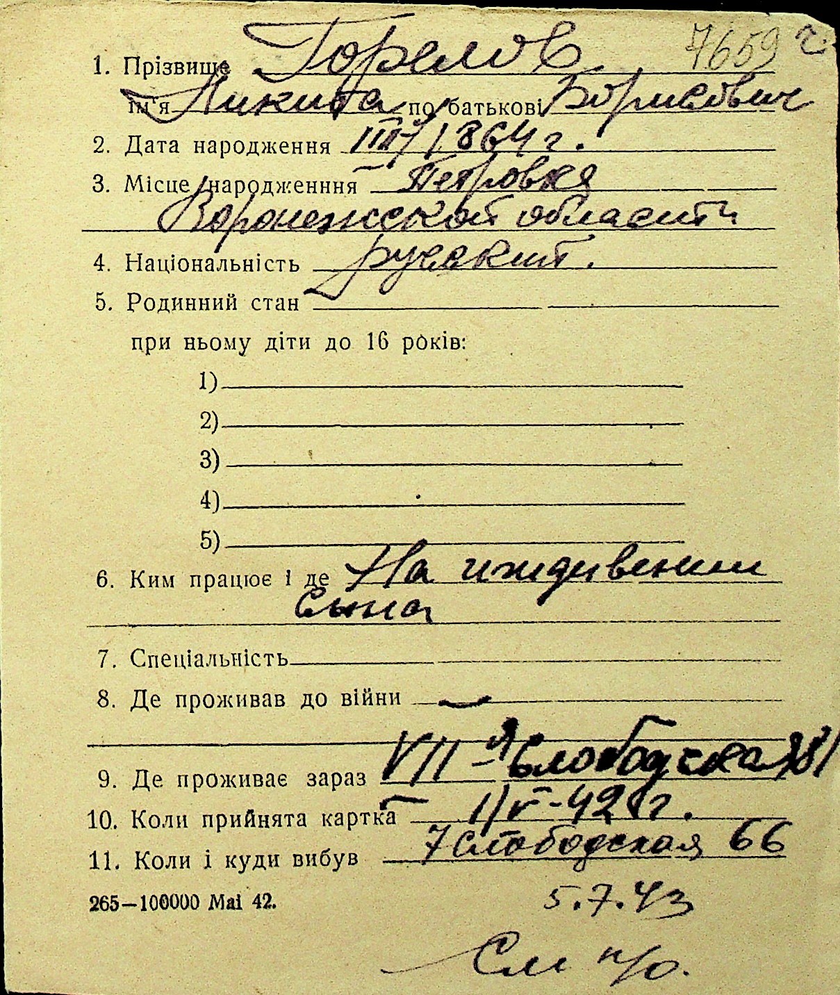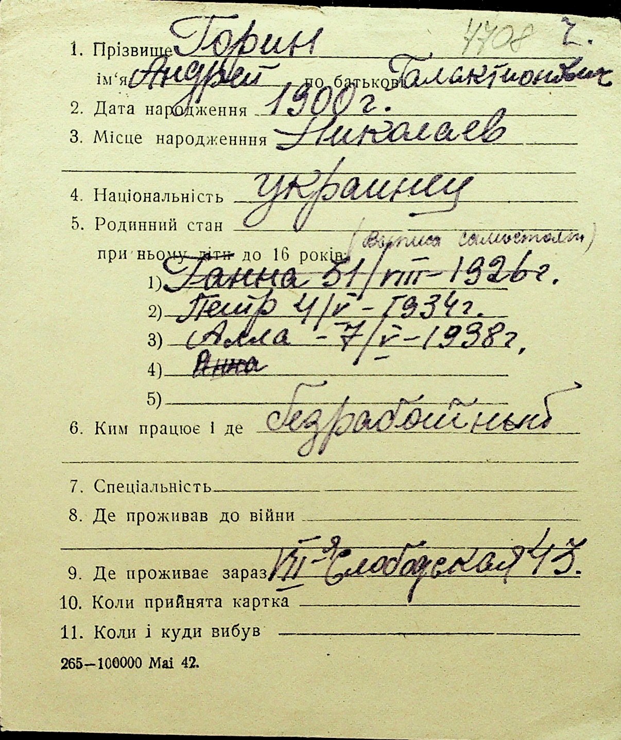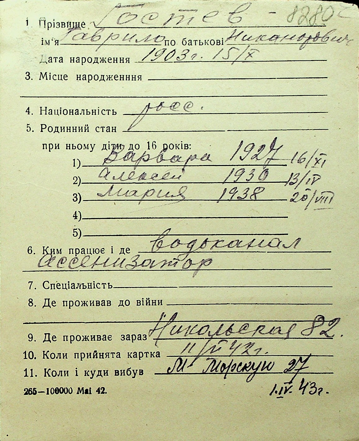 • • Перелік карток до фонду № Н-1016