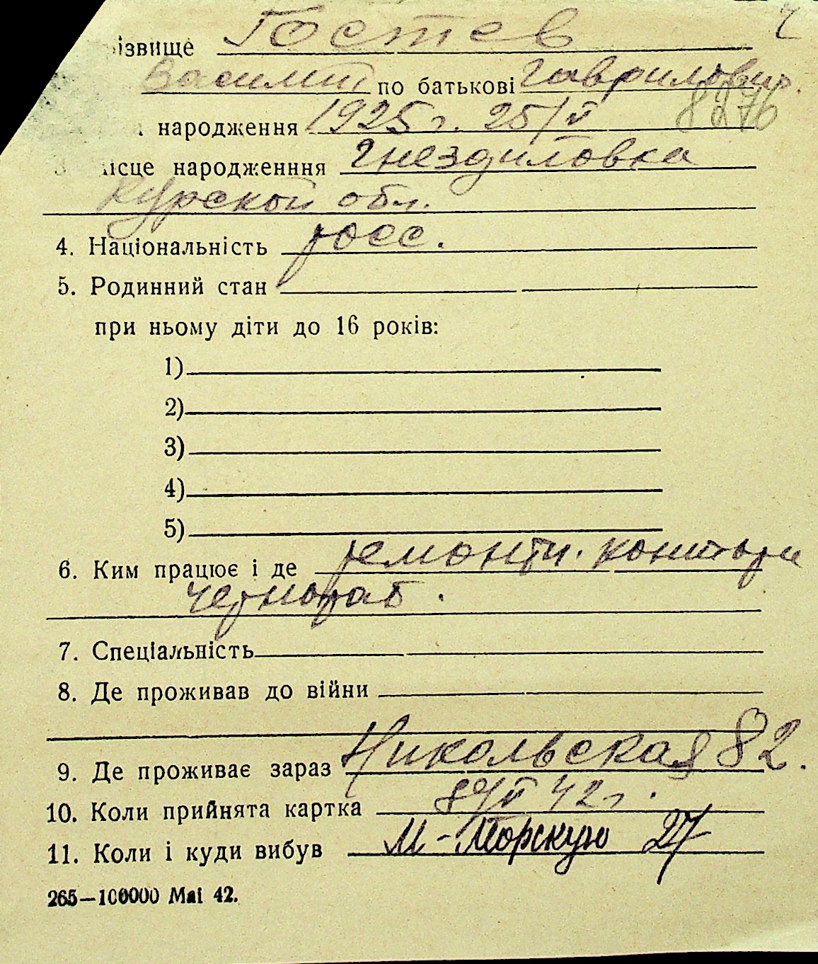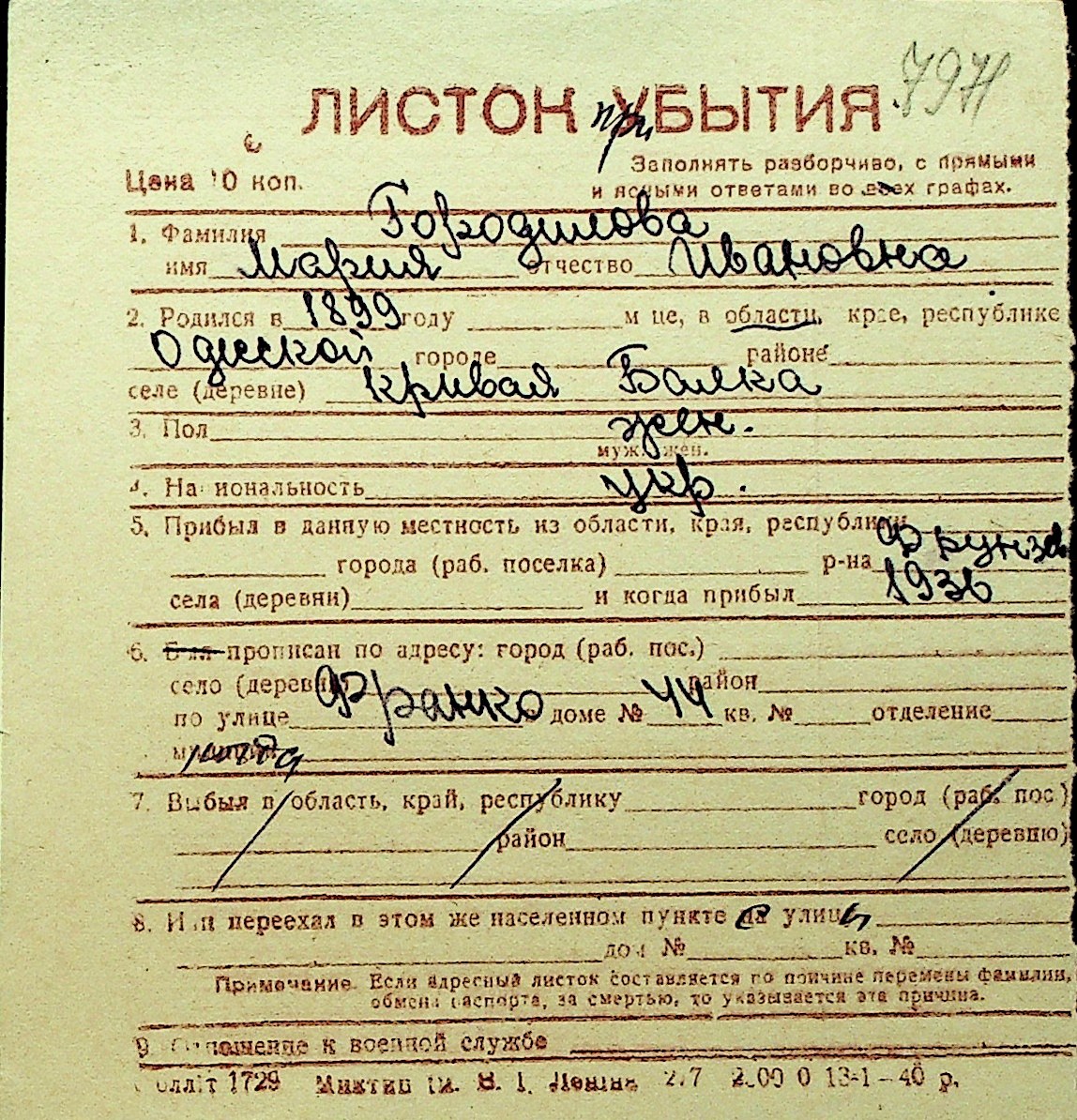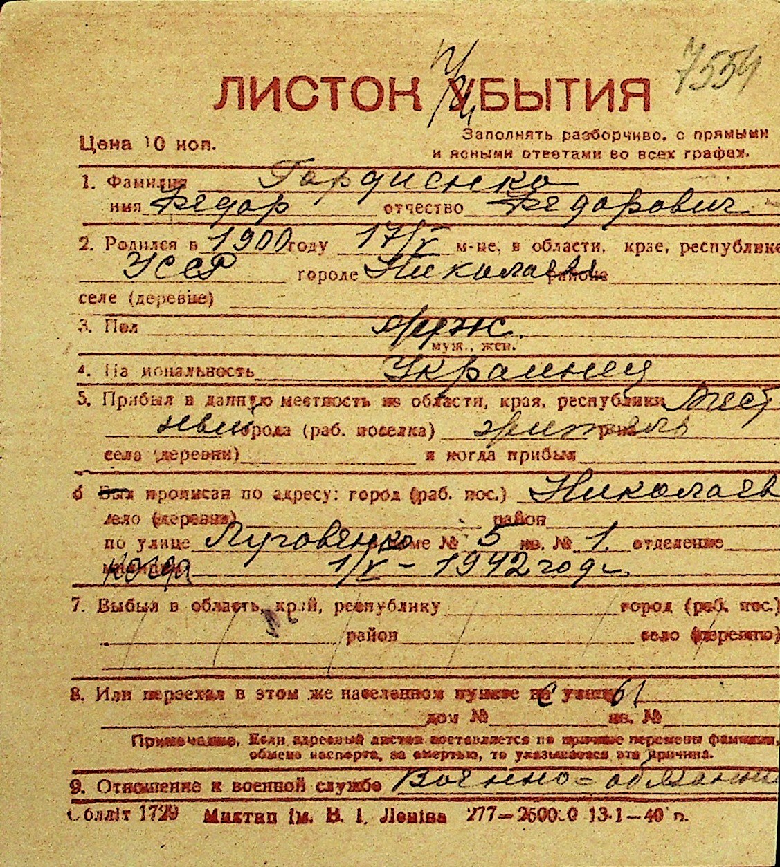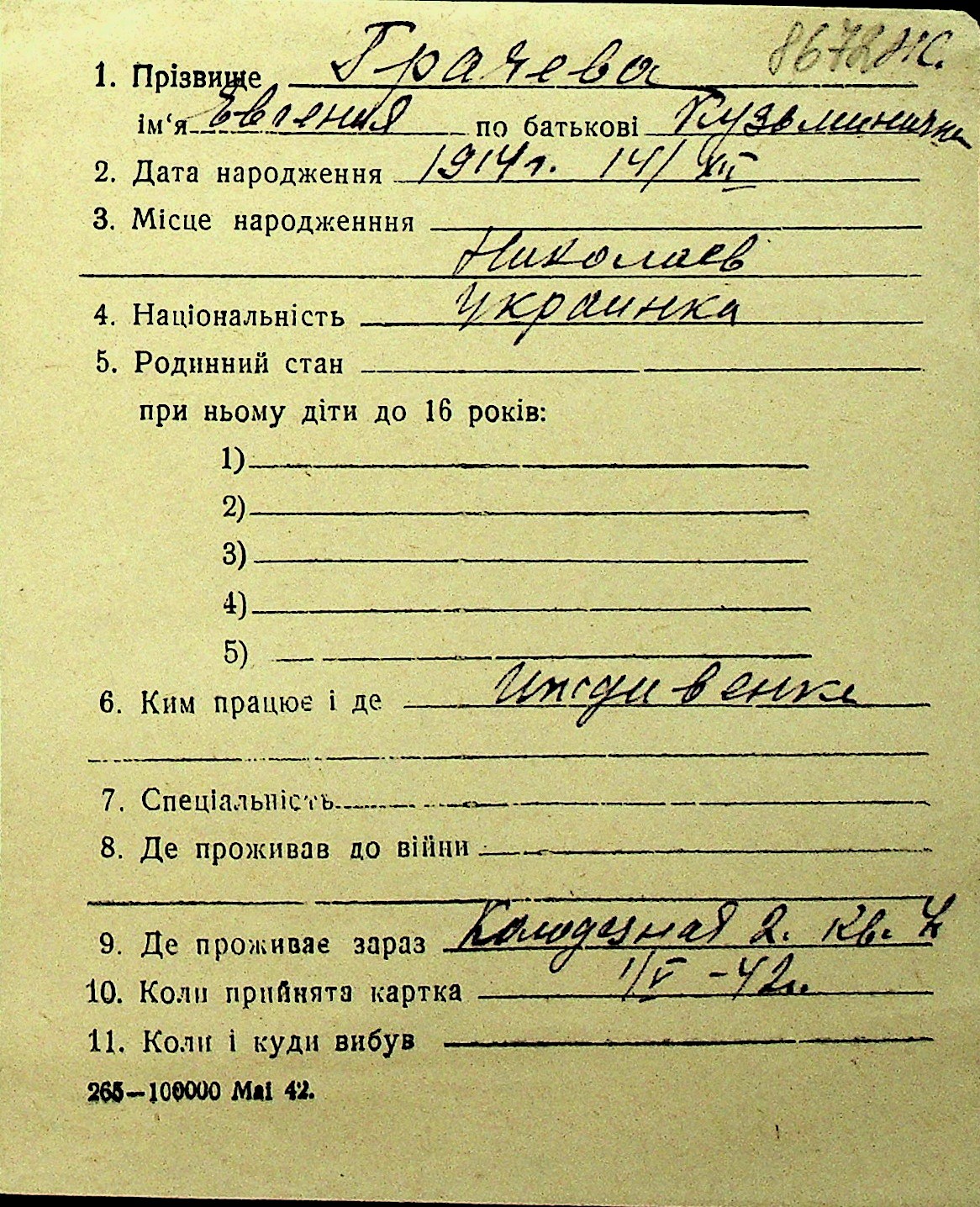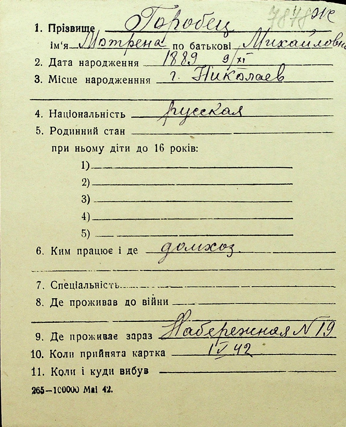 • • Перелік карток до фонду № Н-1016