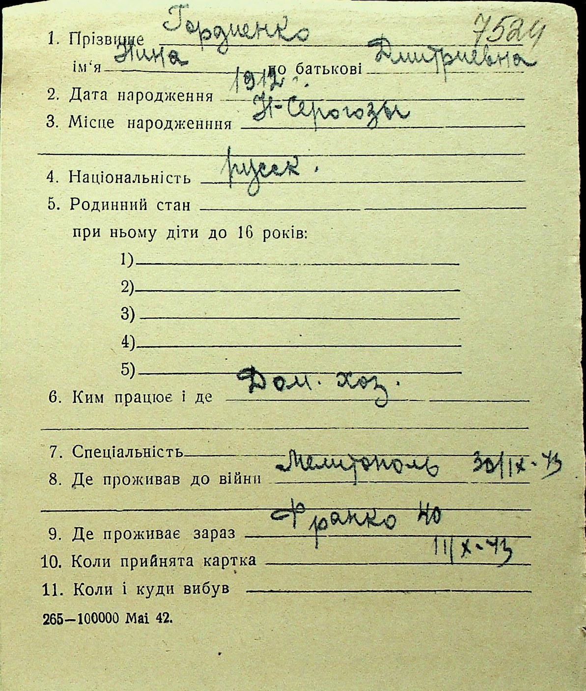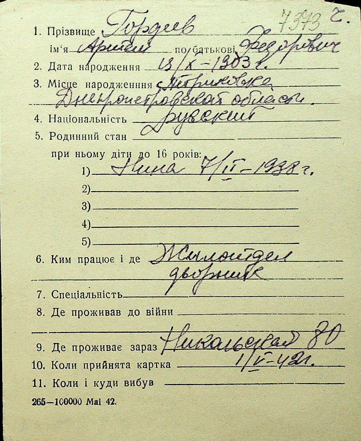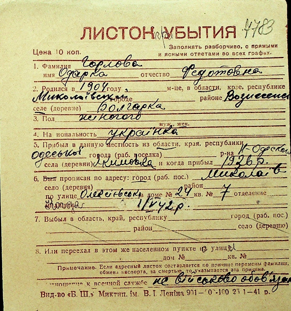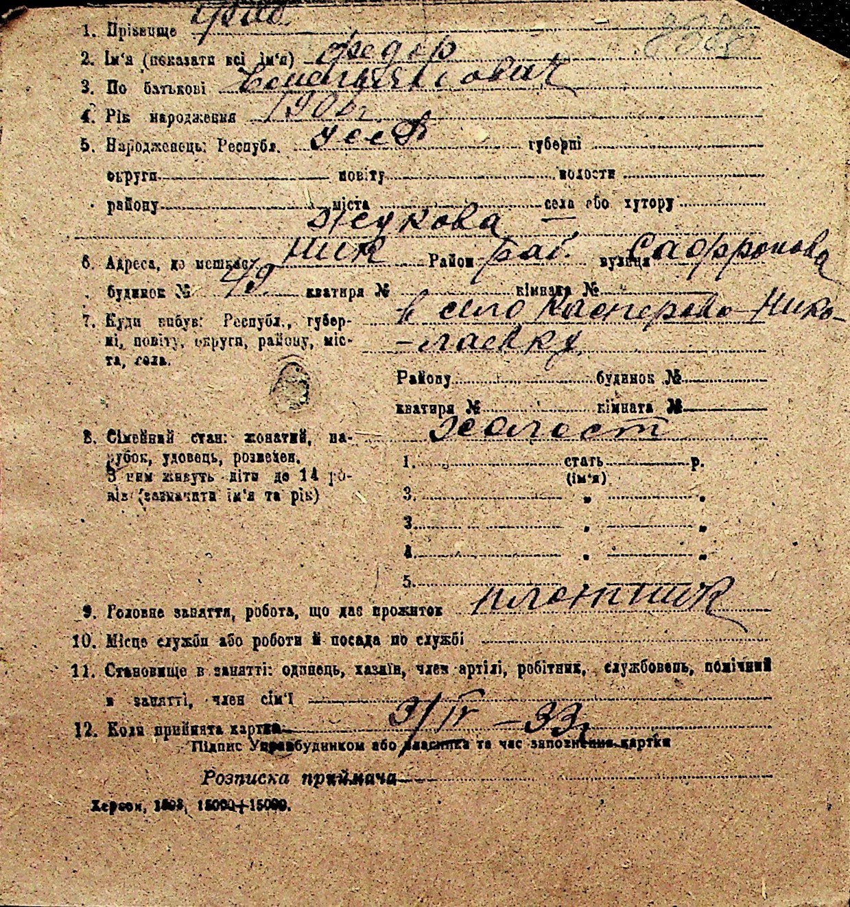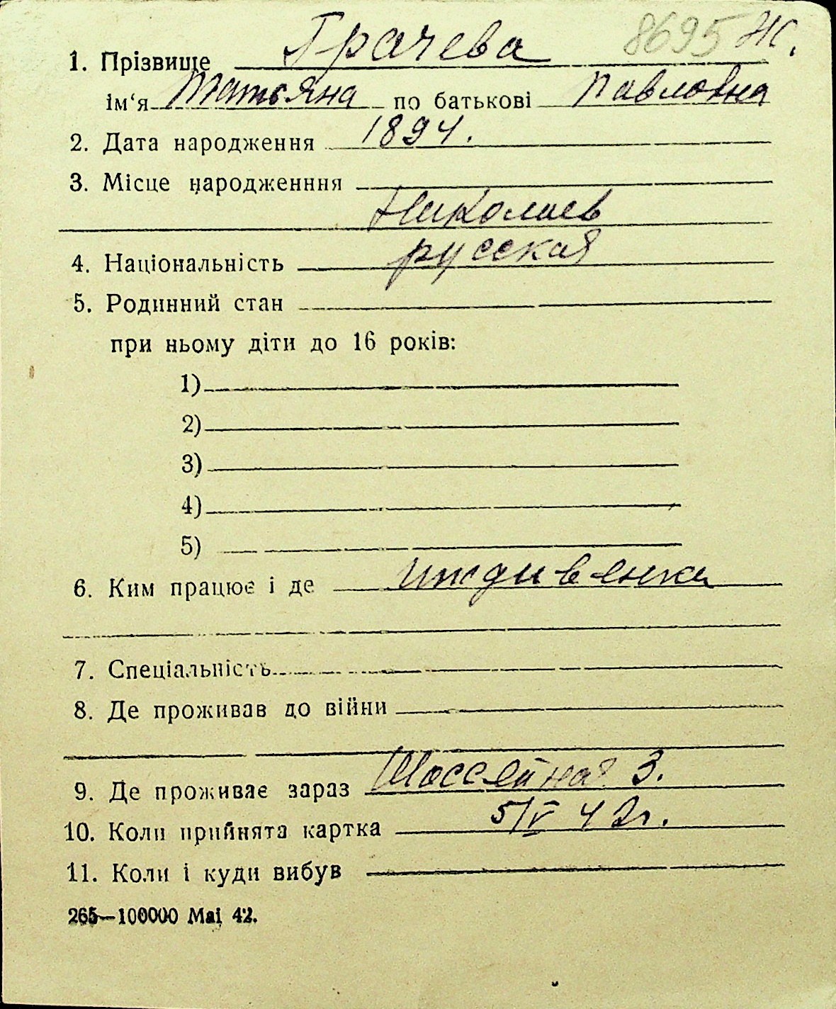 • • Перелік карток до фонду № Н-1016