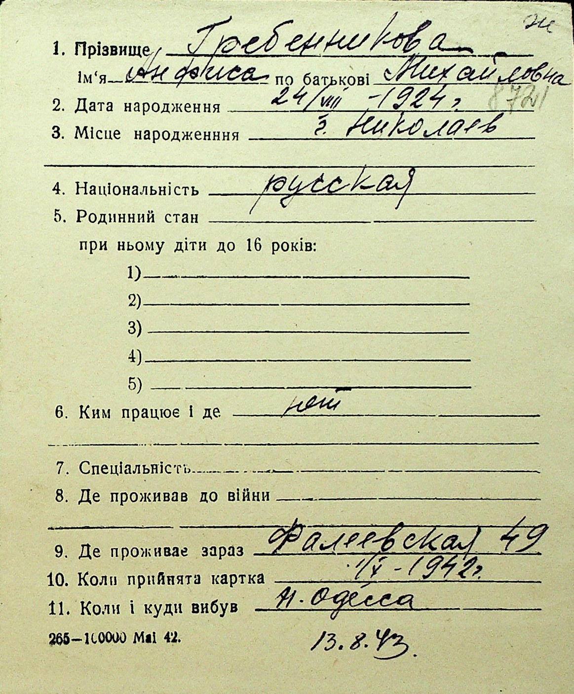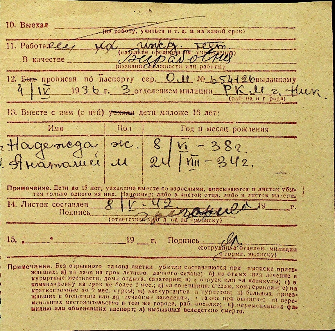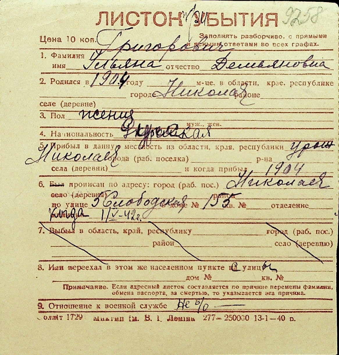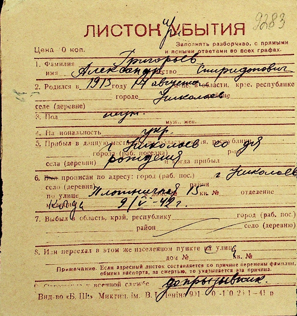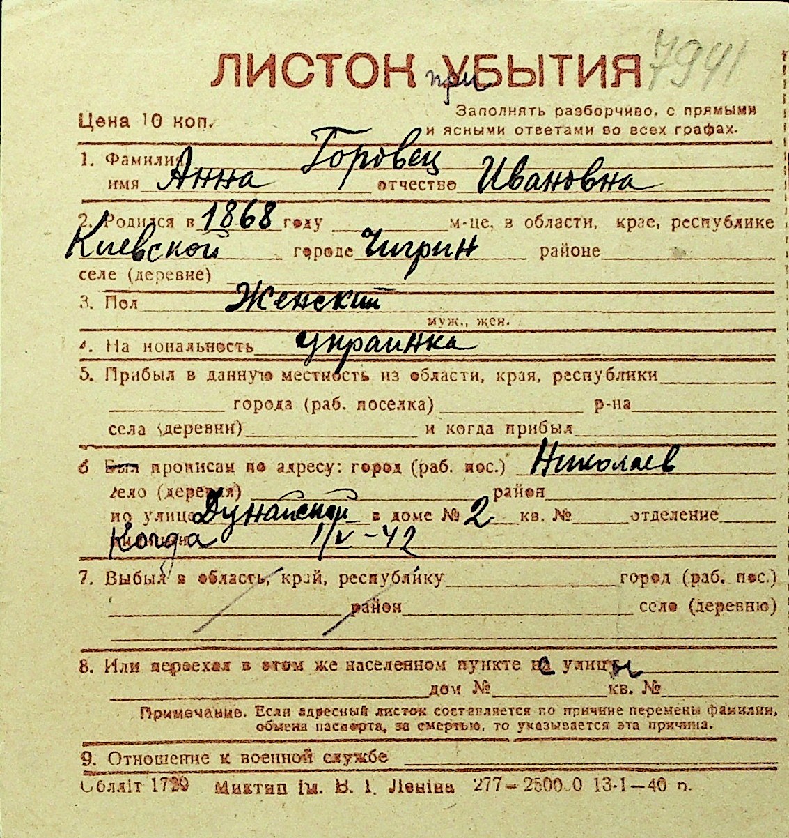 • • Перелік карток до фонду № Н-1016
