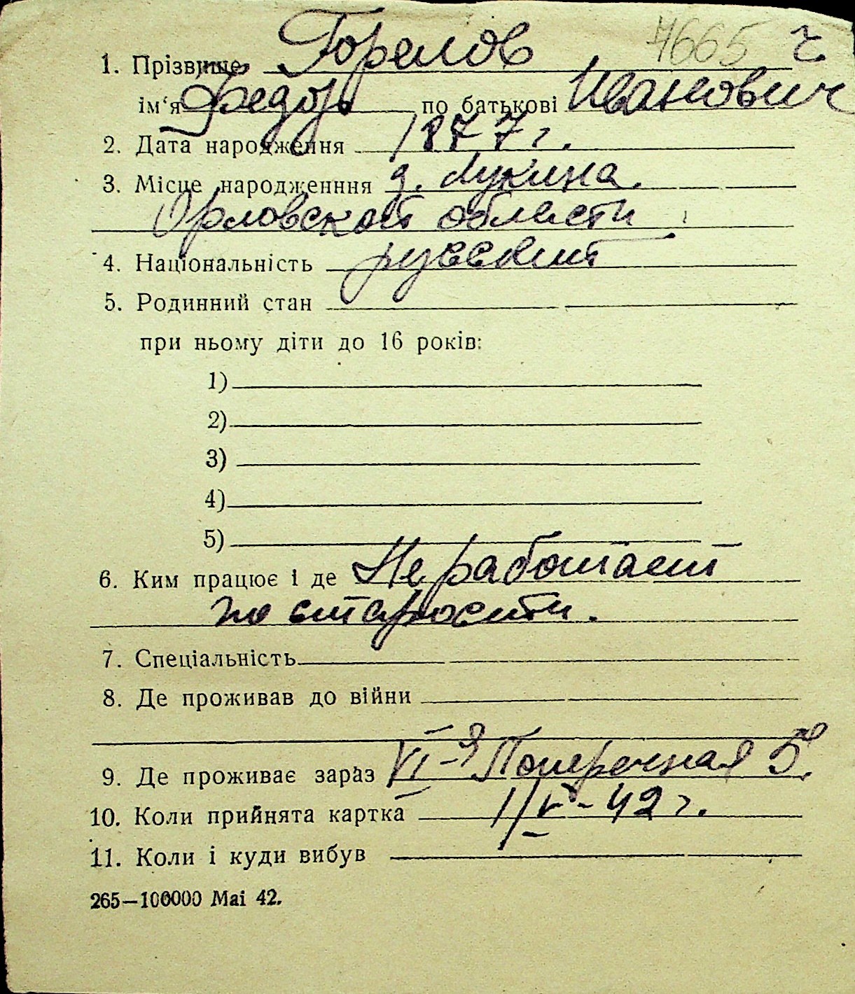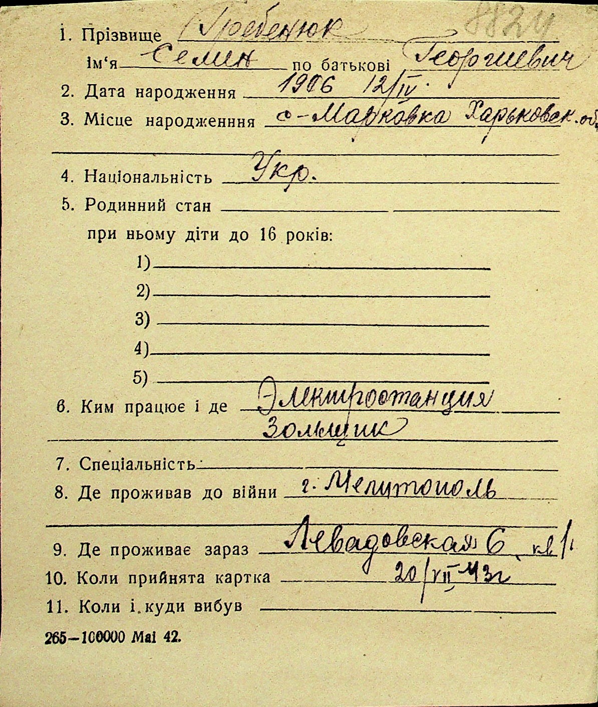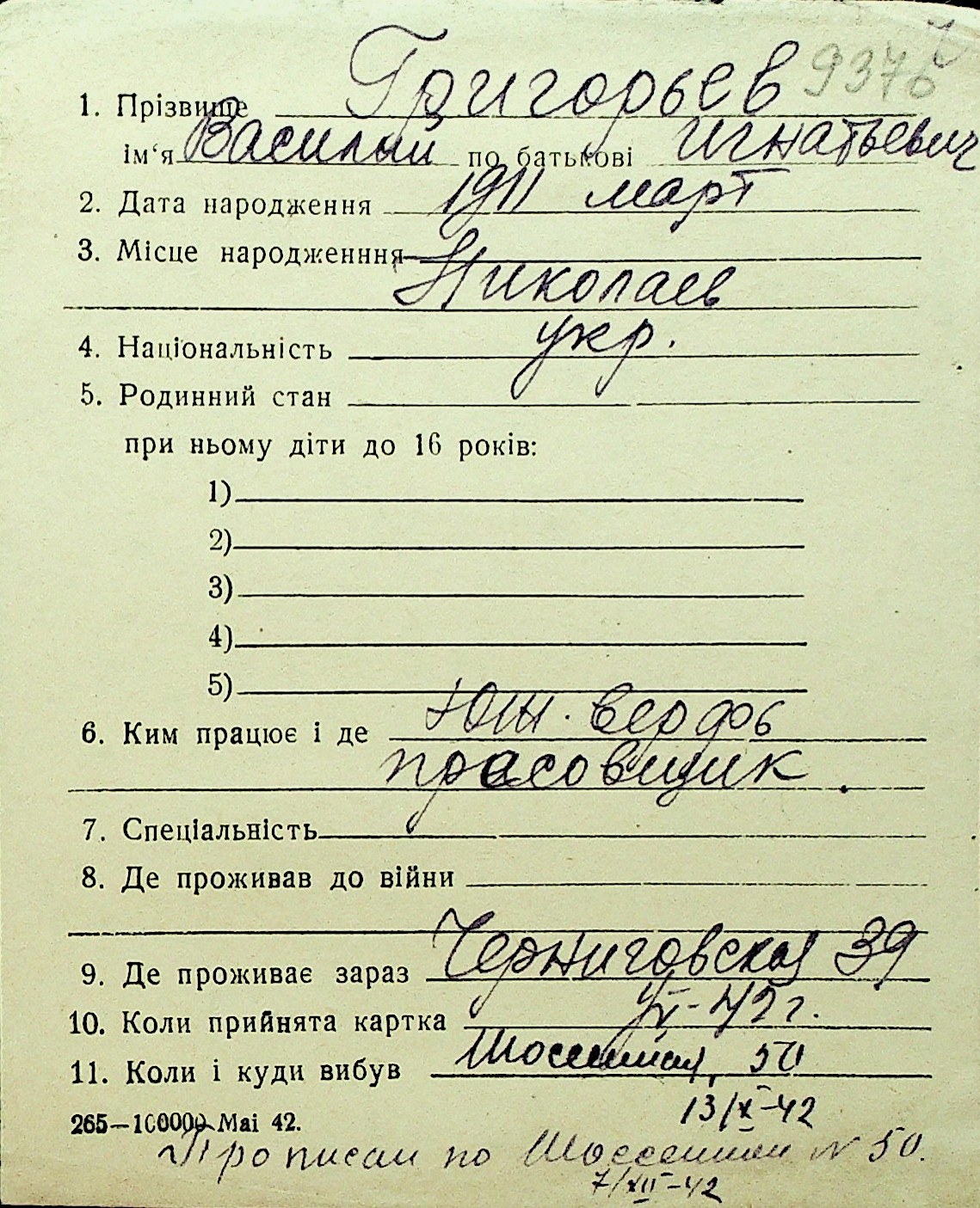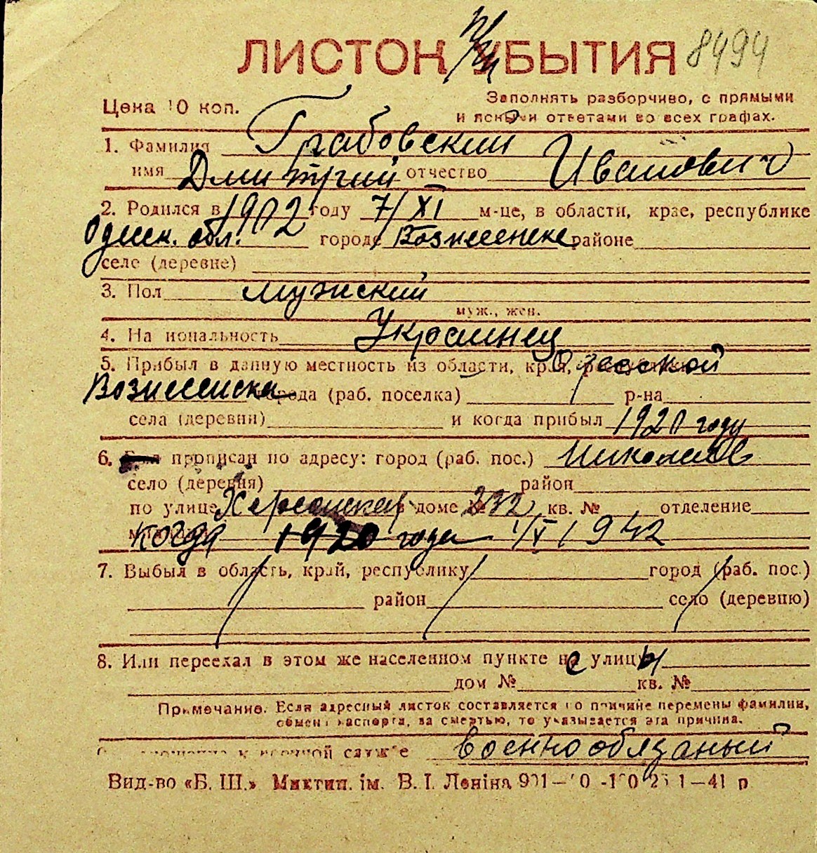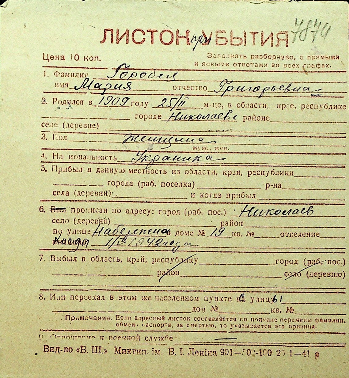 • • Перелік карток до фонду № Н-1016
