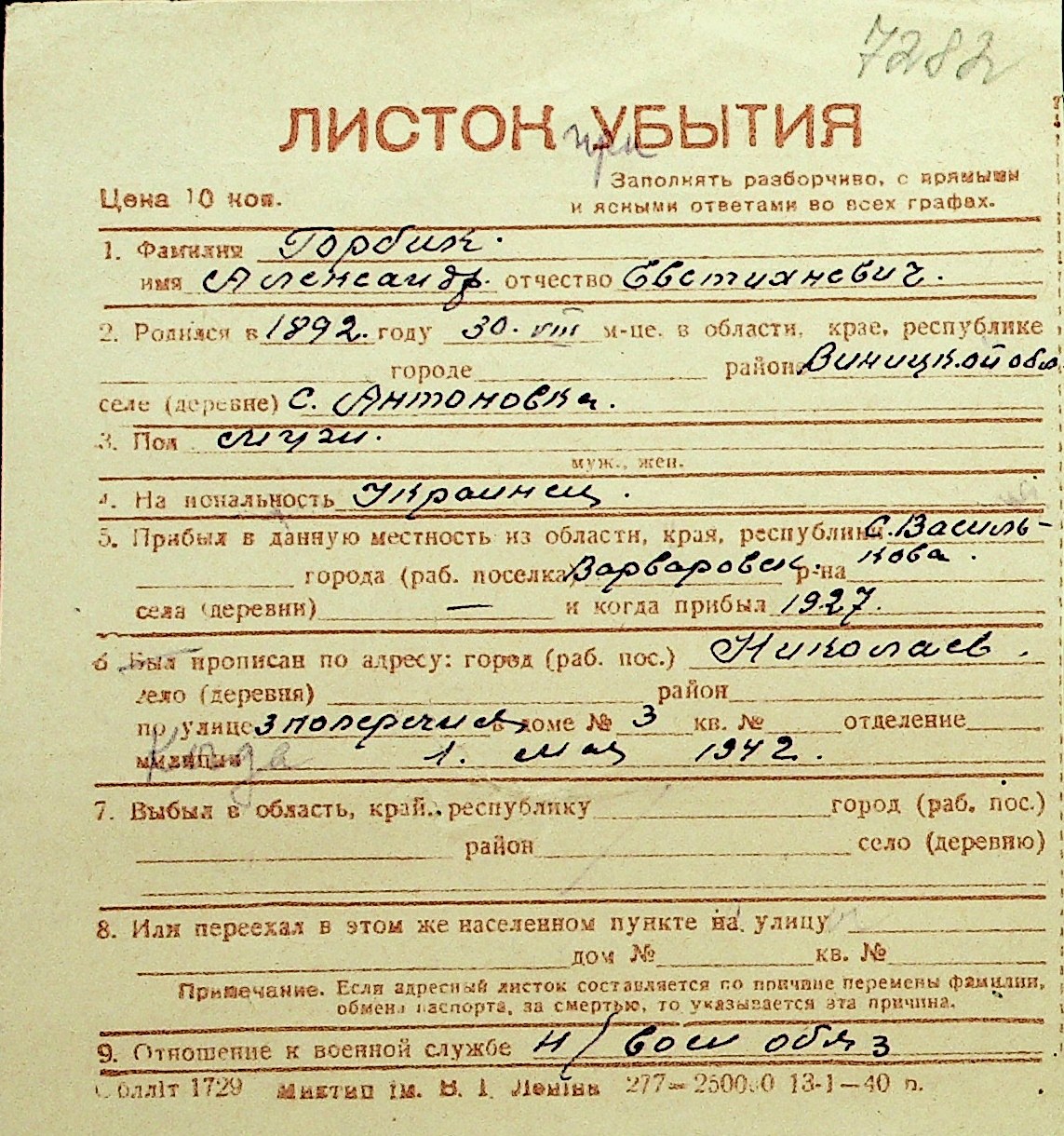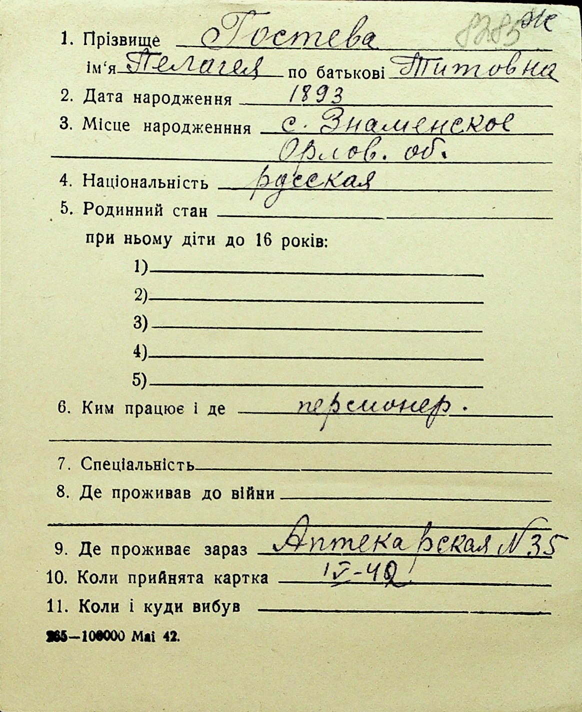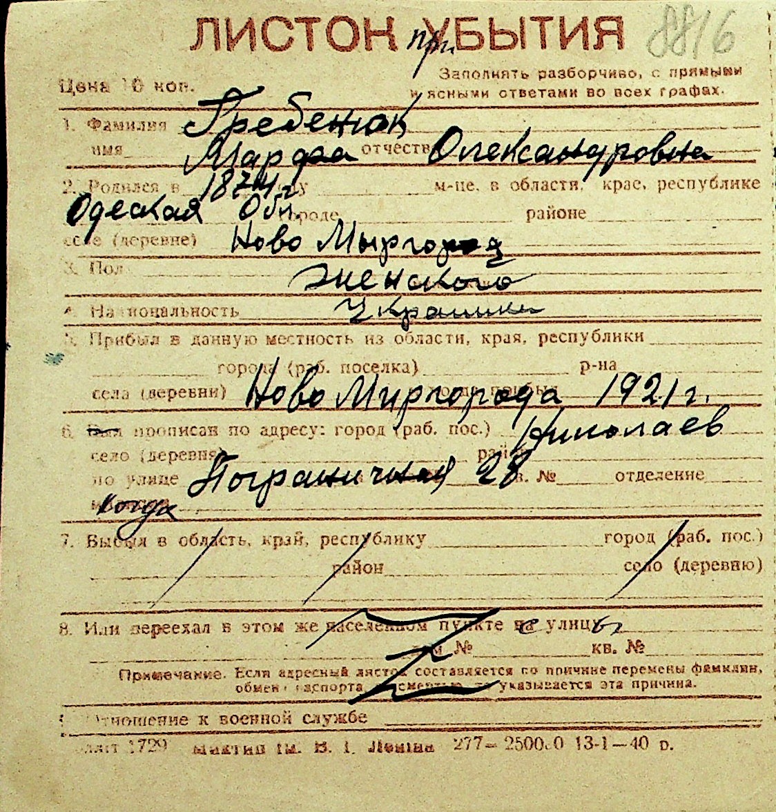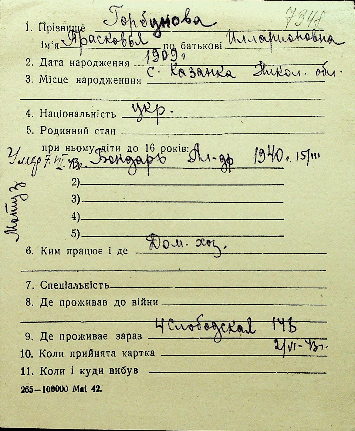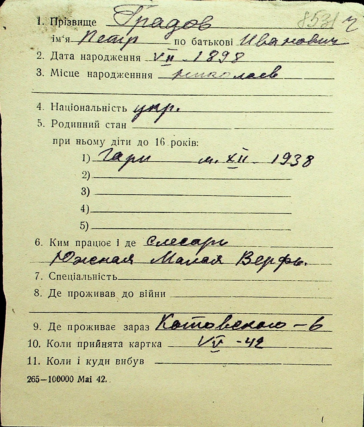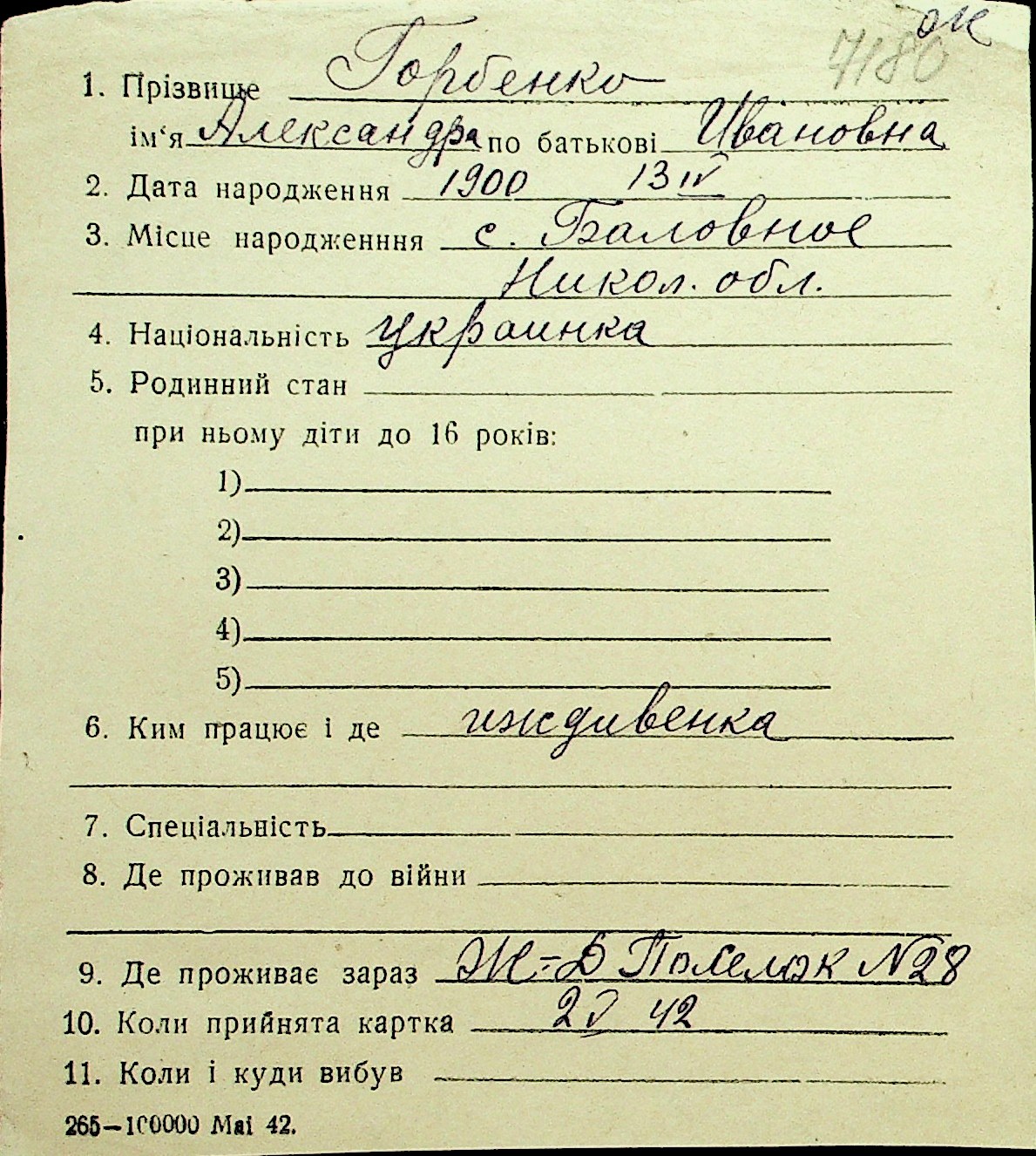 • • Перелік карток до фонду № Н-1016