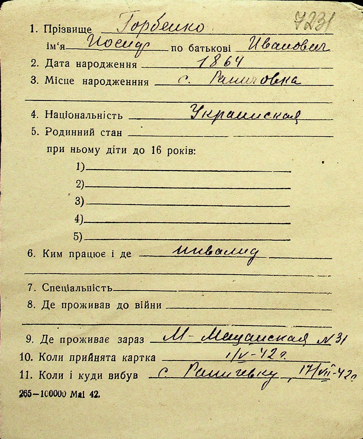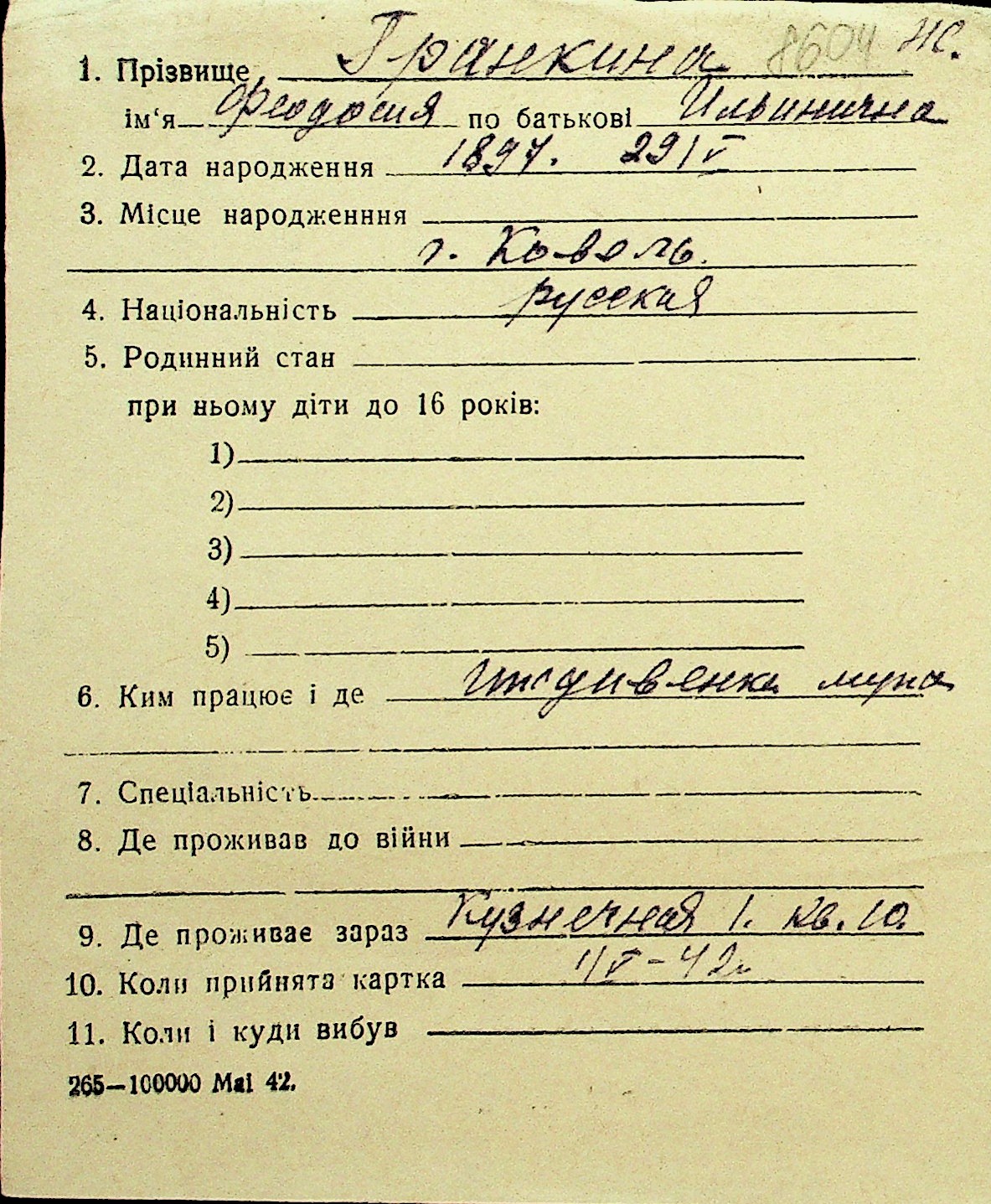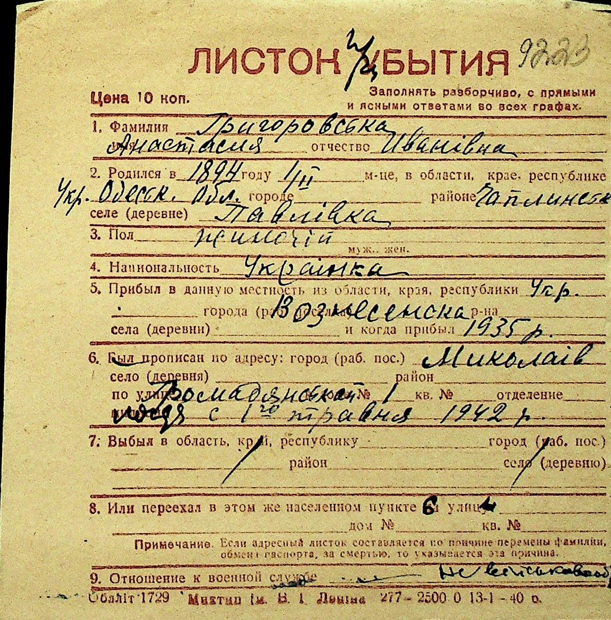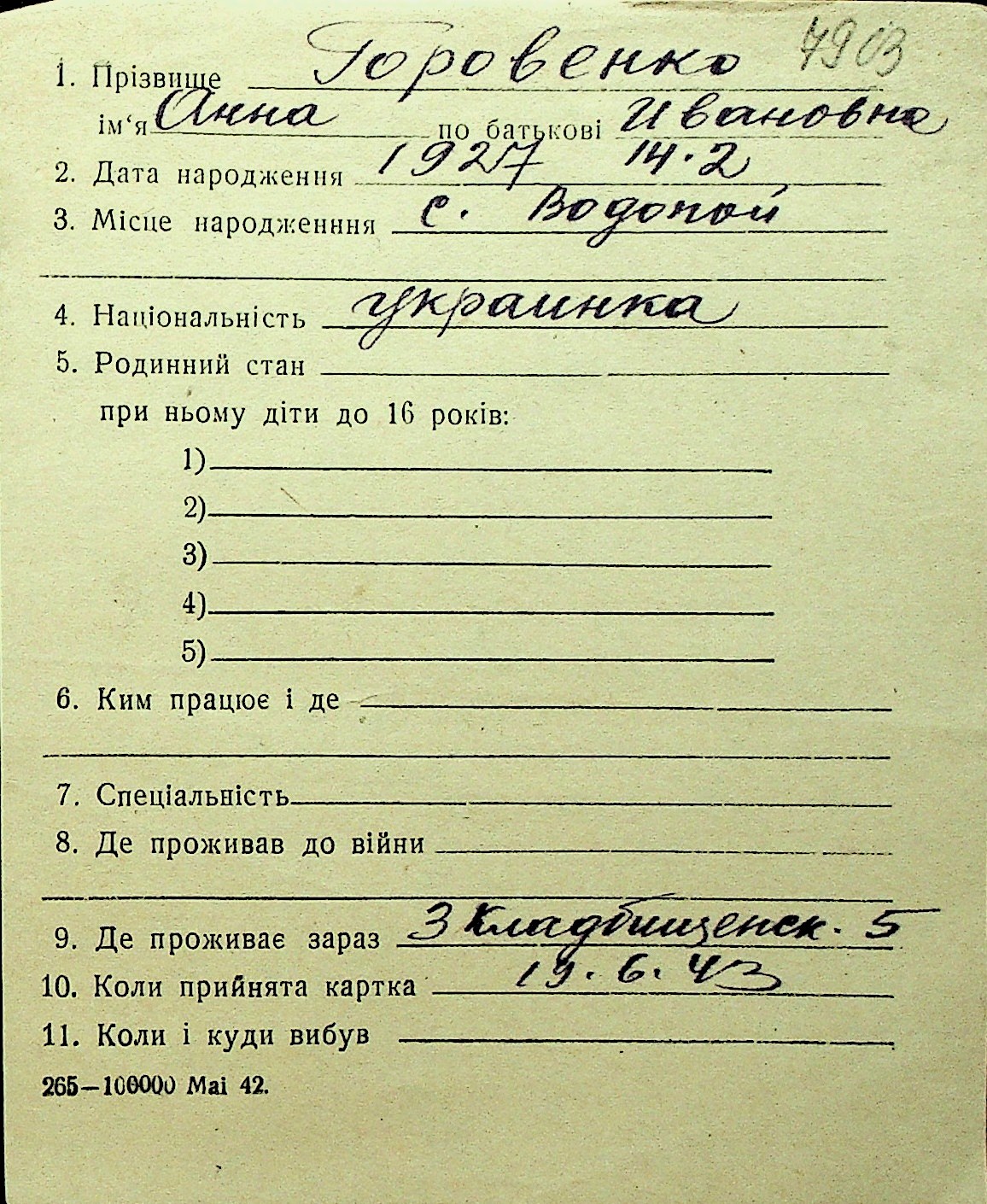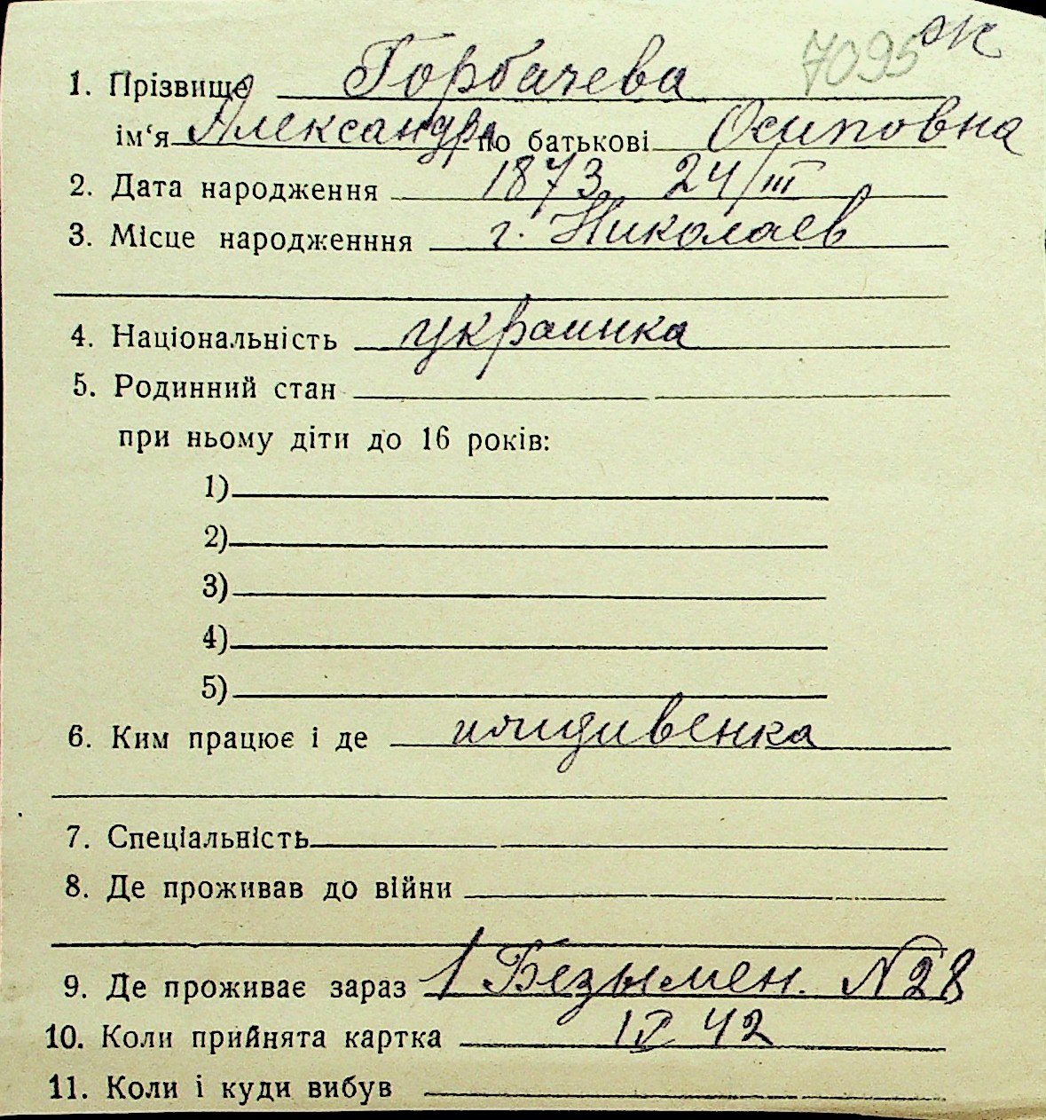 • • Перелік карток до фонду № Н-1016