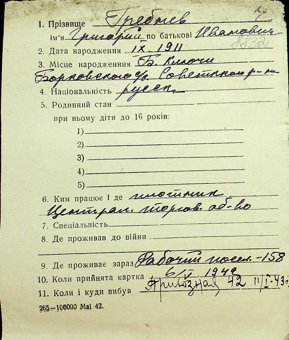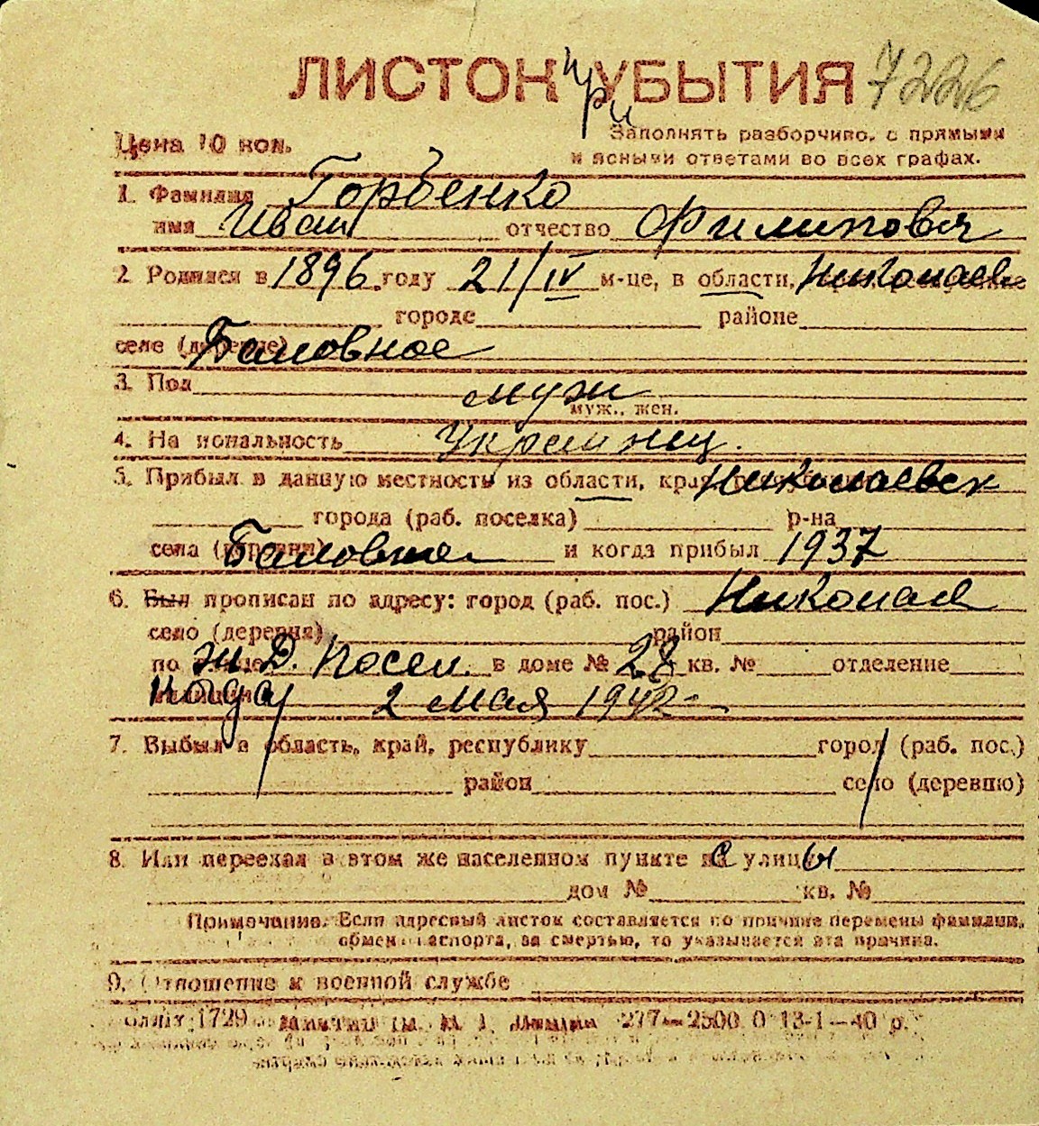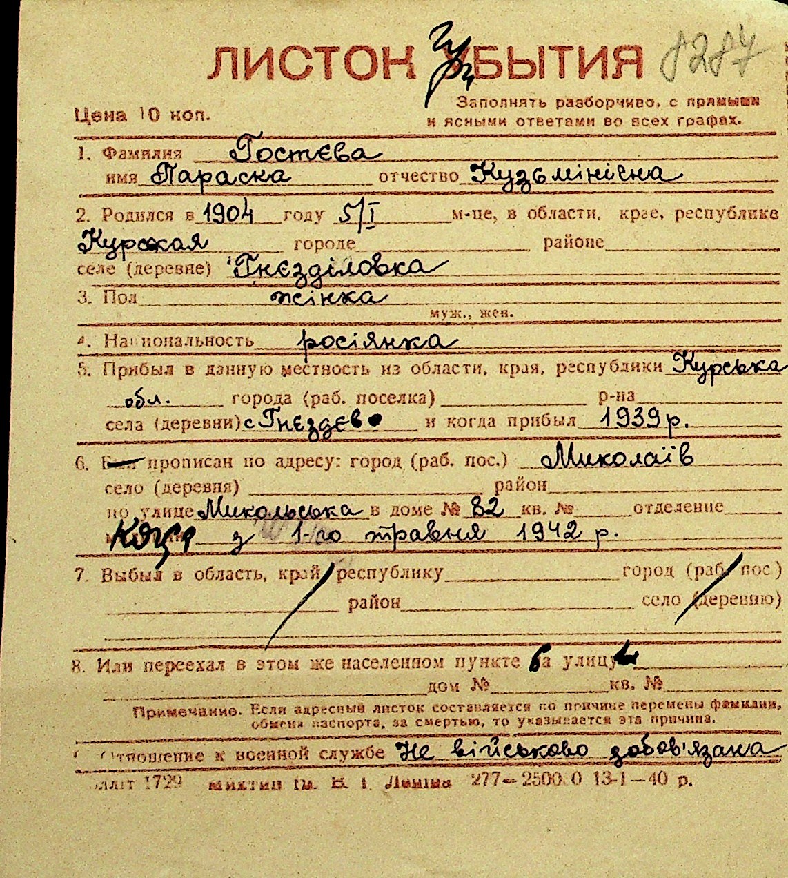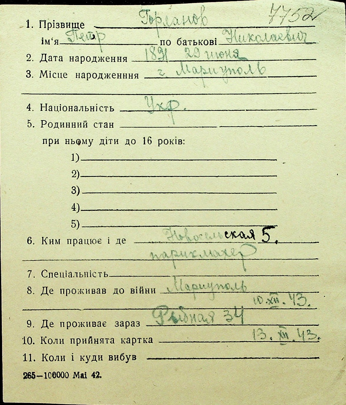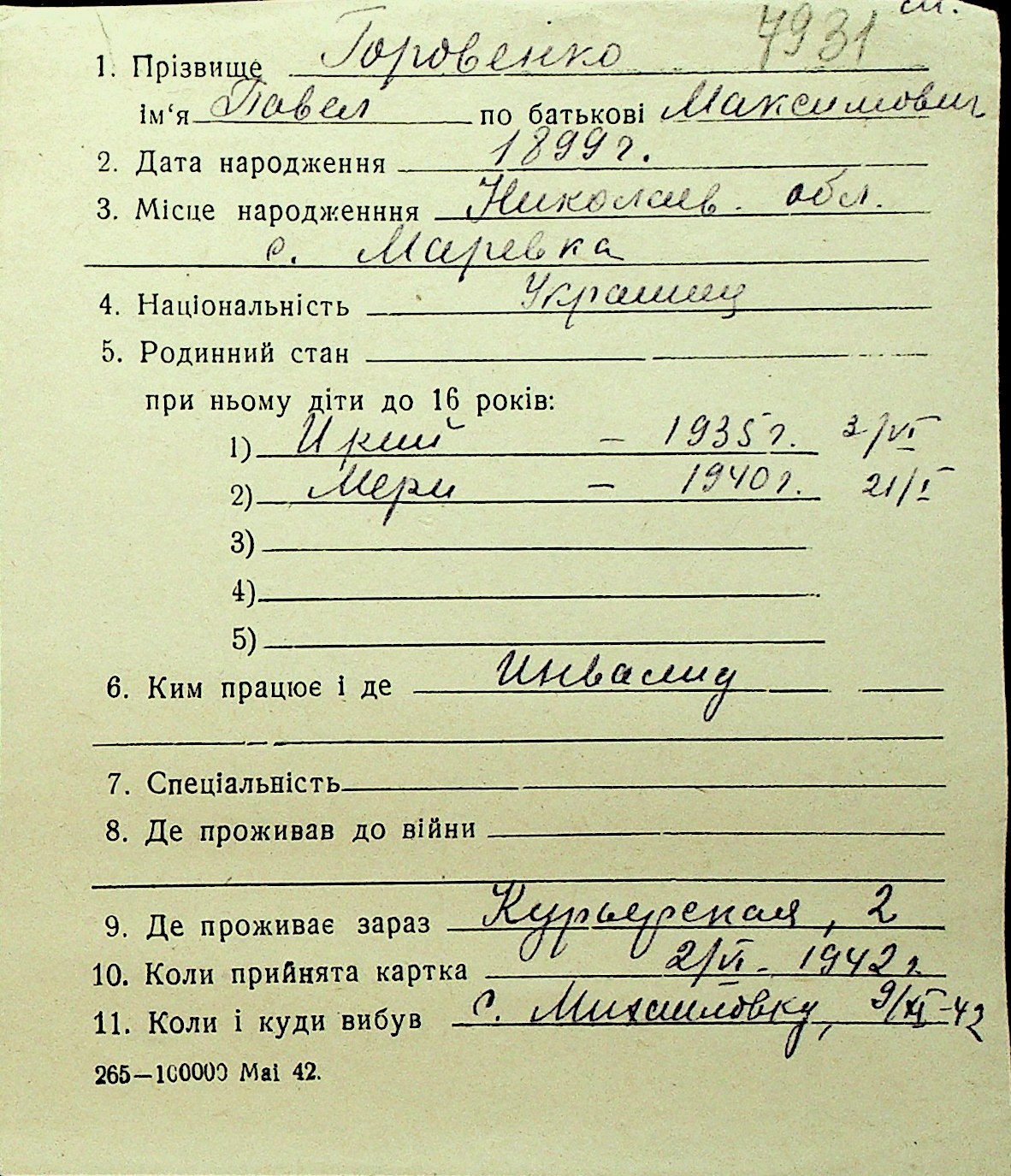 • • Перелік карток до фонду № Н-1016