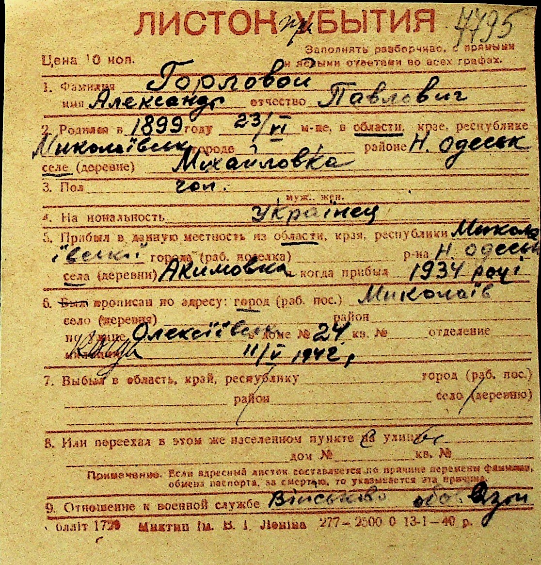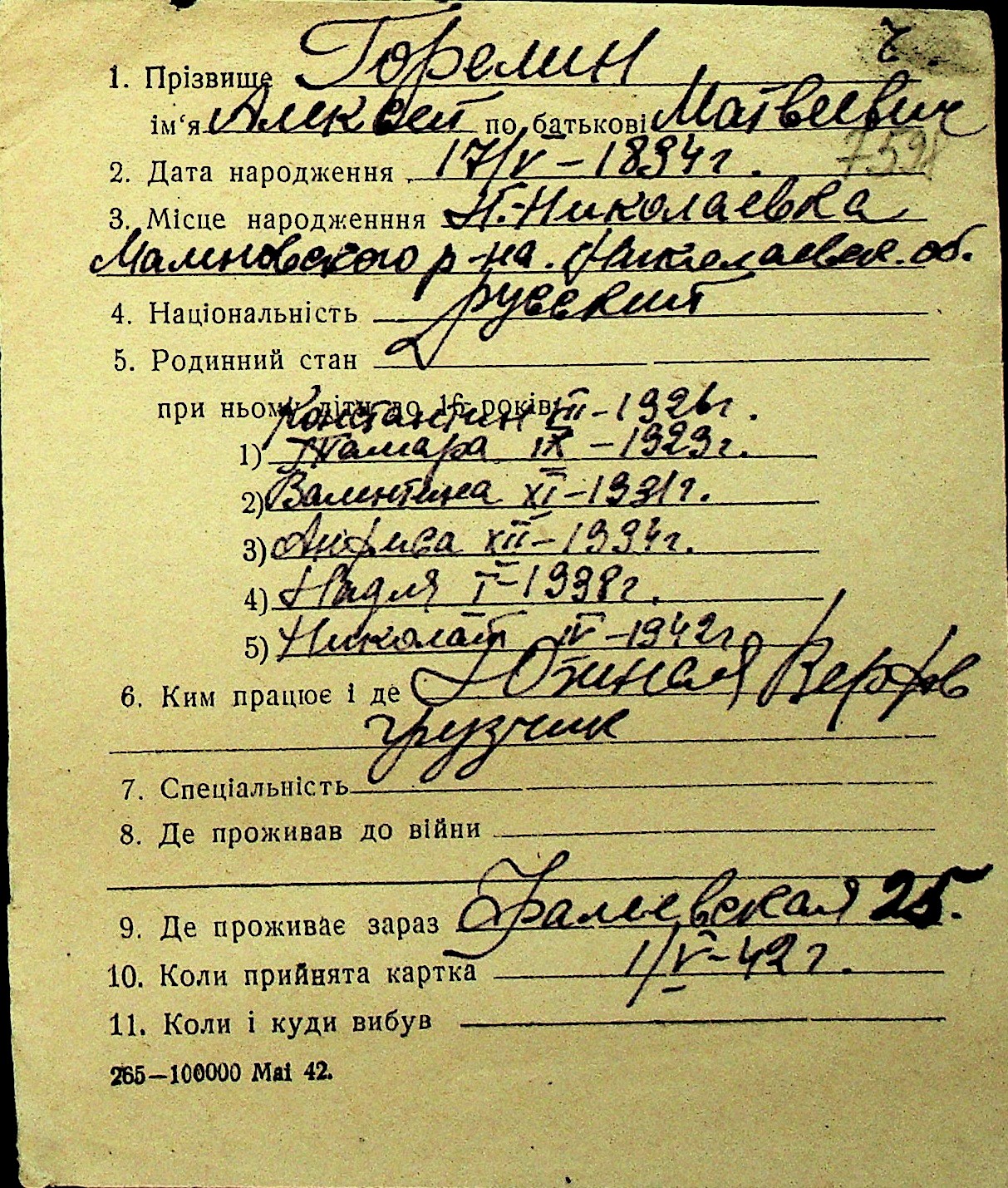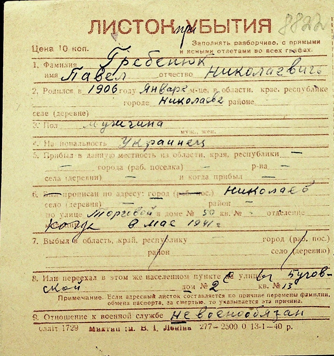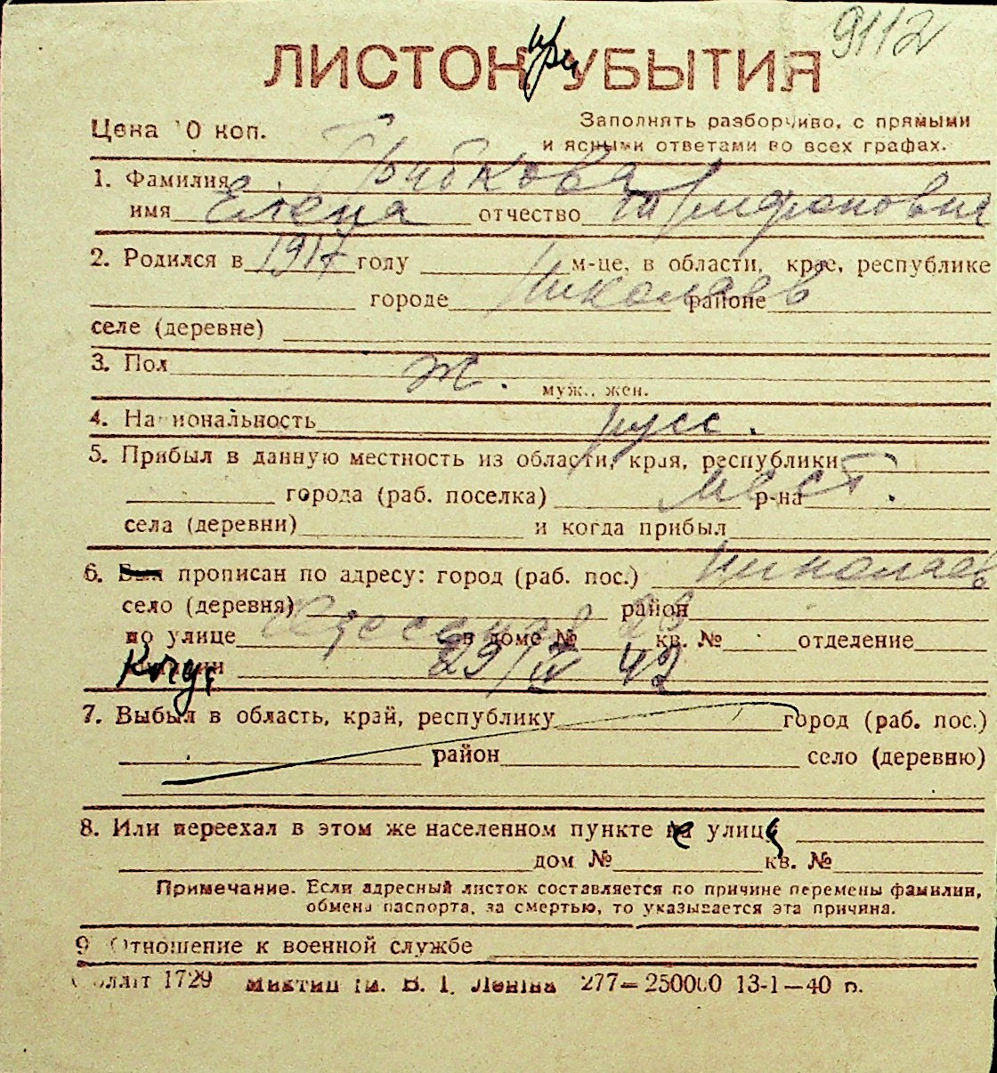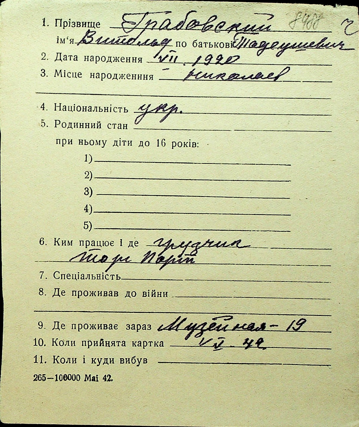 • • Перелік карток до фонду № Н-1016
