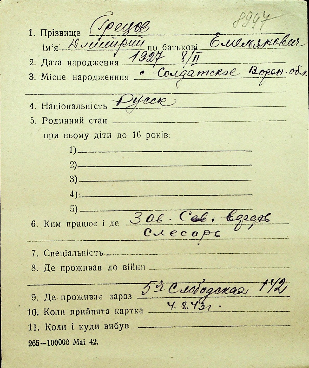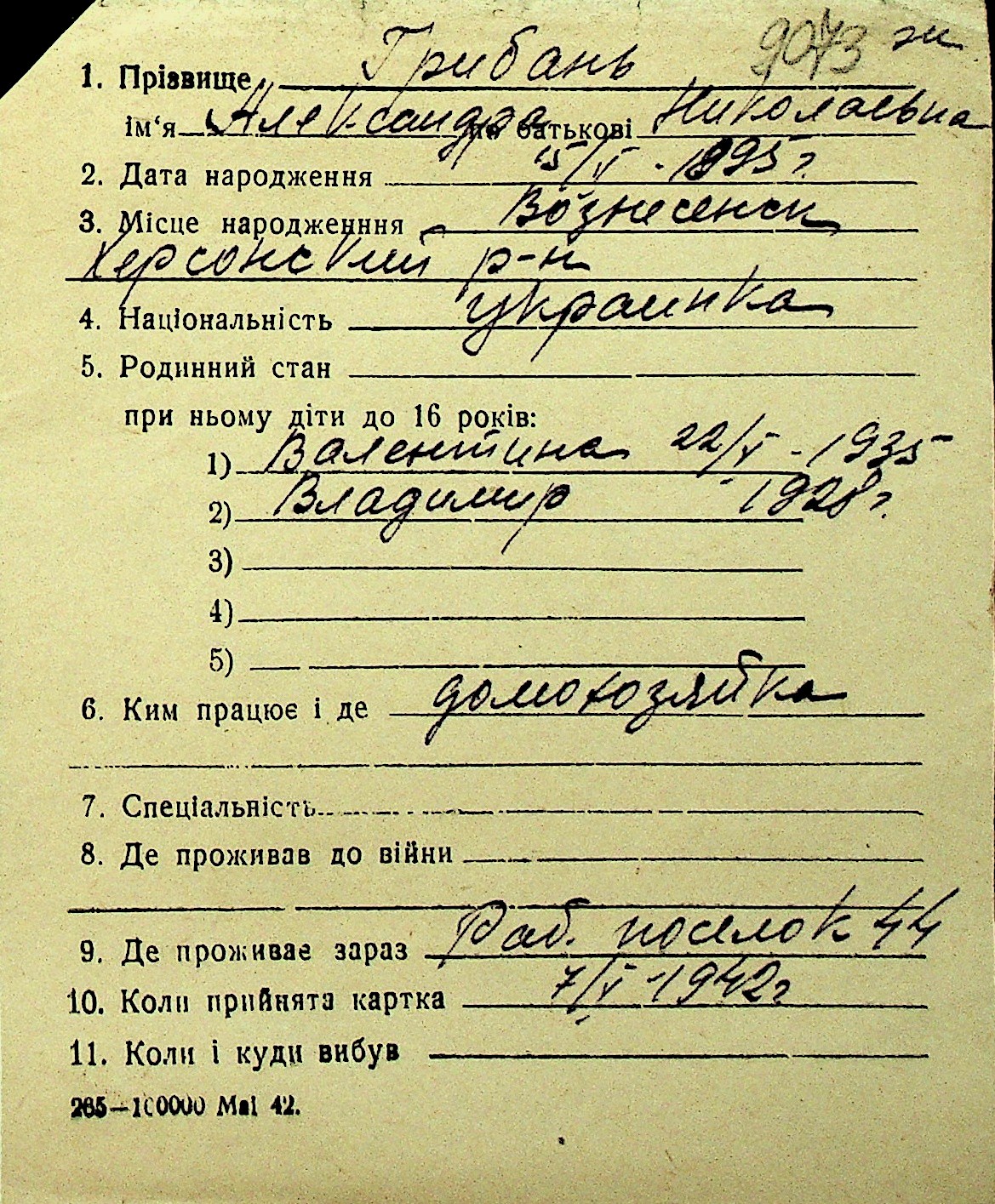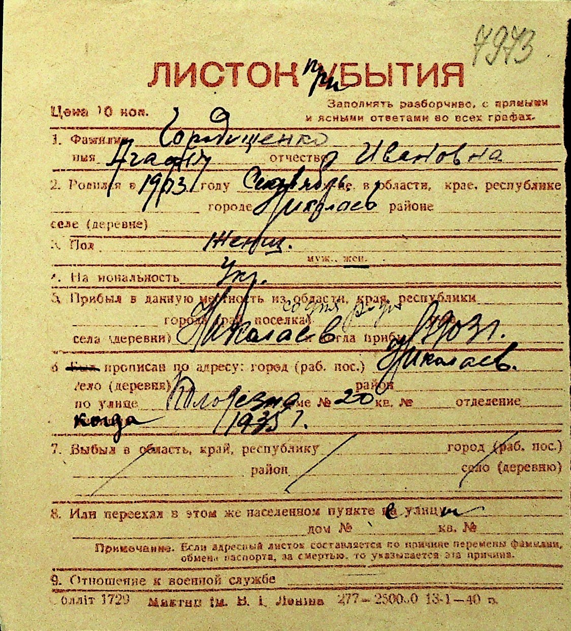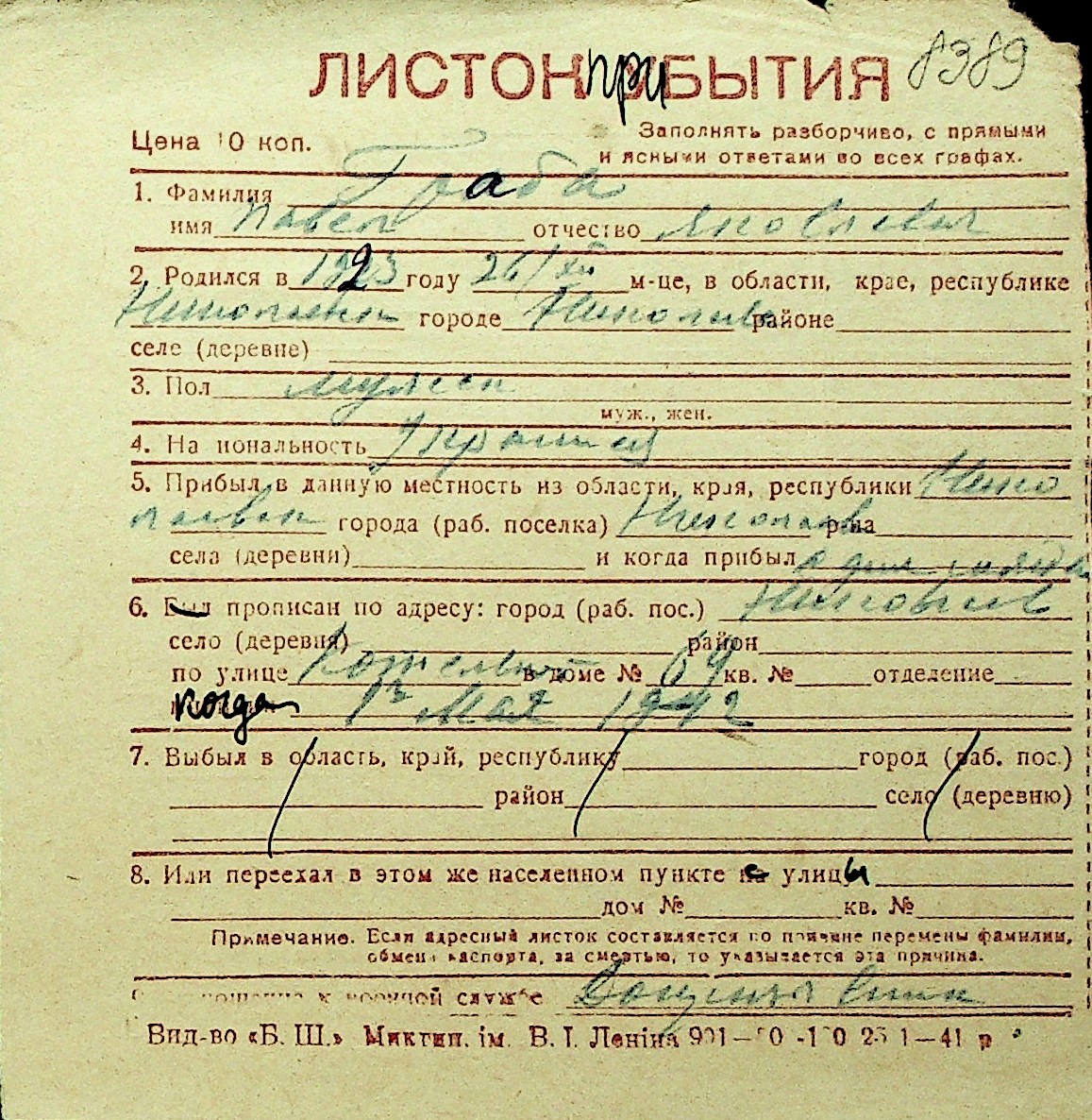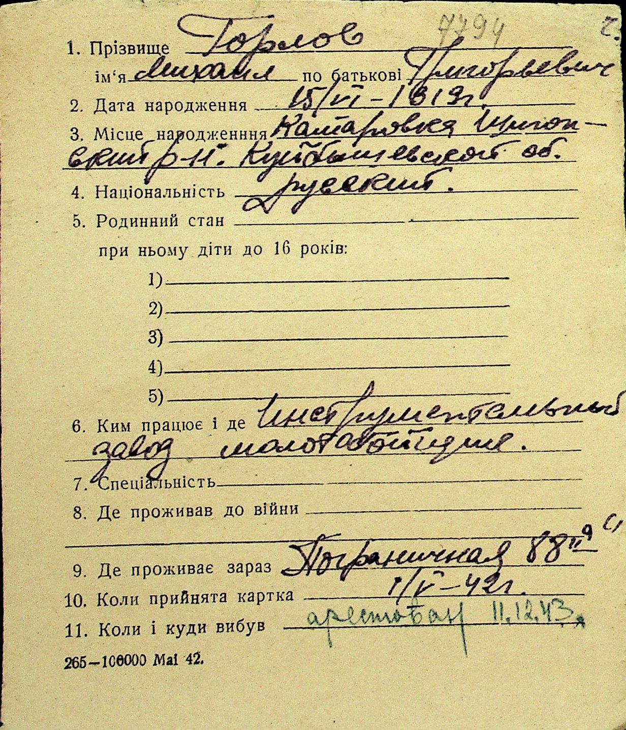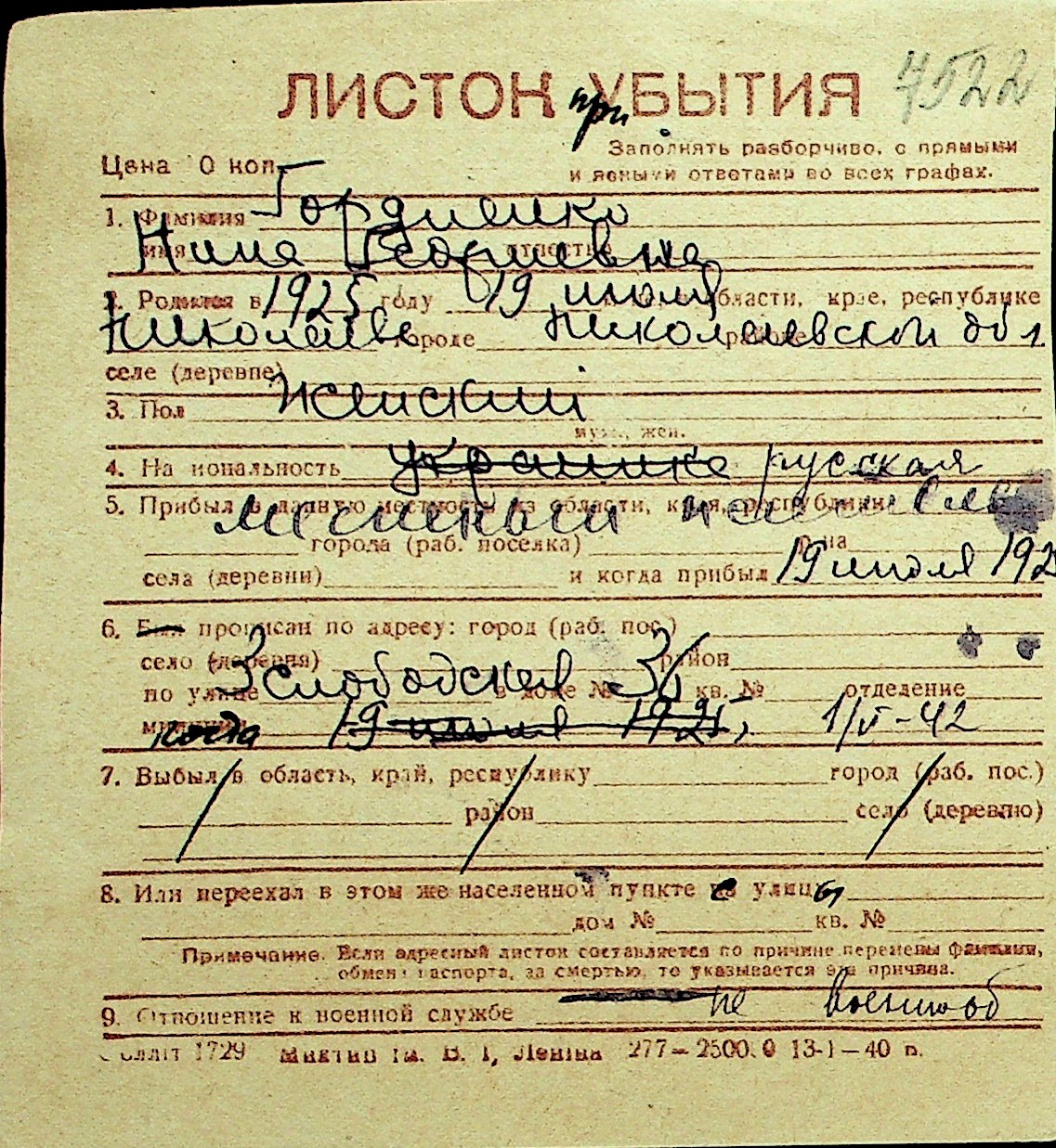 • • Перелік карток до фонду № Н-1016