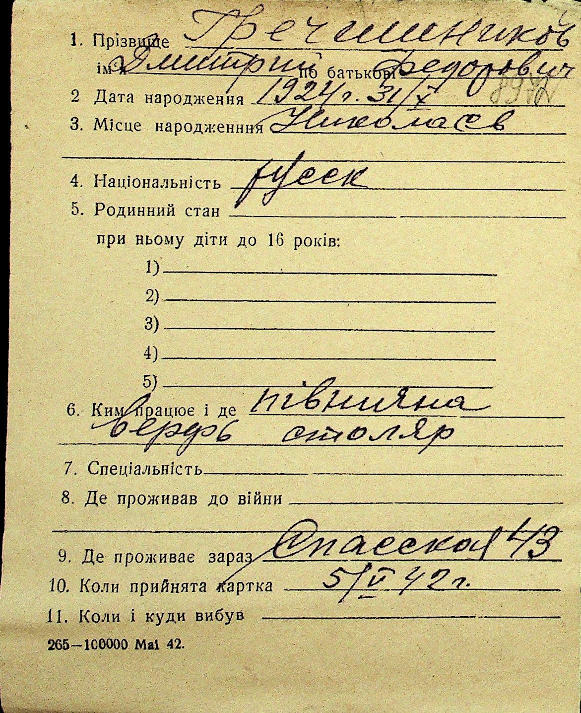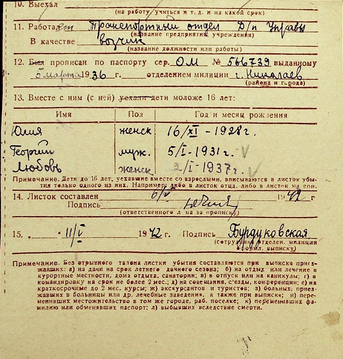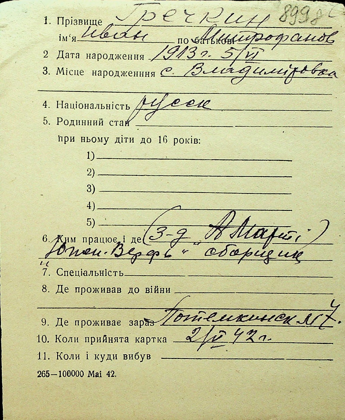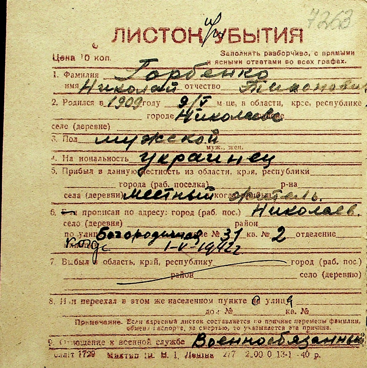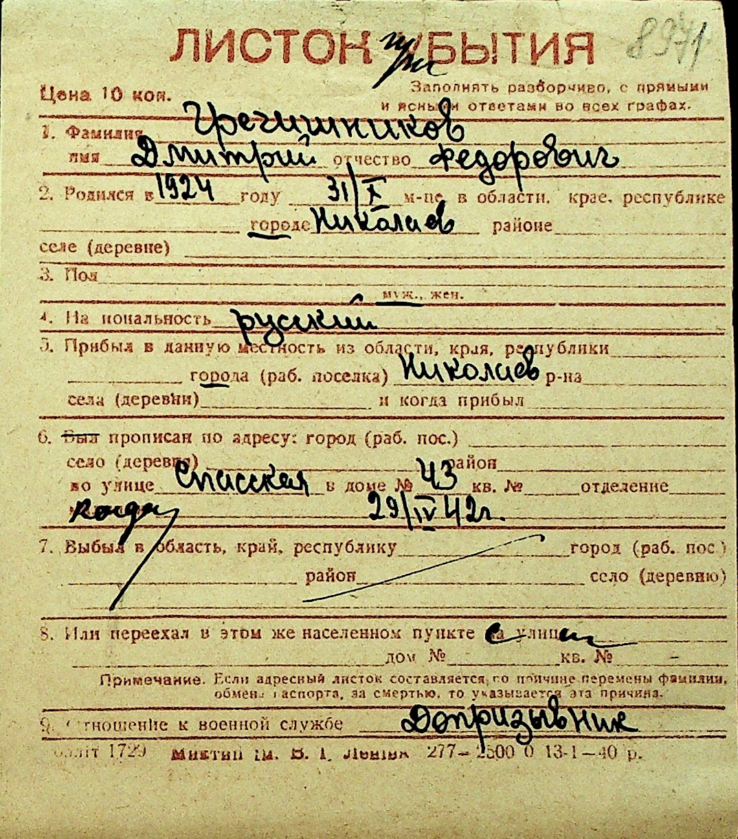 • • Перелік карток до фонду № Н-1016