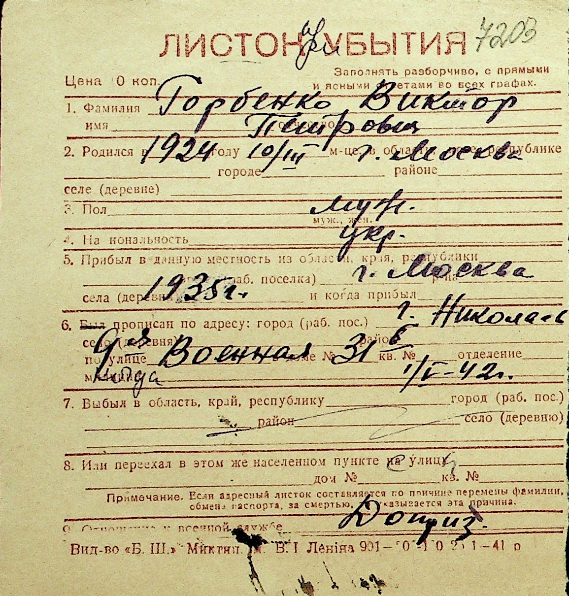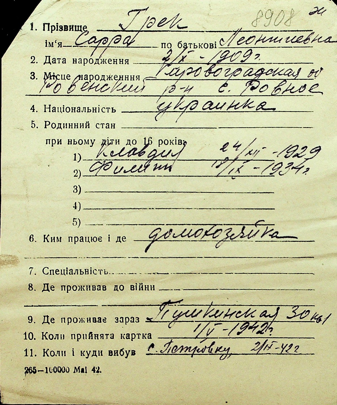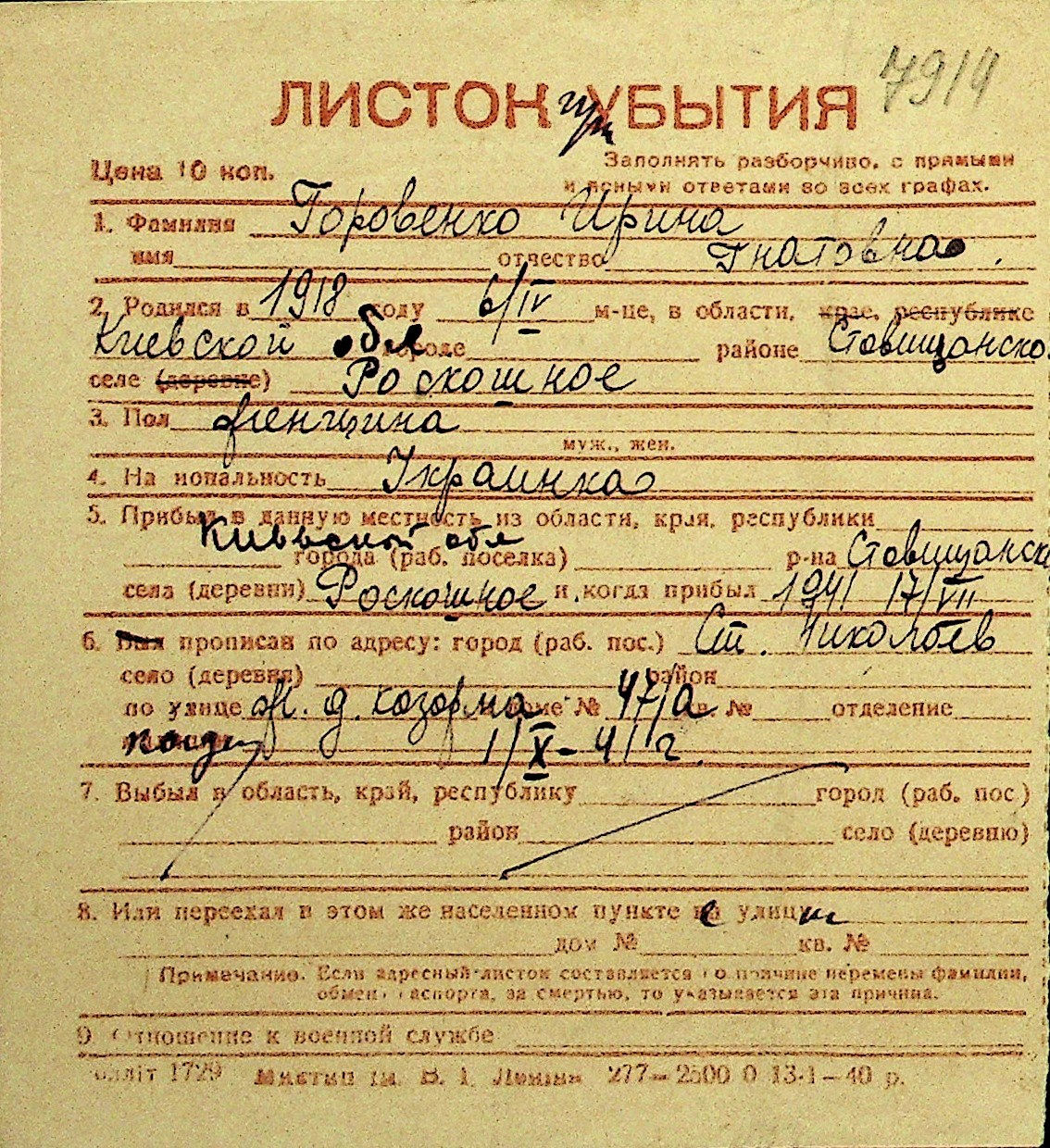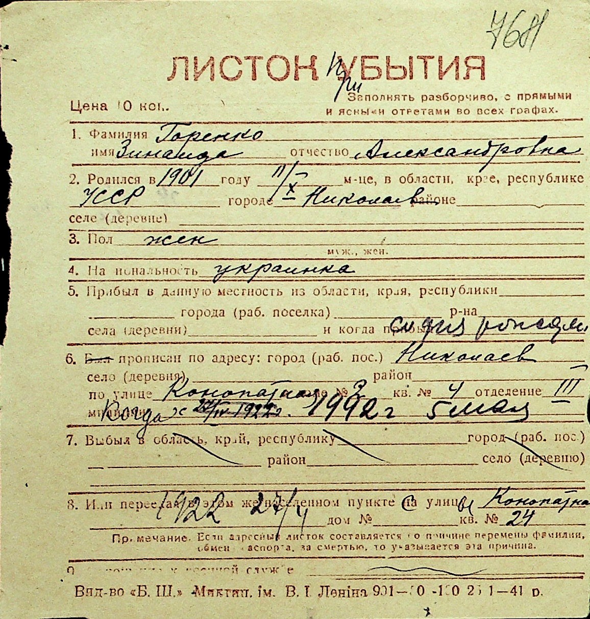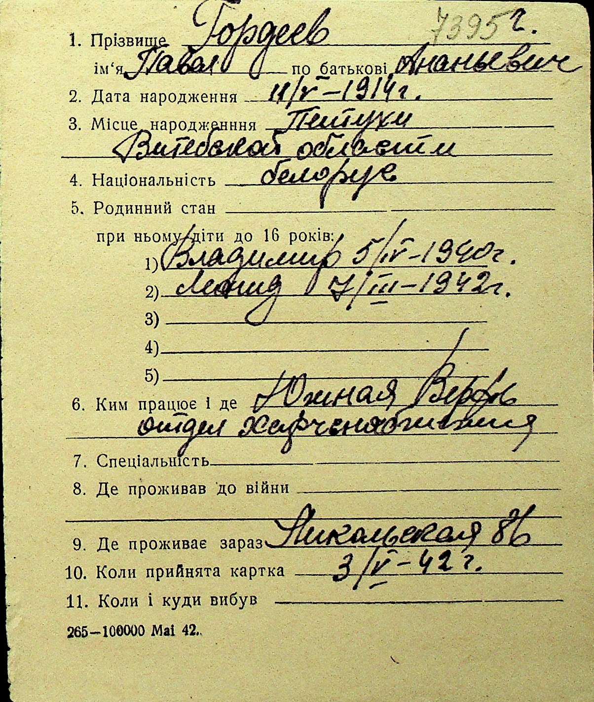 • • Перелік карток до фонду № Н-1016