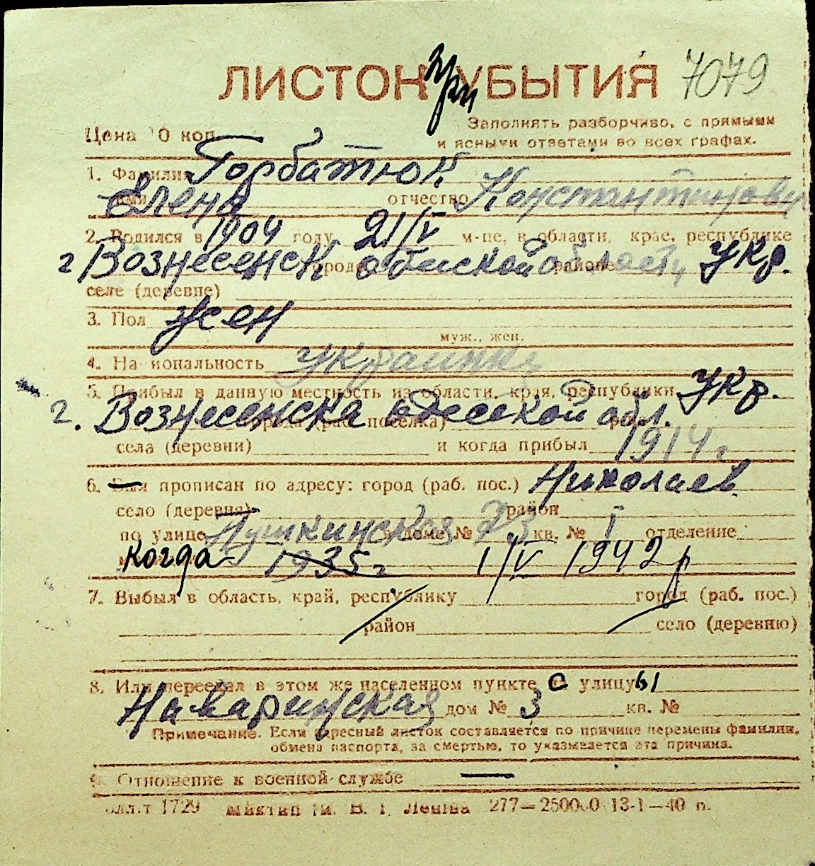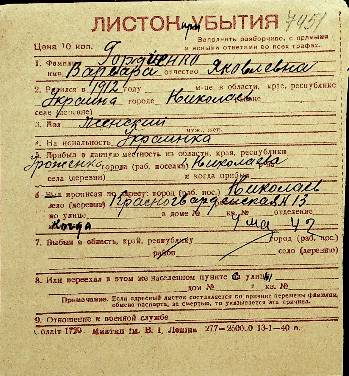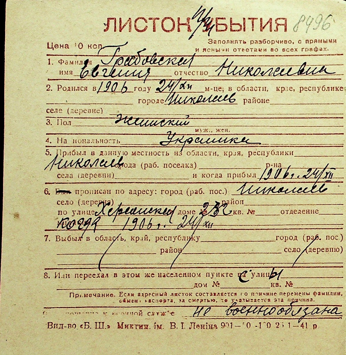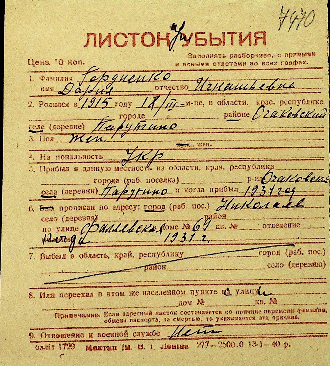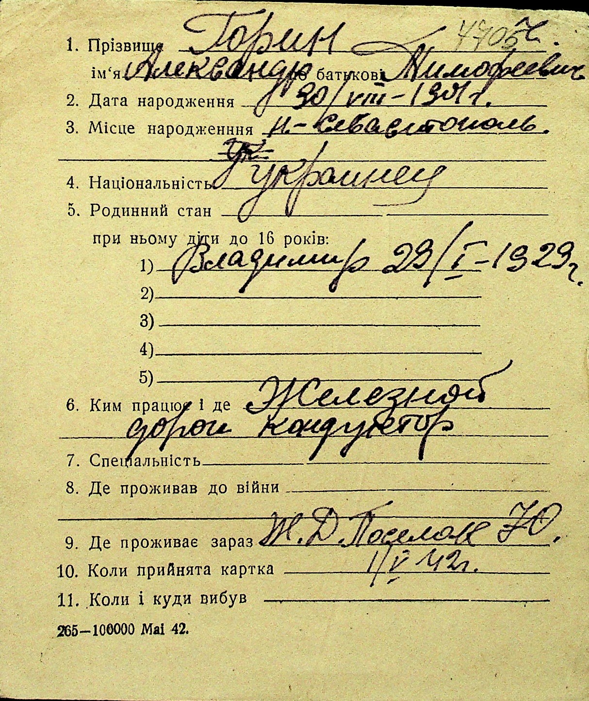 • • Перелік карток до фонду № Н-1016