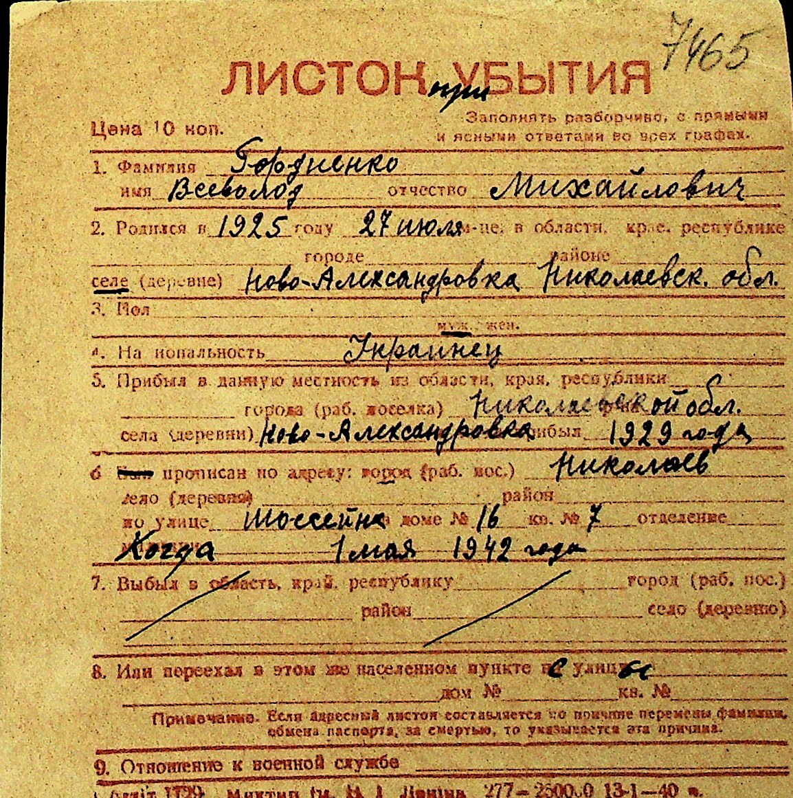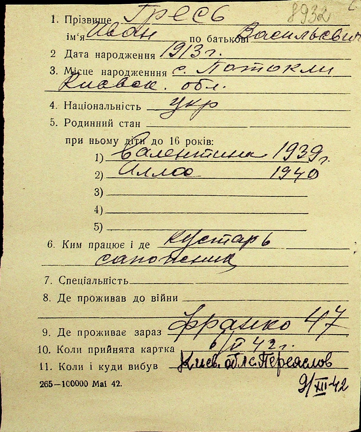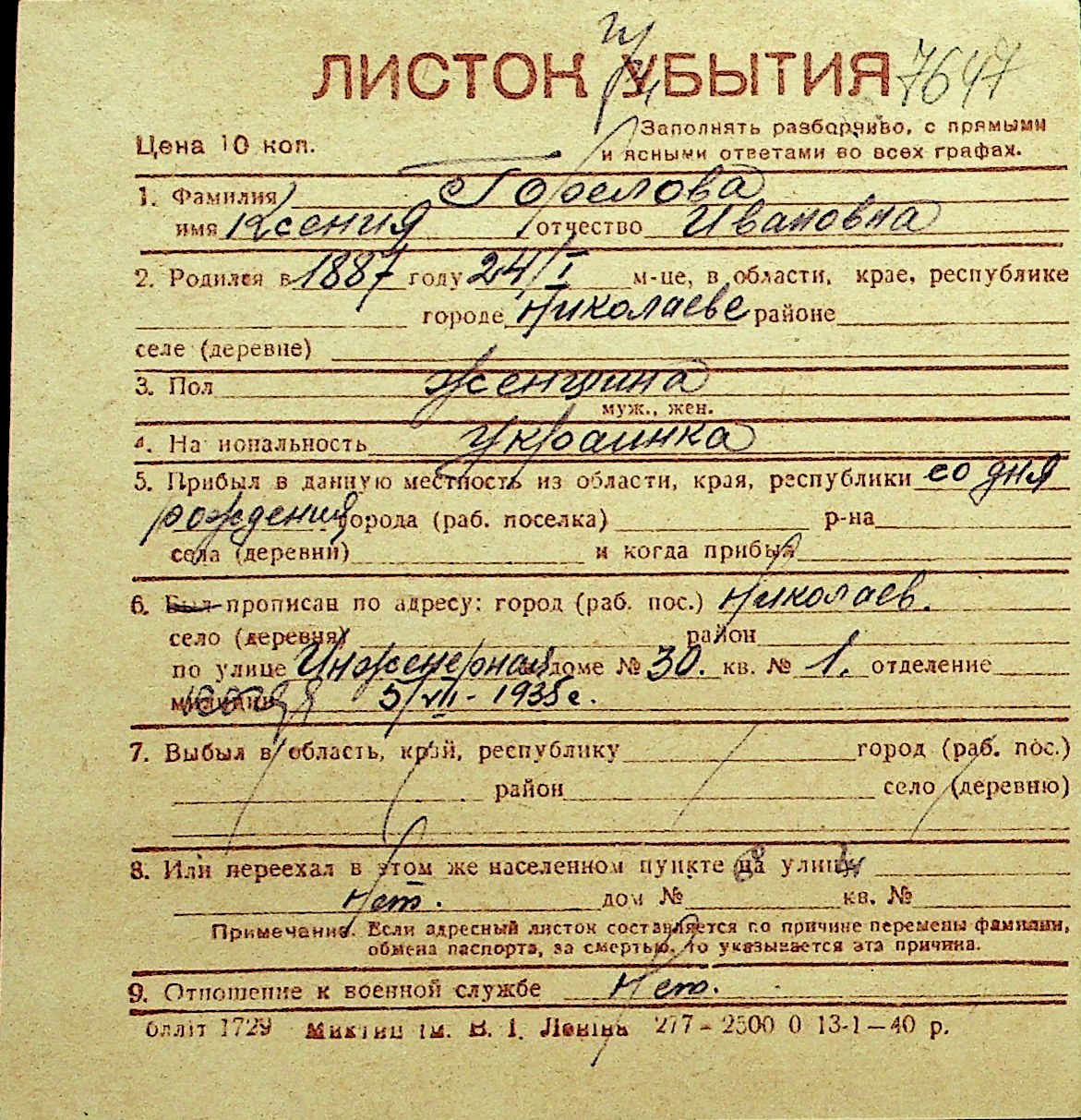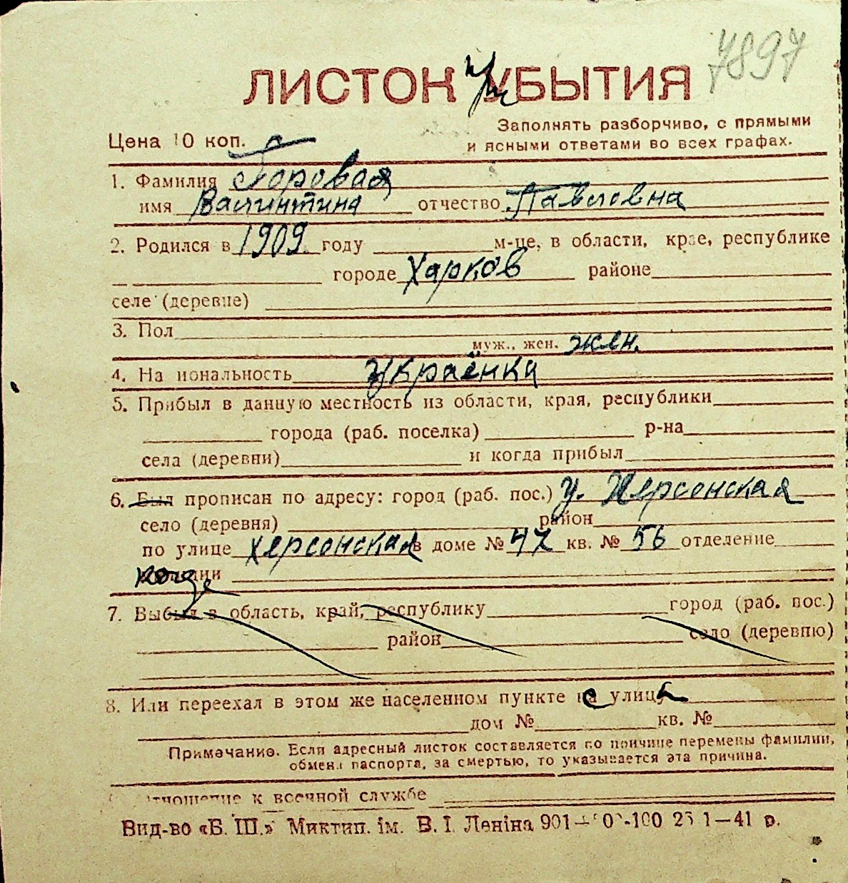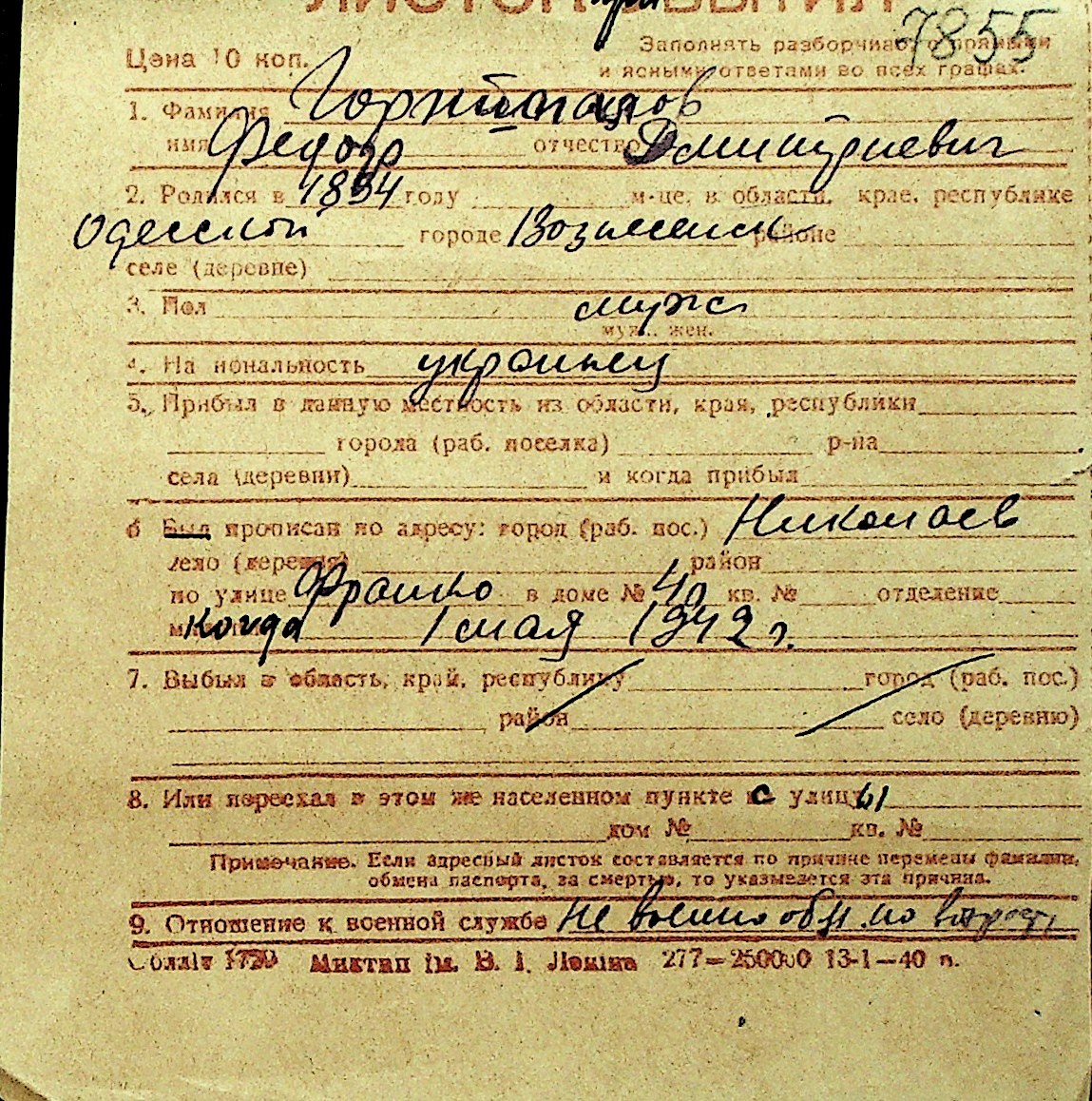 • • Перелік карток до фонду № Н-1016