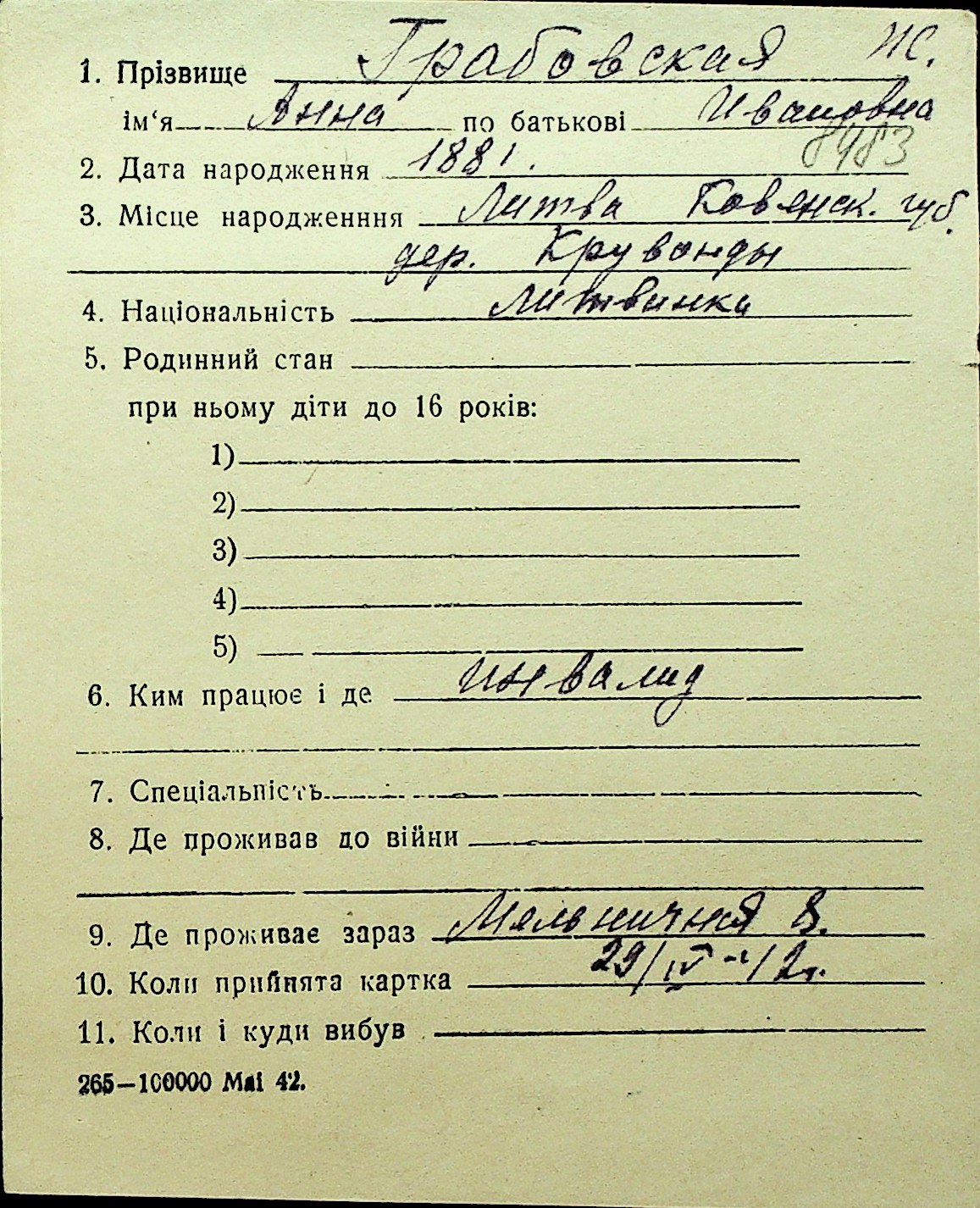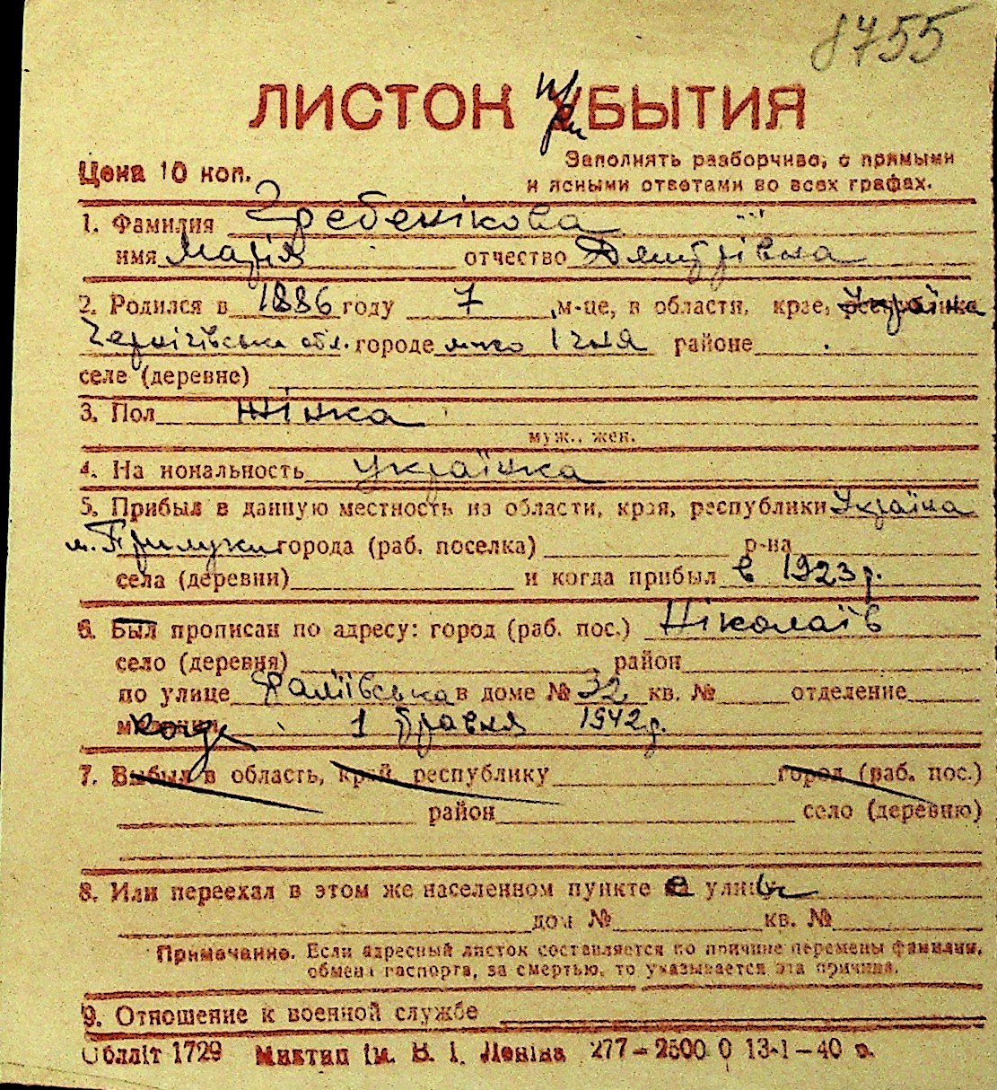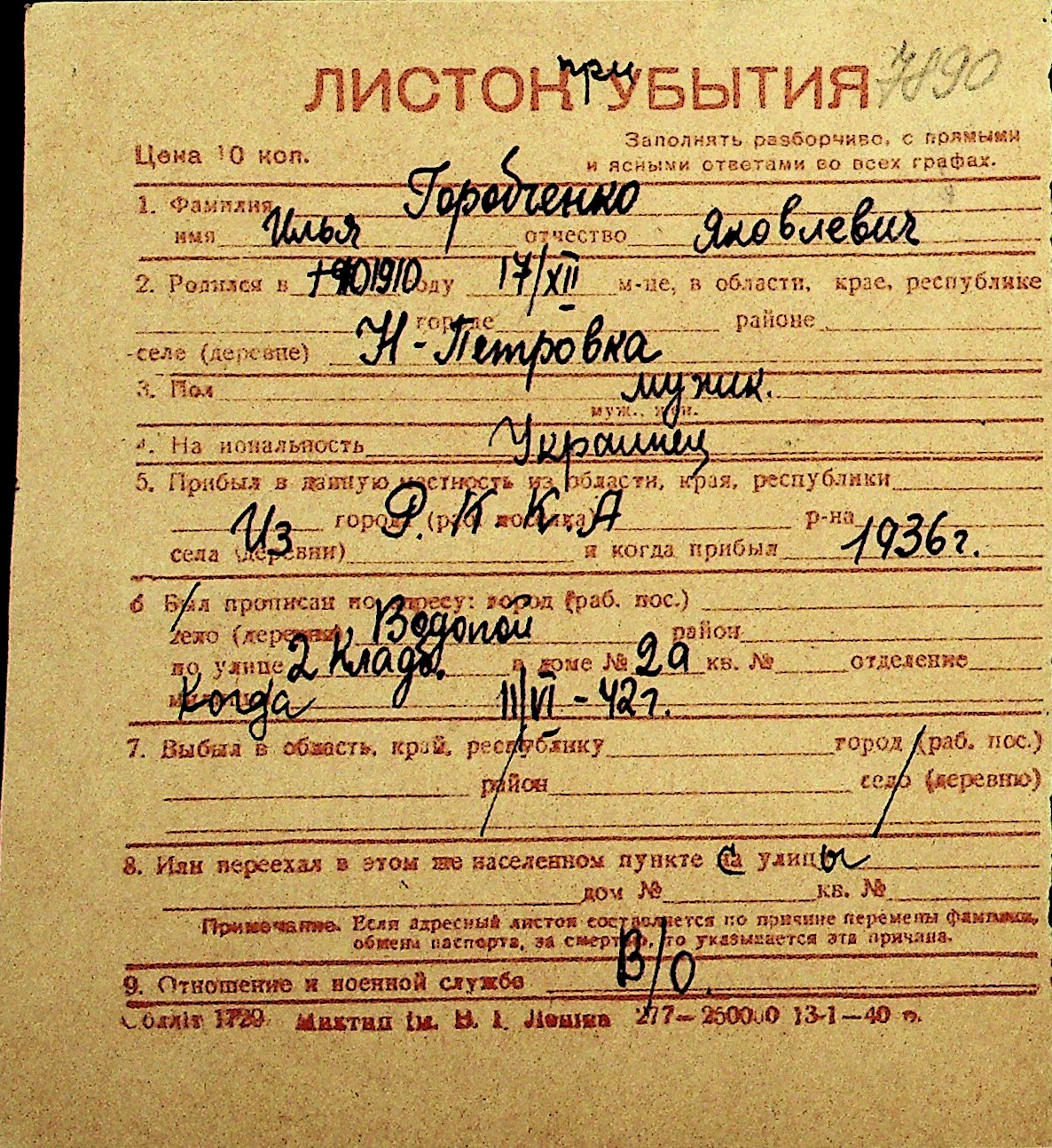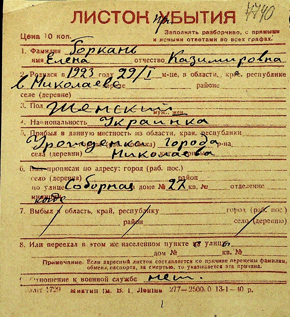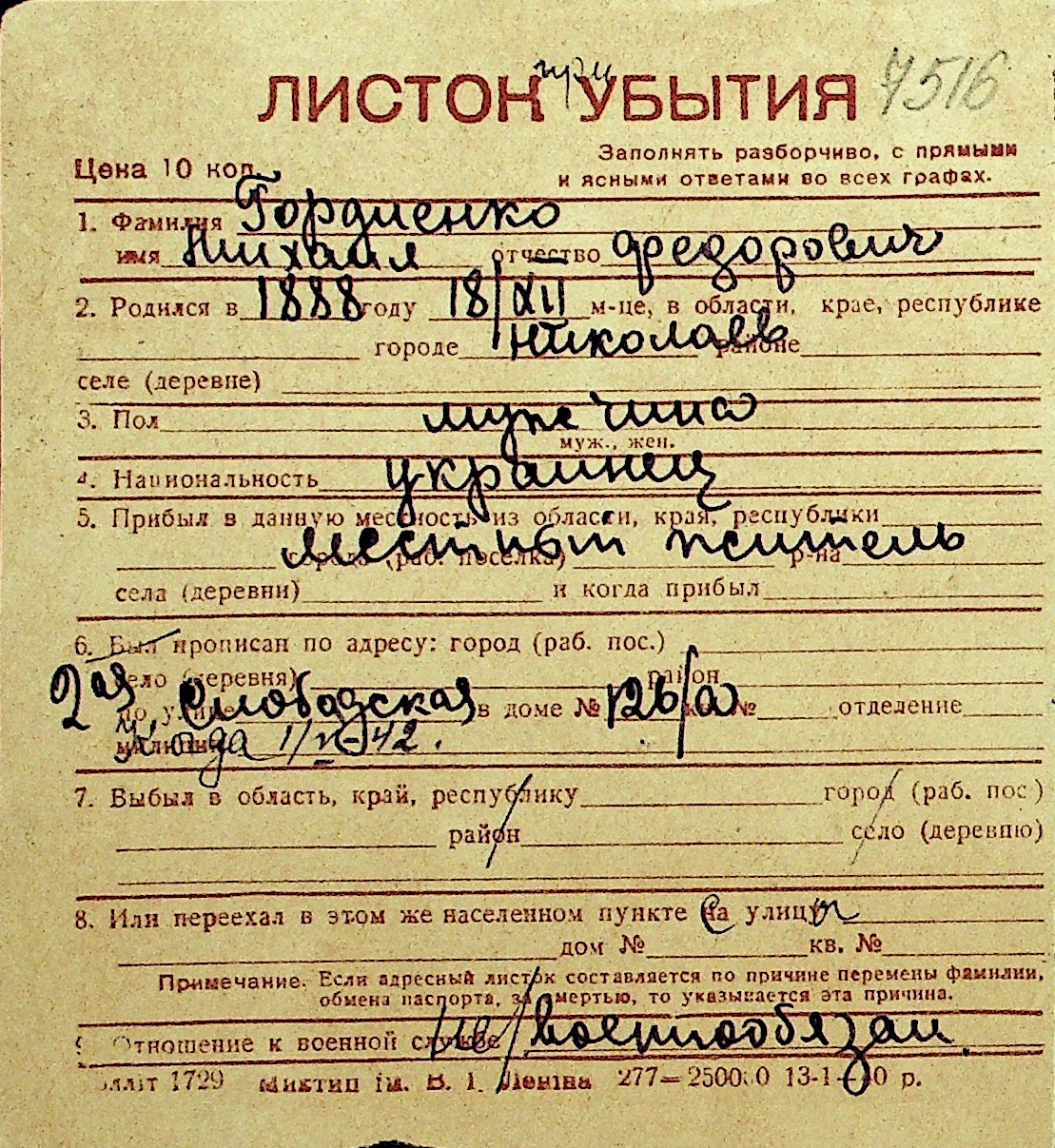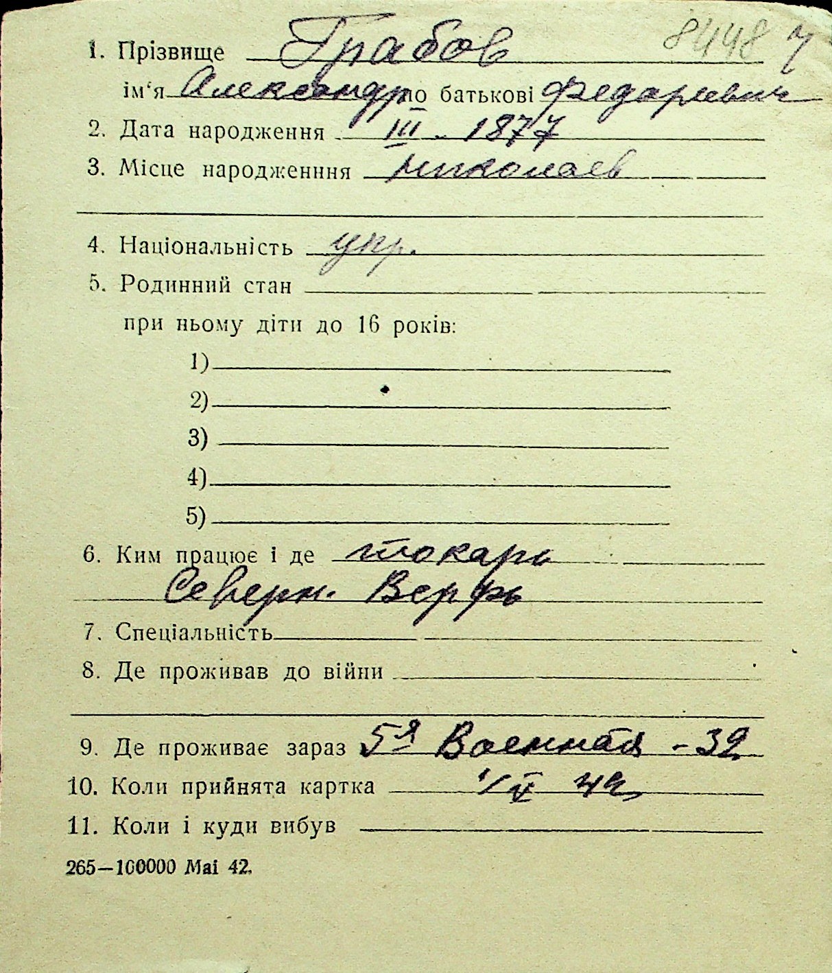 • • Перелік карток до фонду № Н-1016
