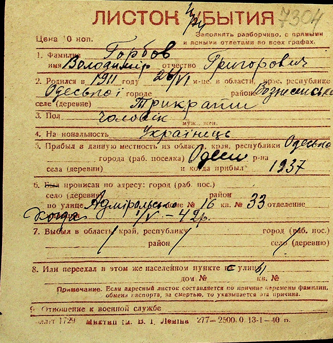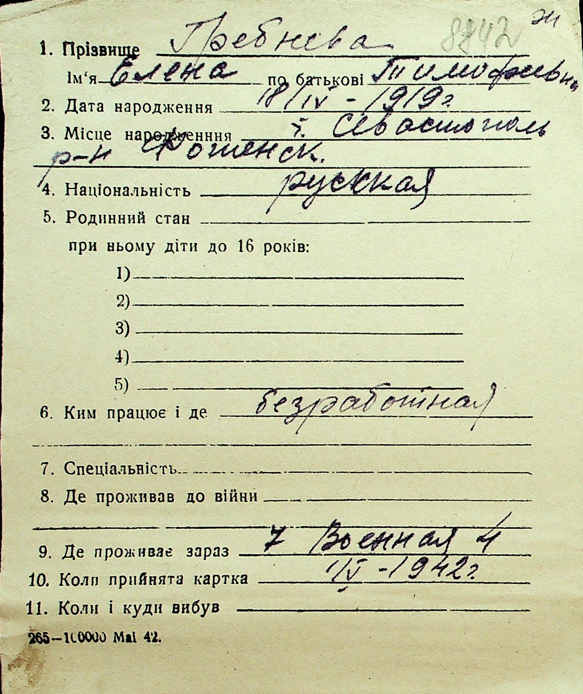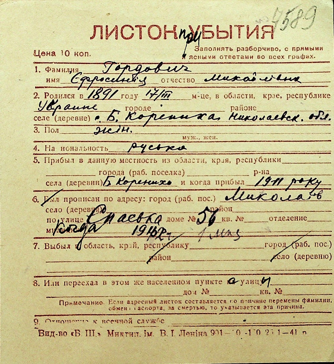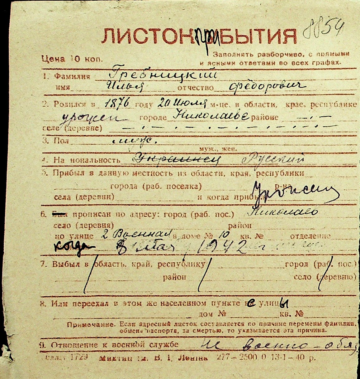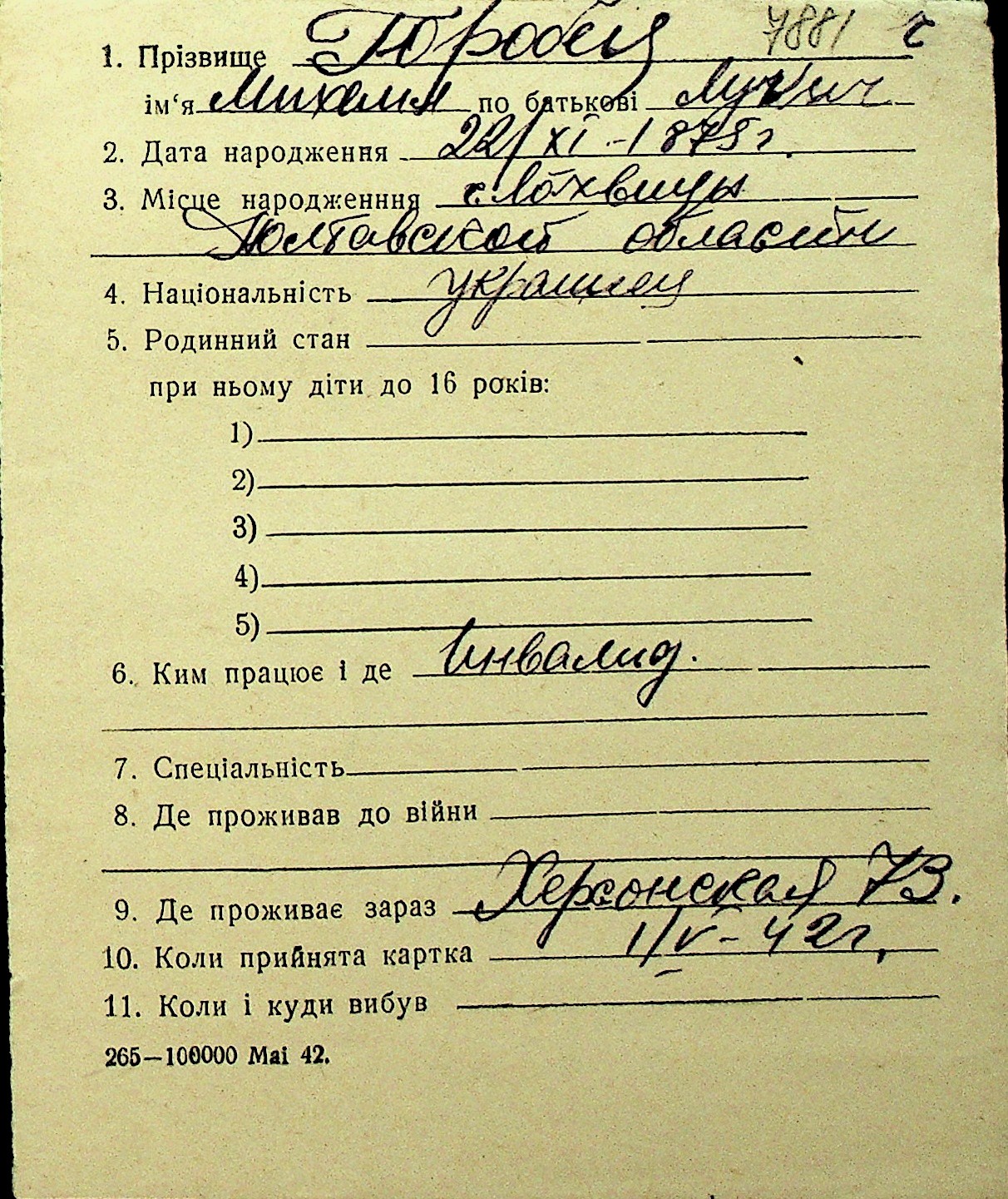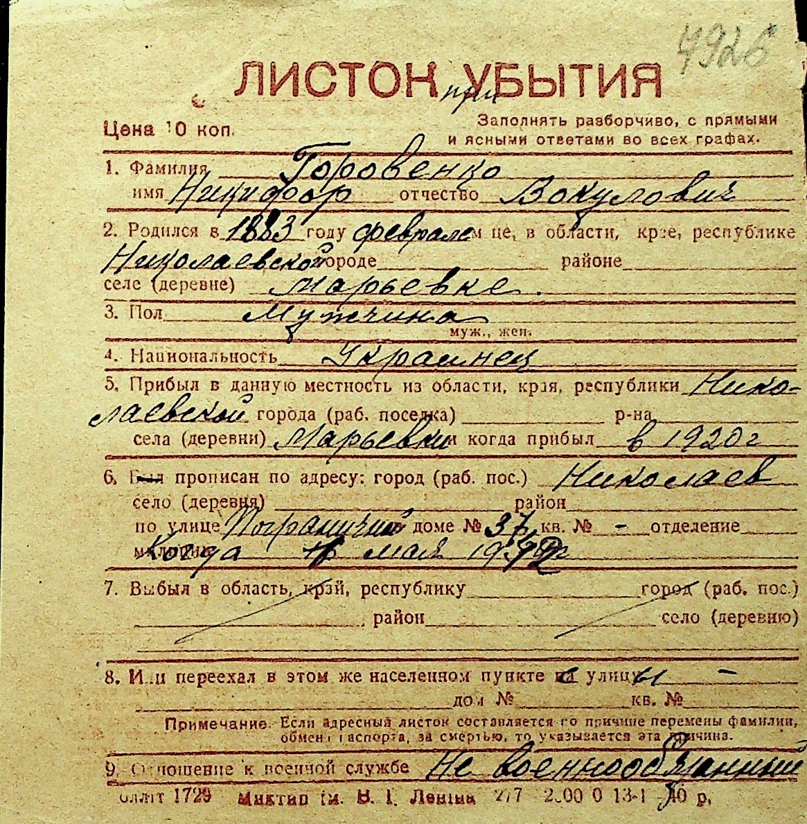 • • Перелік карток до фонду № Н-1016