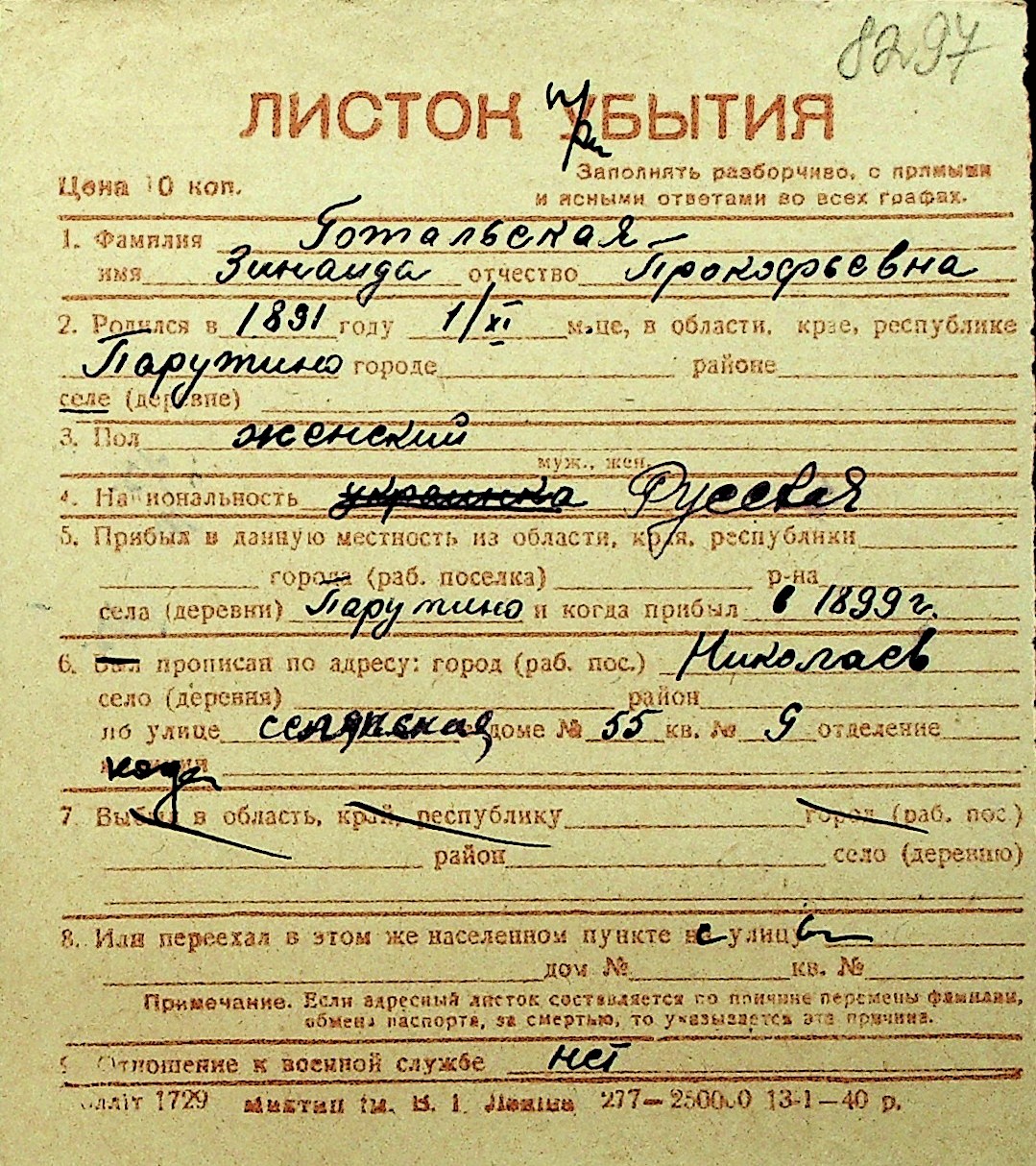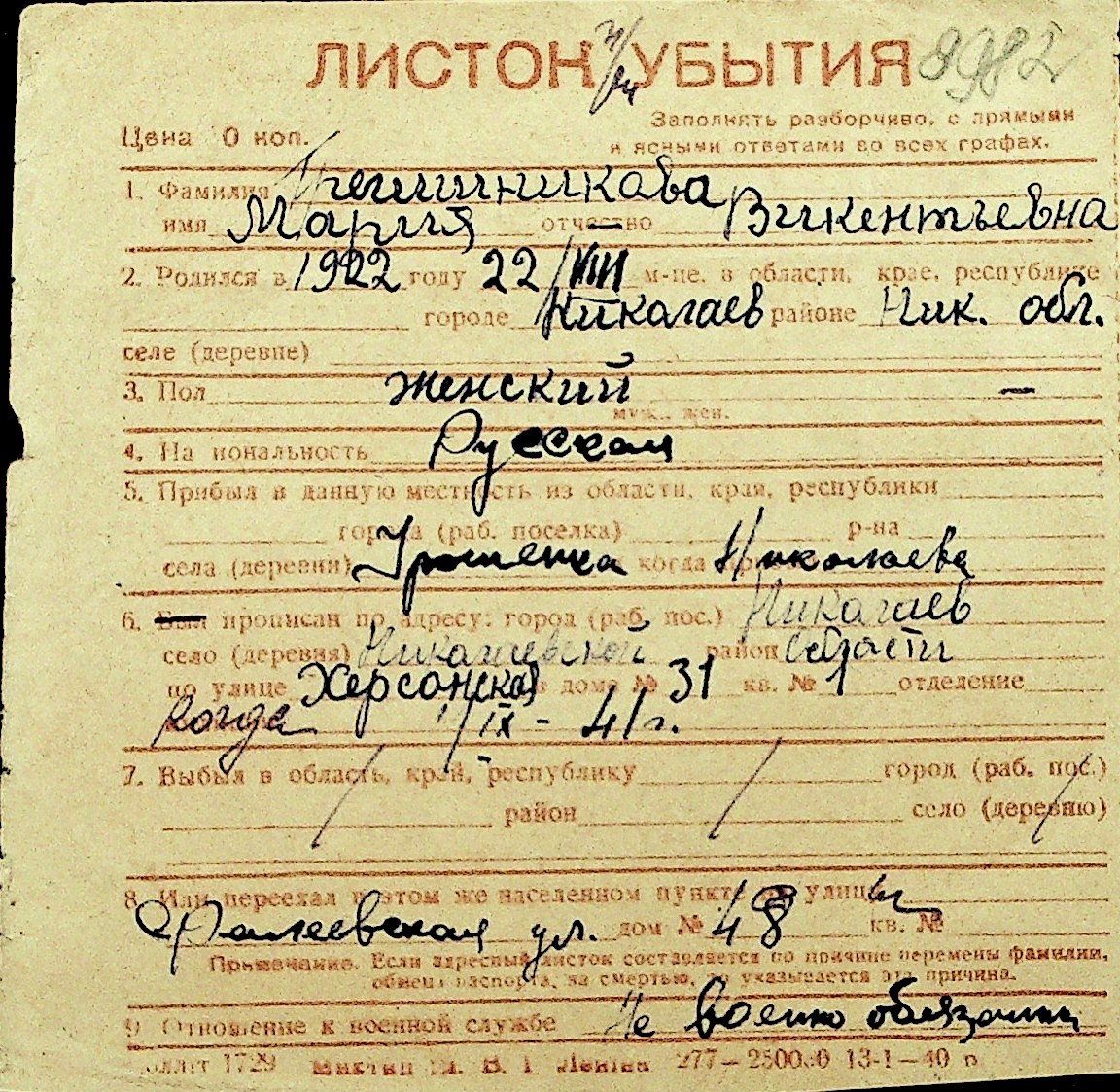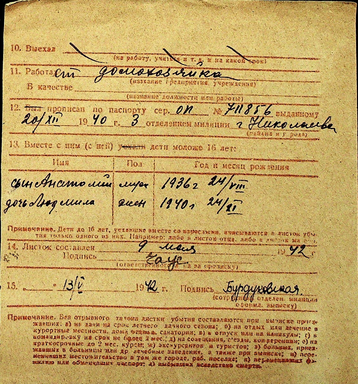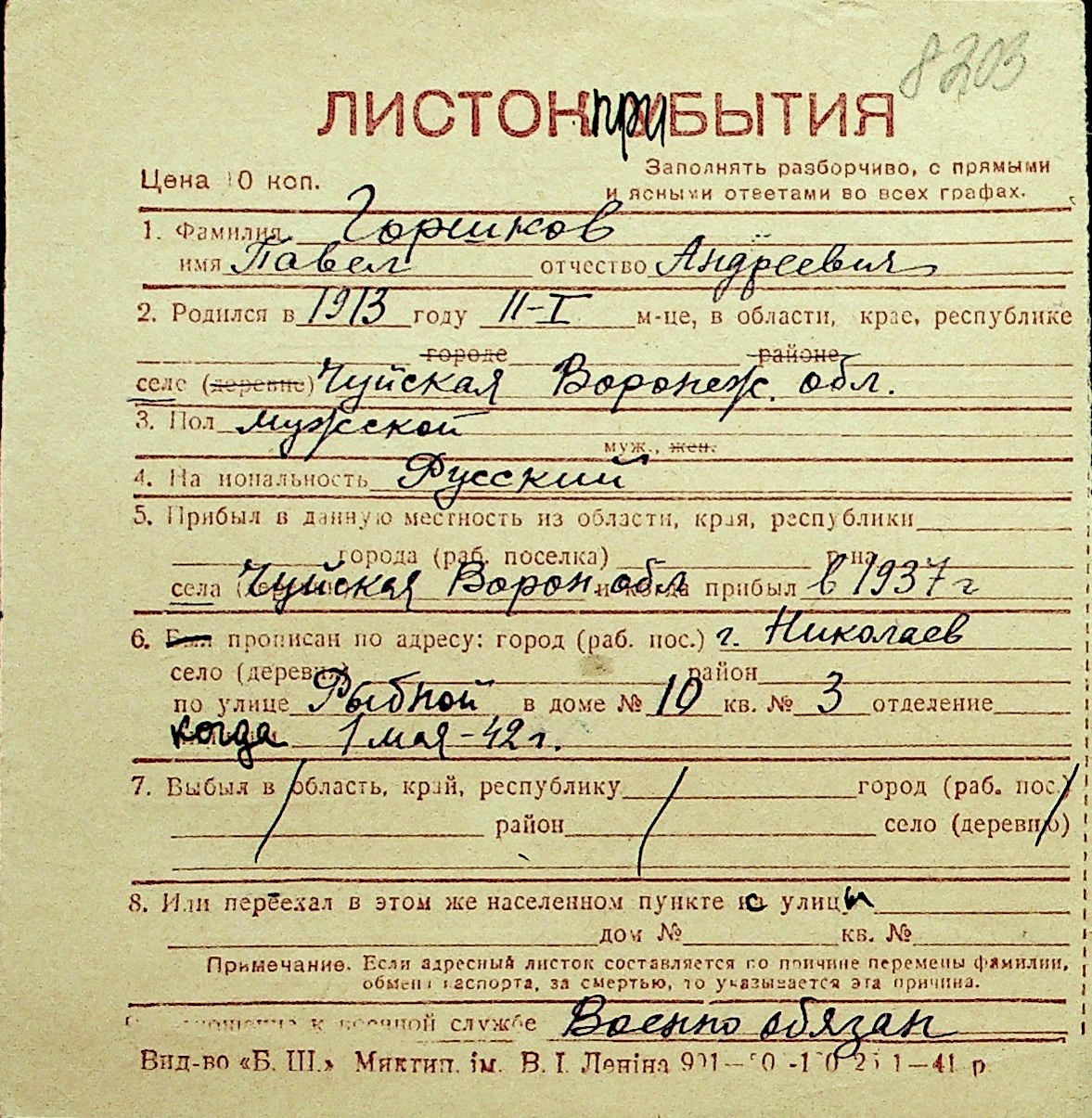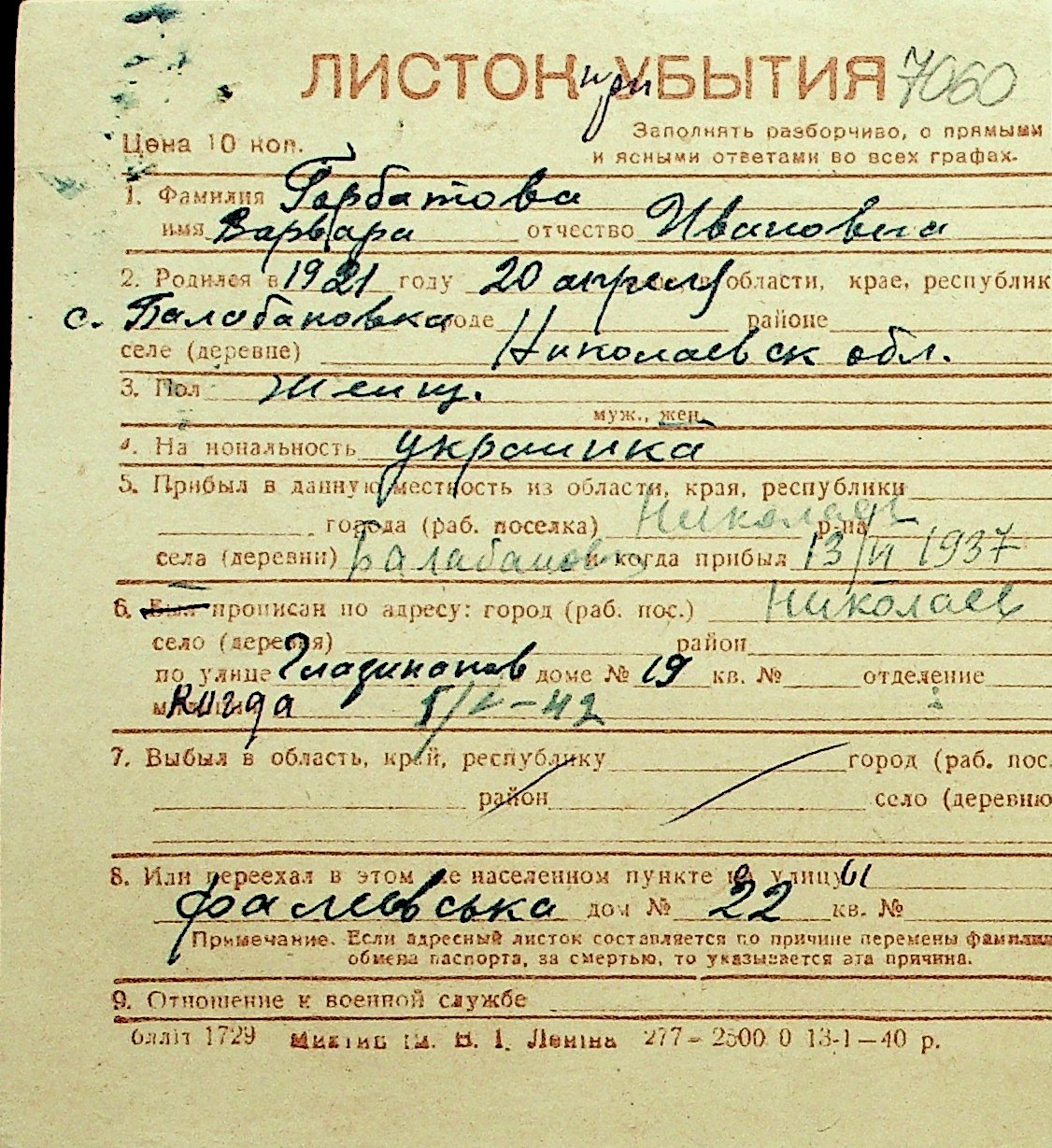 • • Перелік карток до фонду № Н-1016