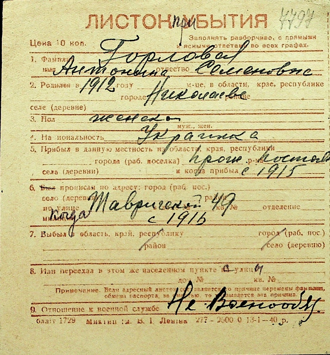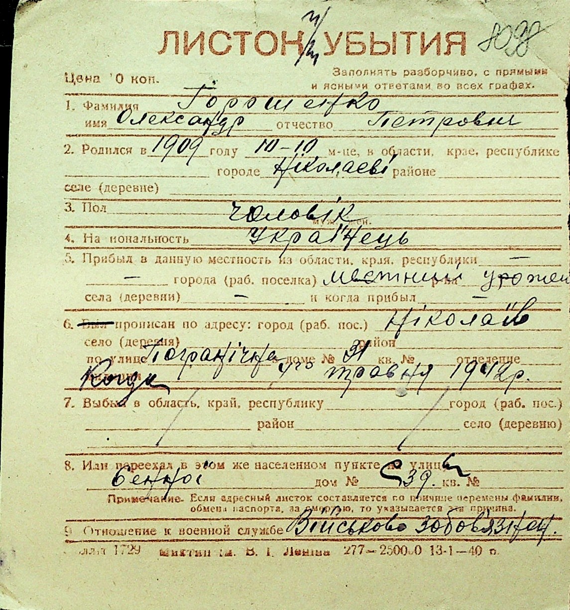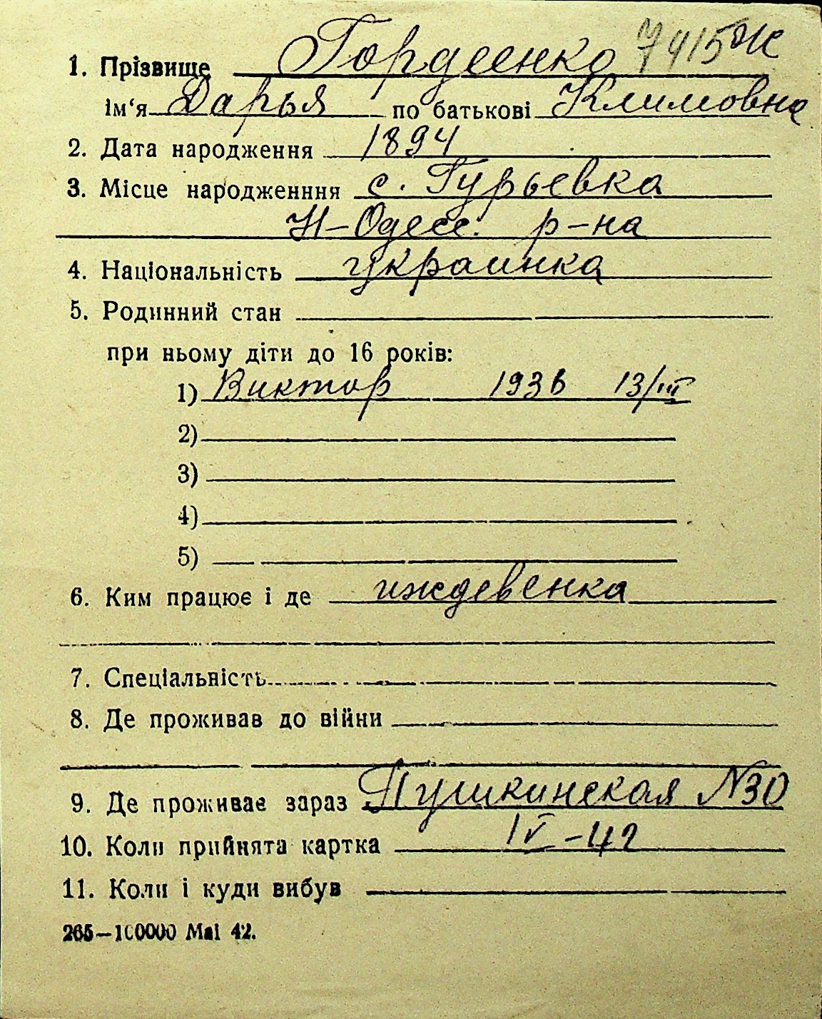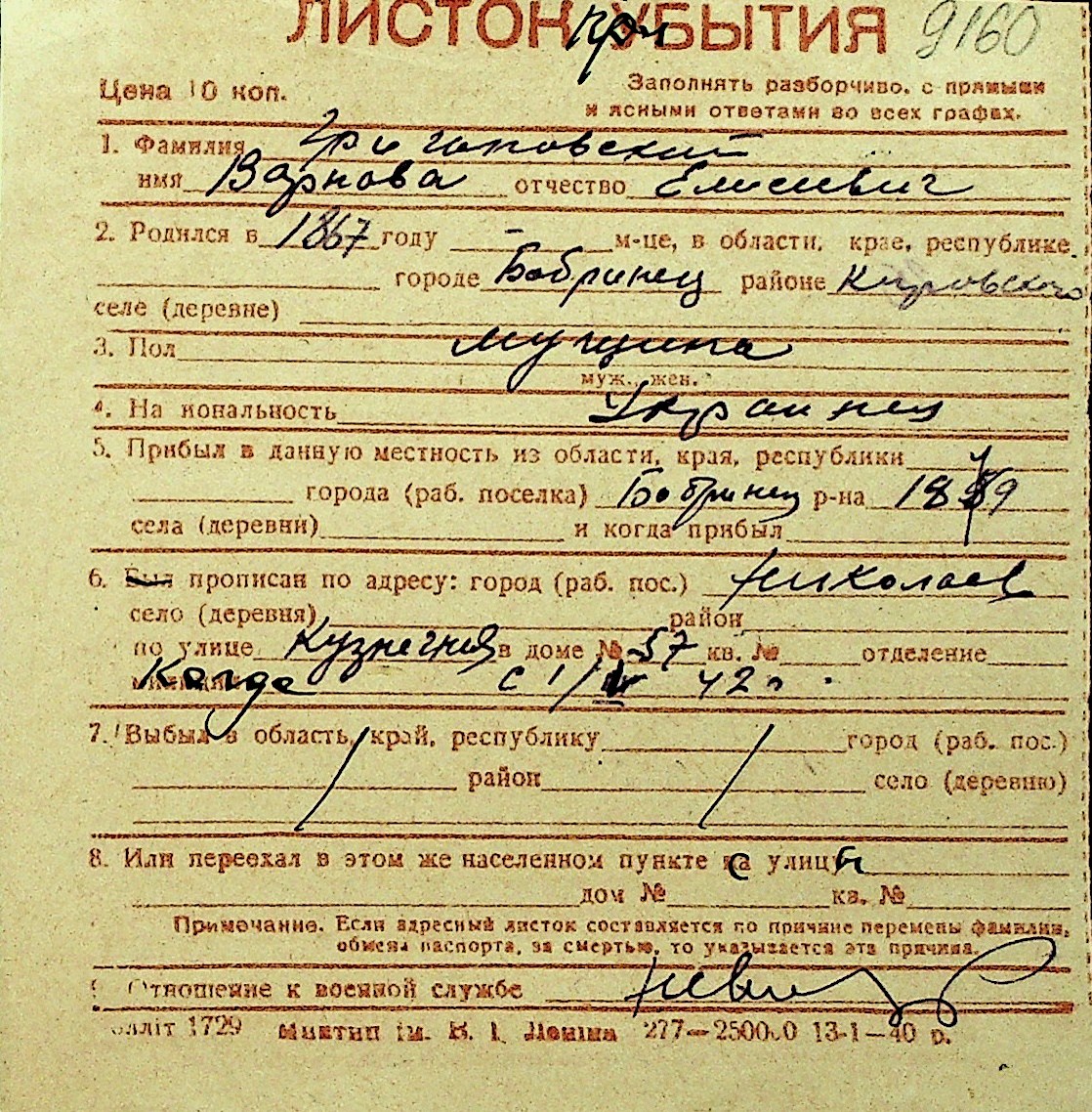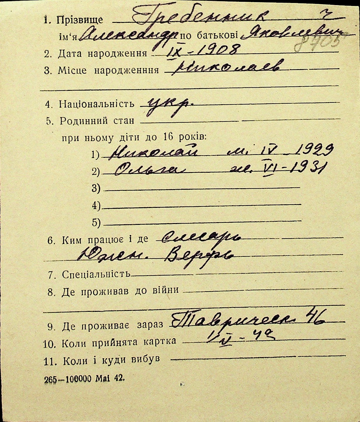 • • Перелік карток до фонду № Н-1016