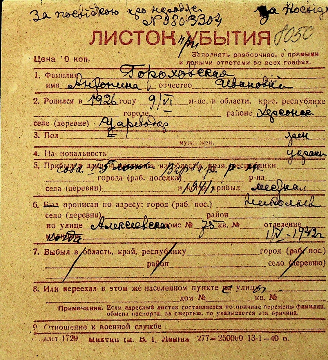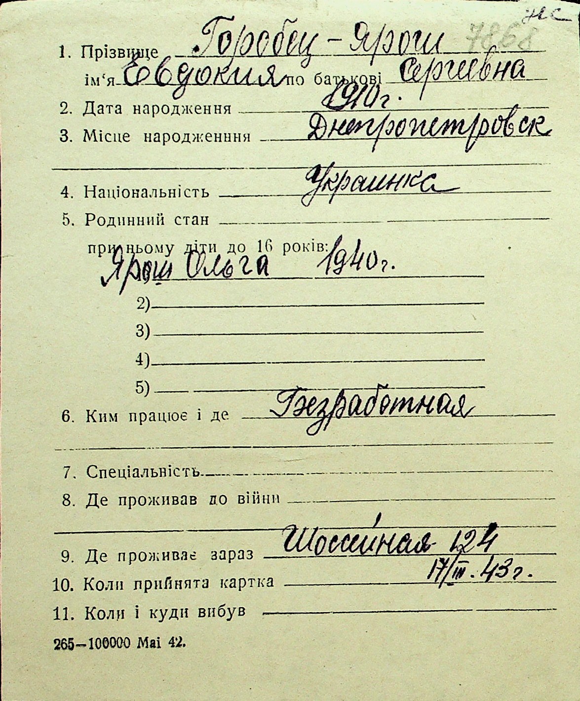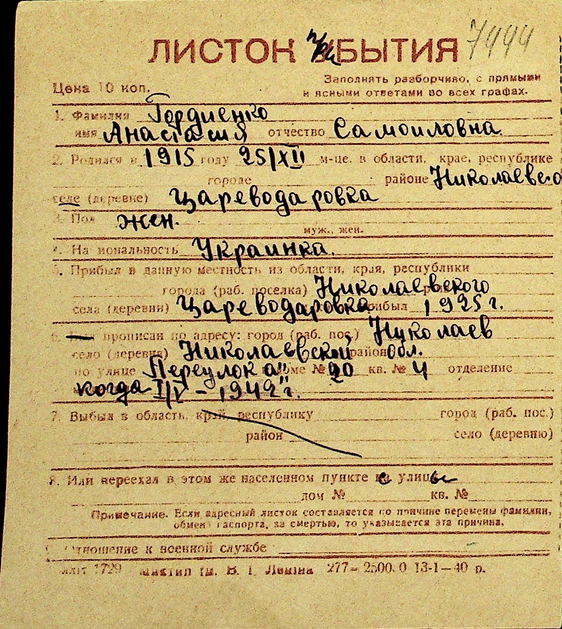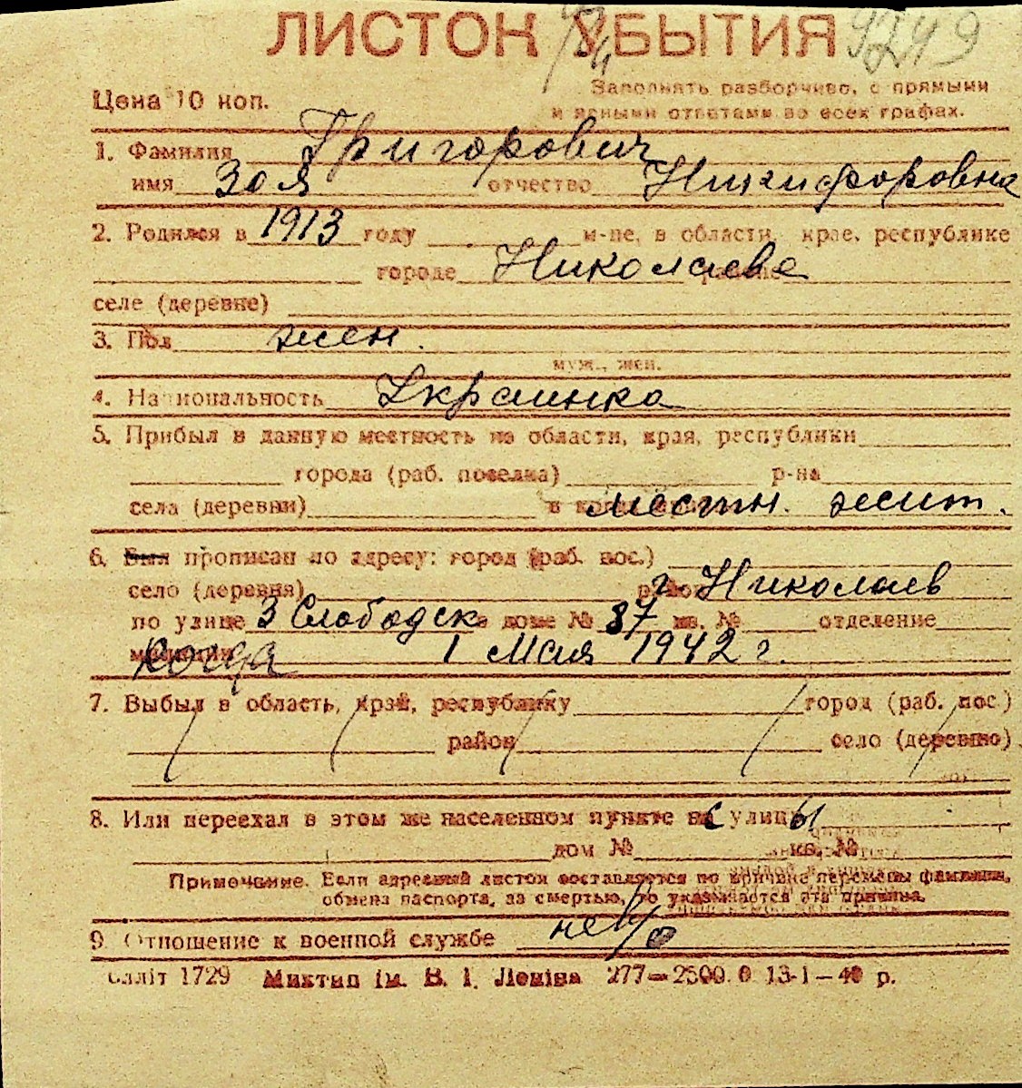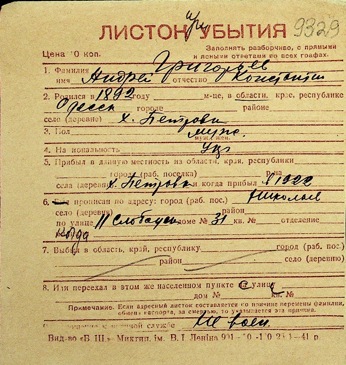 • • Перелік карток до фонду № Н-1016