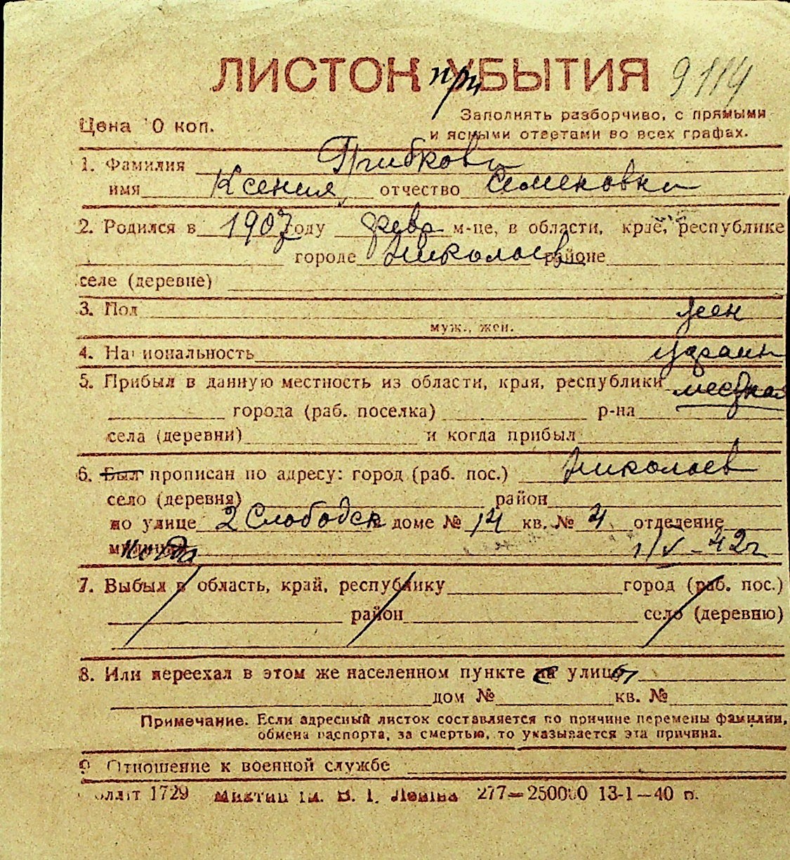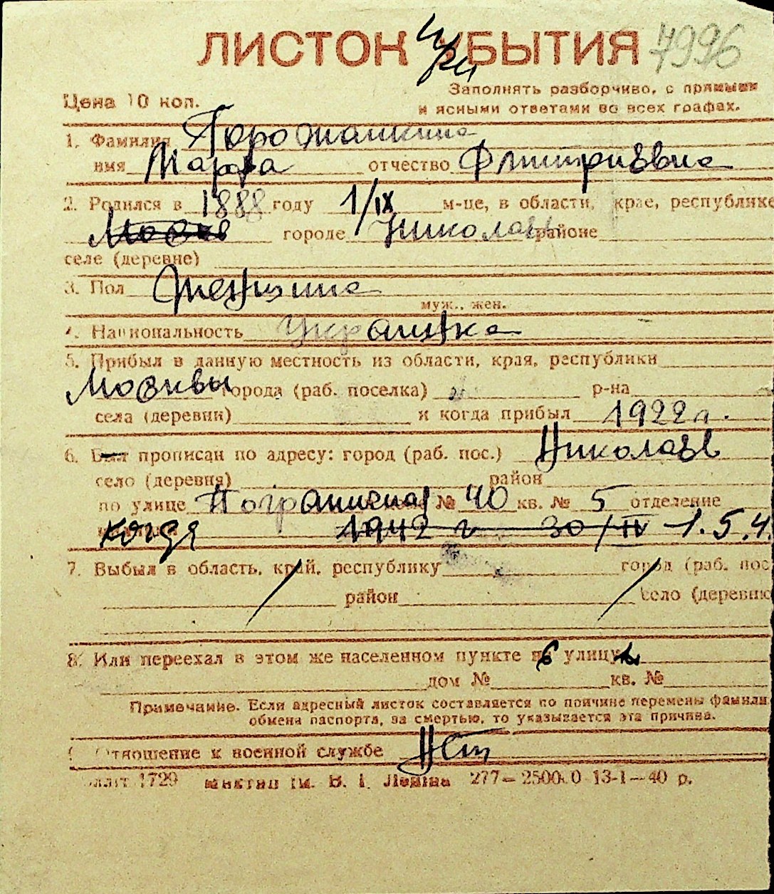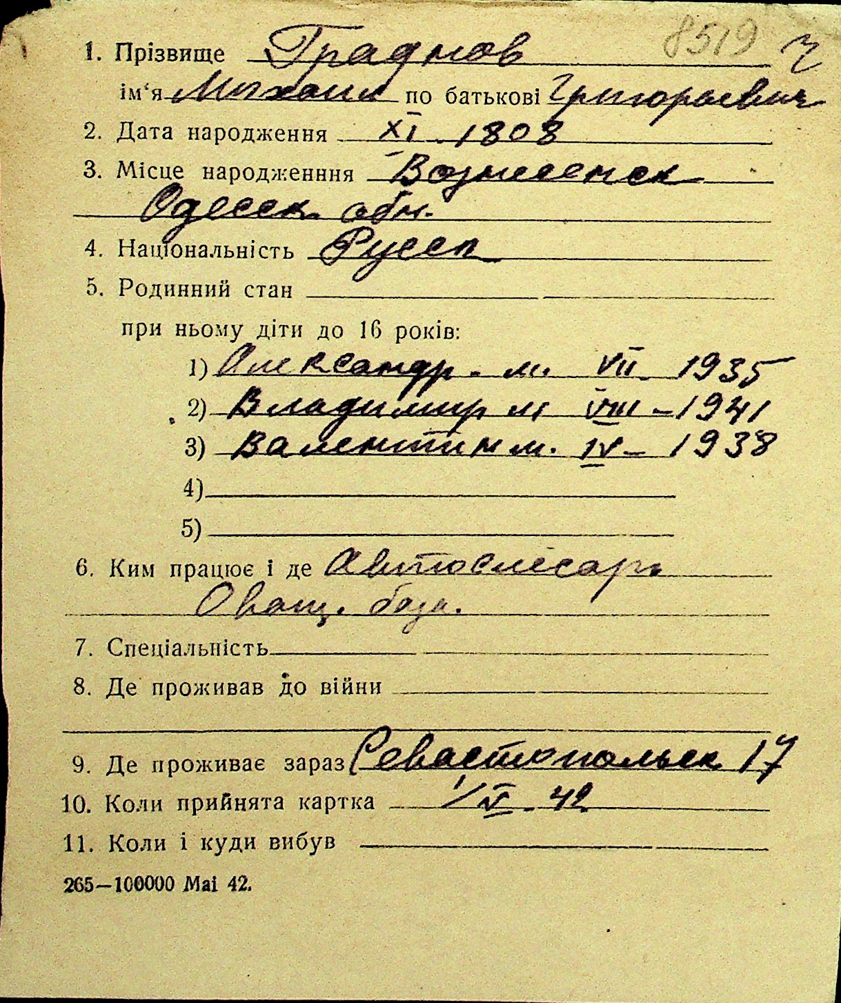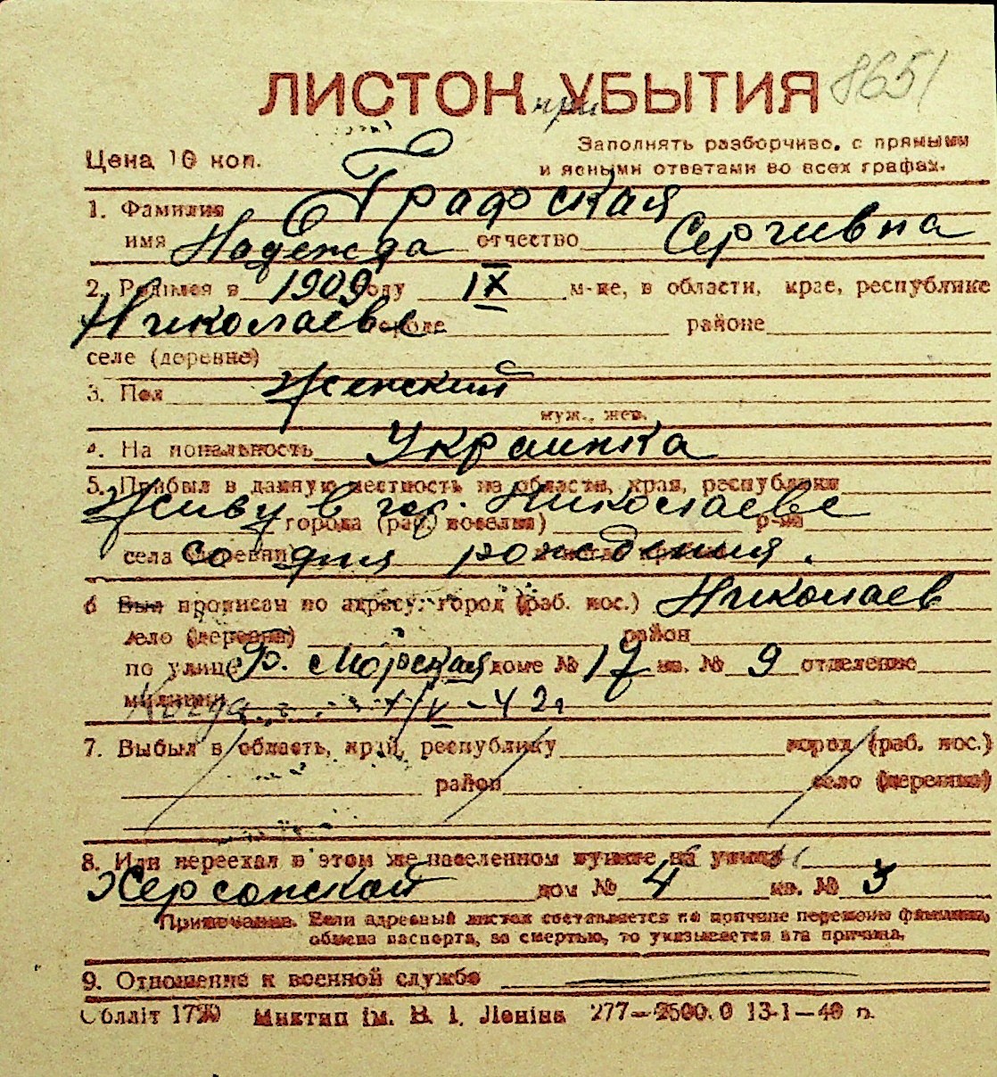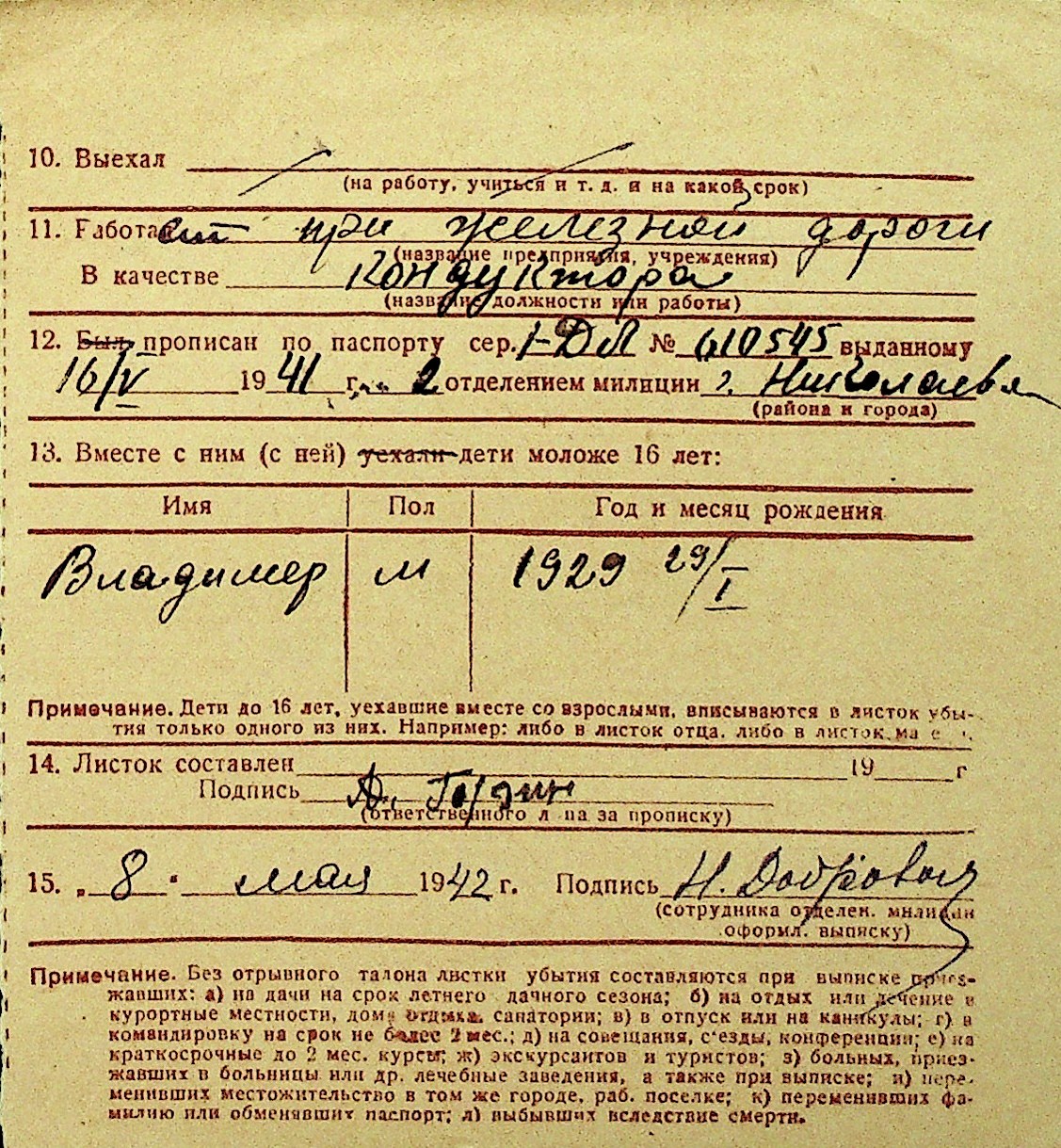 • • Перелік карток до фонду № Н-1016