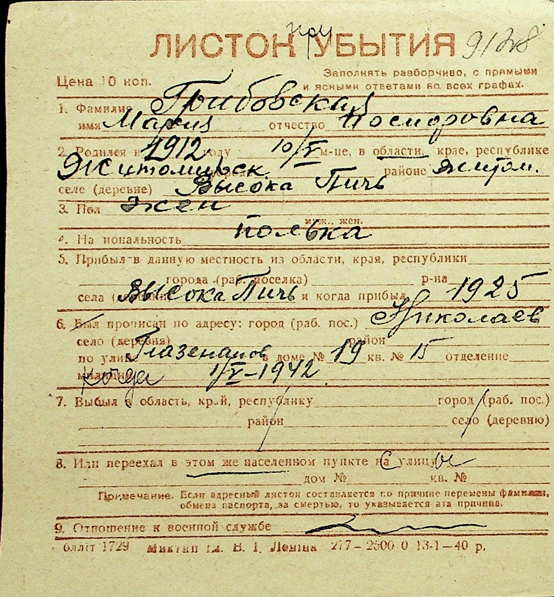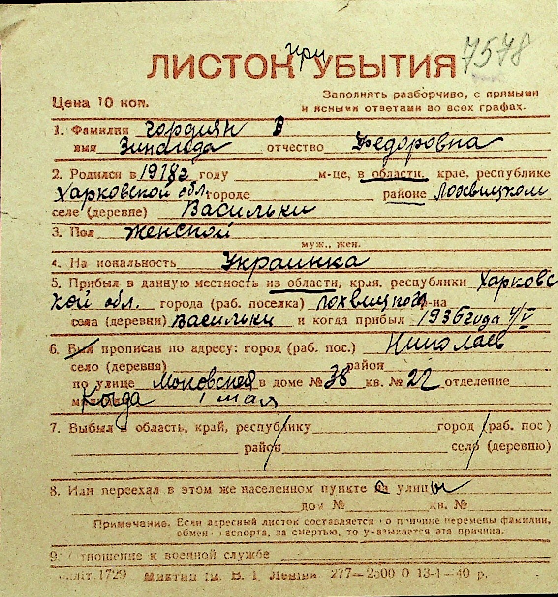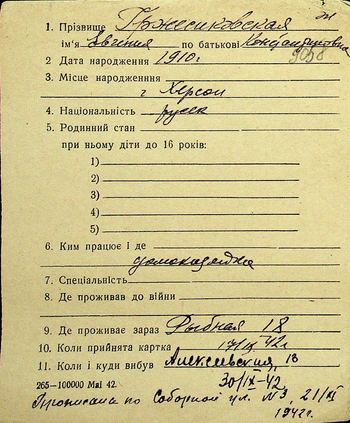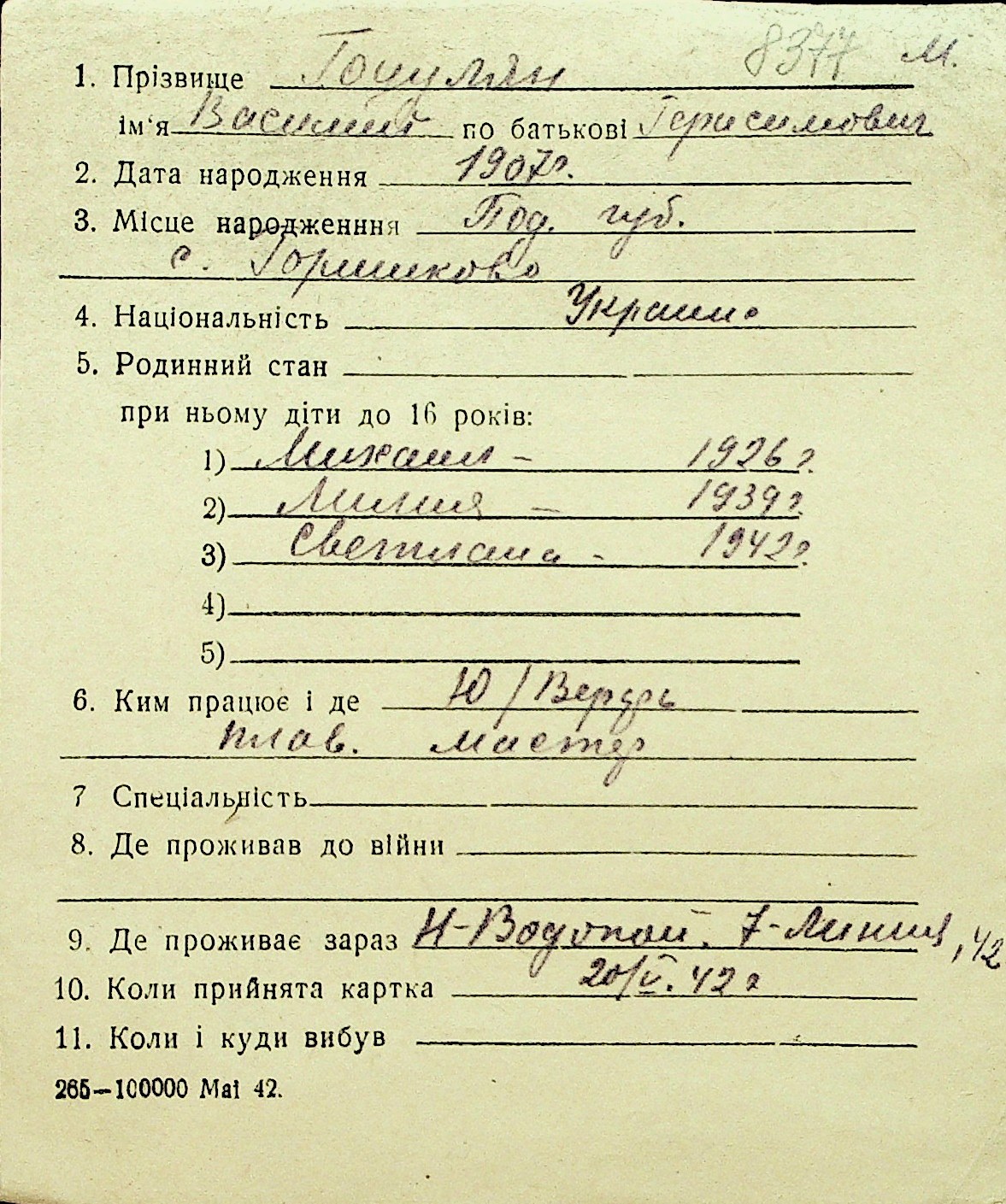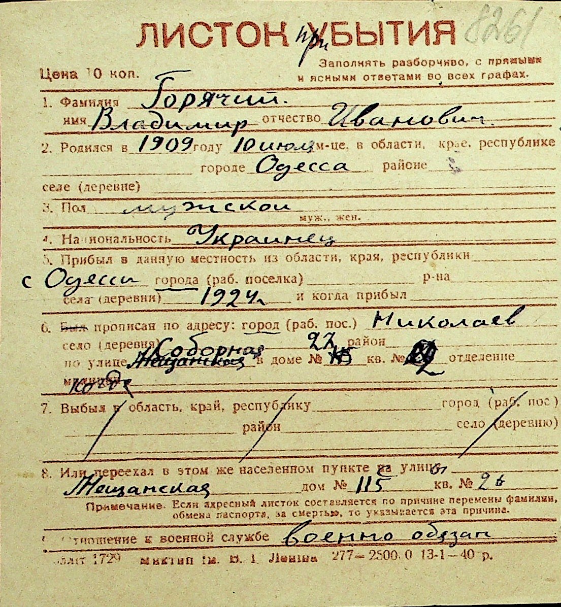 • • Перелік карток до фонду № Н-1016