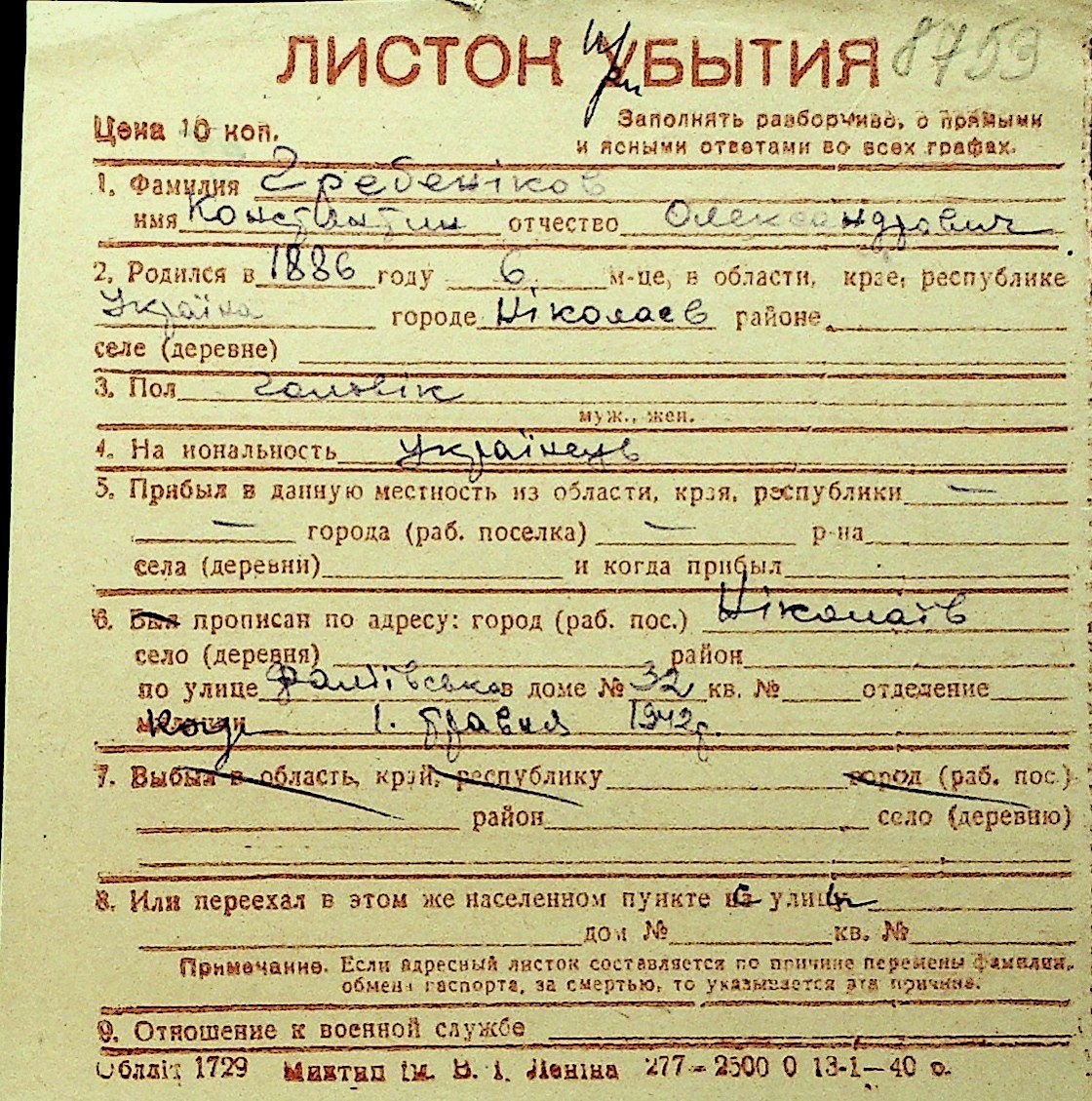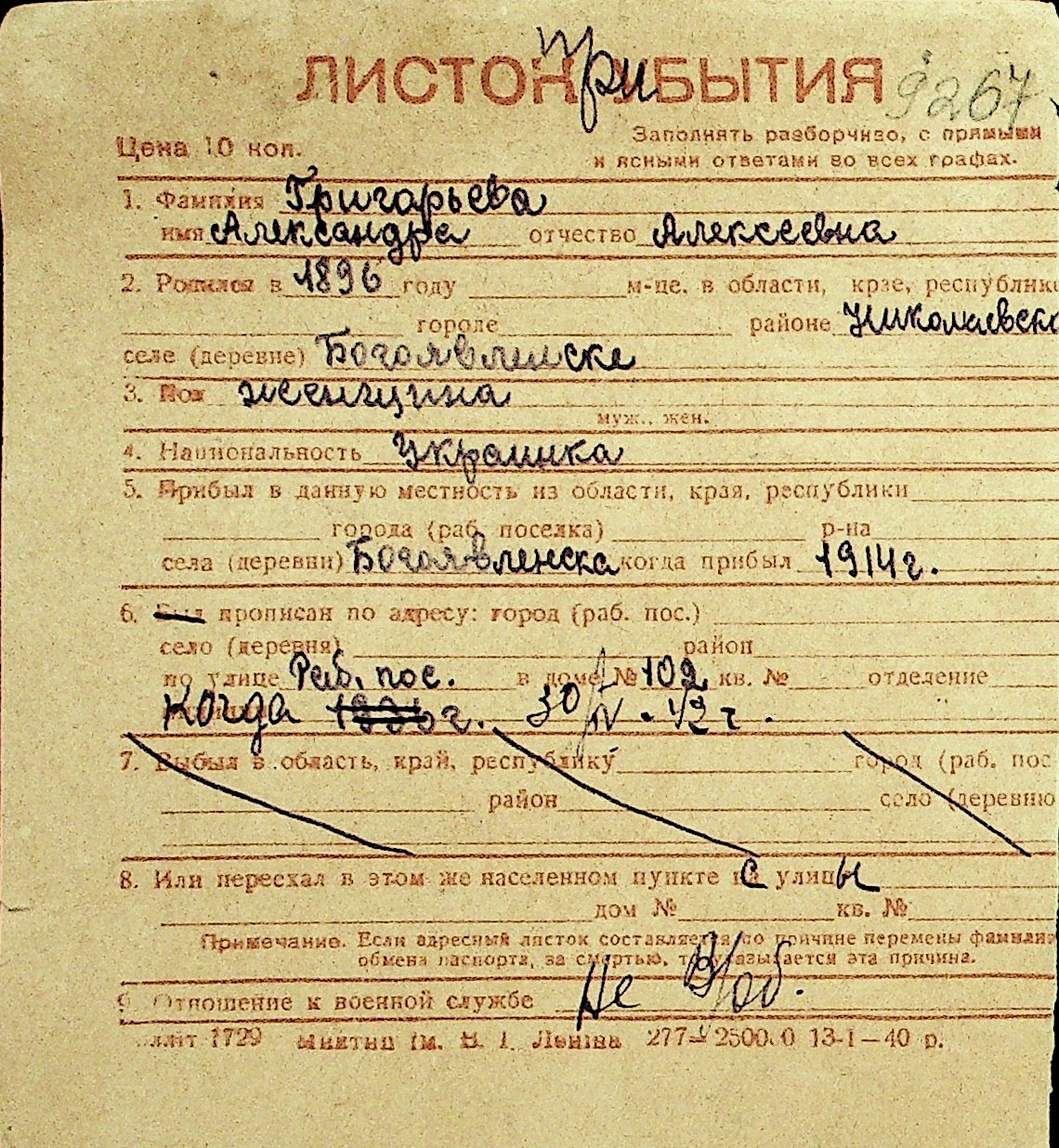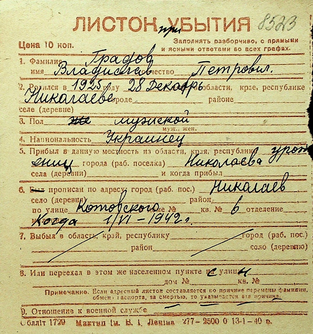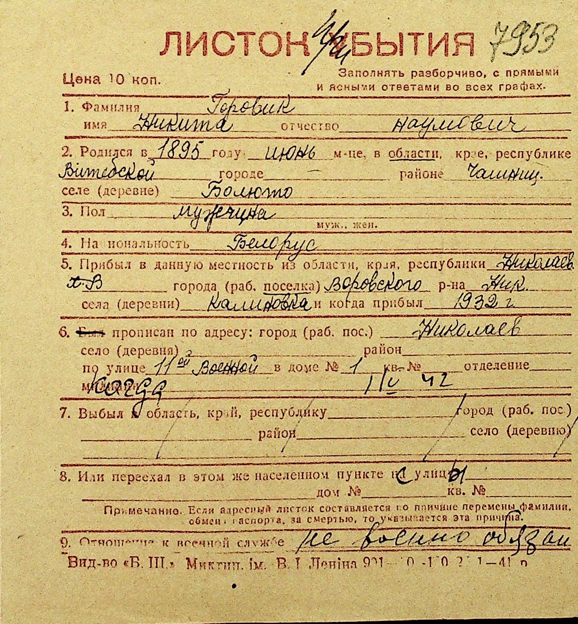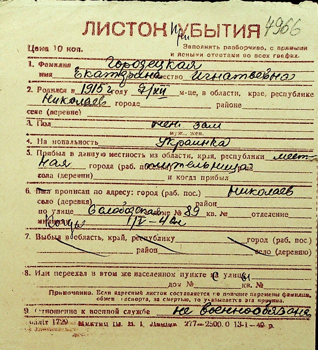 • • Перелік карток до фонду № Н-1016