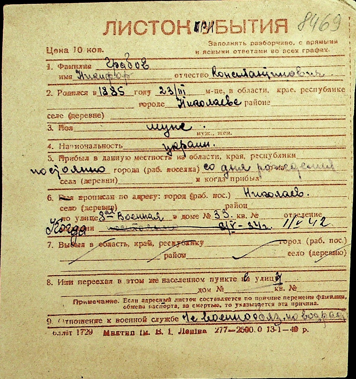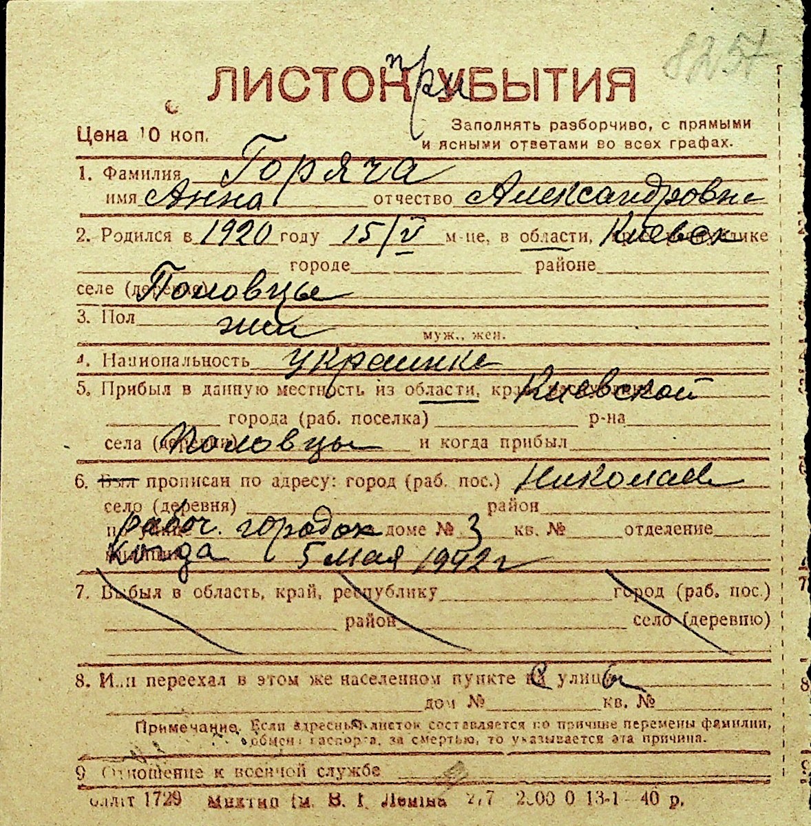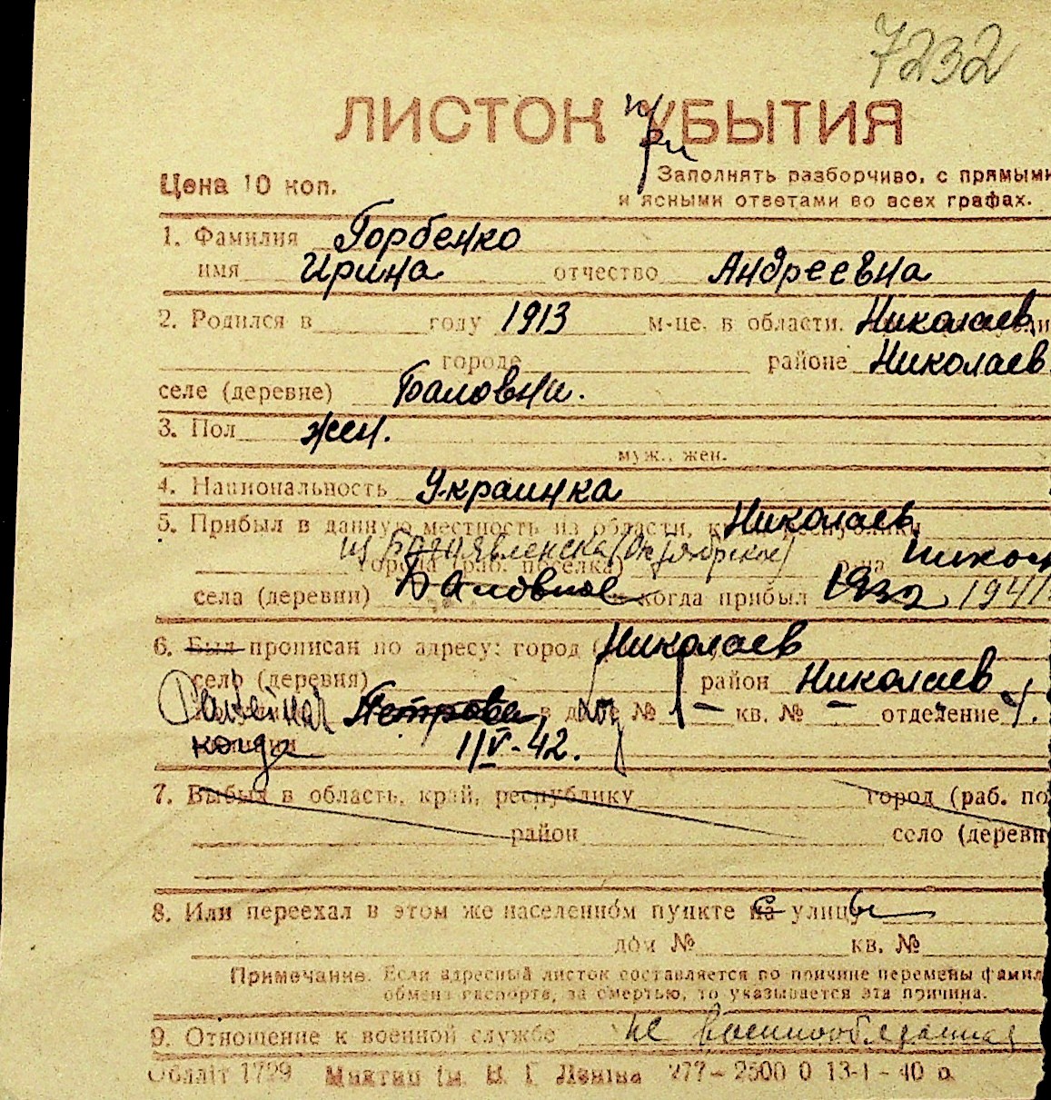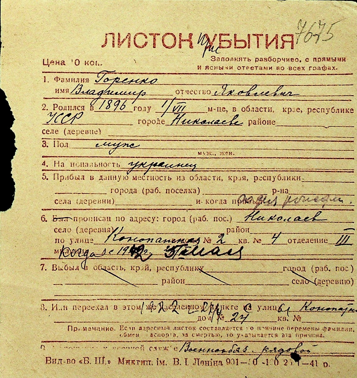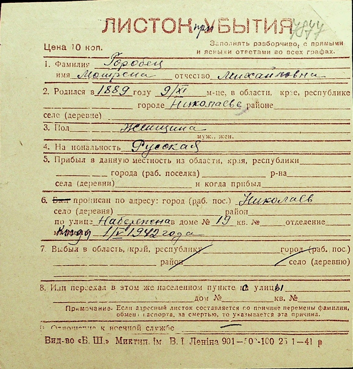 • • Перелік карток до фонду № Н-1016