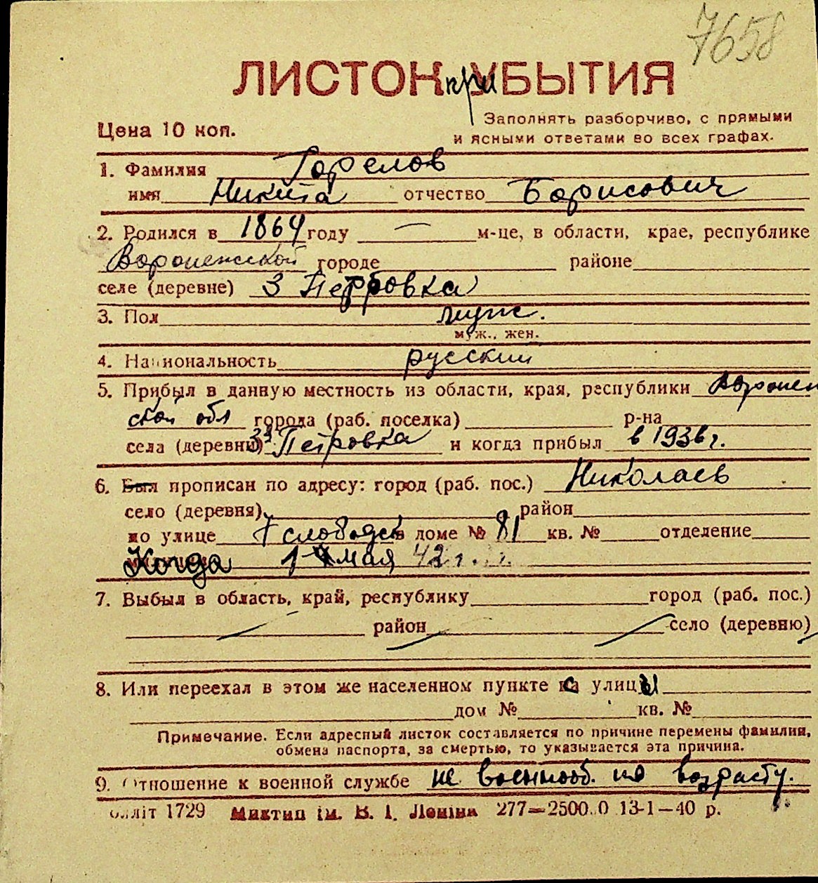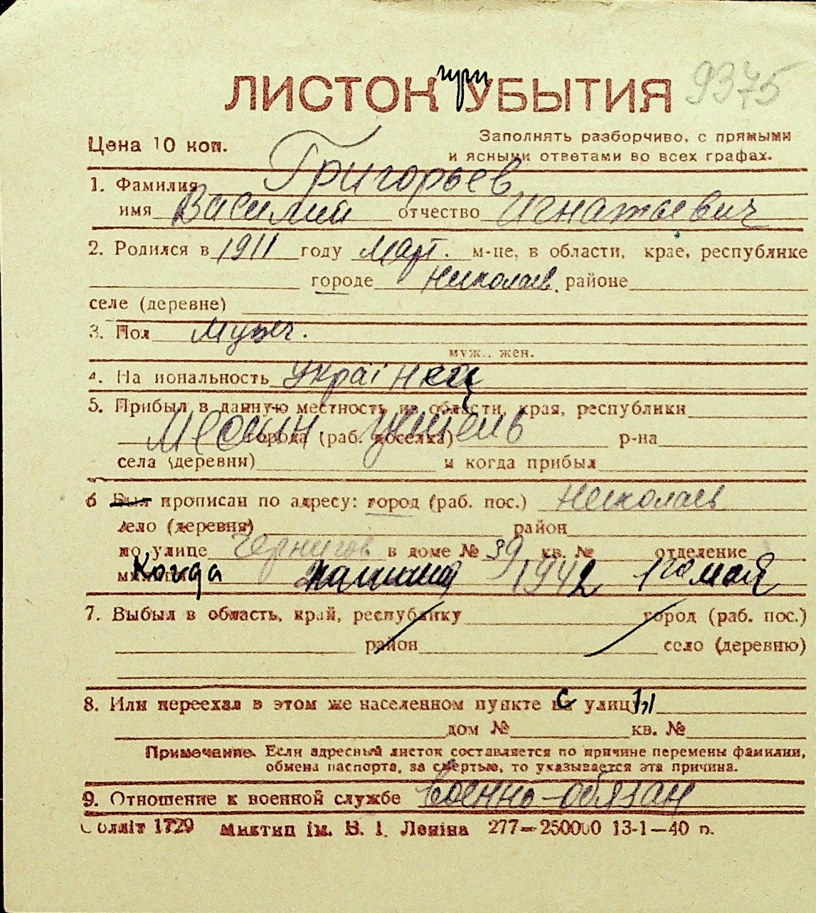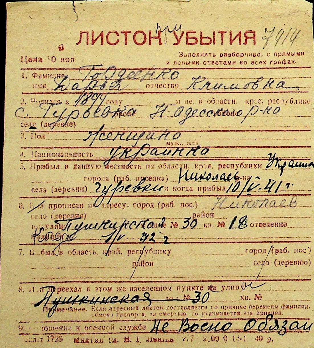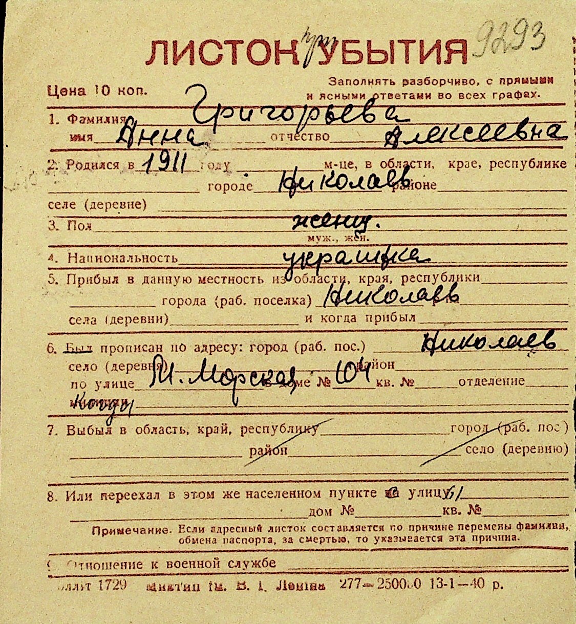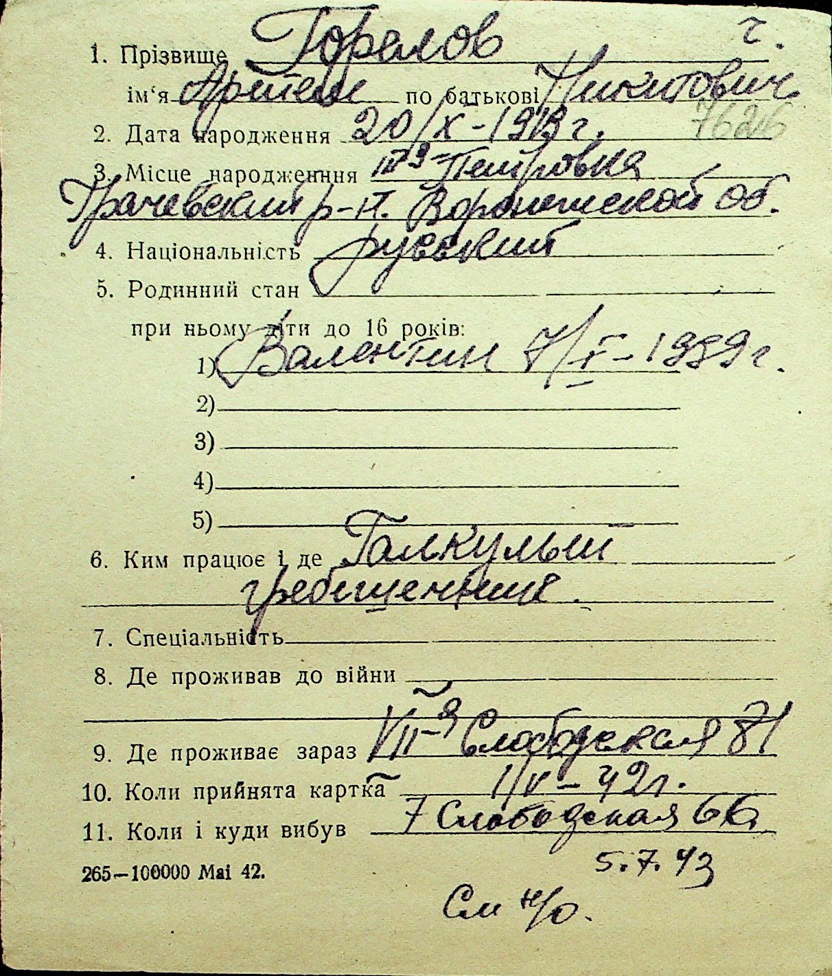 • • Перелік карток до фонду № Н-1016