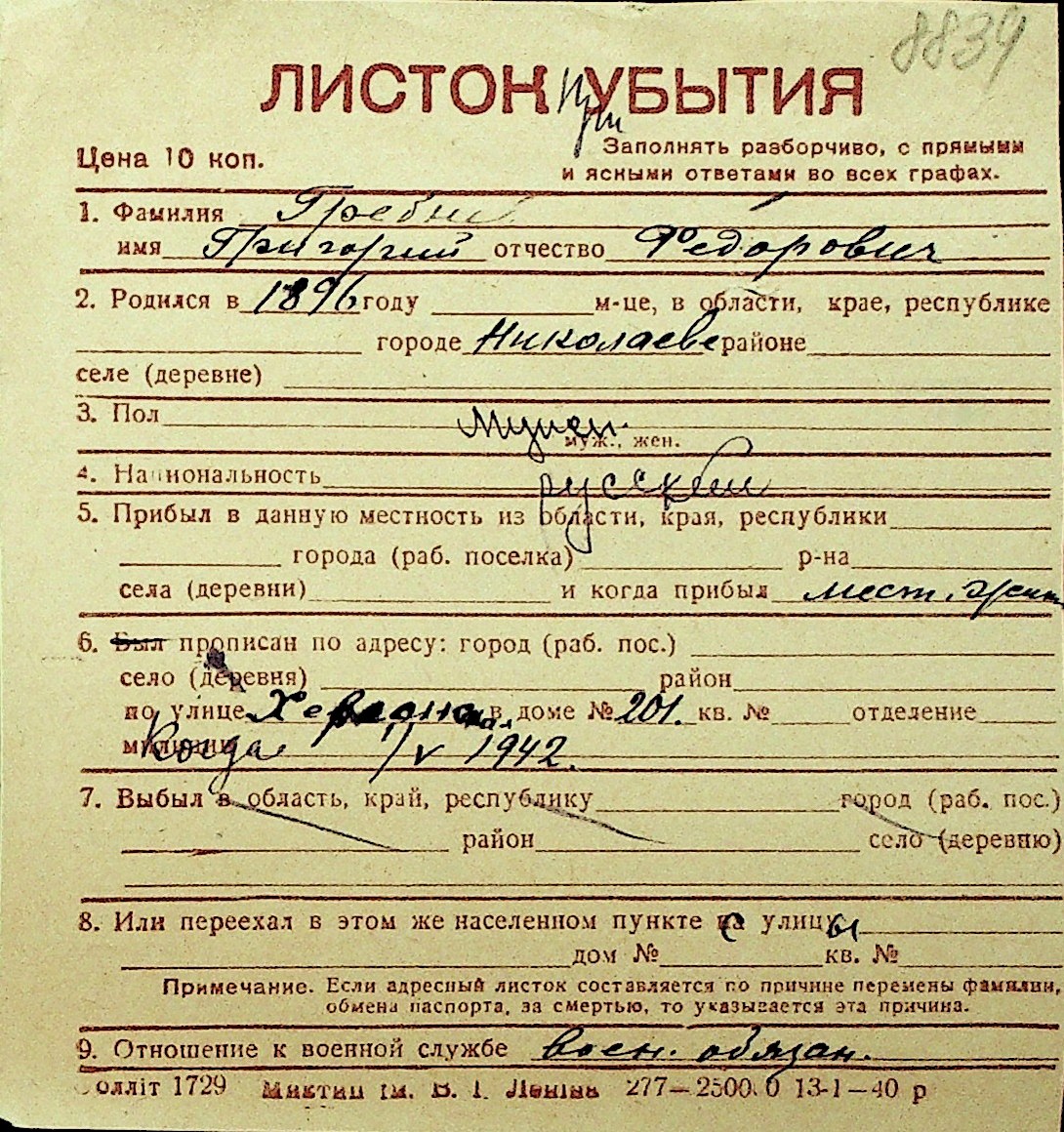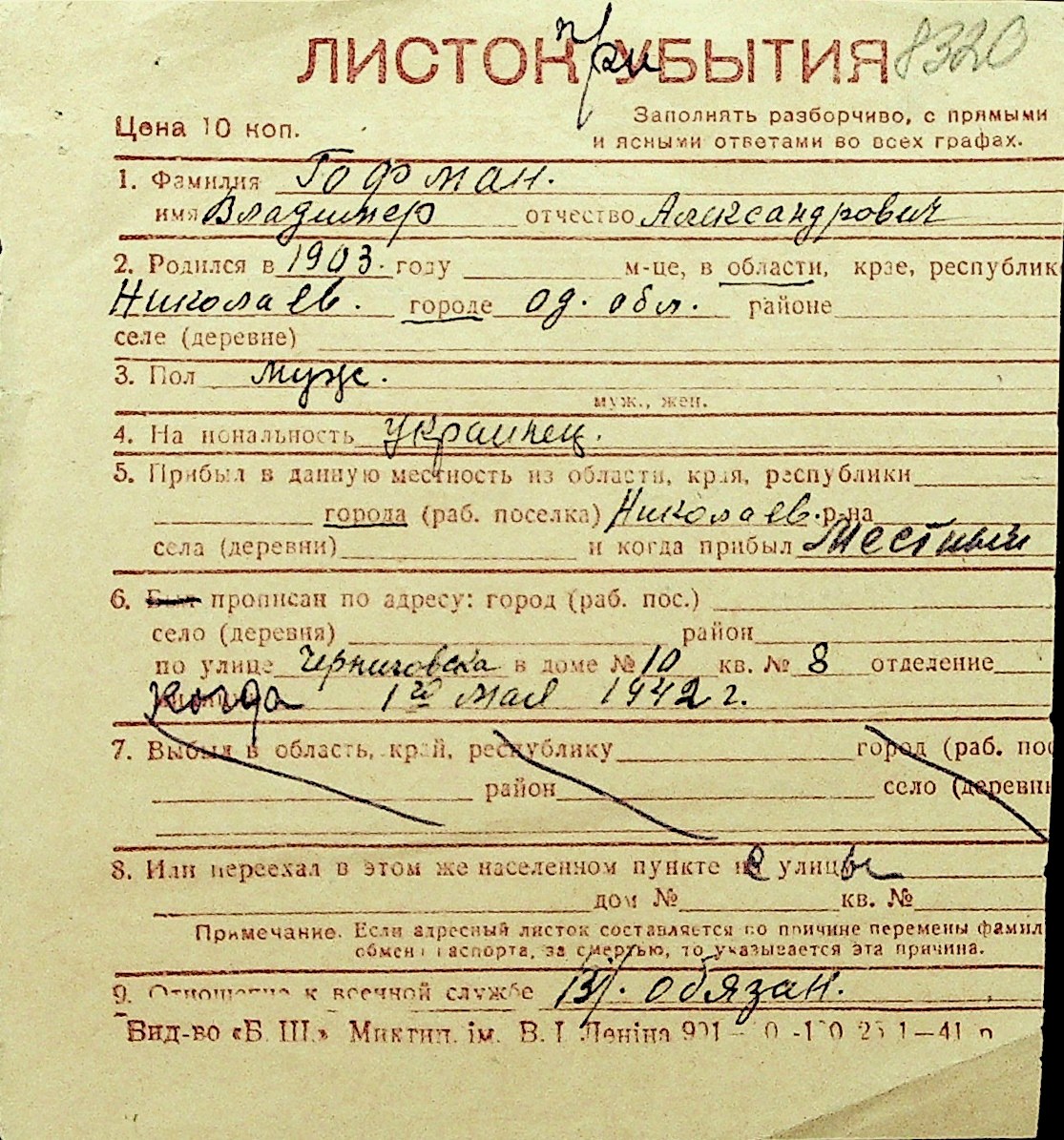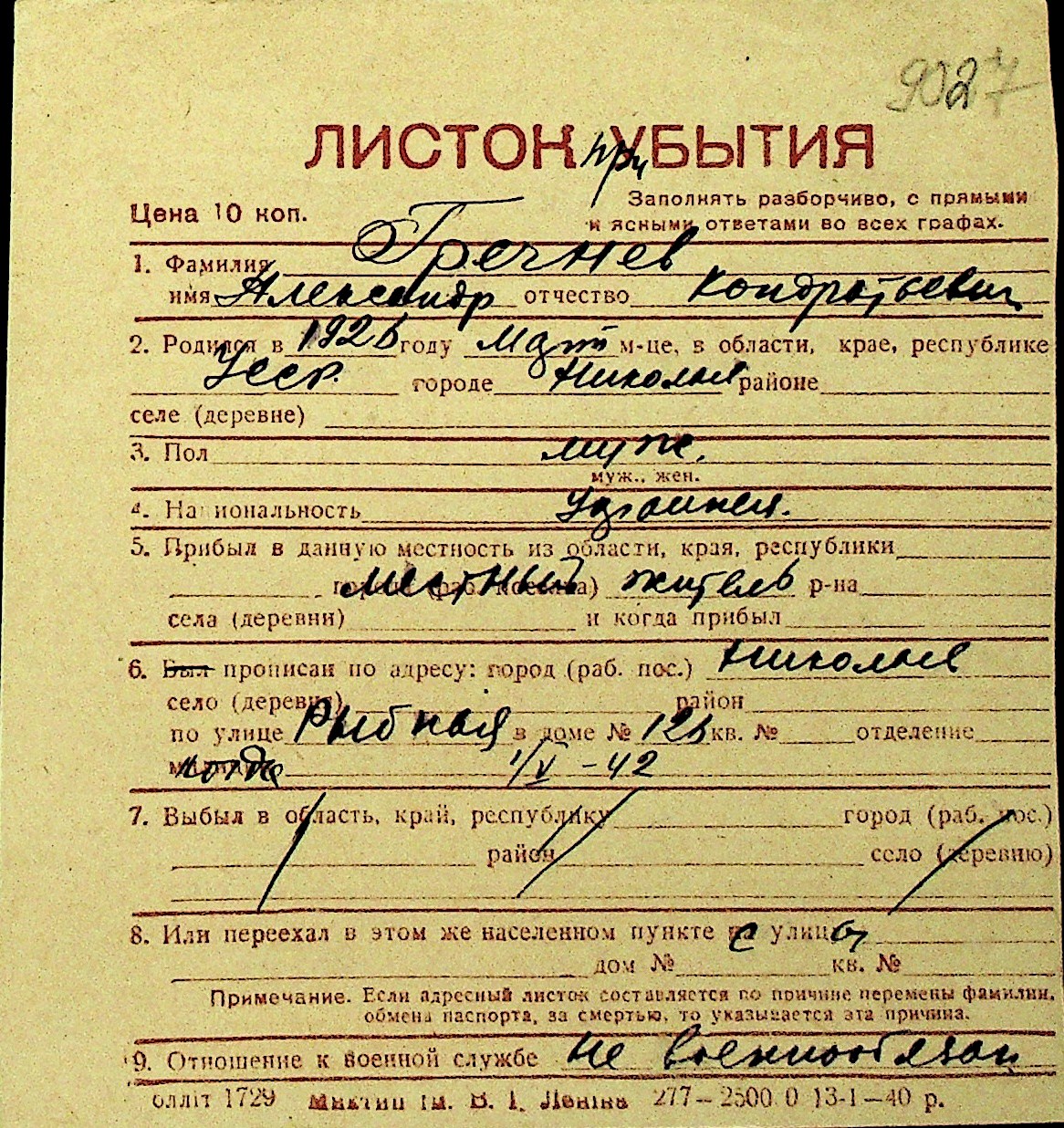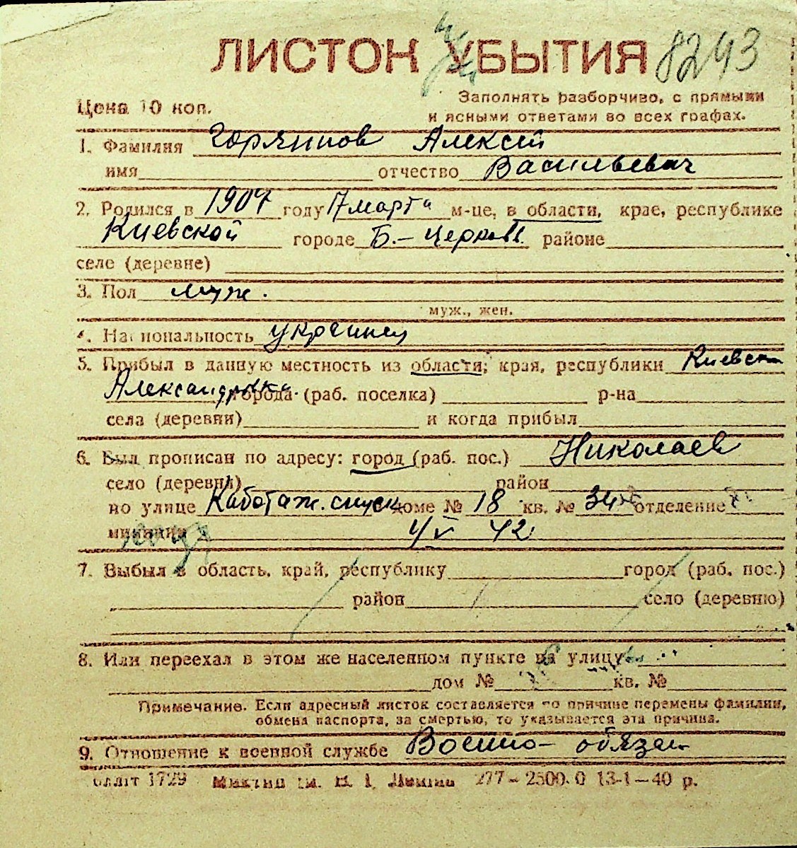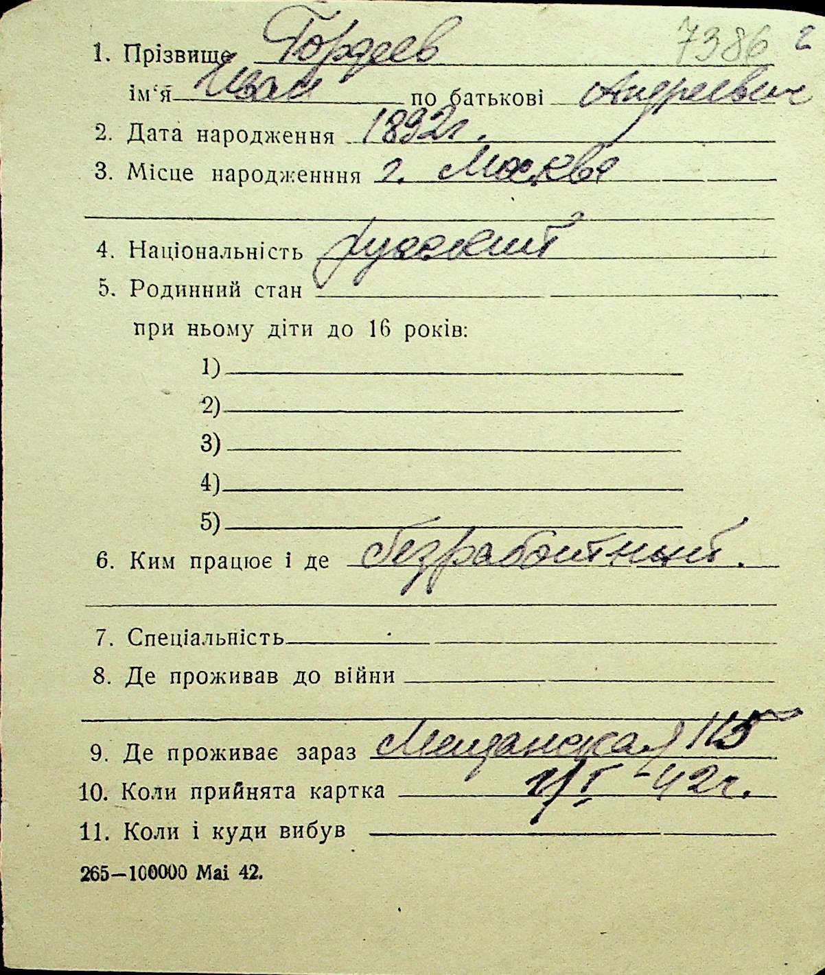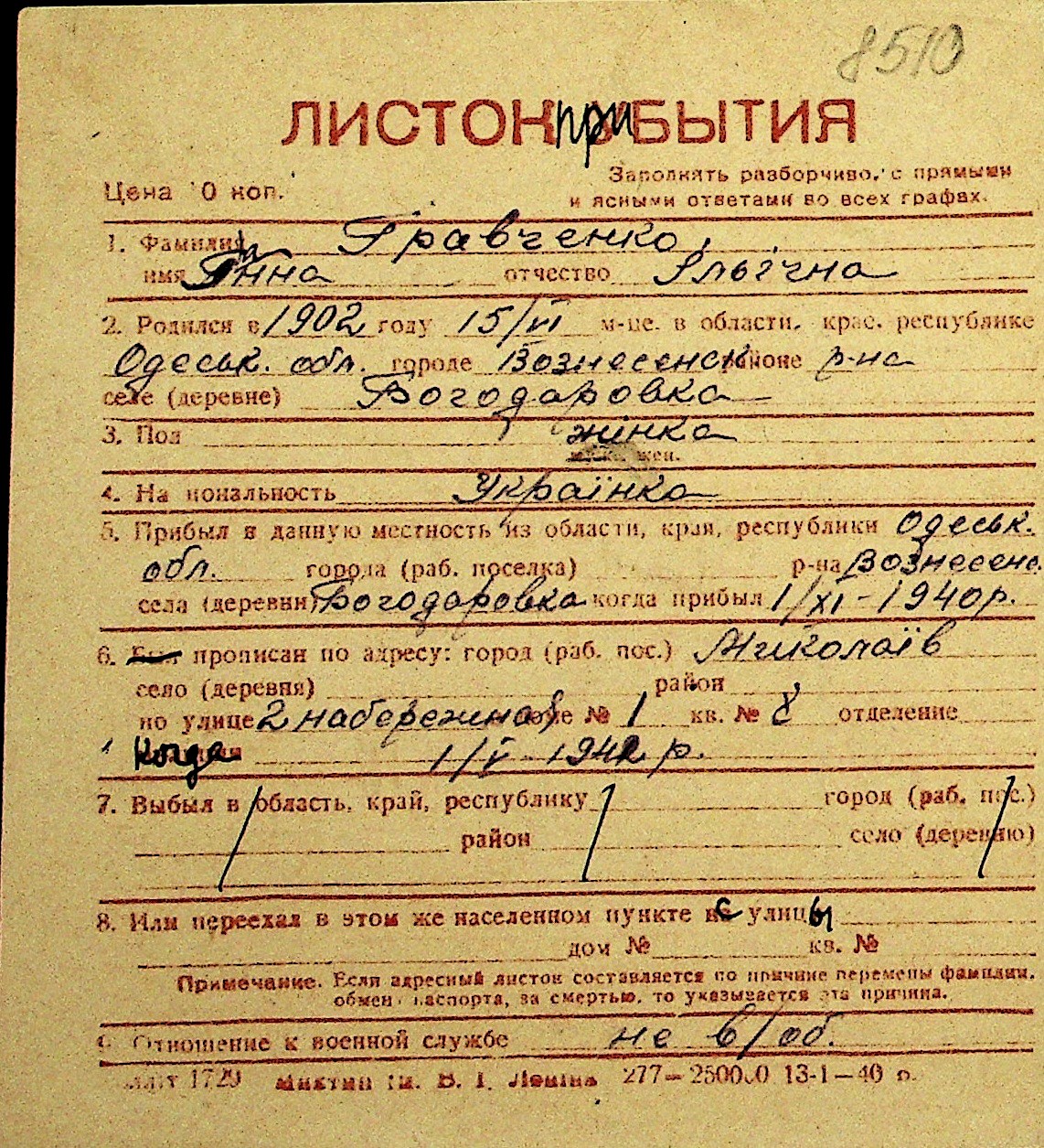 • • Перелік карток до фонду № Н-1016