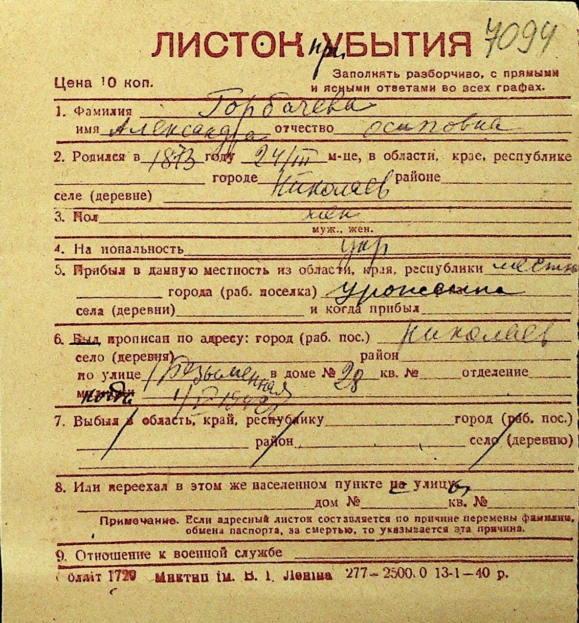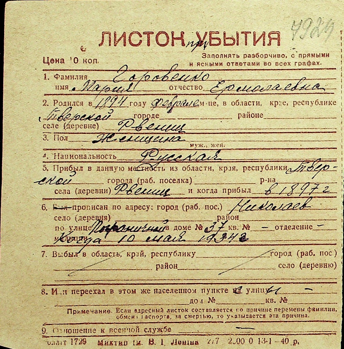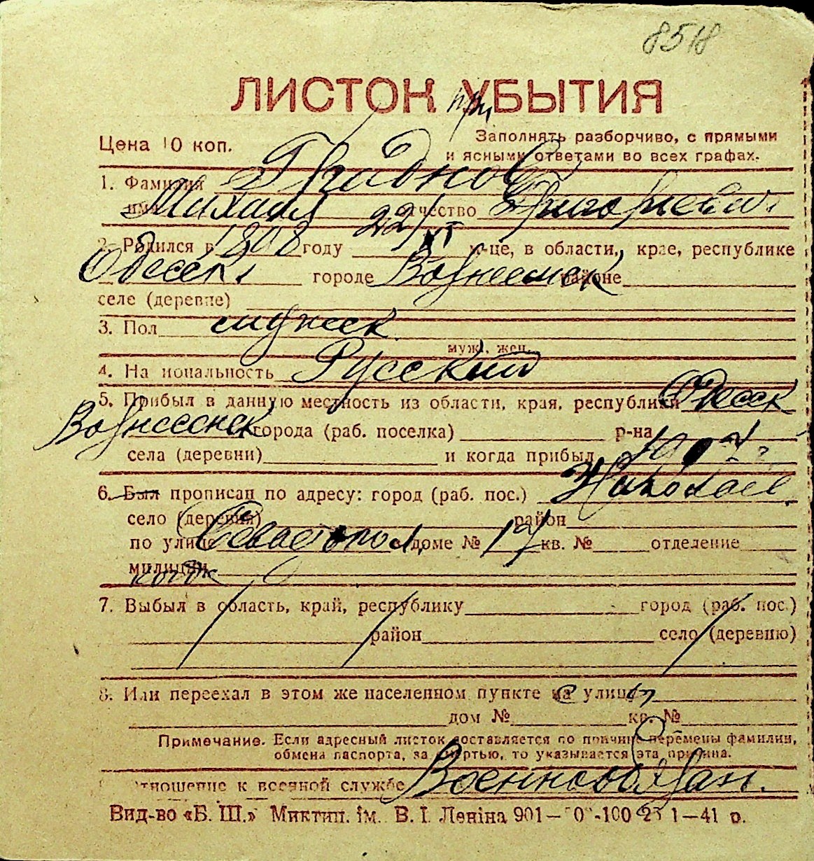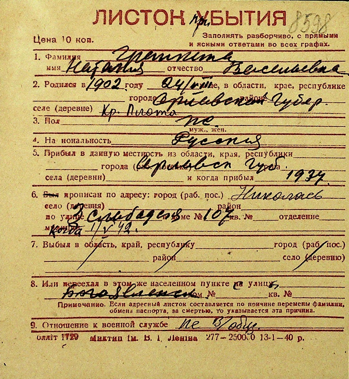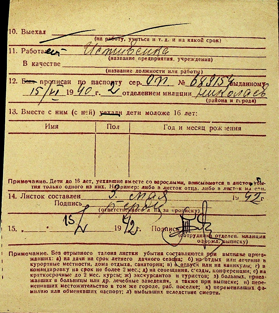 • • Перелік карток до фонду № Н-1016