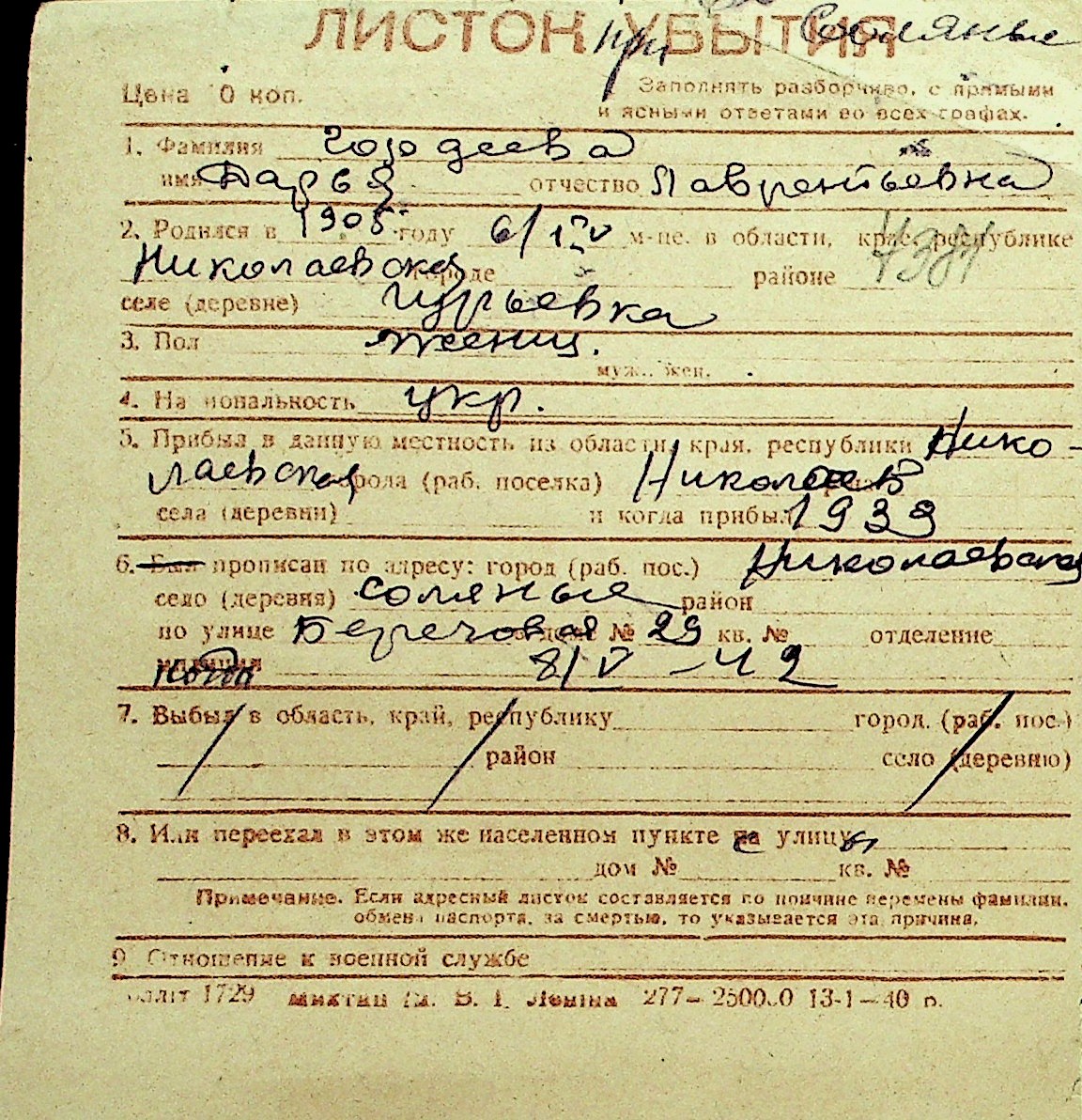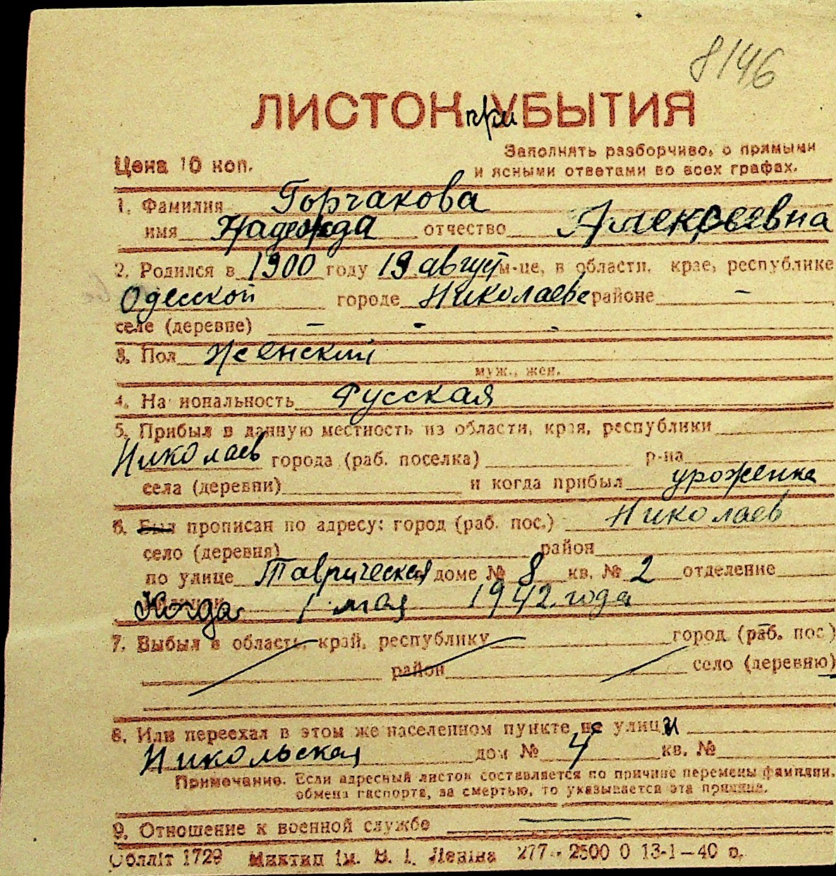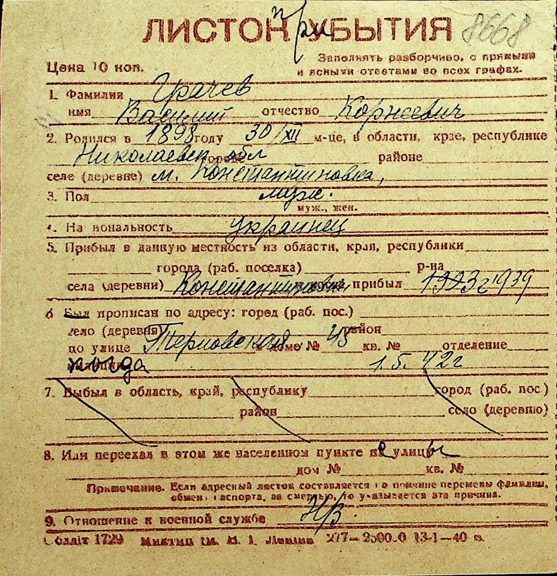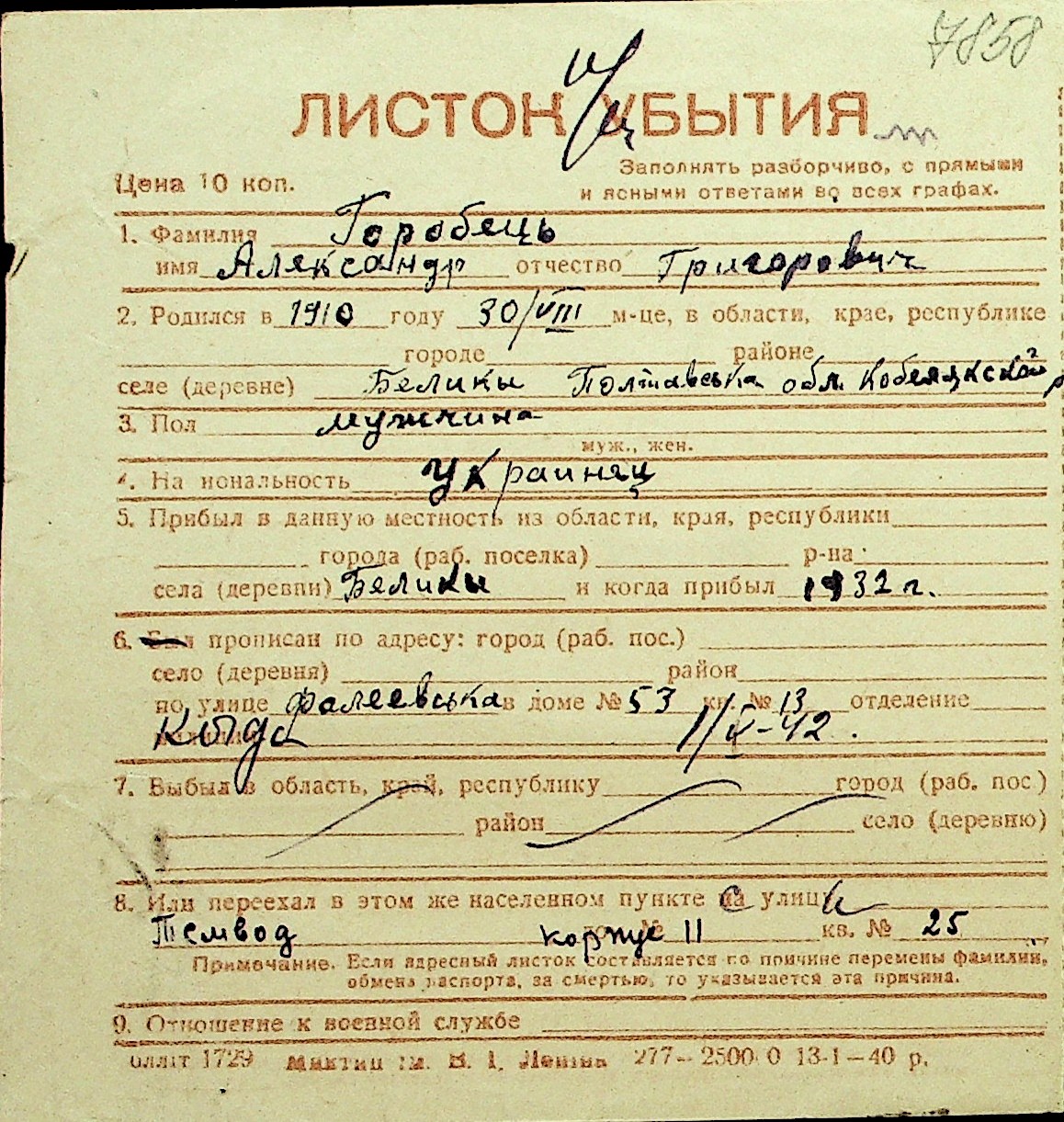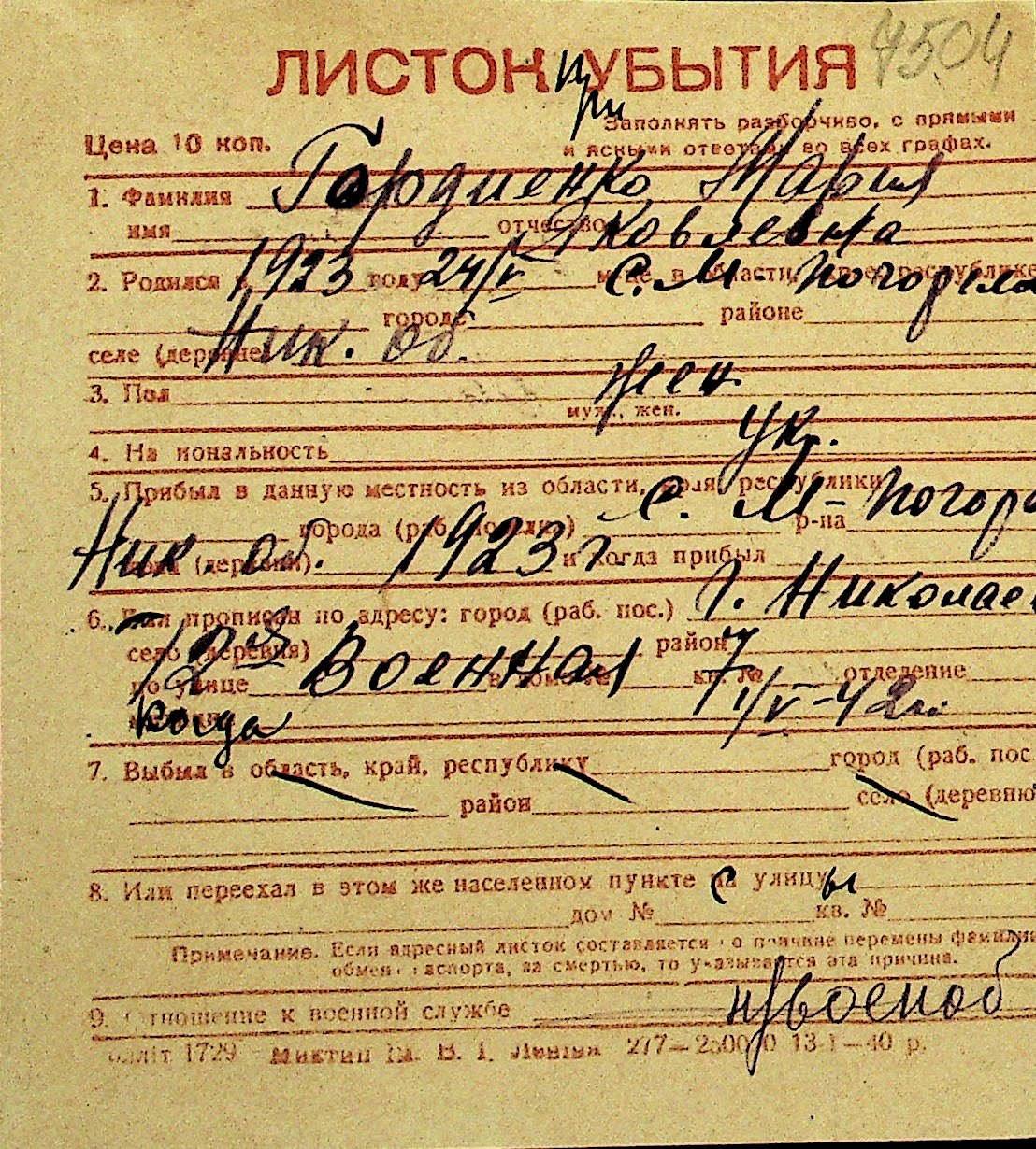 • • Перелік карток до фонду № Н-1016