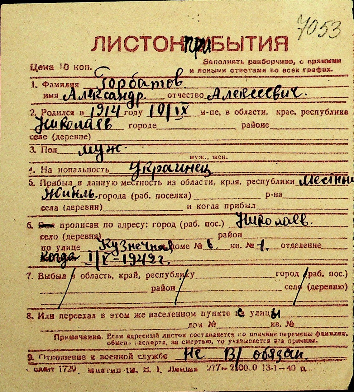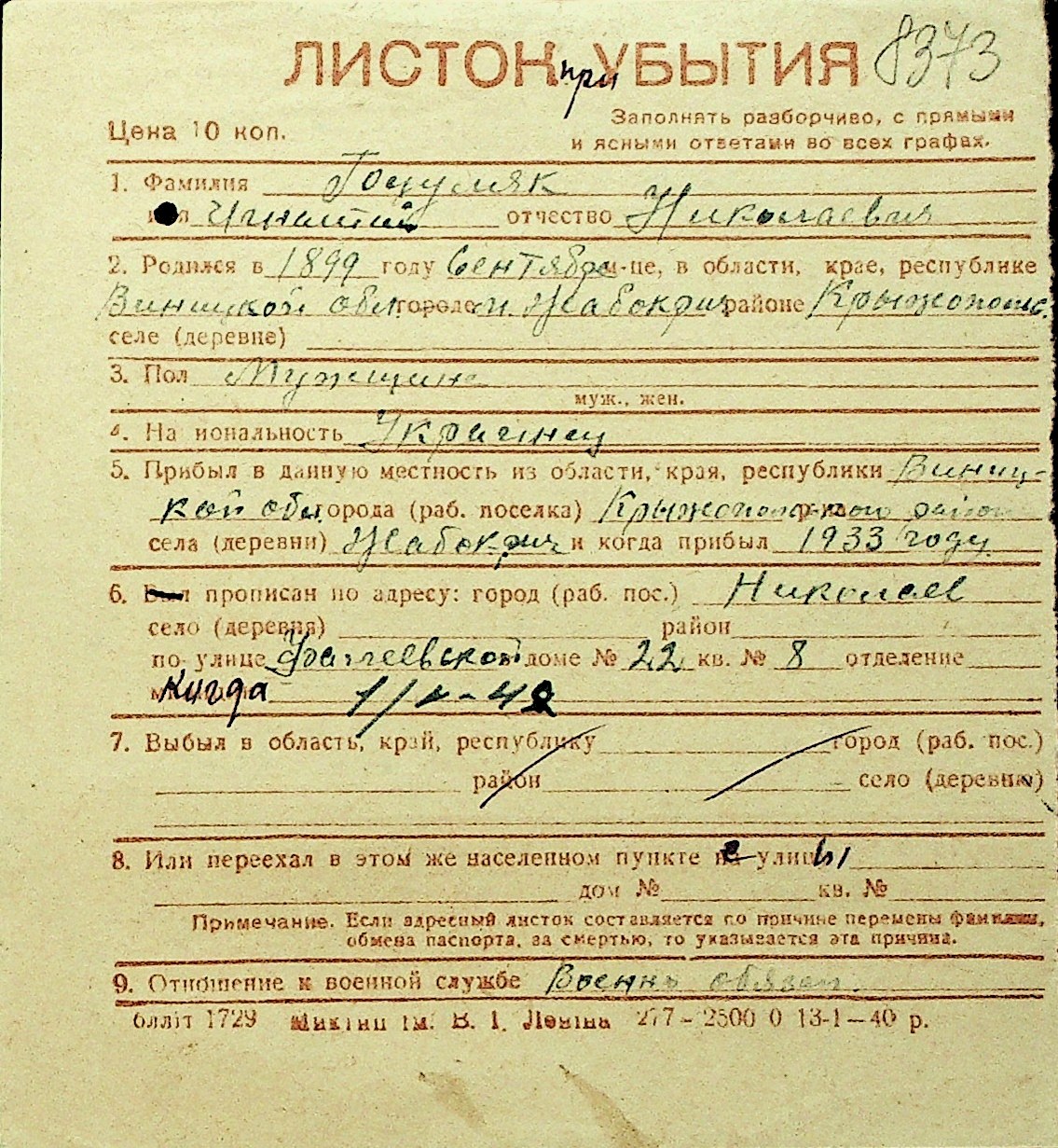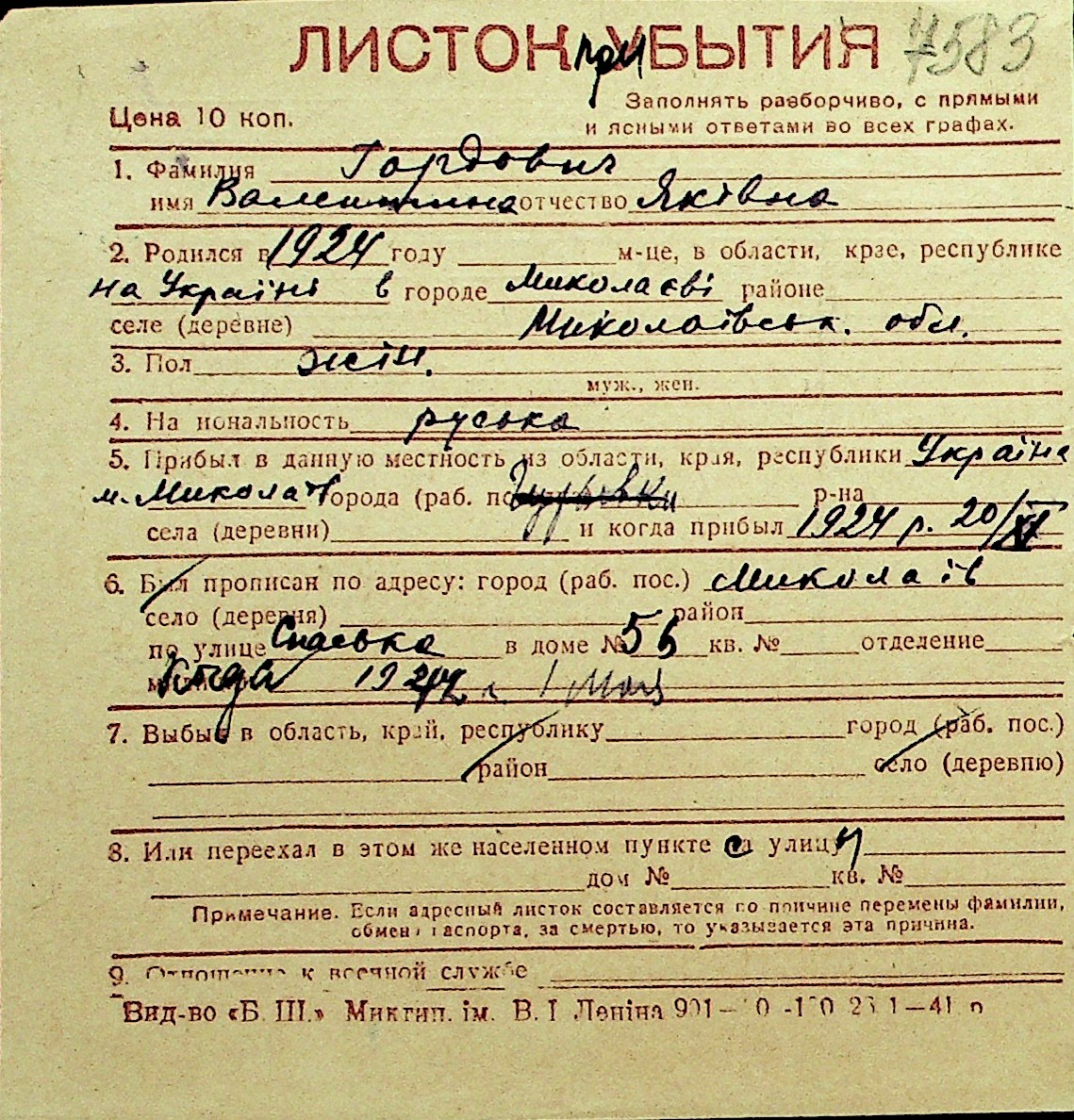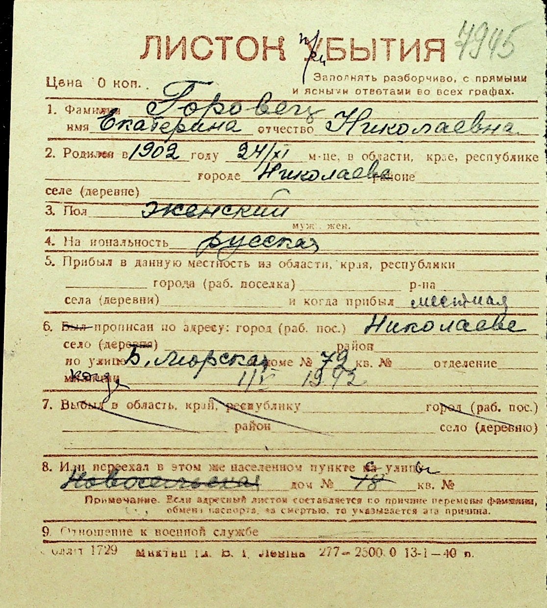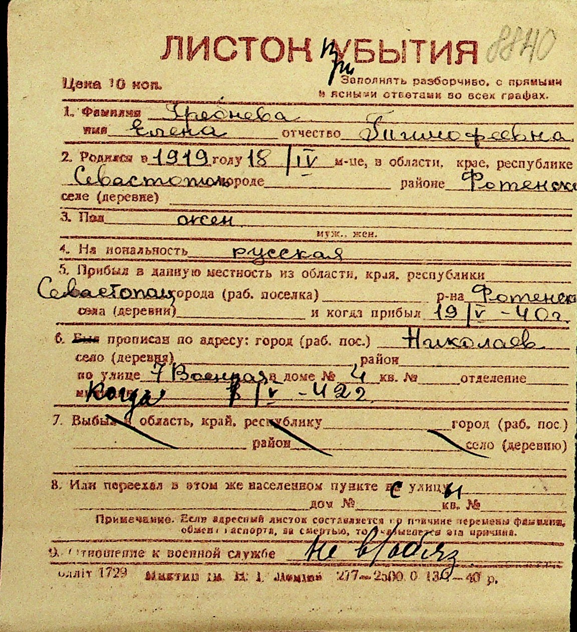• • Перелік карток до фонду № Н-1016