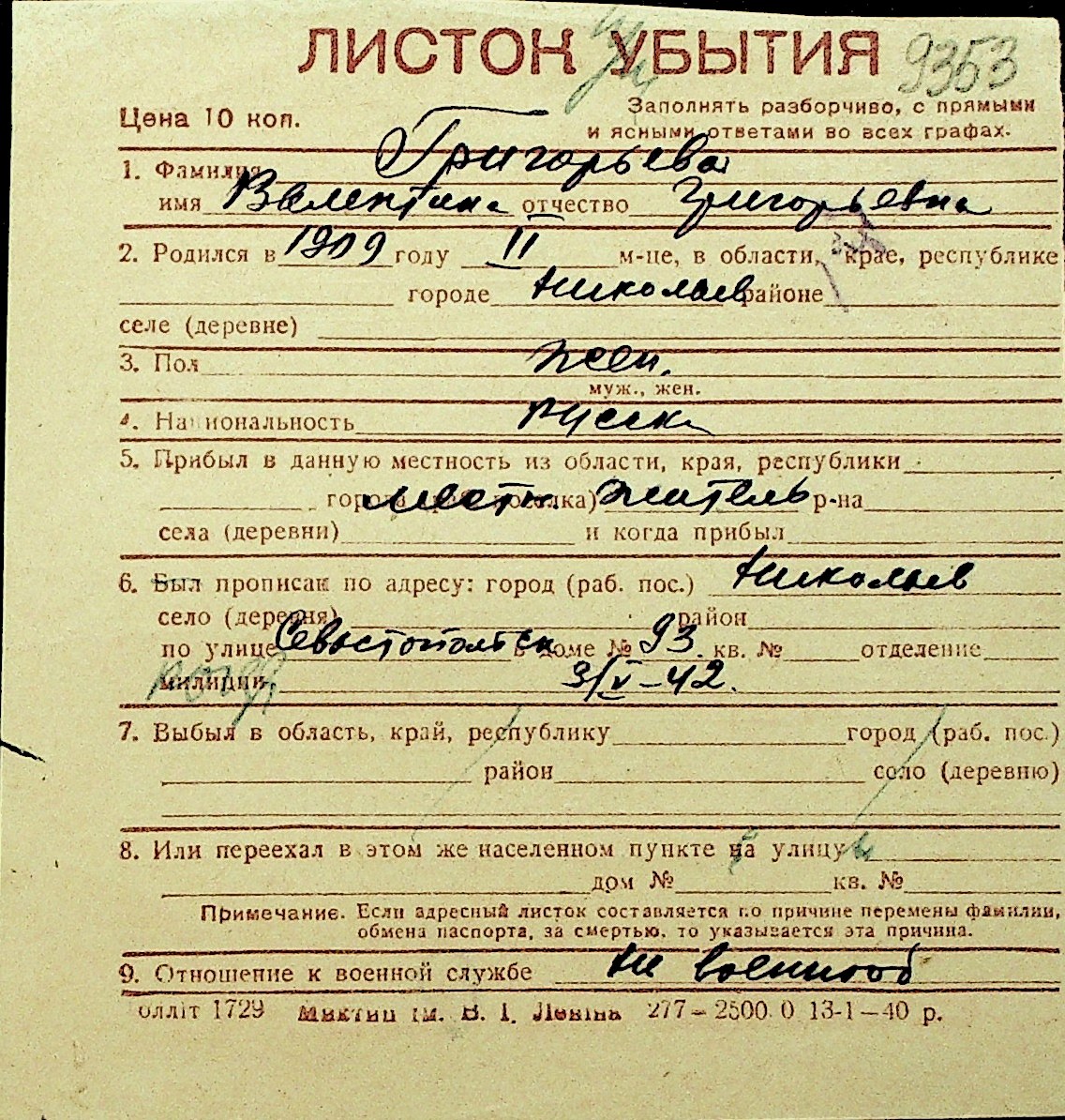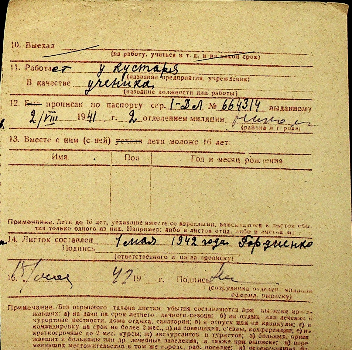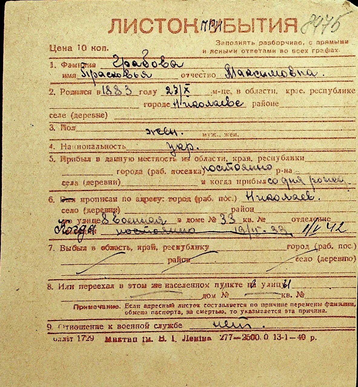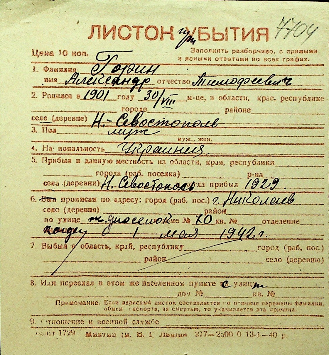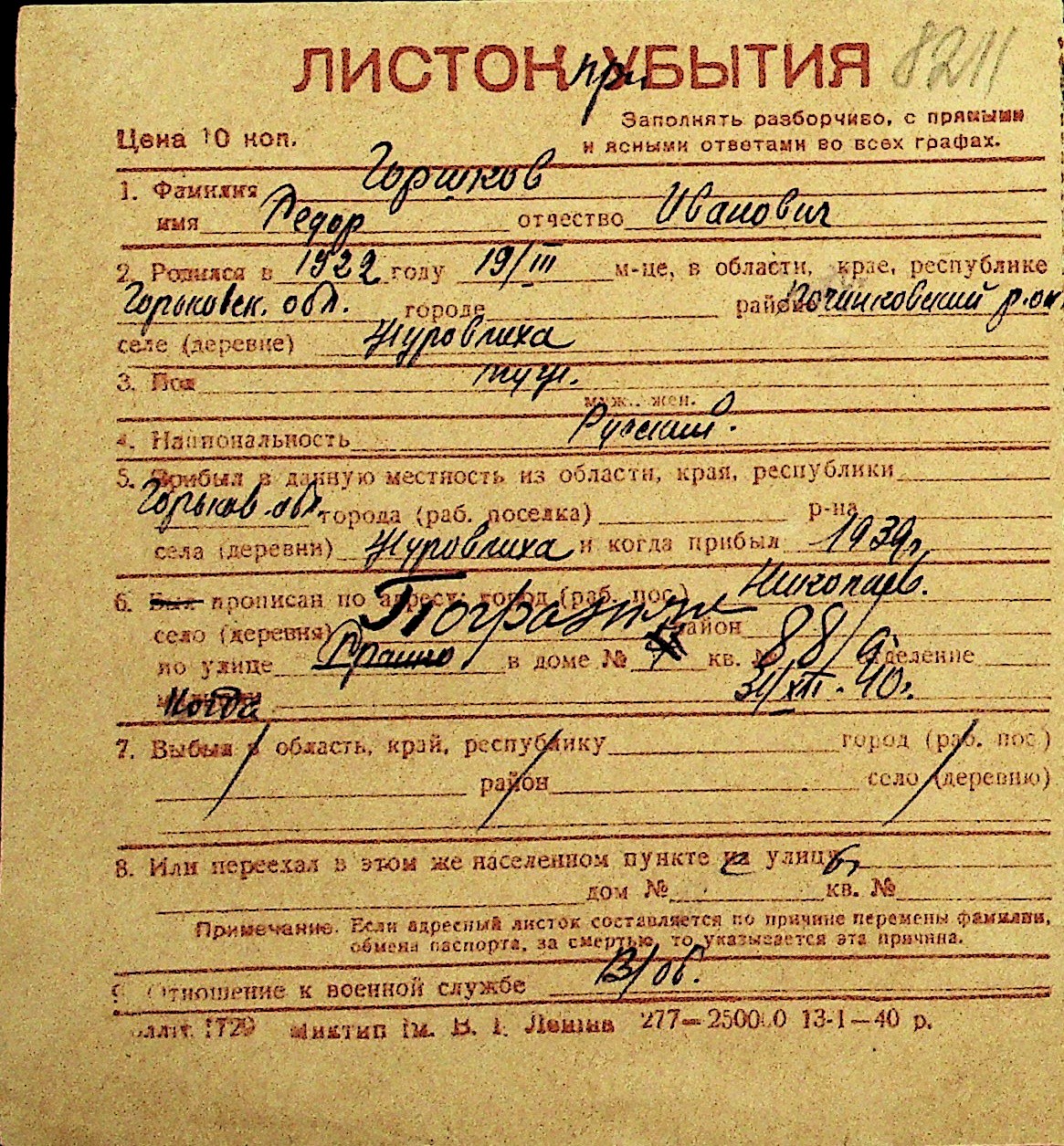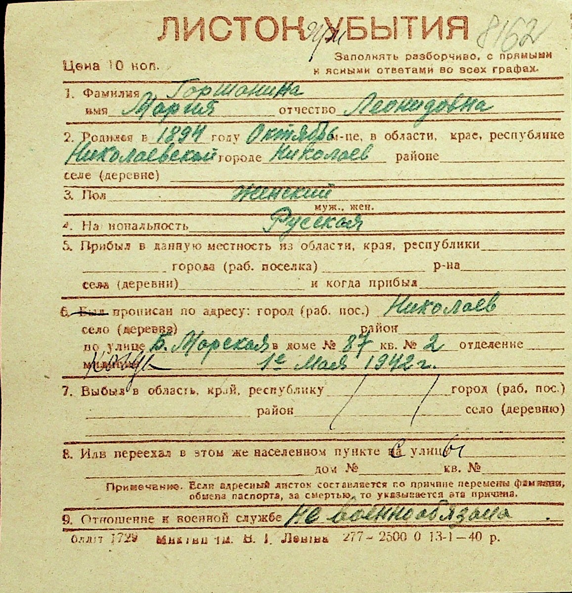 • • Перелік карток до фонду № Н-1016
