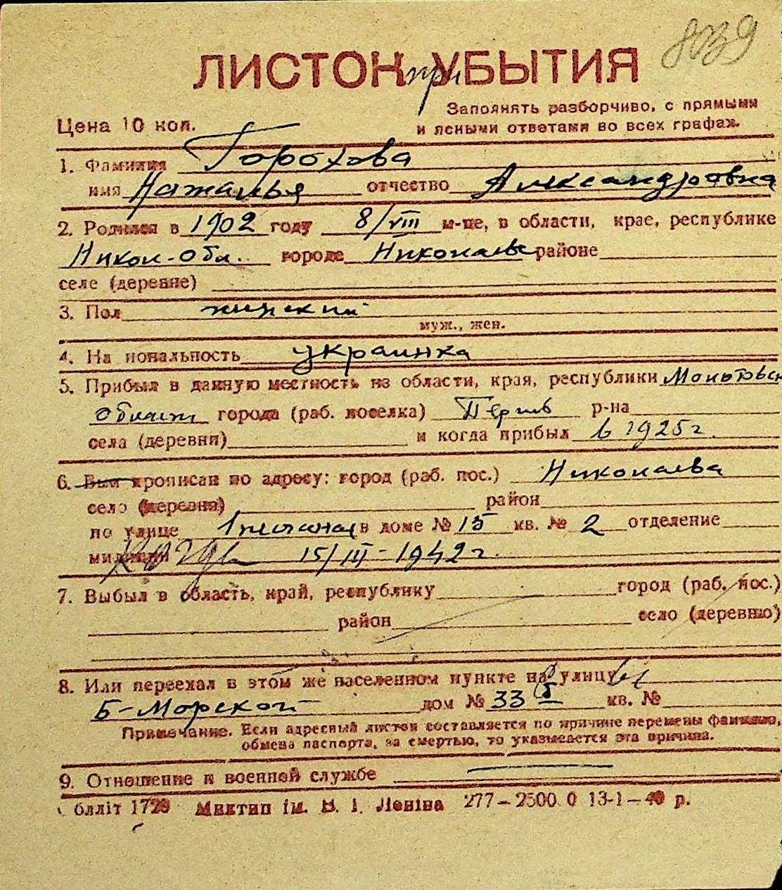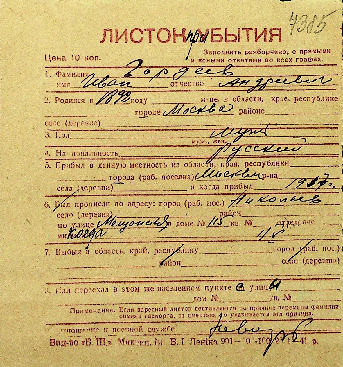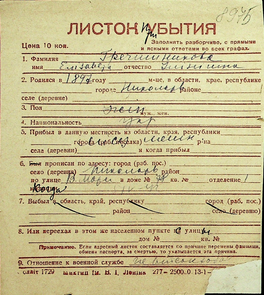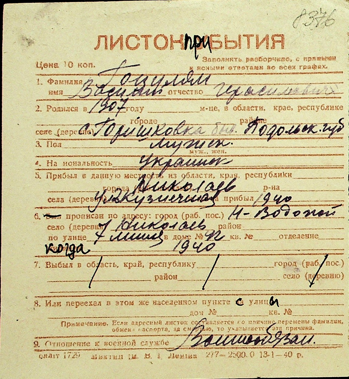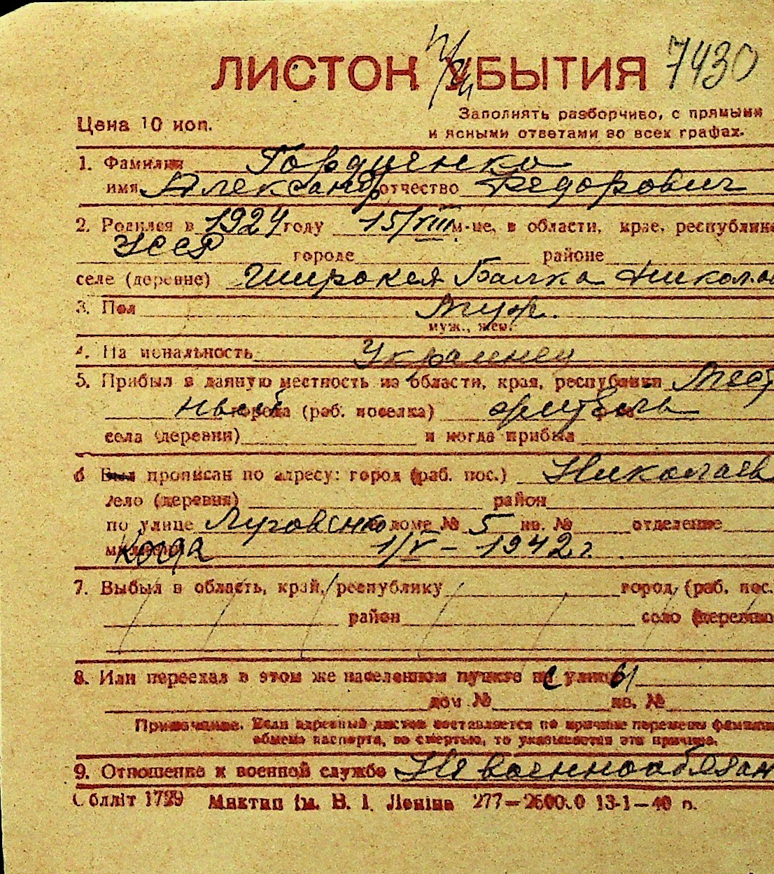 • • Перелік карток до фонду № Н-1016