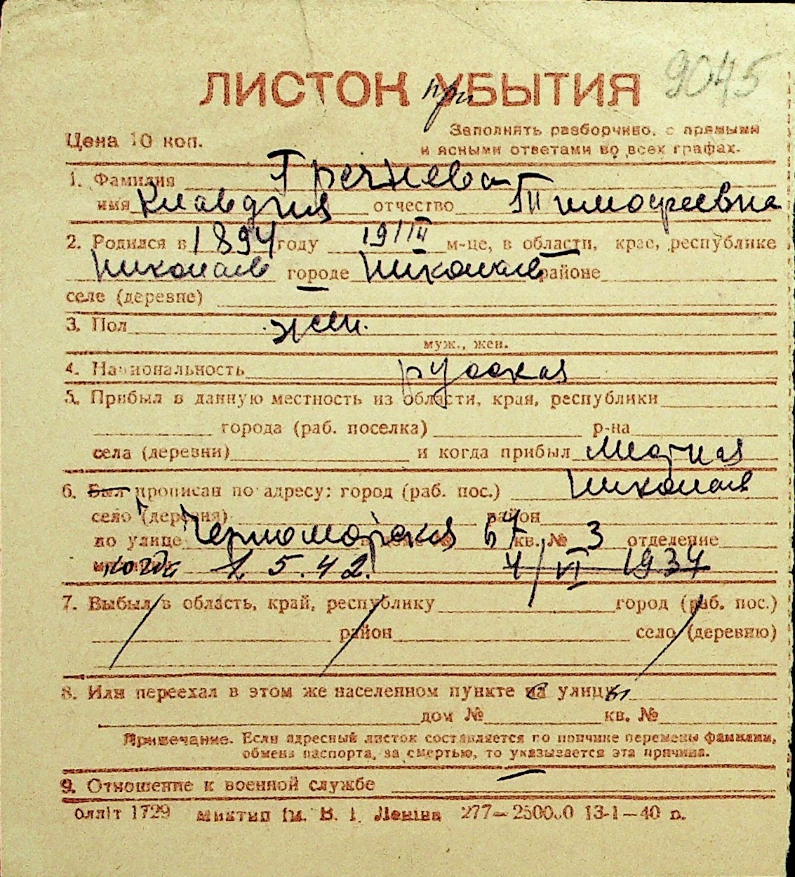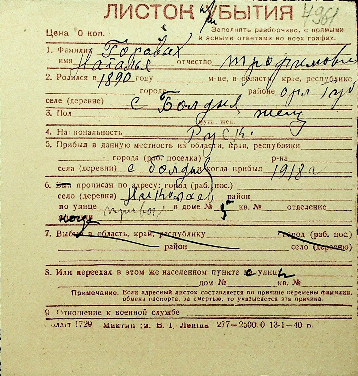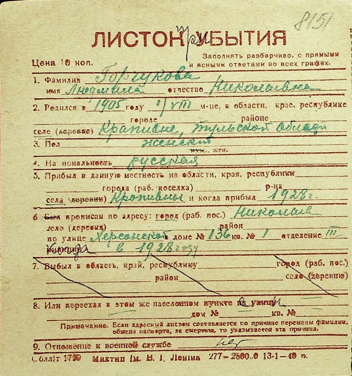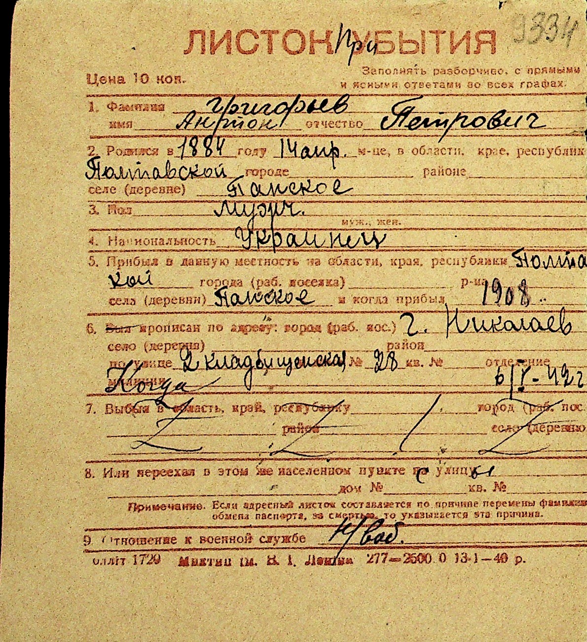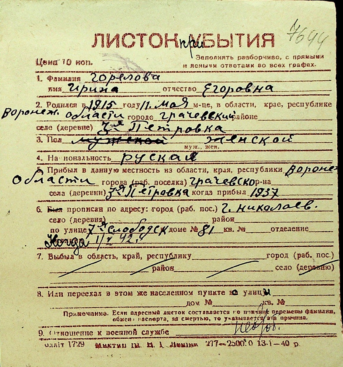 • • Перелік карток до фонду № Н-1016