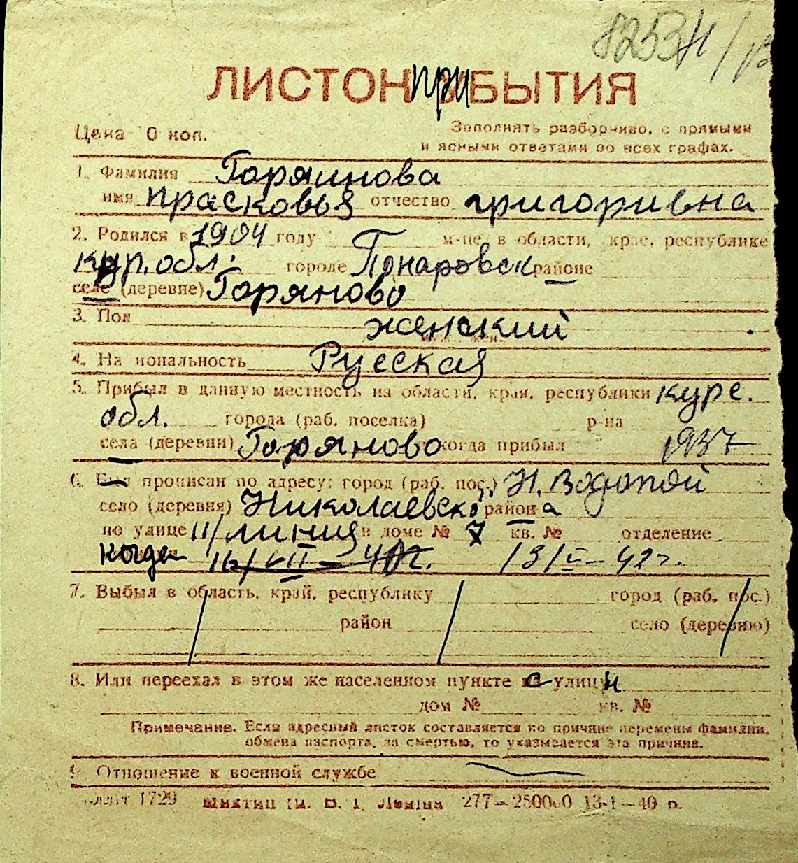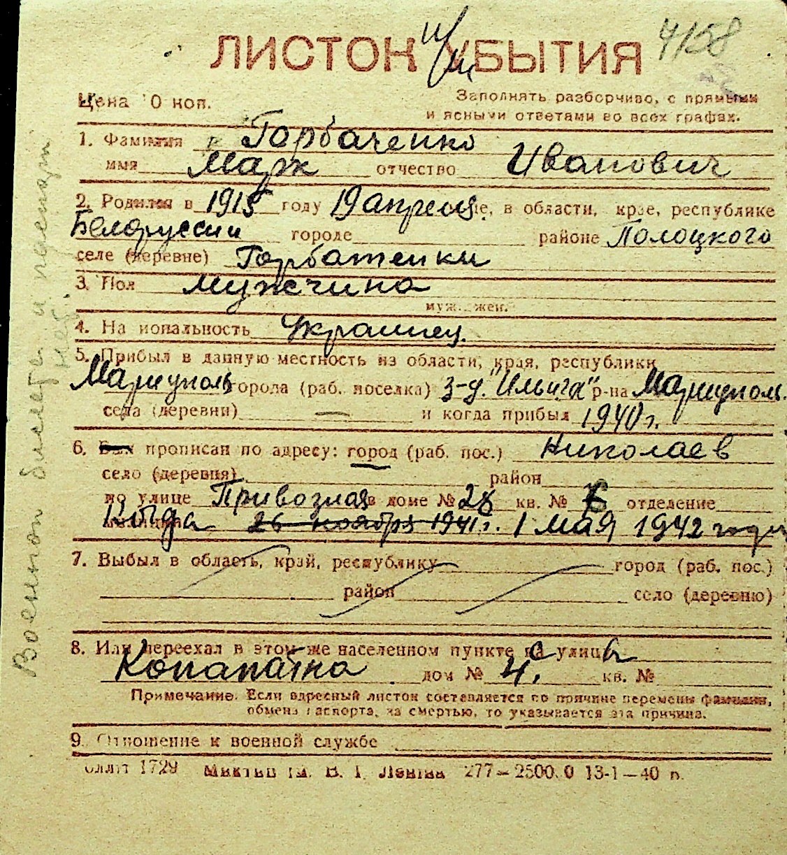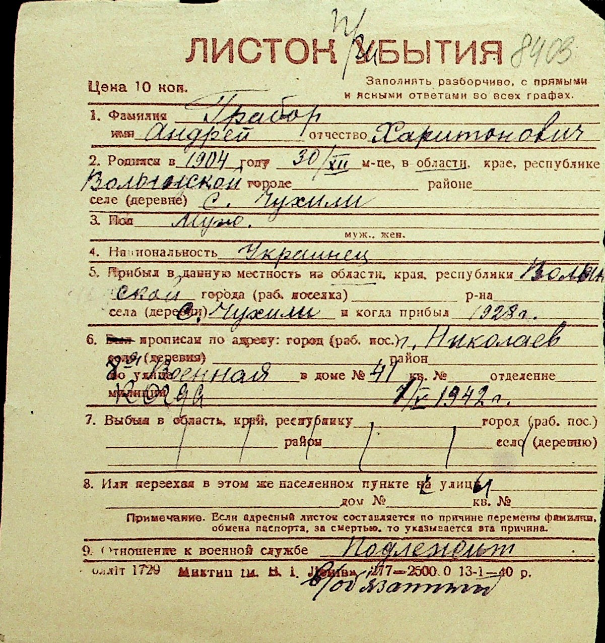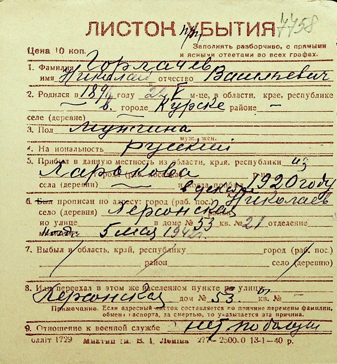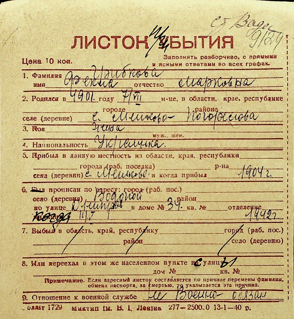 • • Перелік карток до фонду № Н-1016