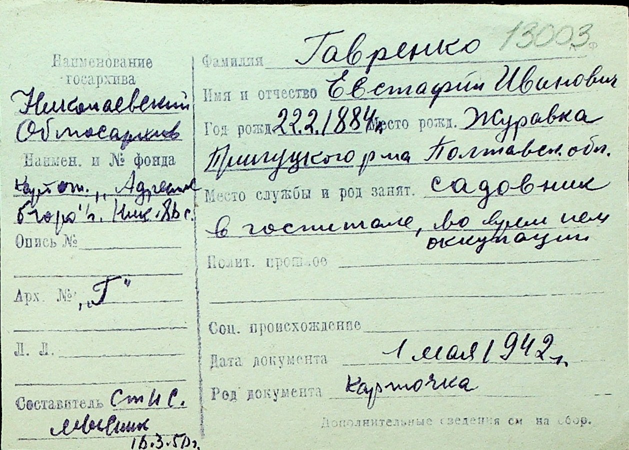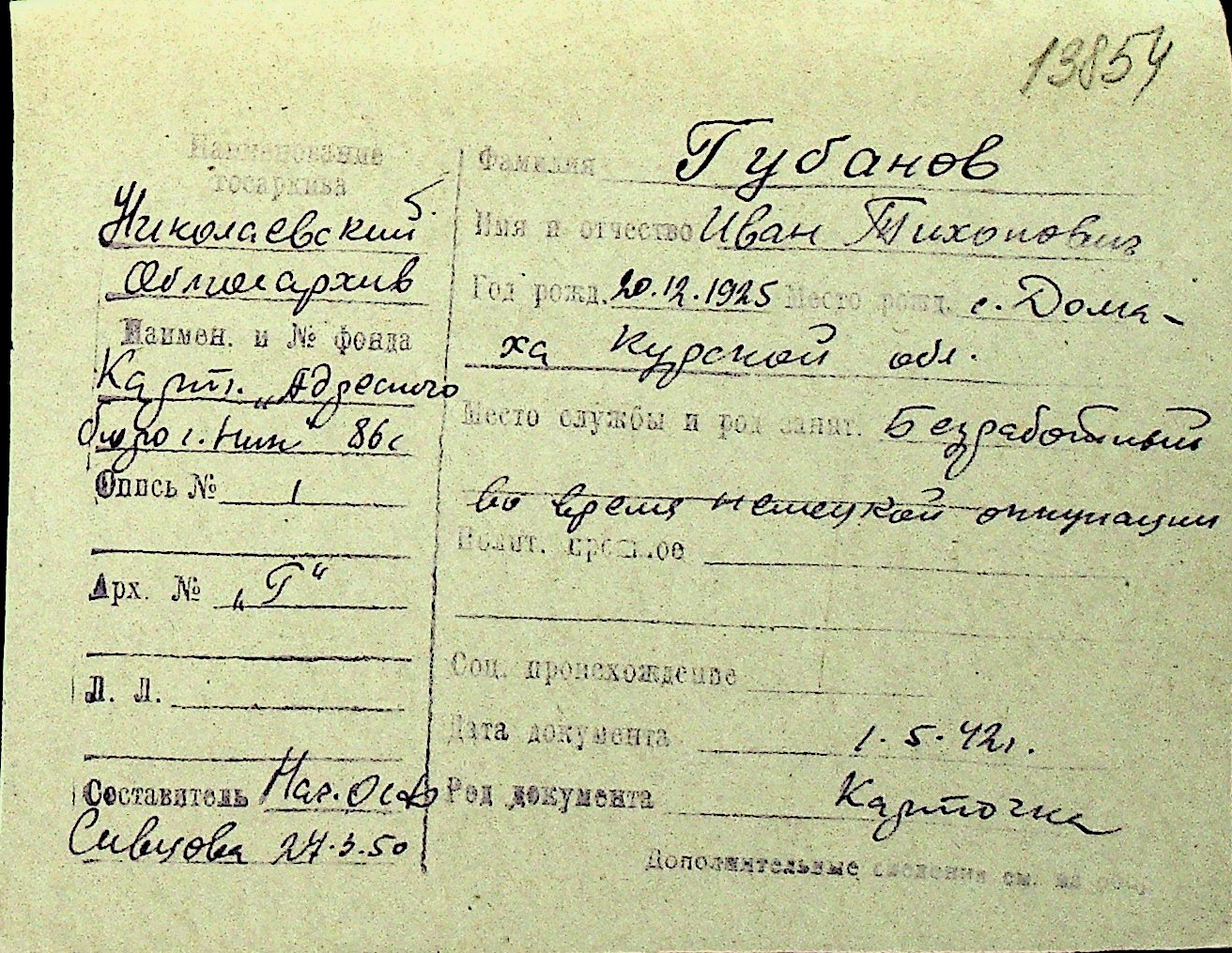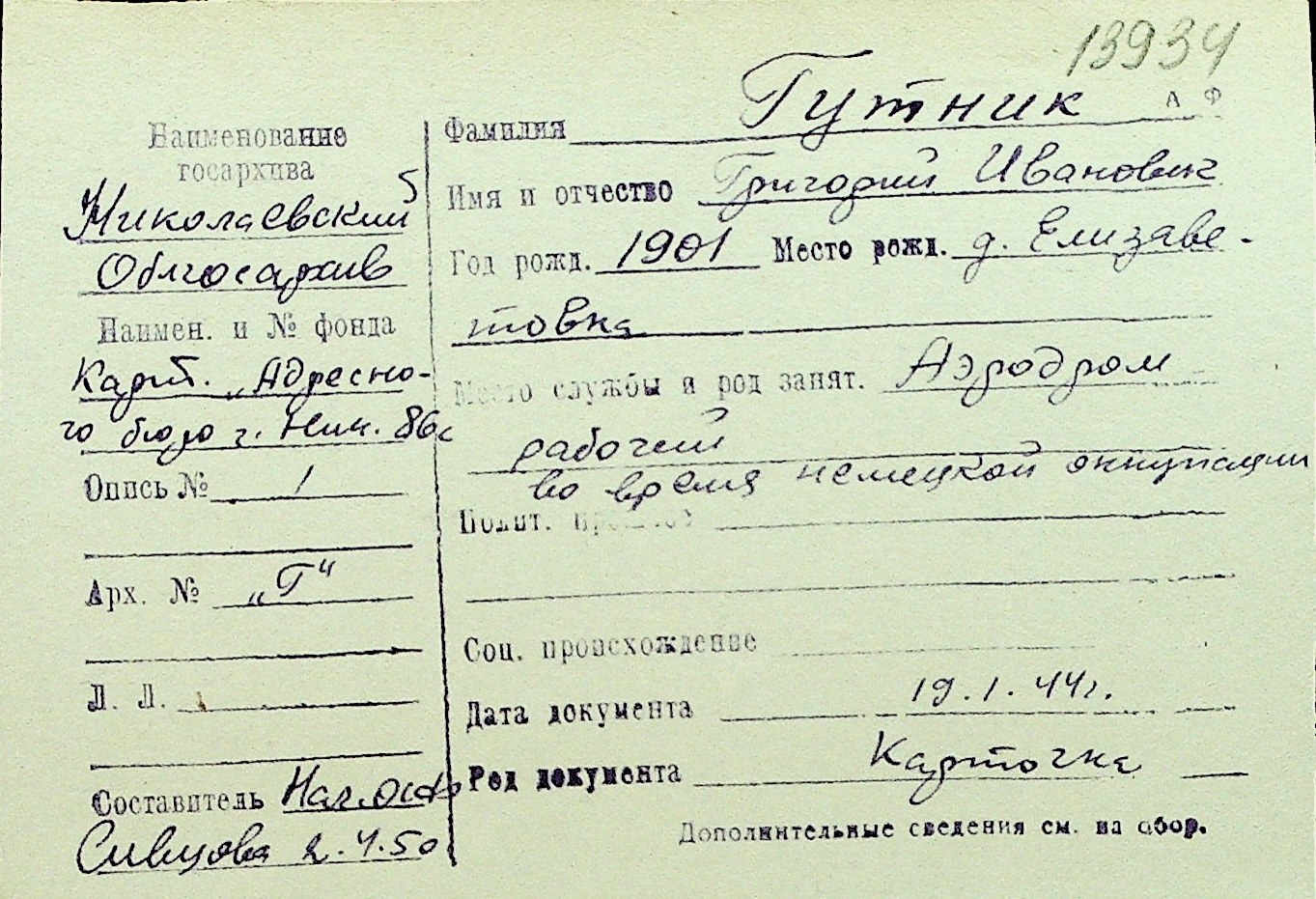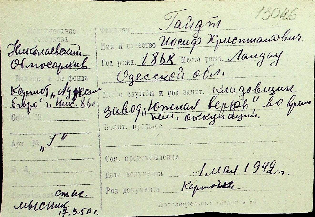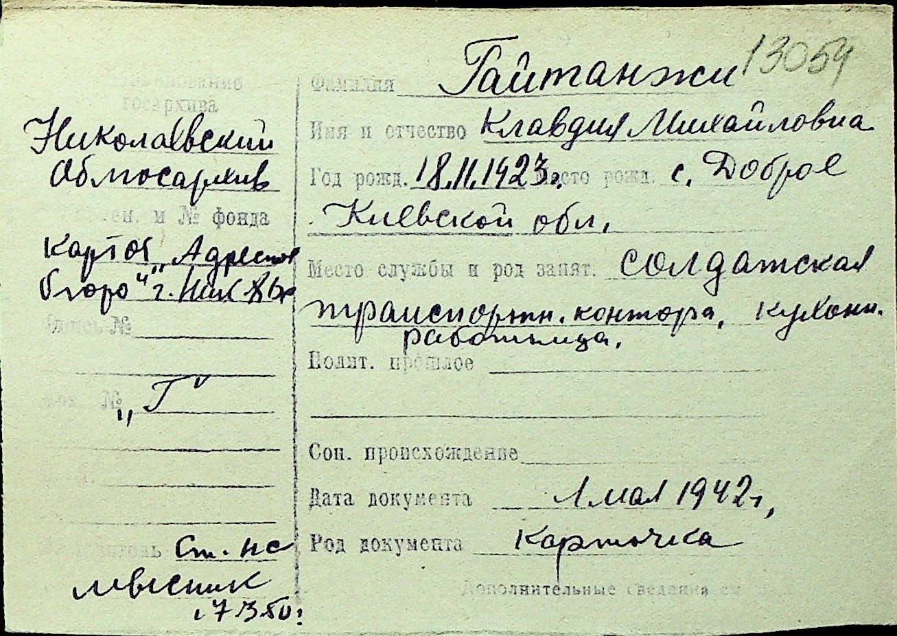 • • Перелік карток до фонду № Н-1016
