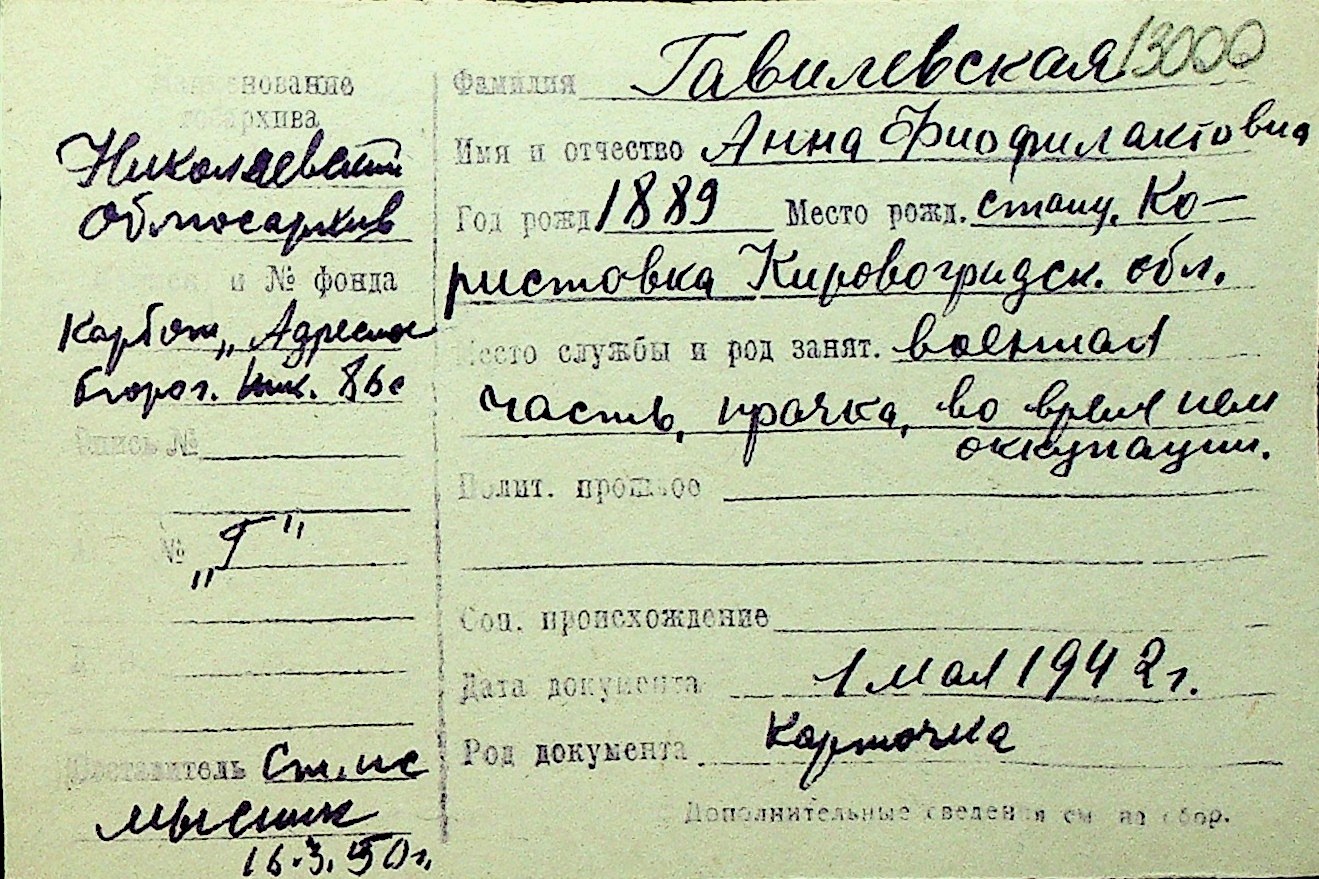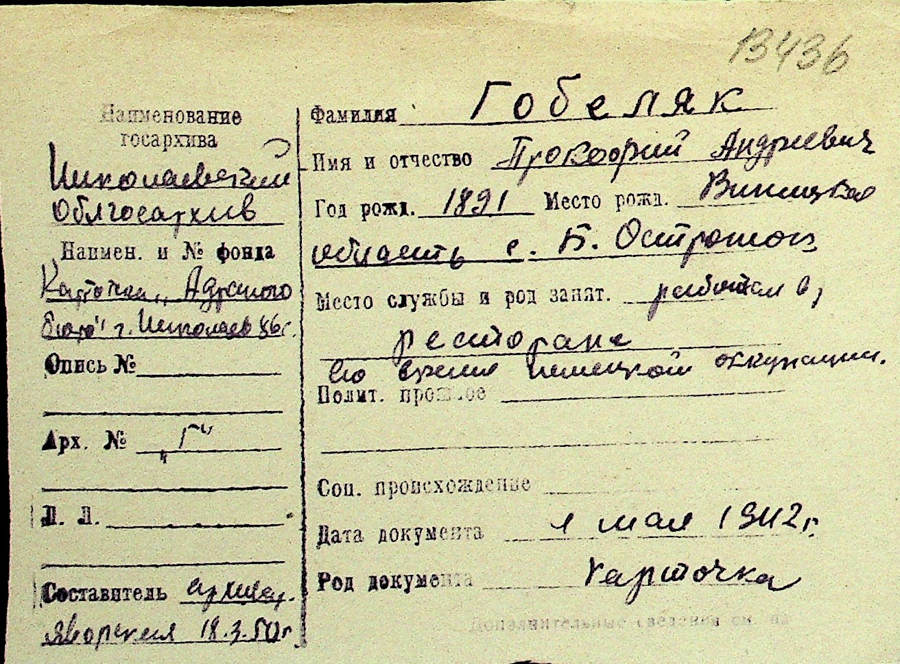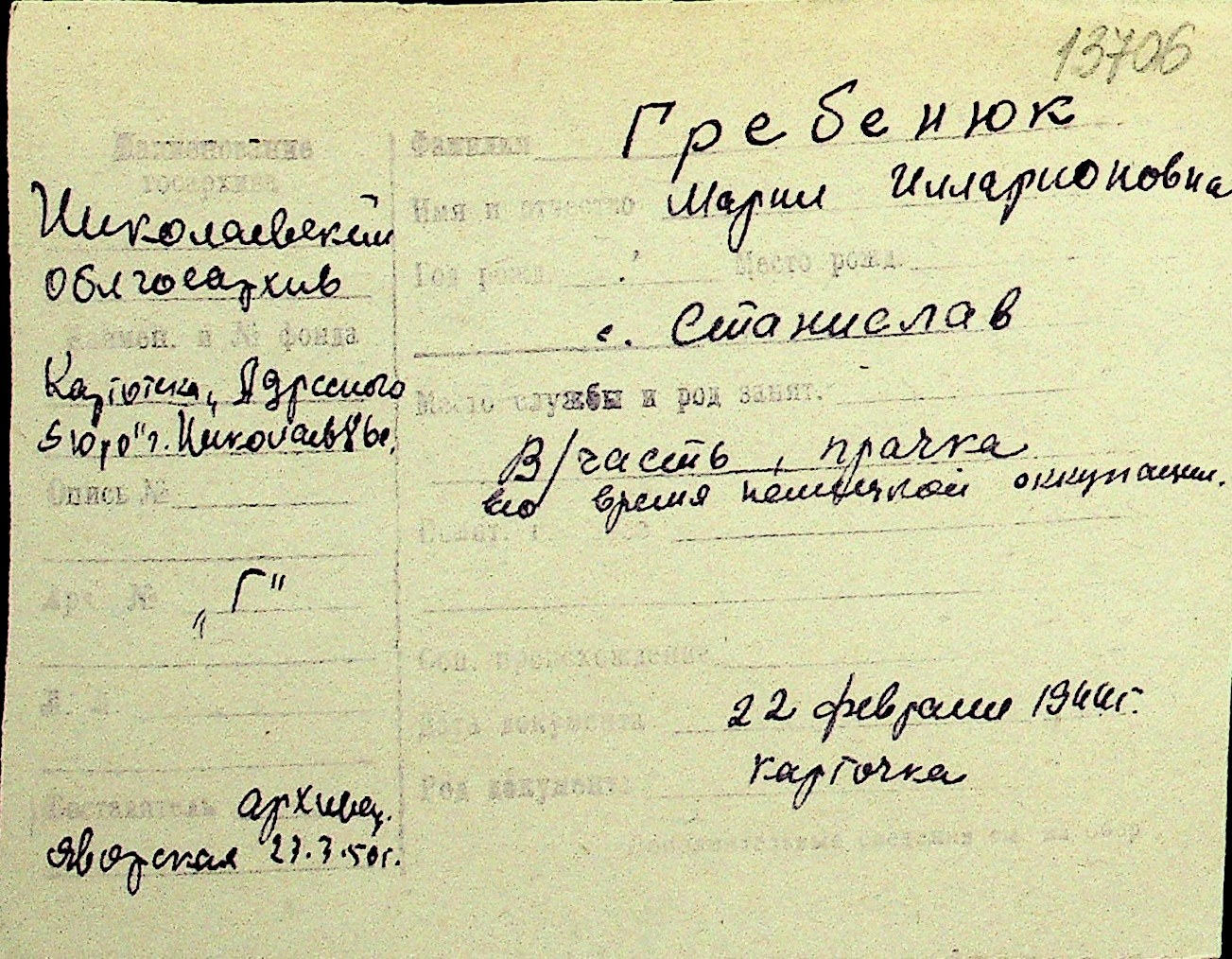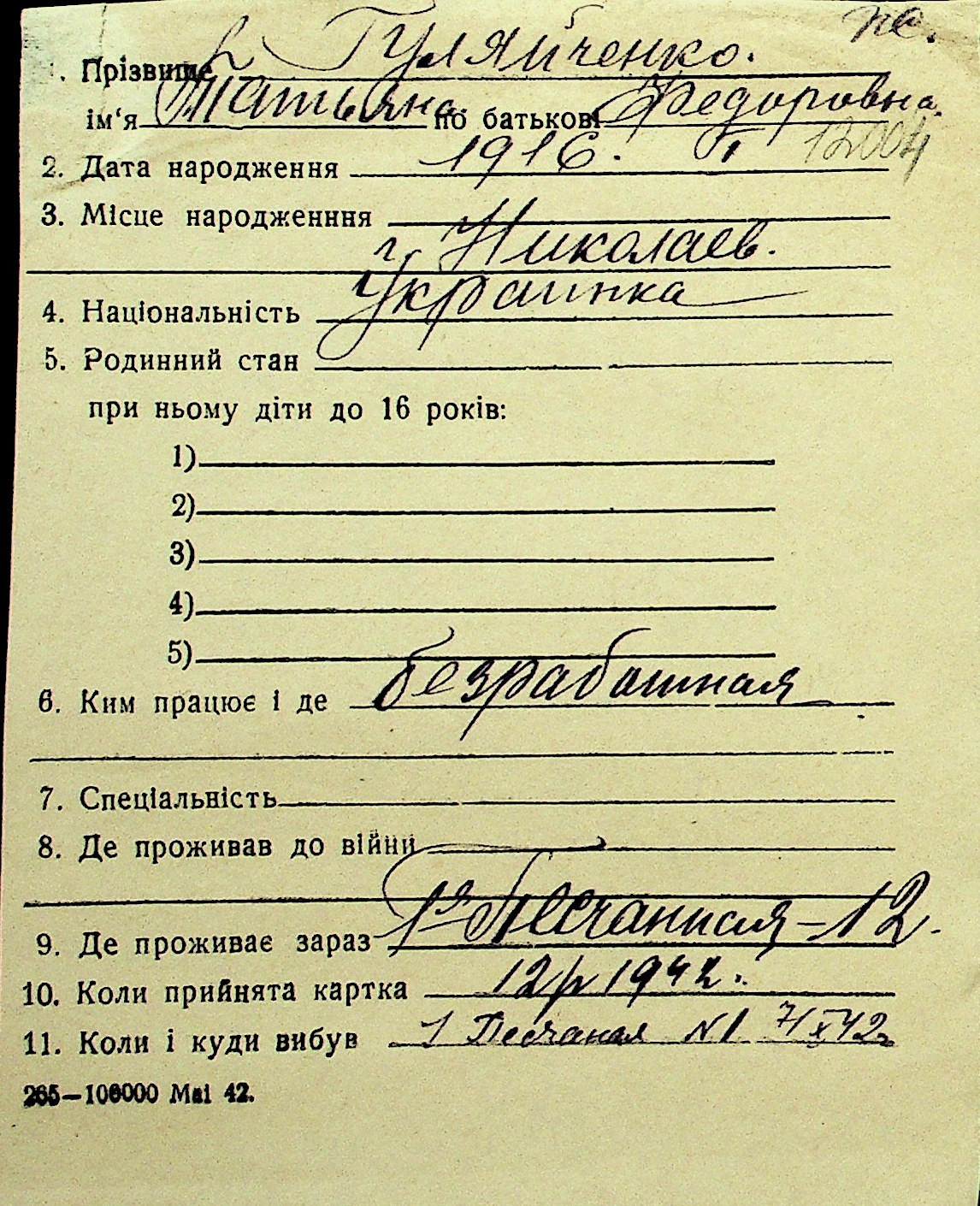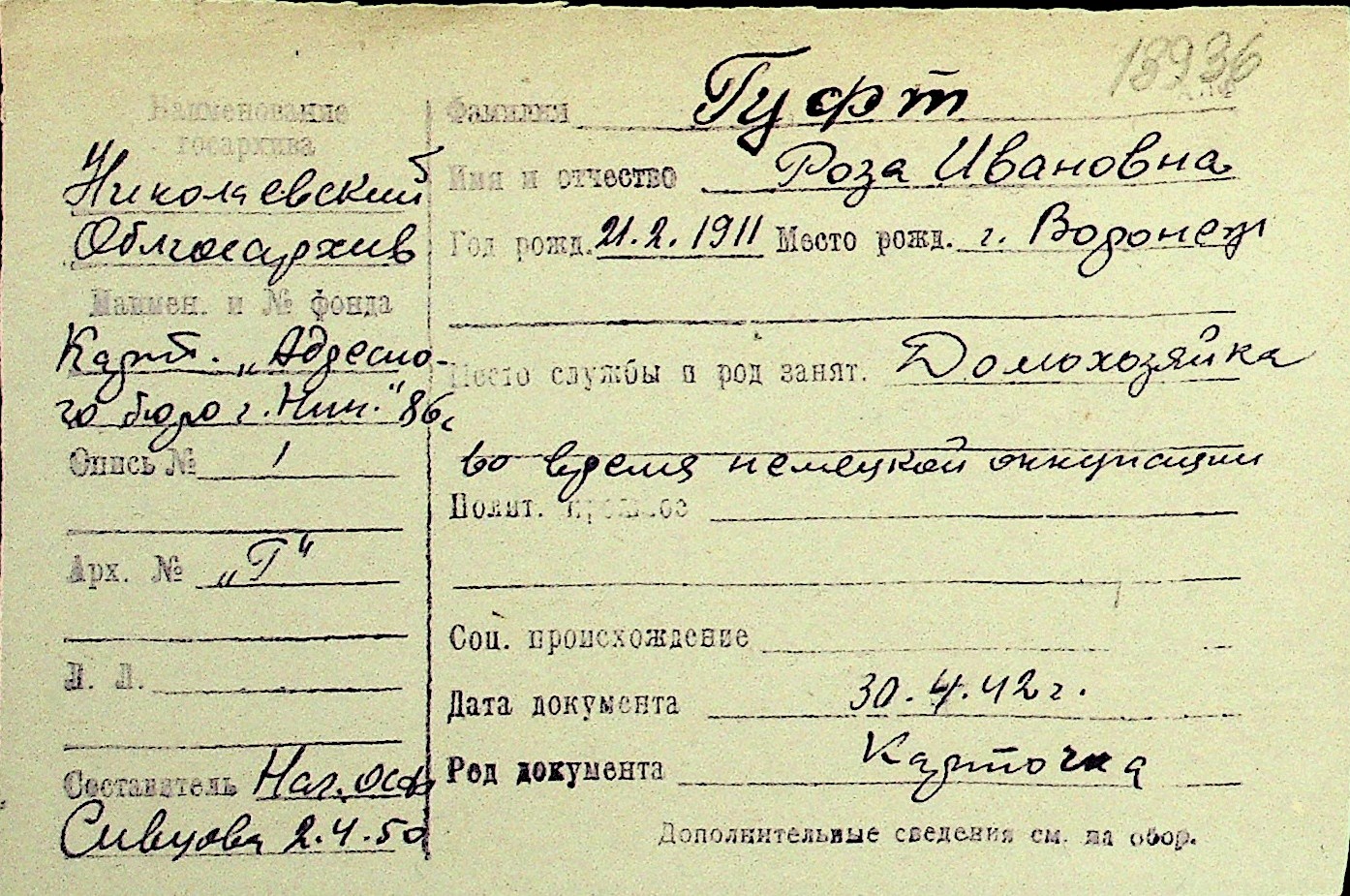 • • Перелік карток до фонду № Н-1016