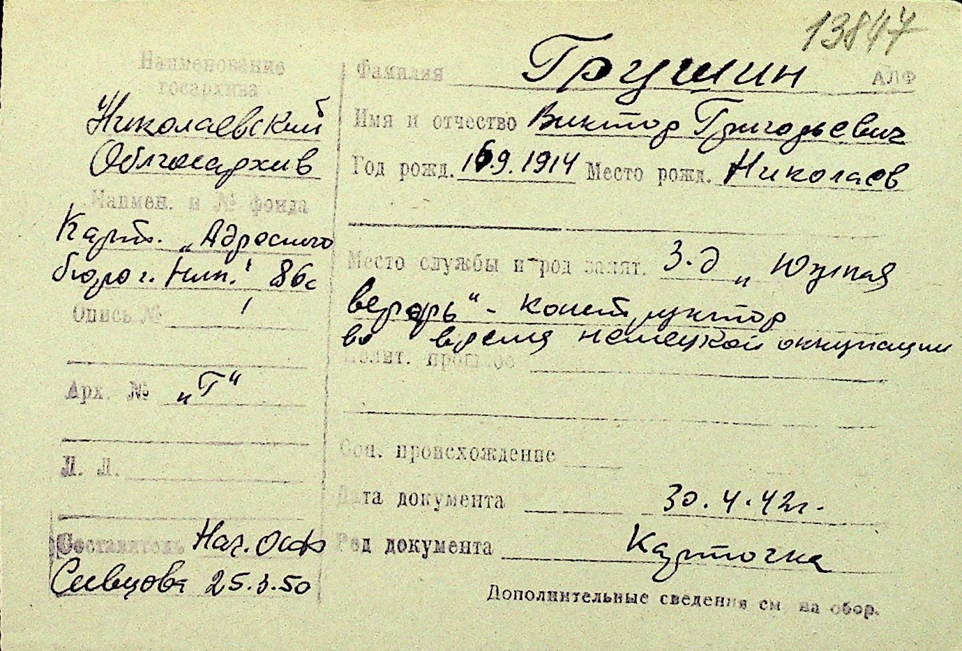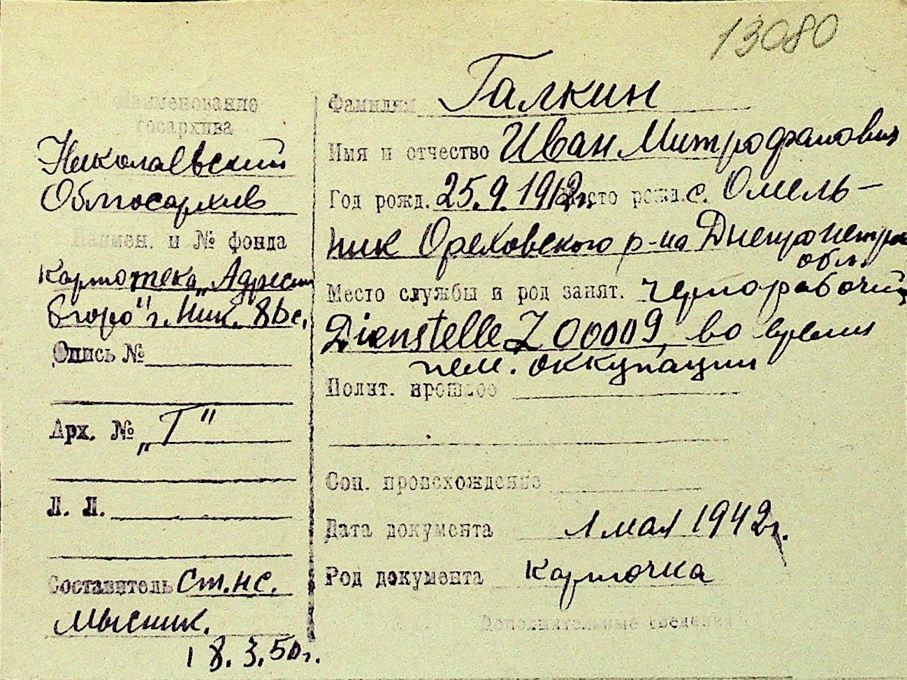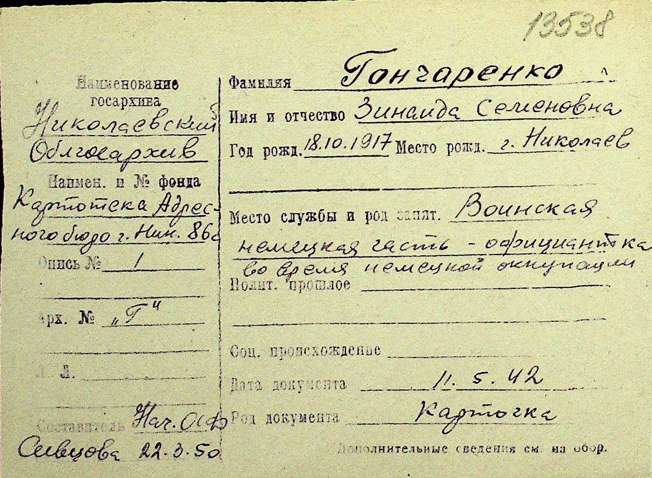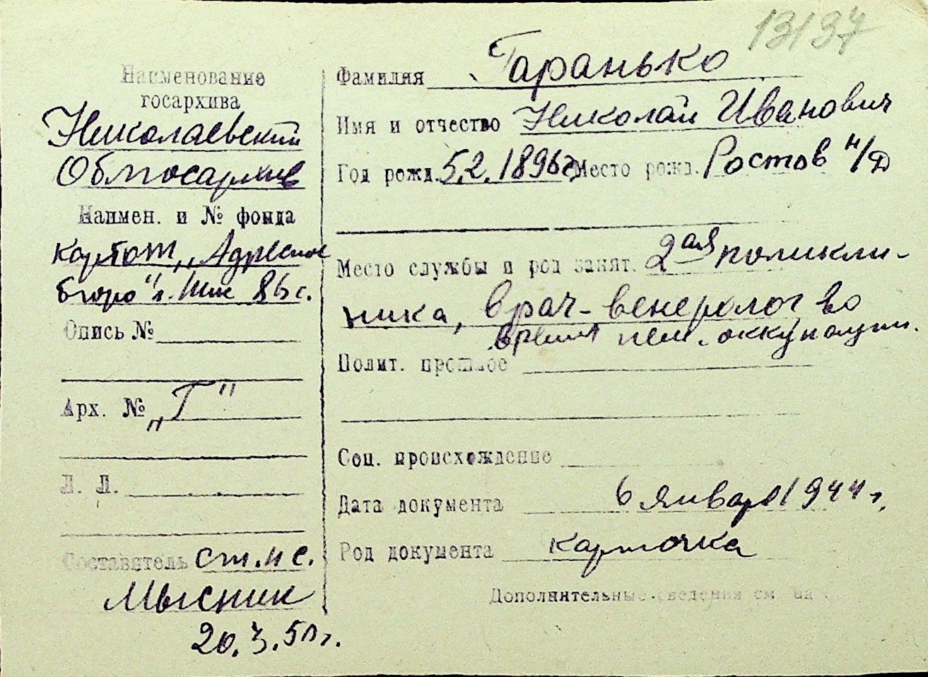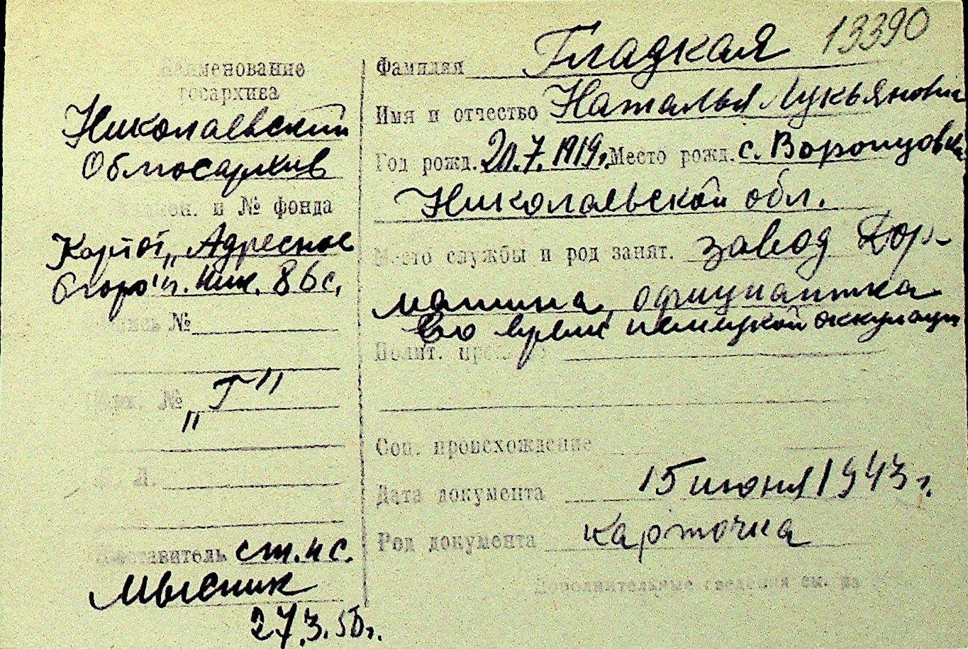 • • Перелік карток до фонду № Н-1016