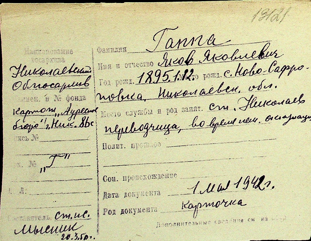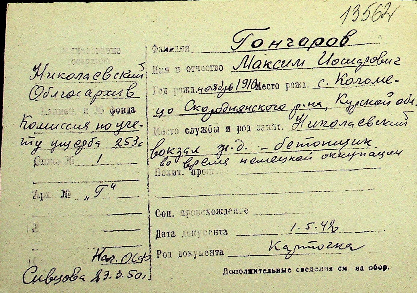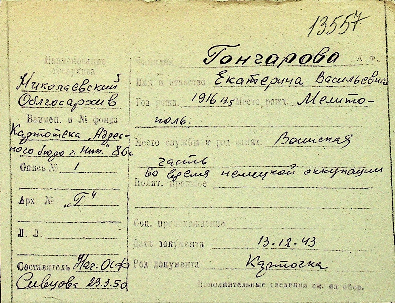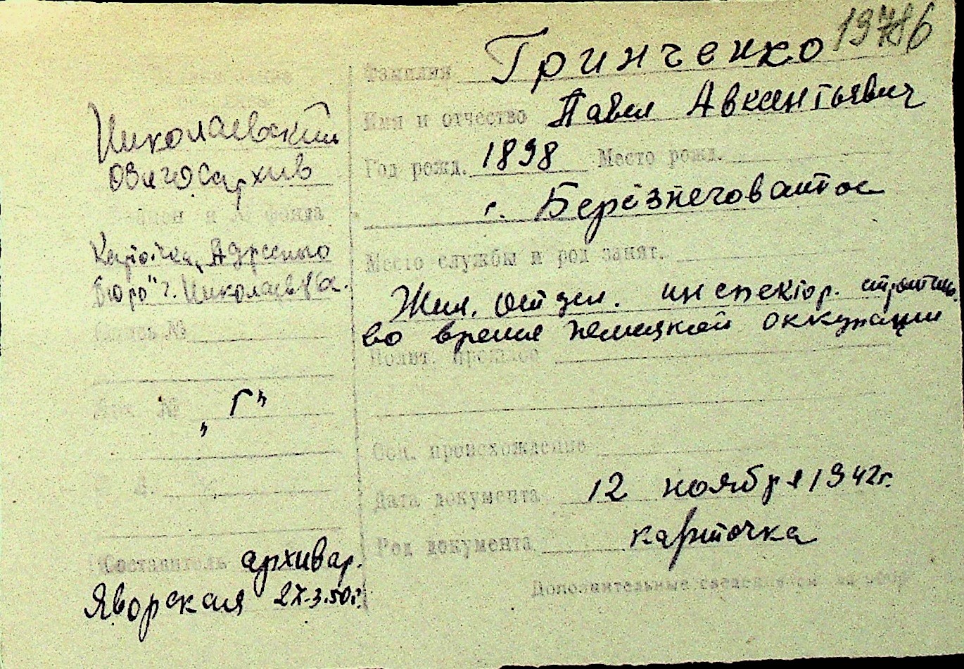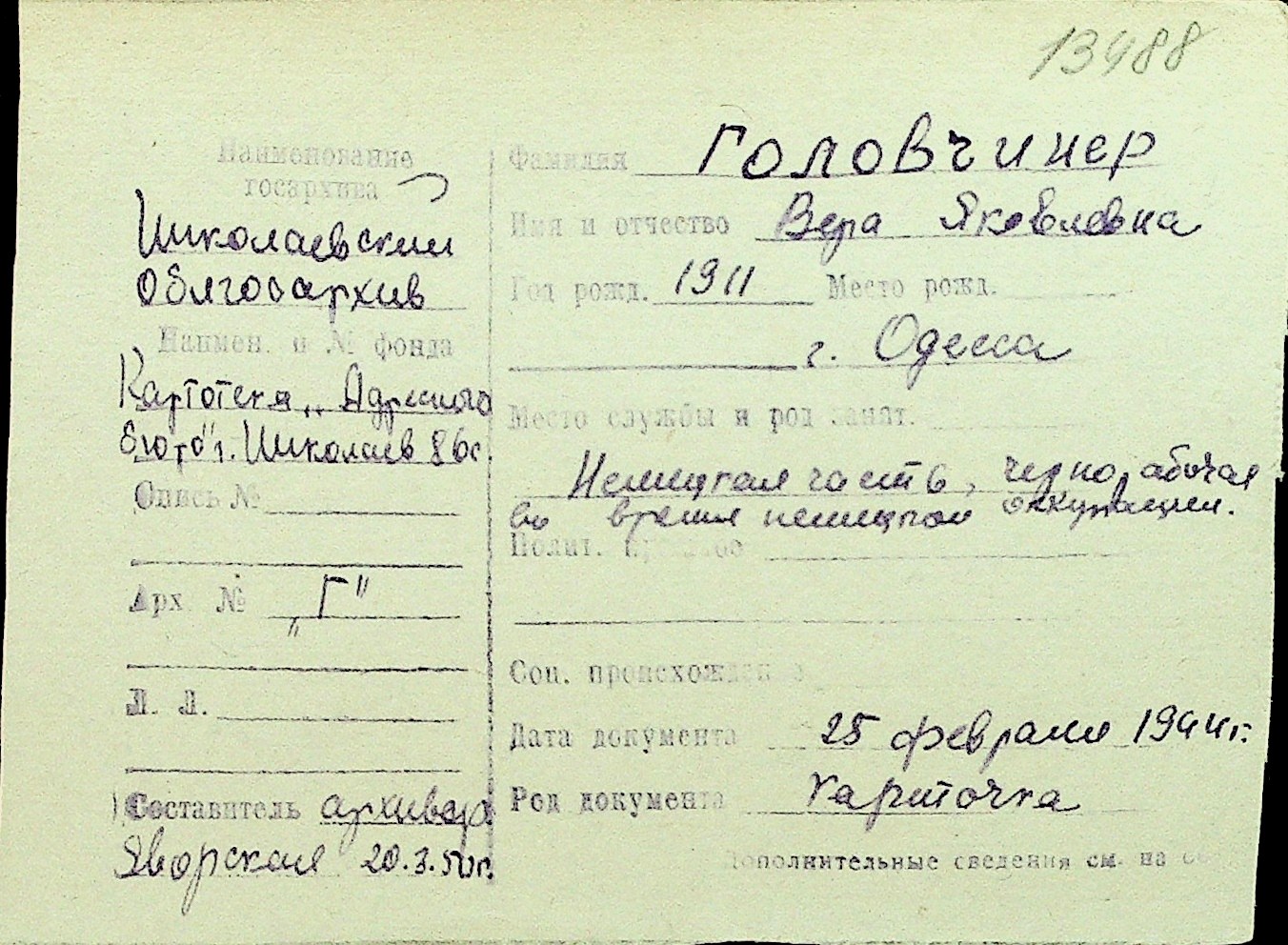 • • Перелік карток до фонду № Н-1016