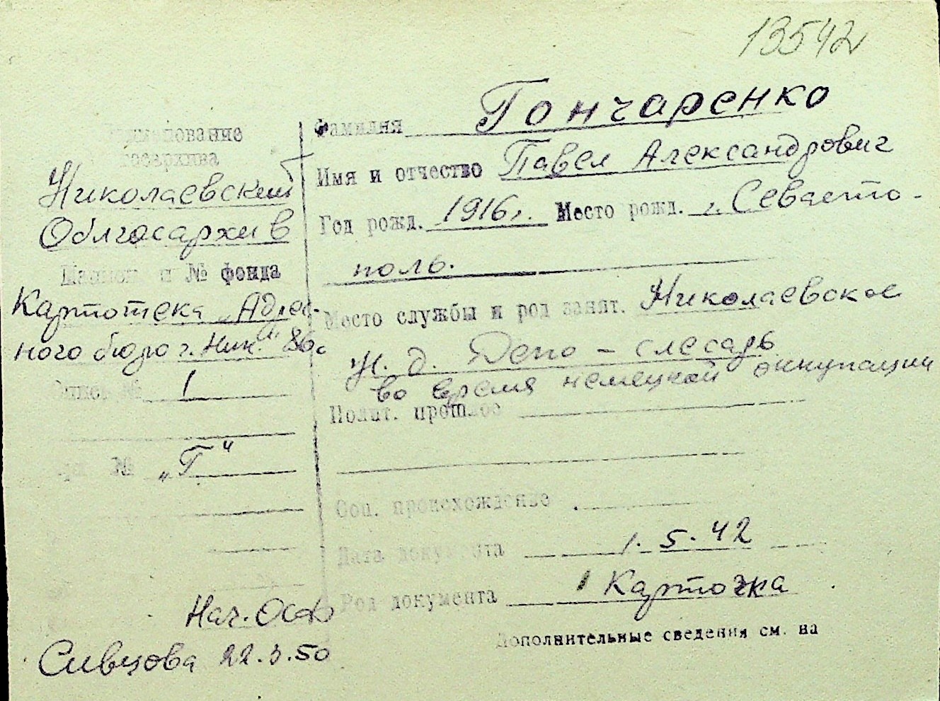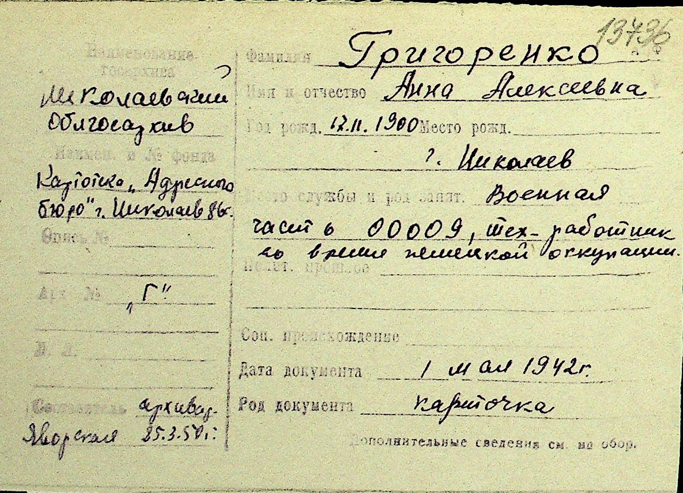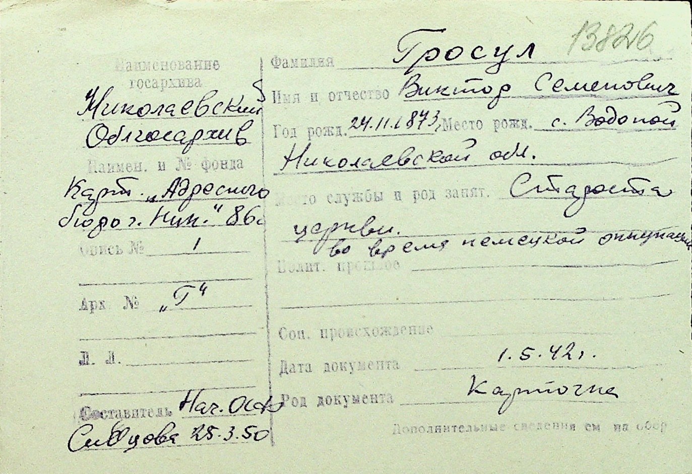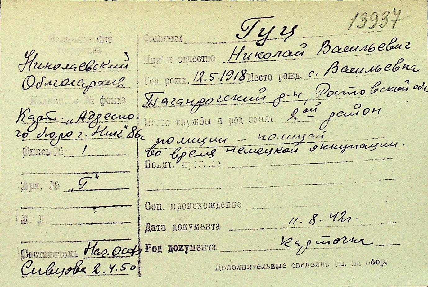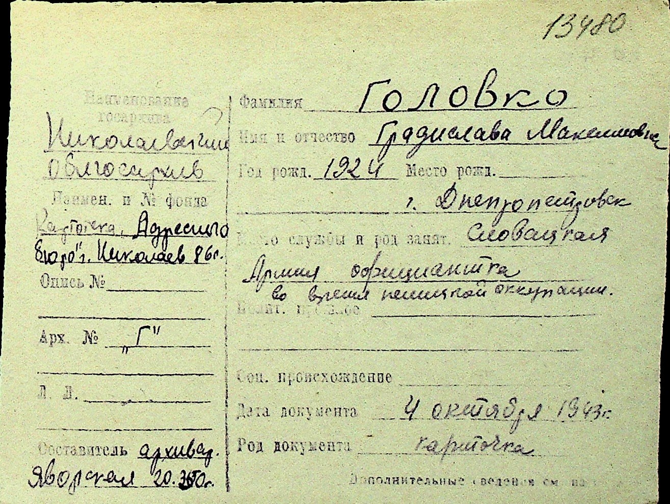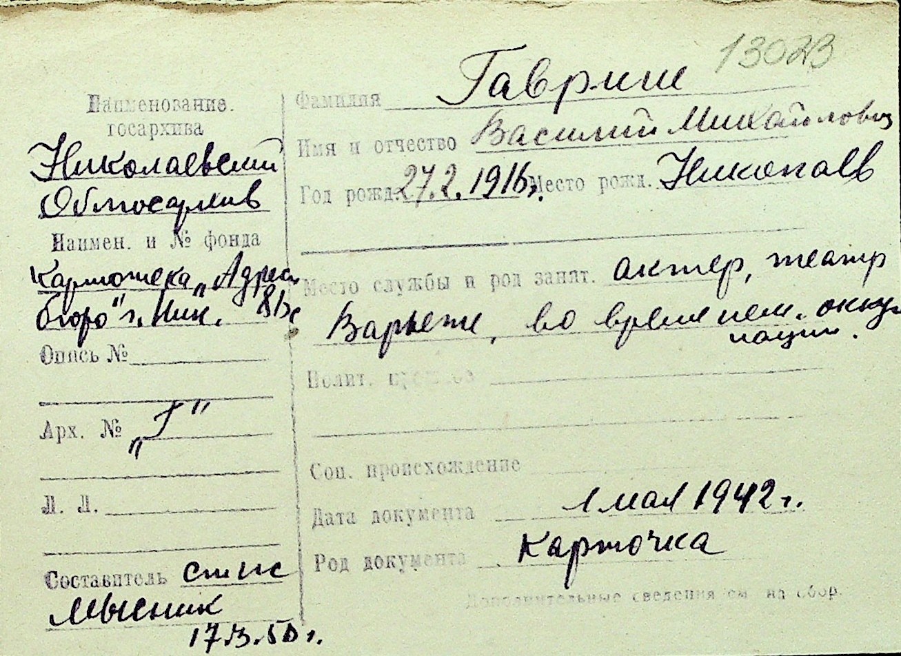 • • Перелік карток до фонду № Н-1016