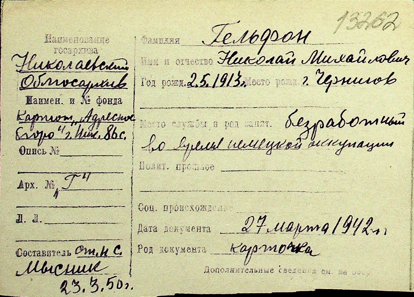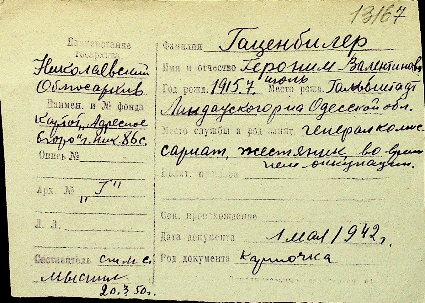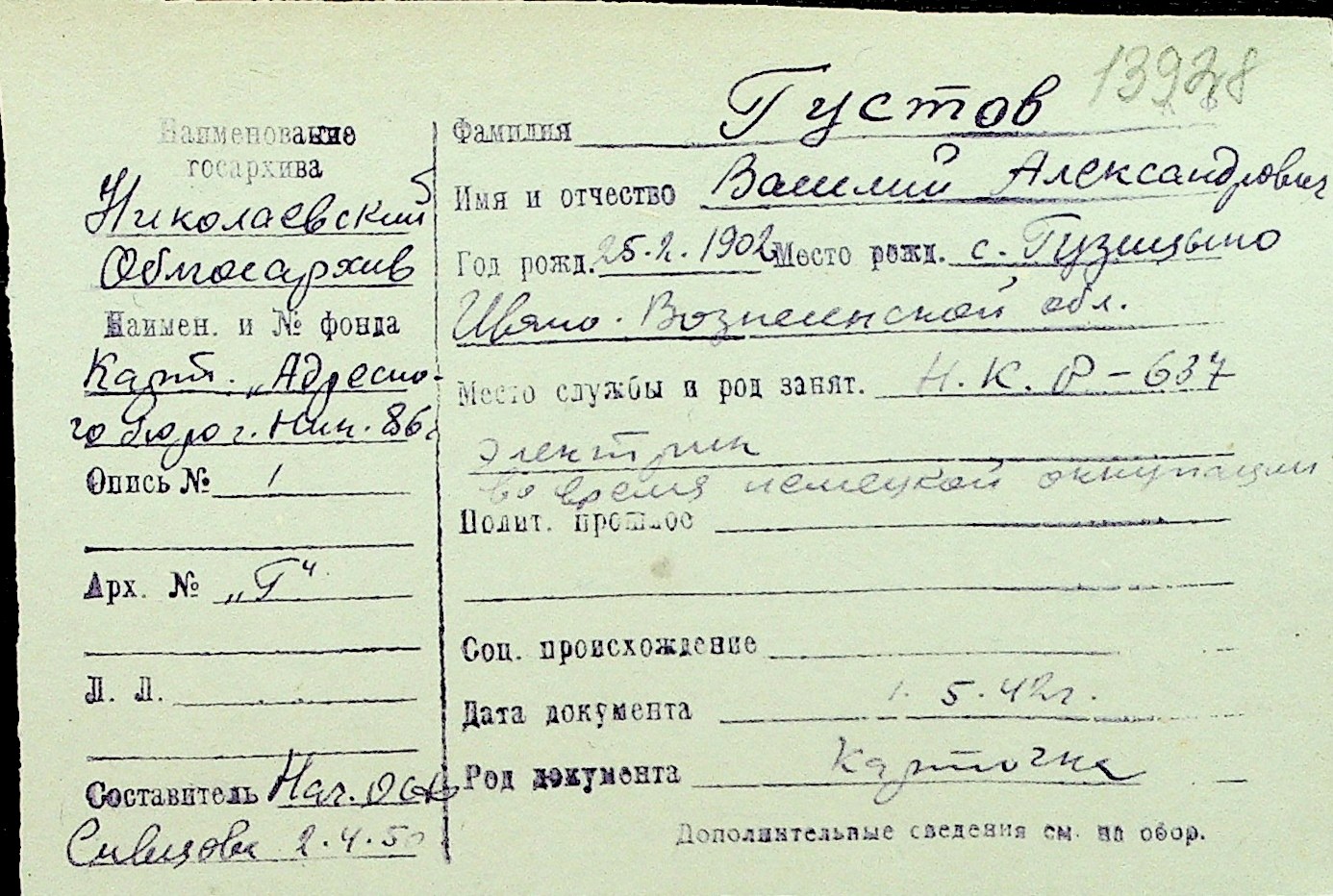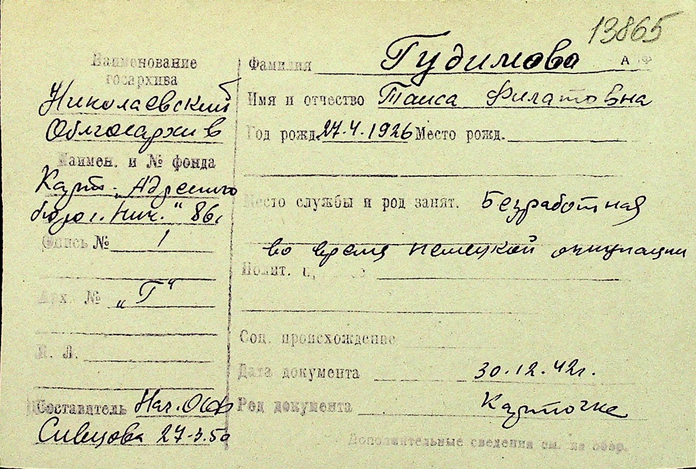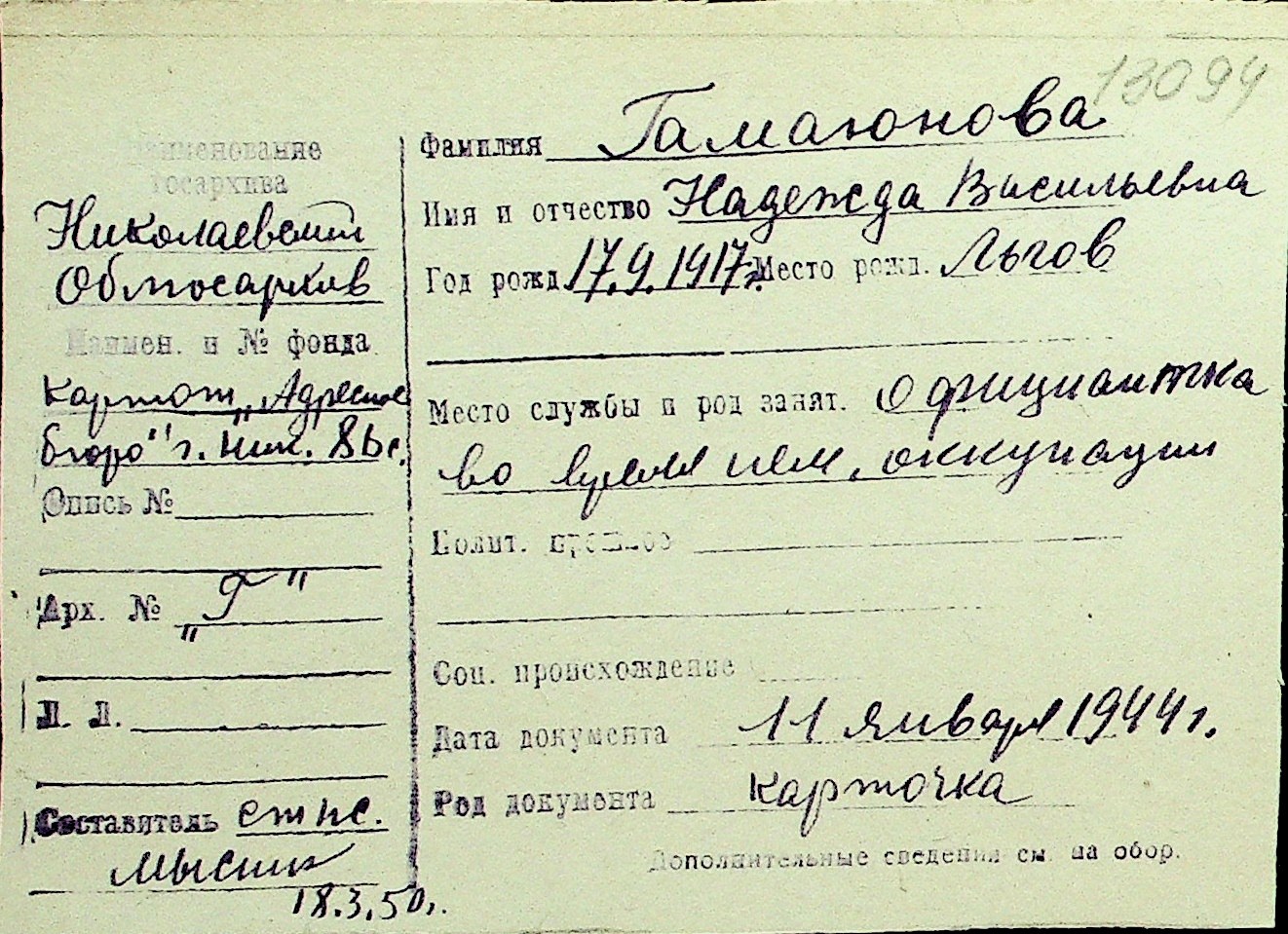 • • Перелік карток до фонду № Н-1016