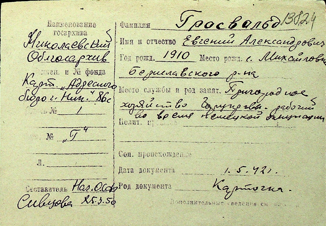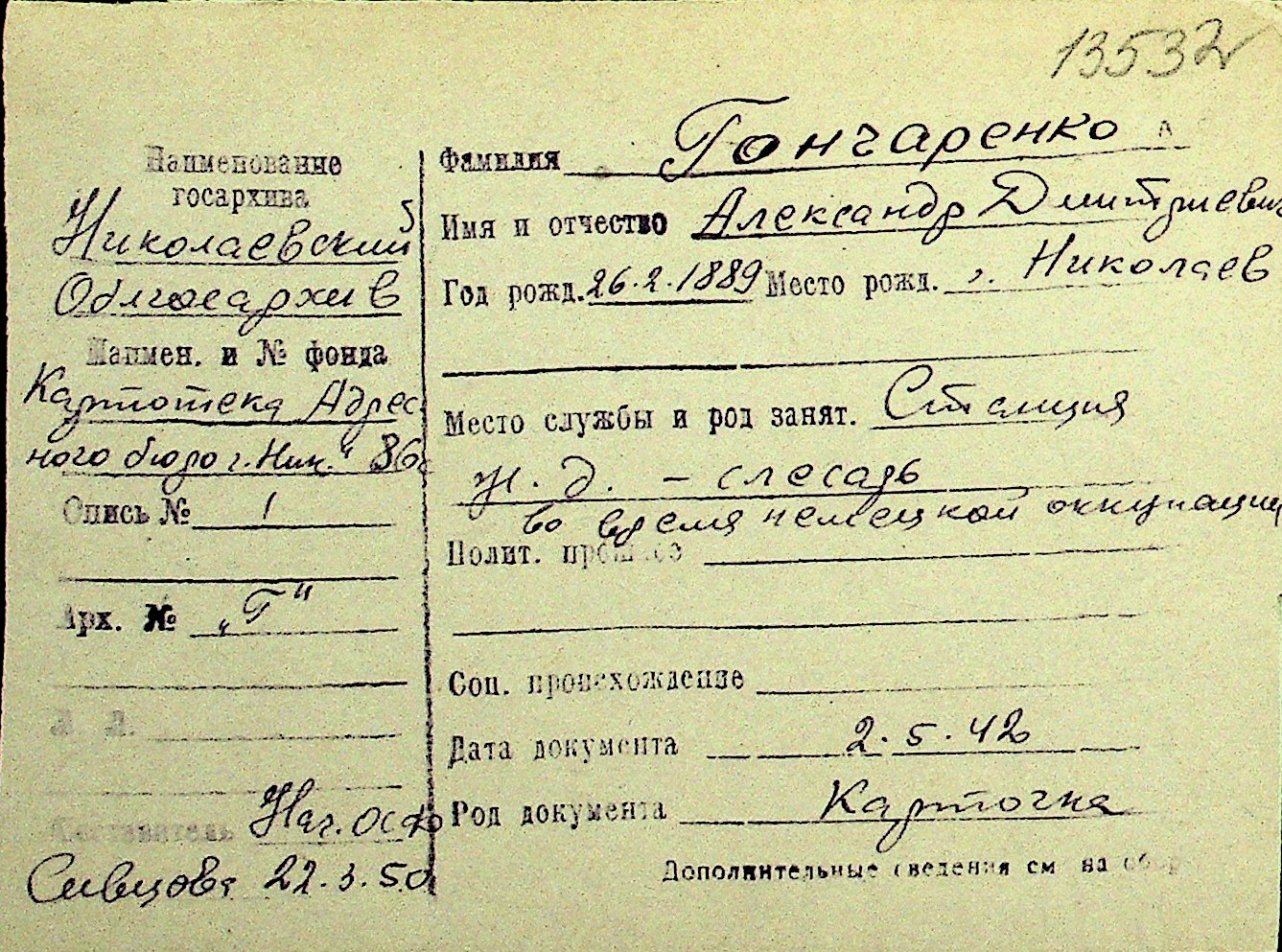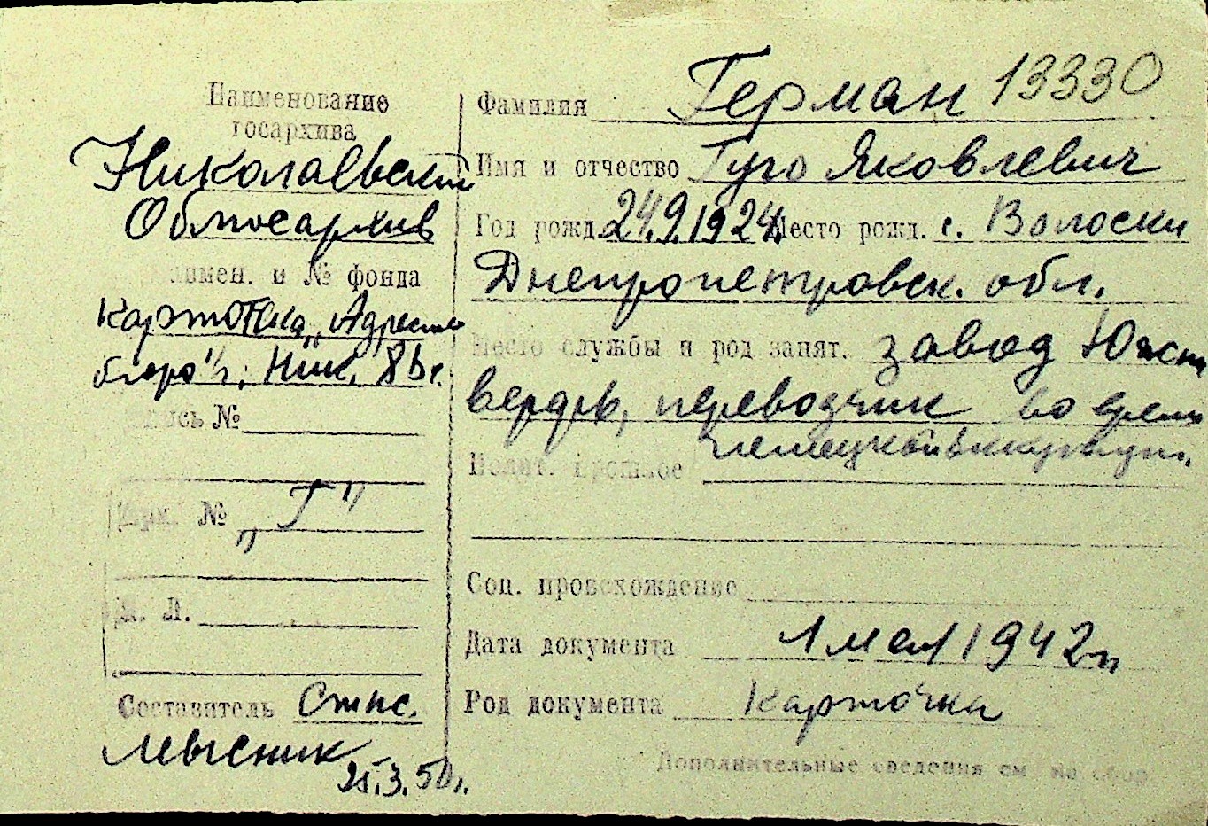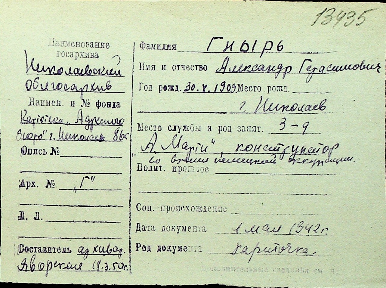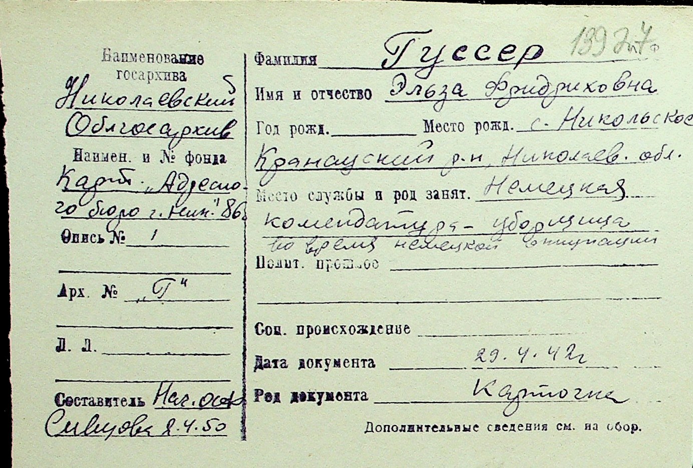 • • Перелік карток до фонду № Н-1016