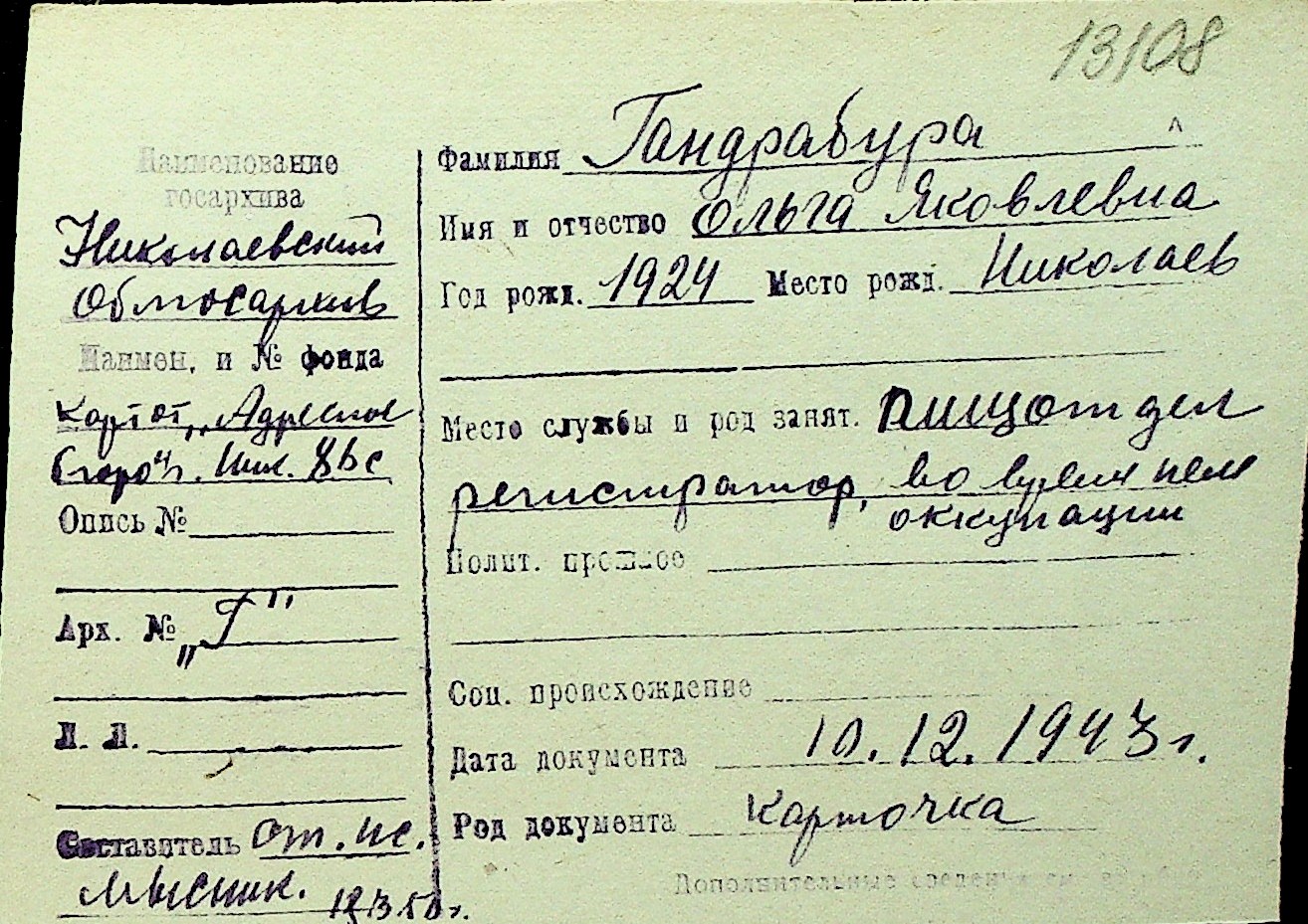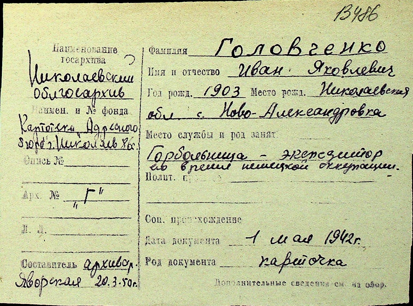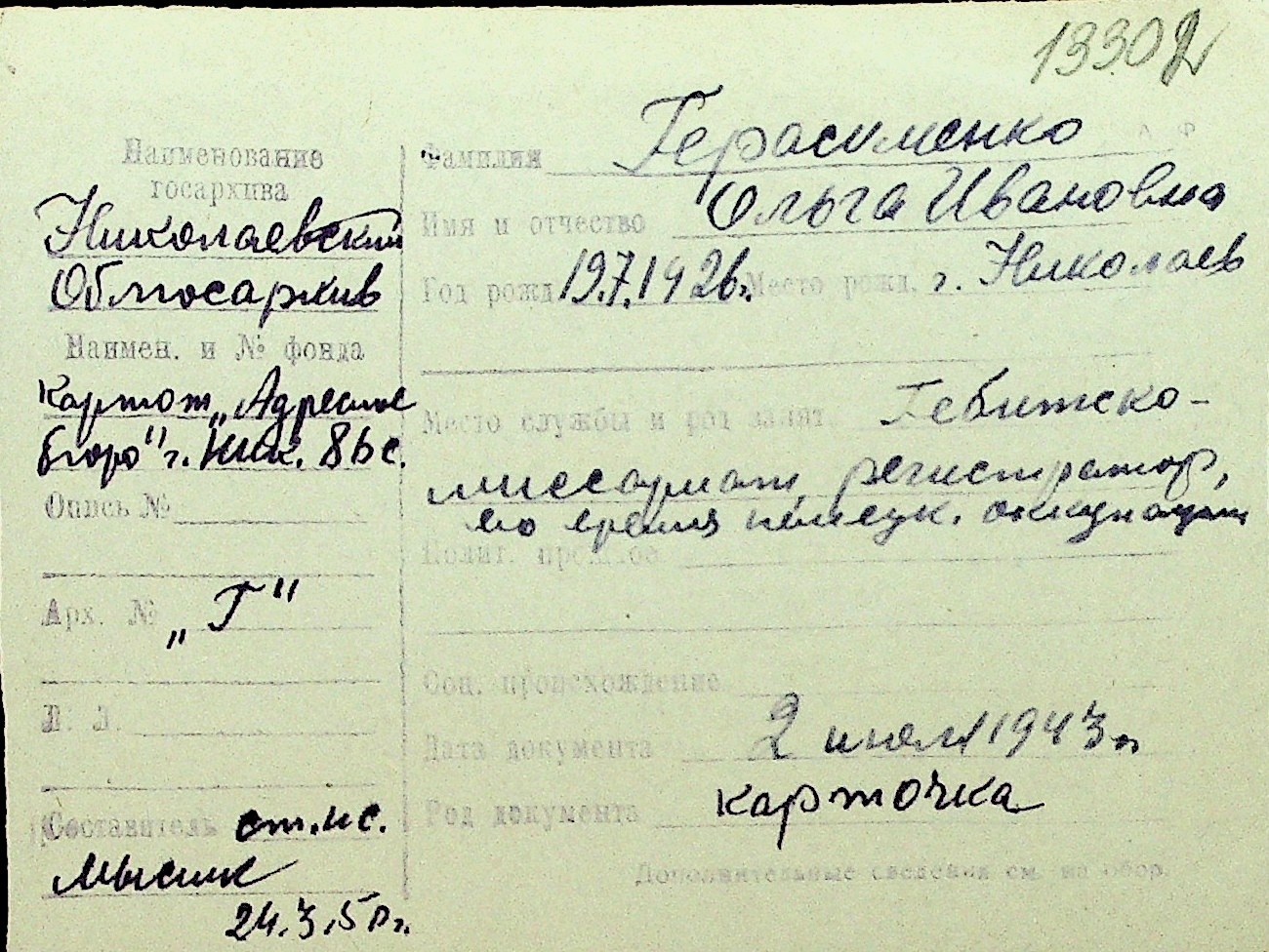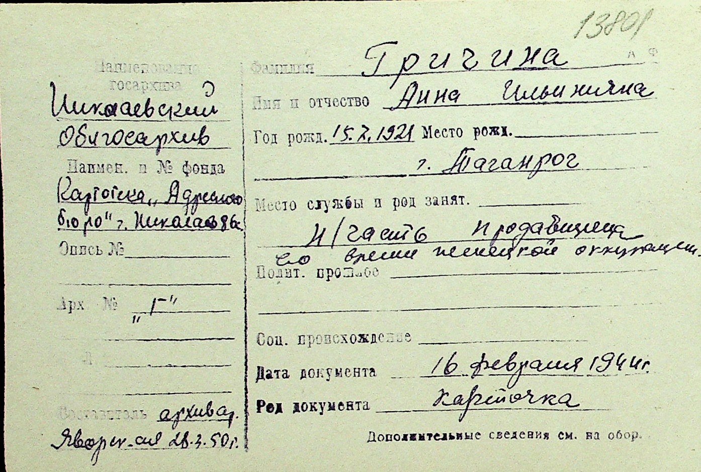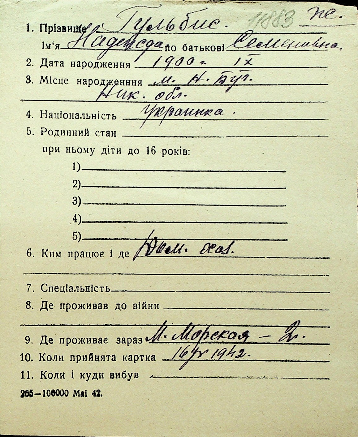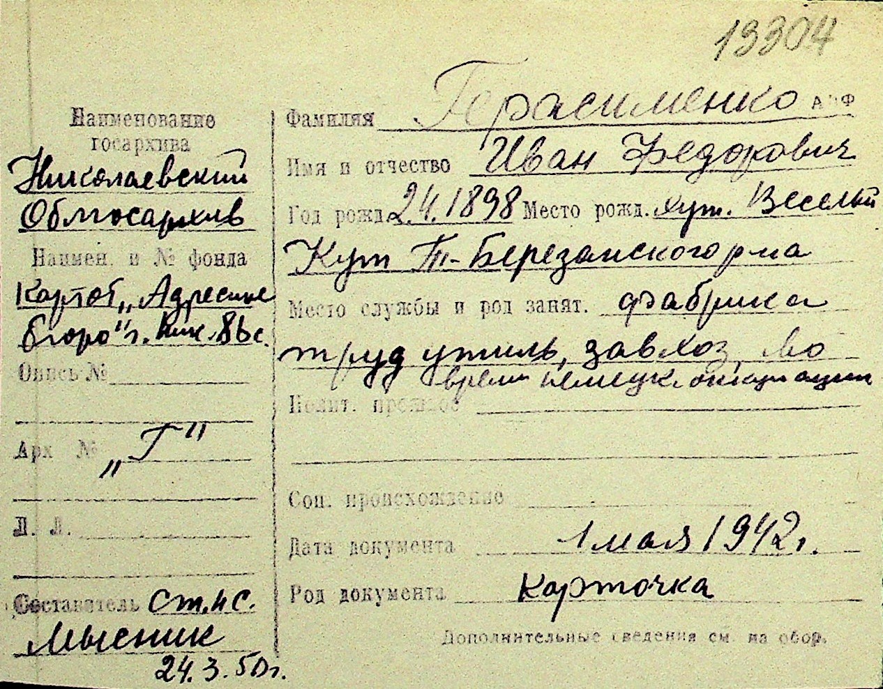 • • Перелік карток до фонду № Н-1016