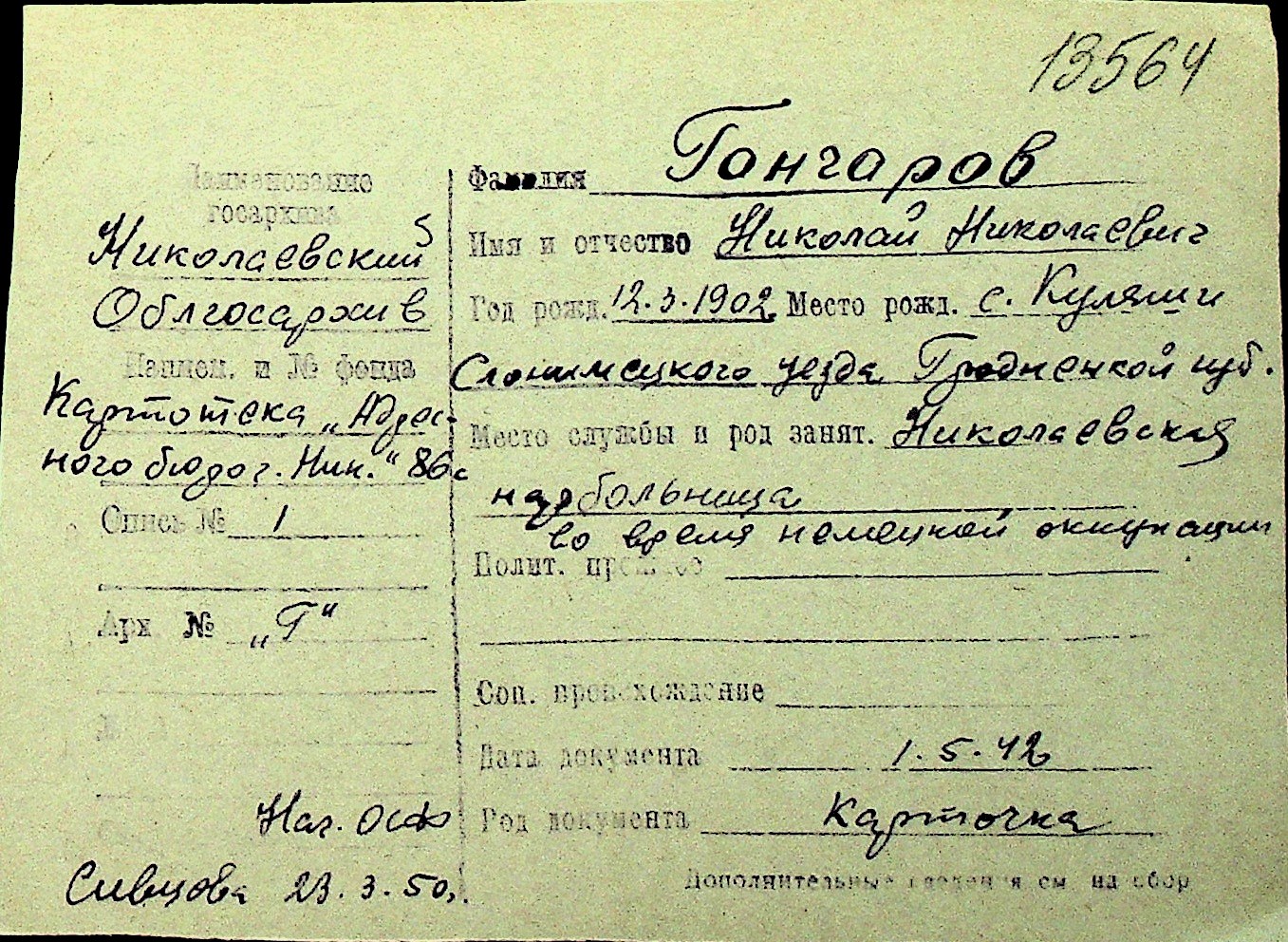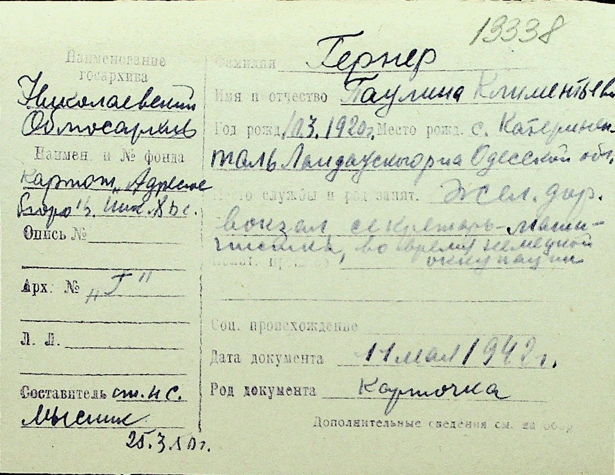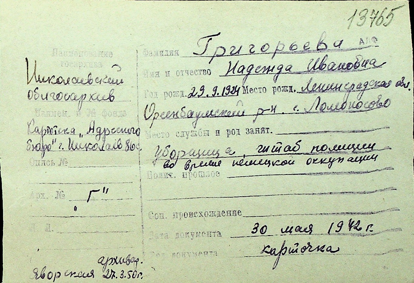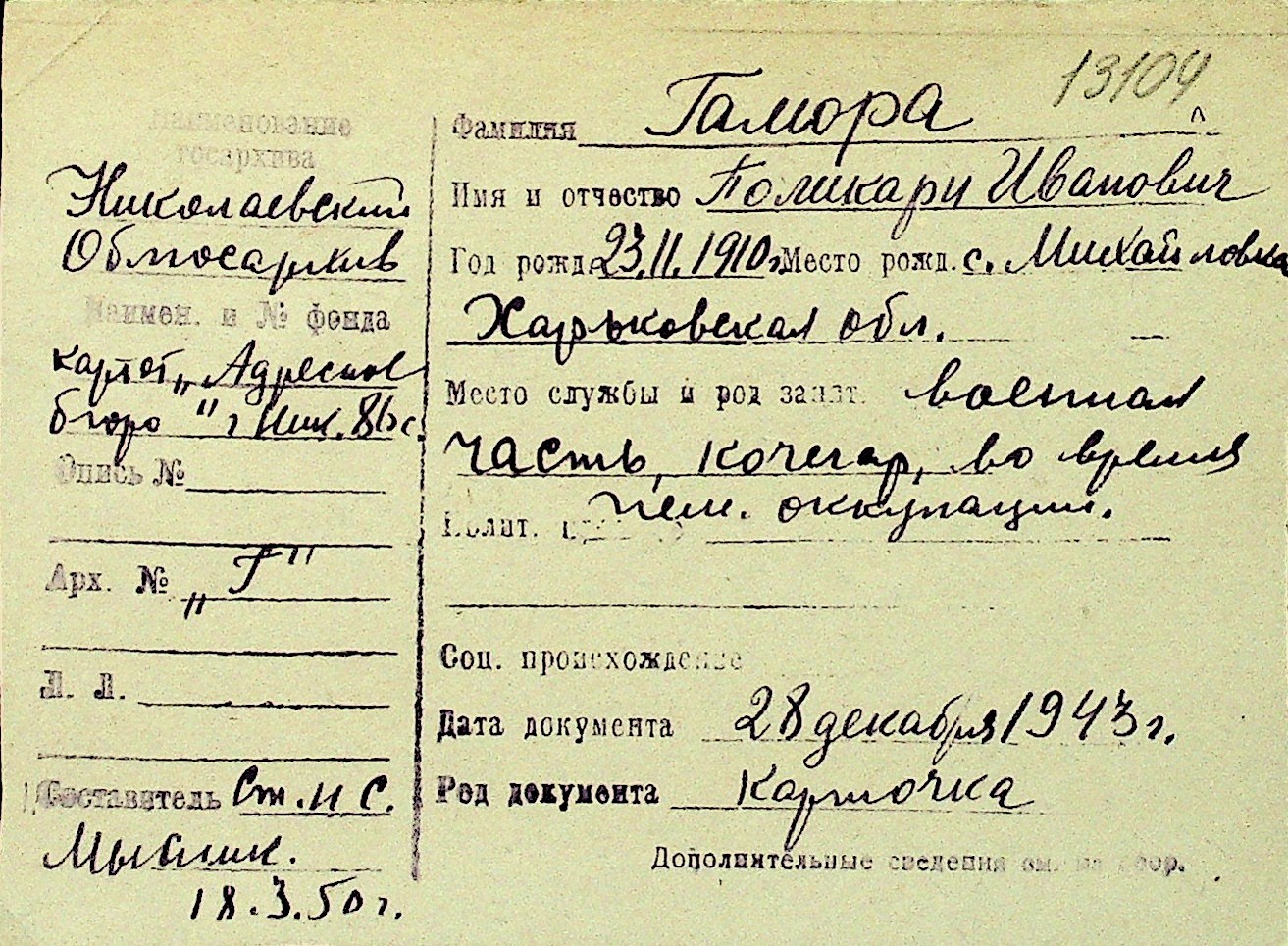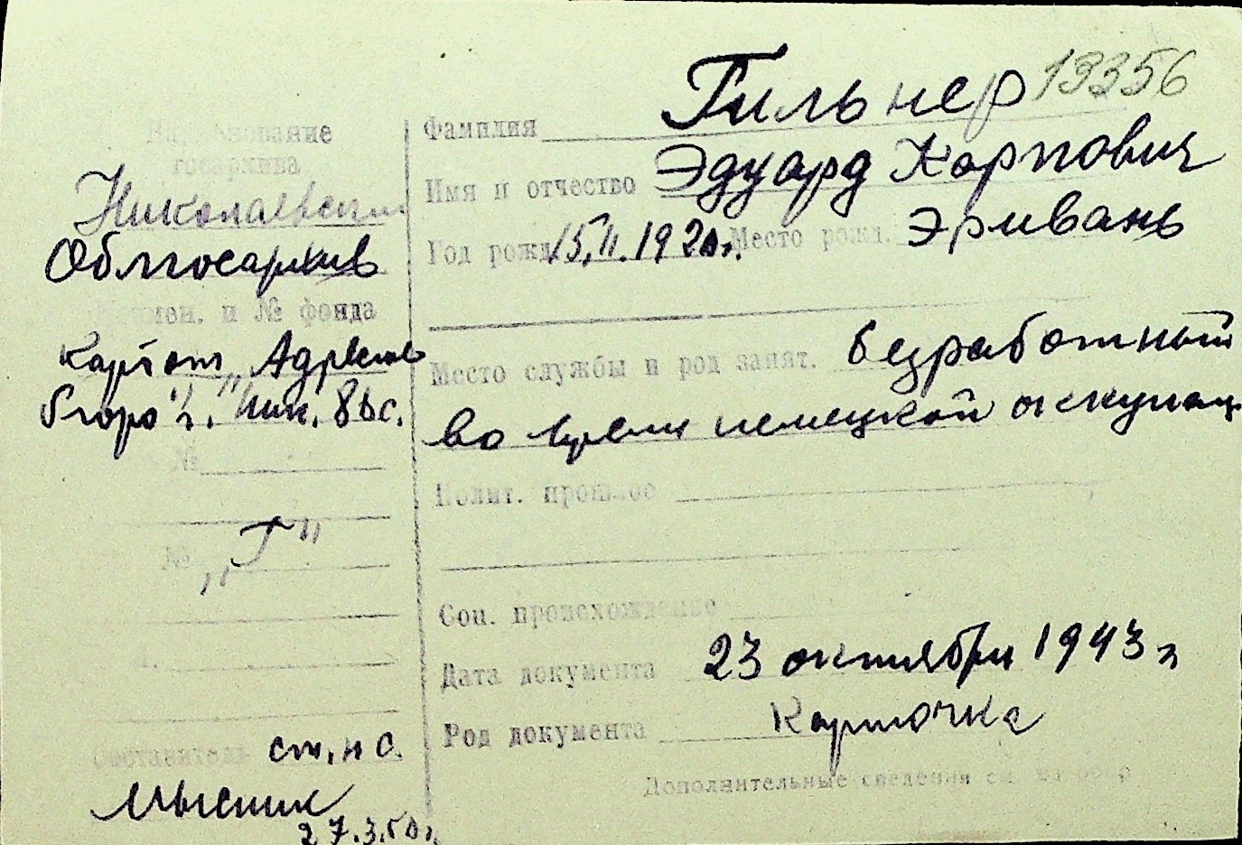 • • Перелік карток до фонду № Н-1016