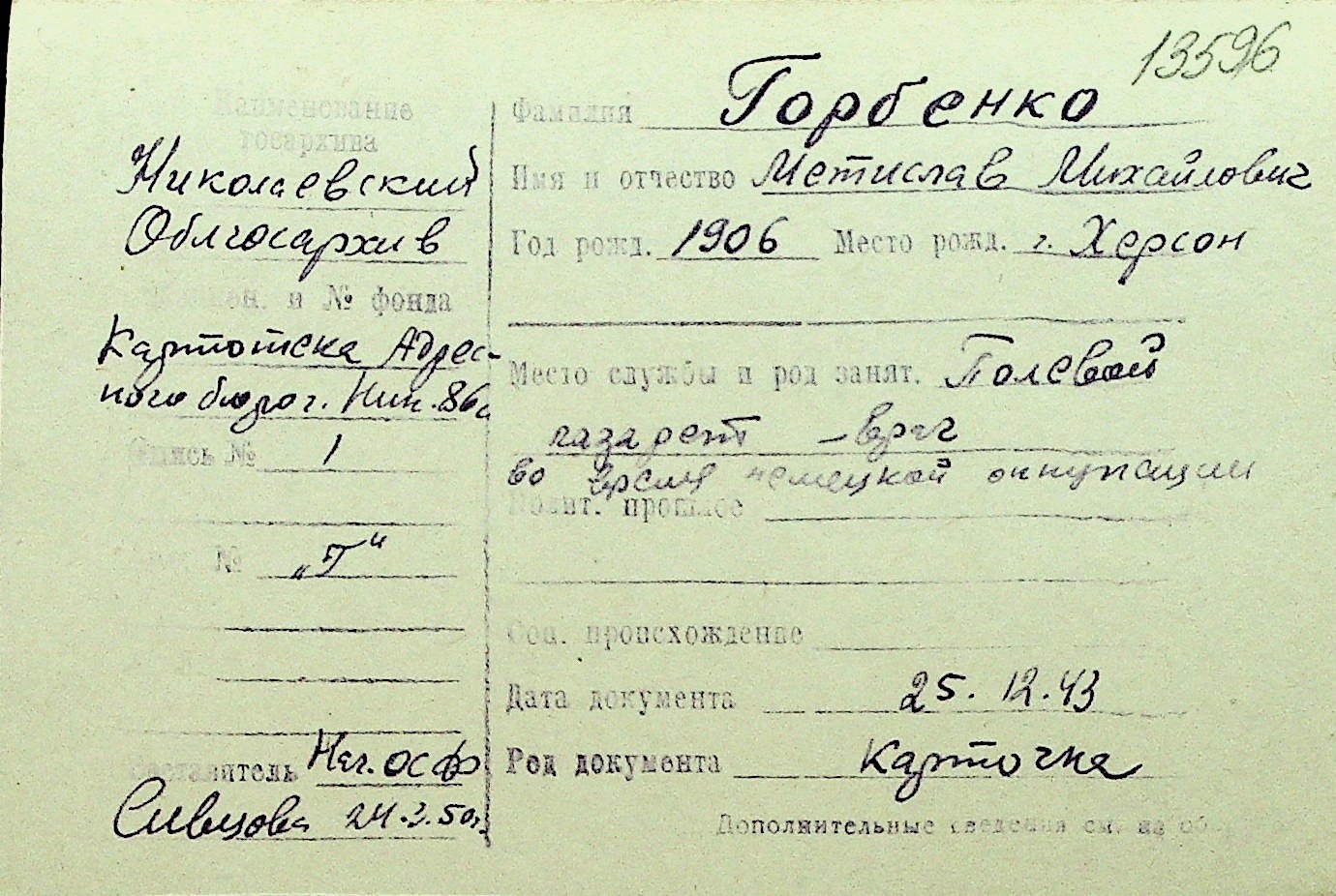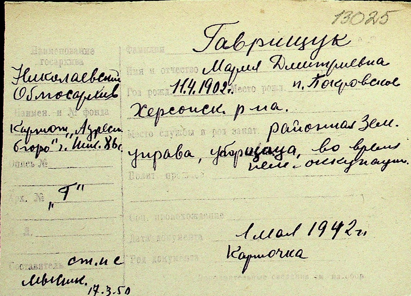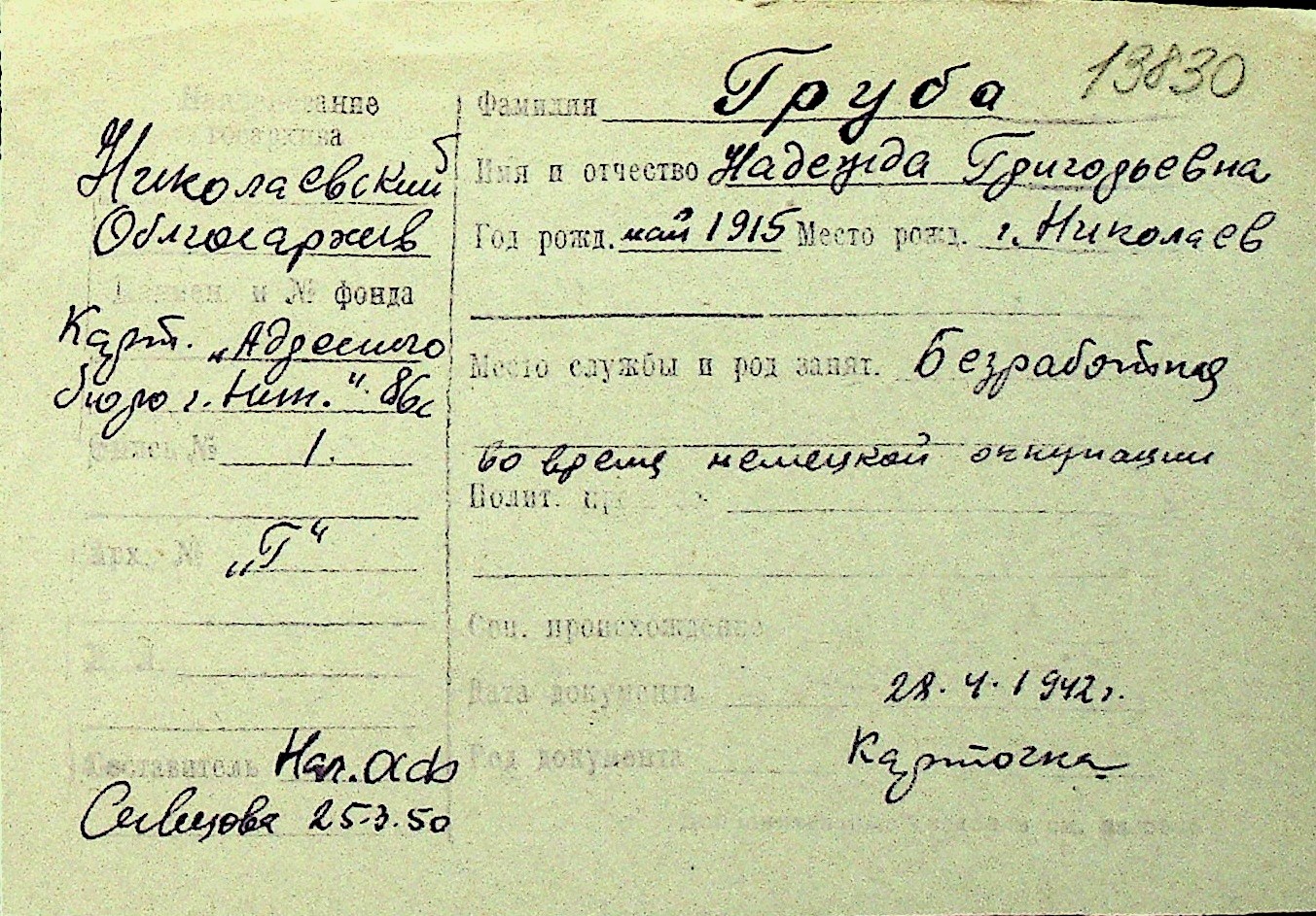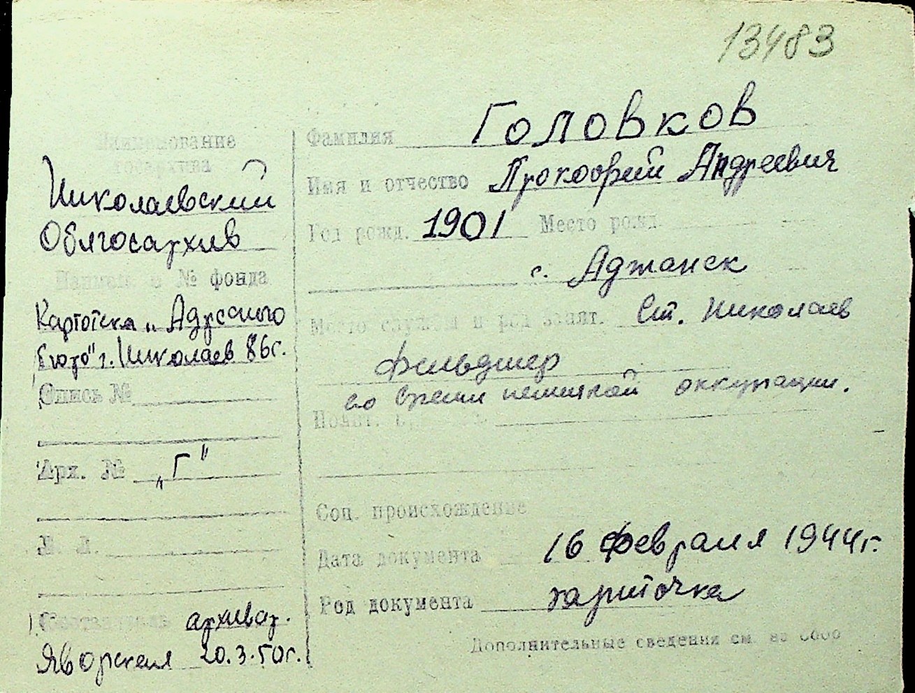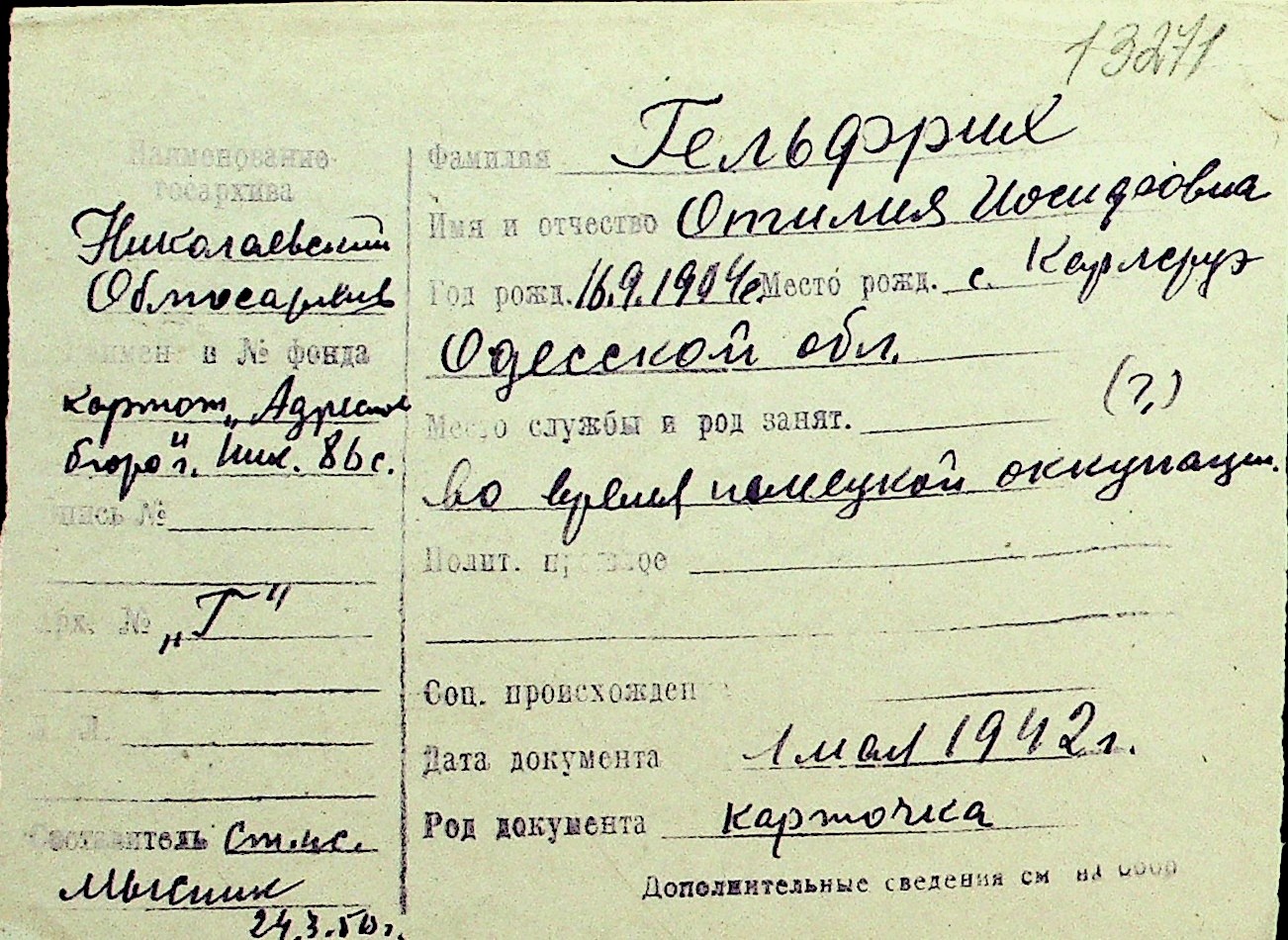 • • Перелік карток до фонду № Н-1016