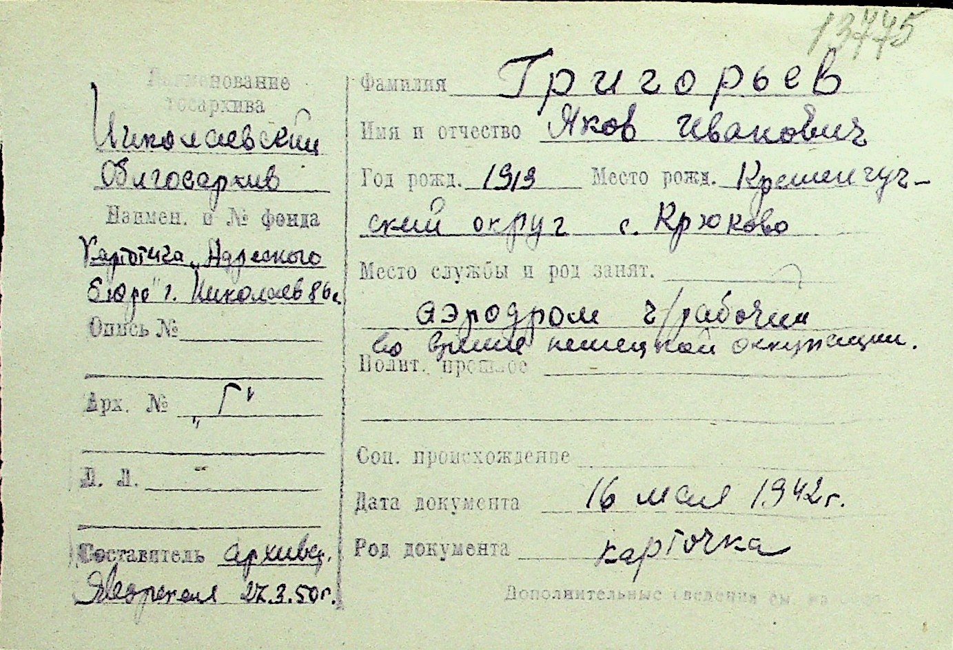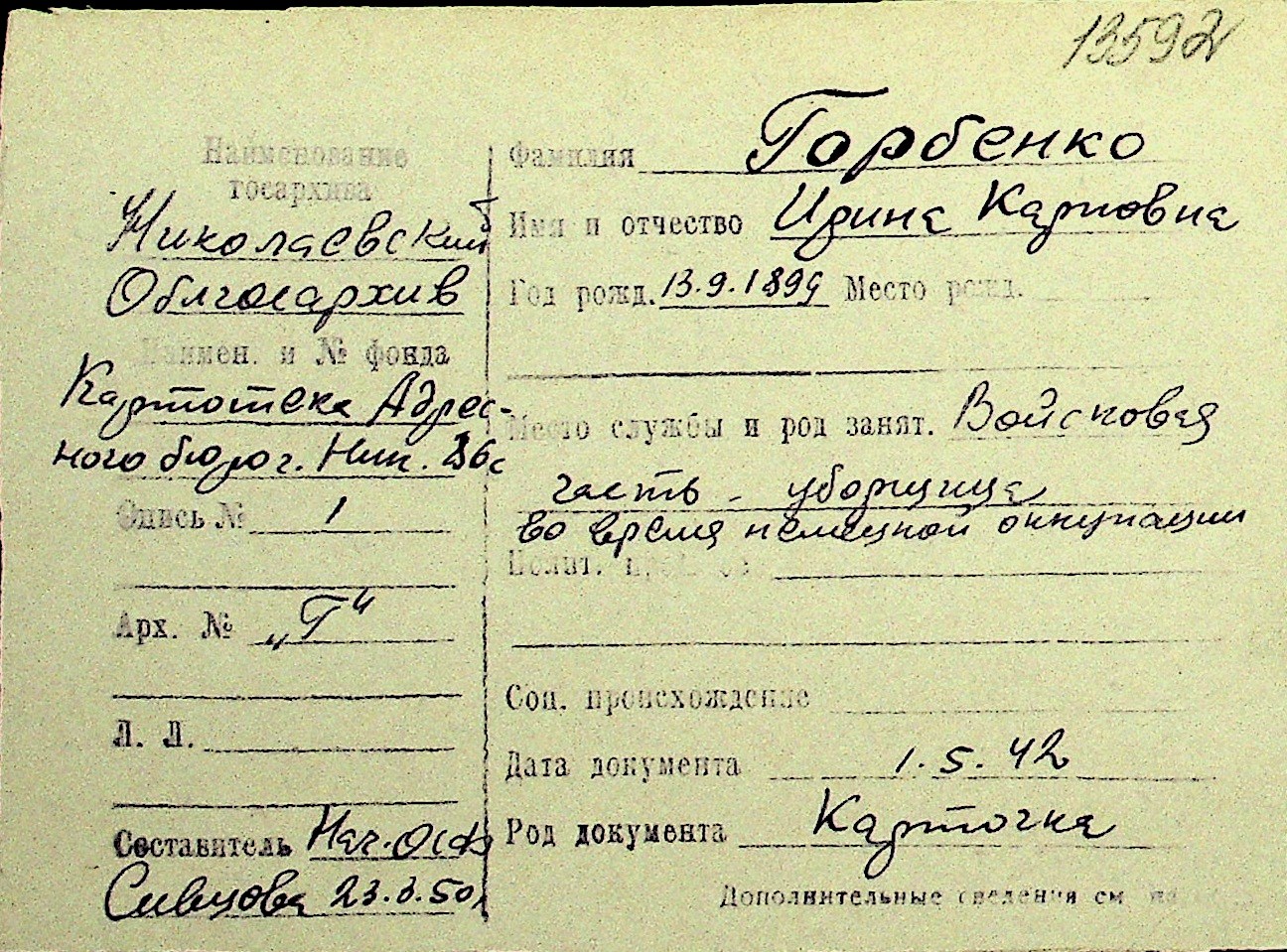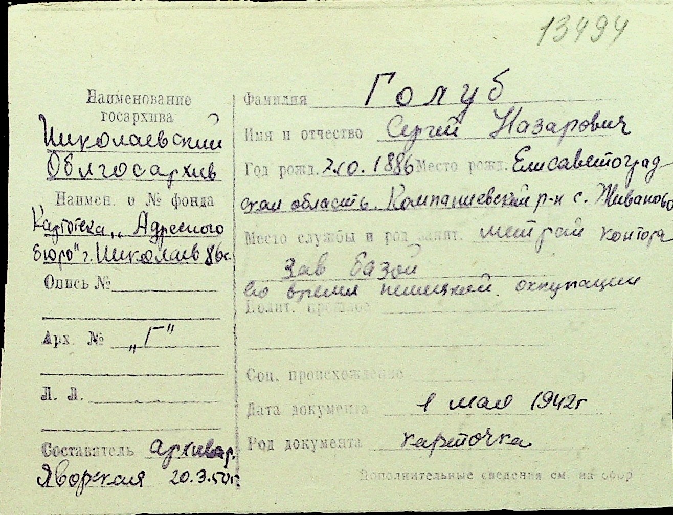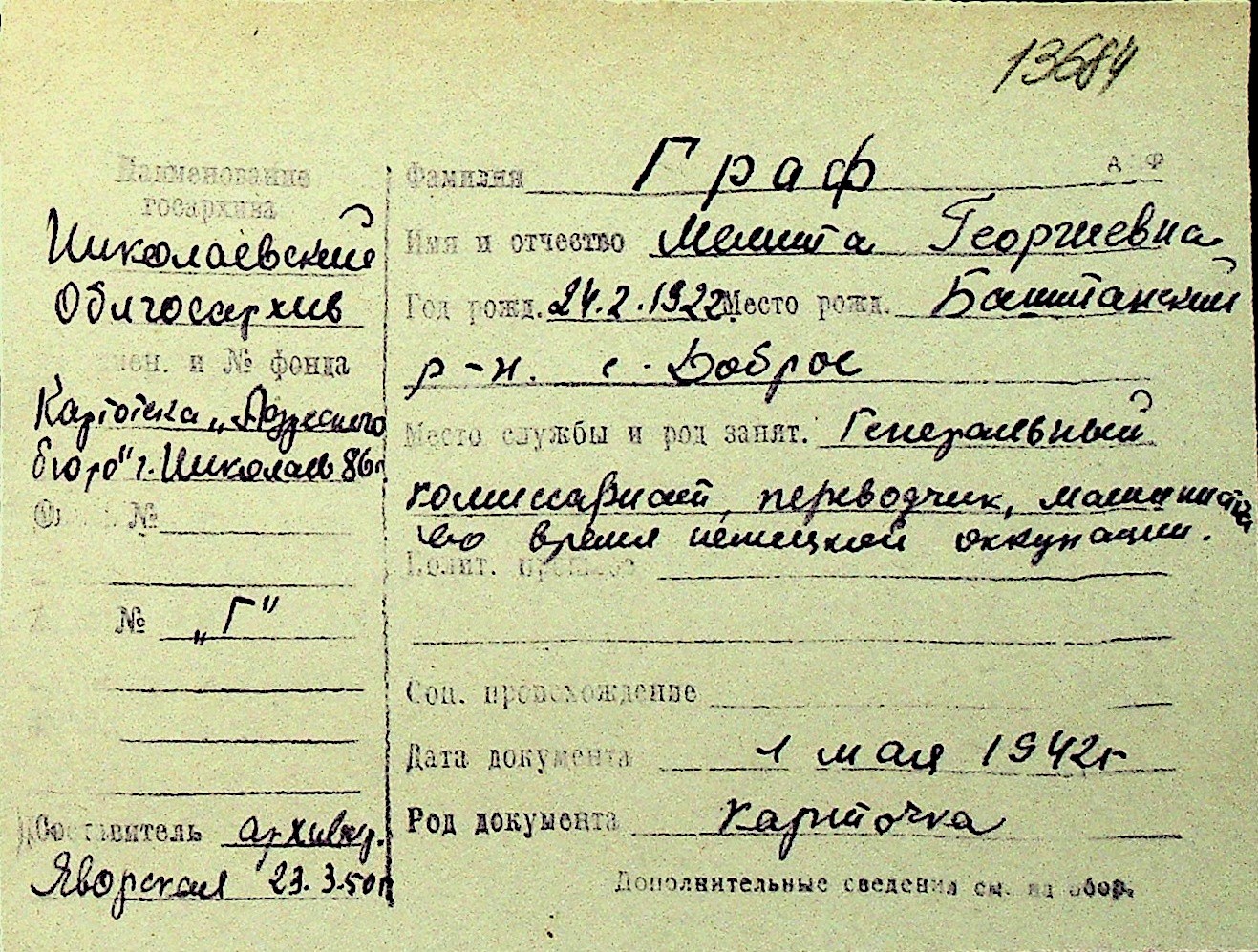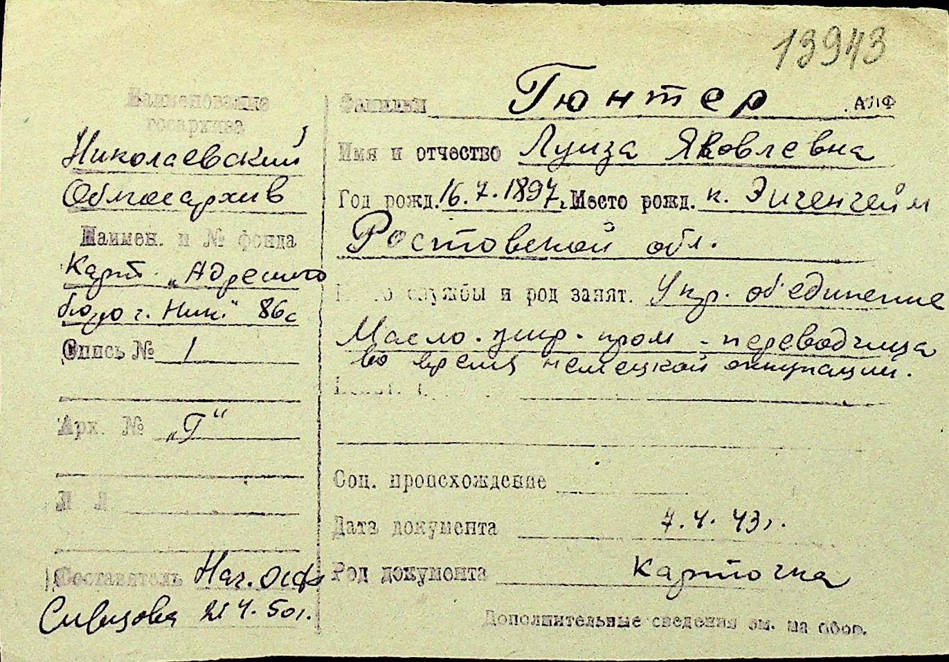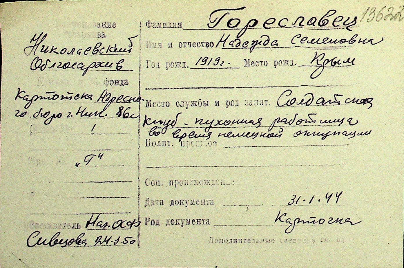 • • Перелік карток до фонду № Н-1016