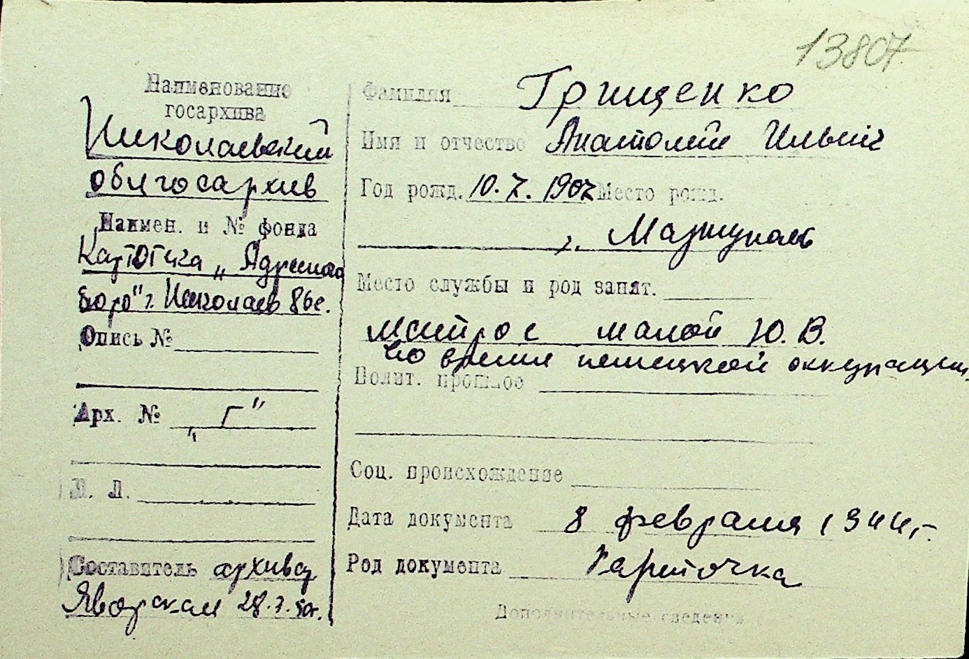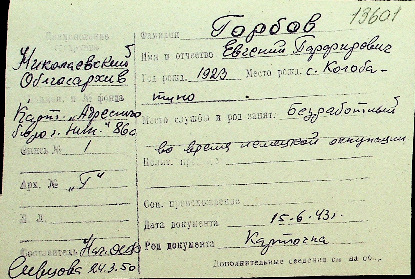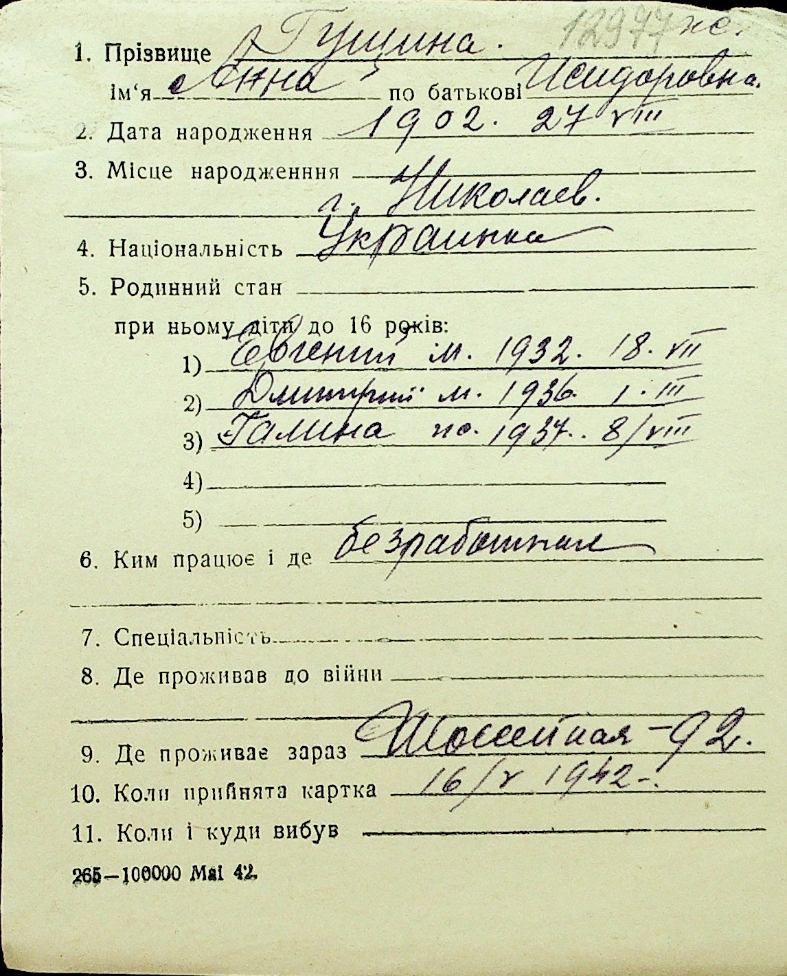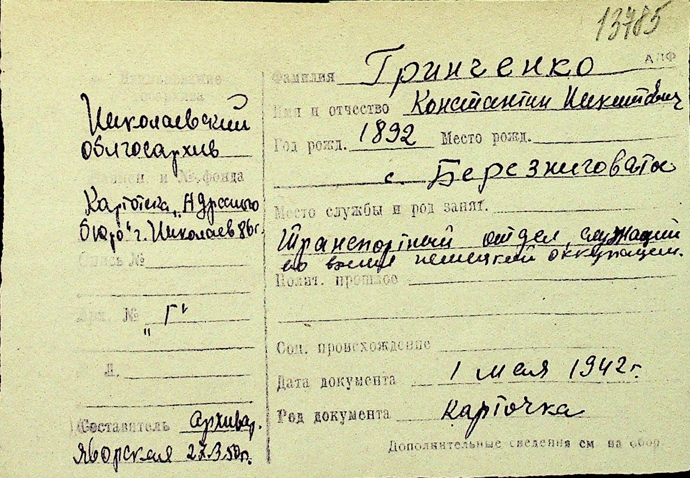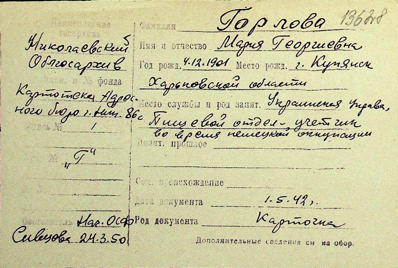• • Перелік карток до фонду № Н-1016