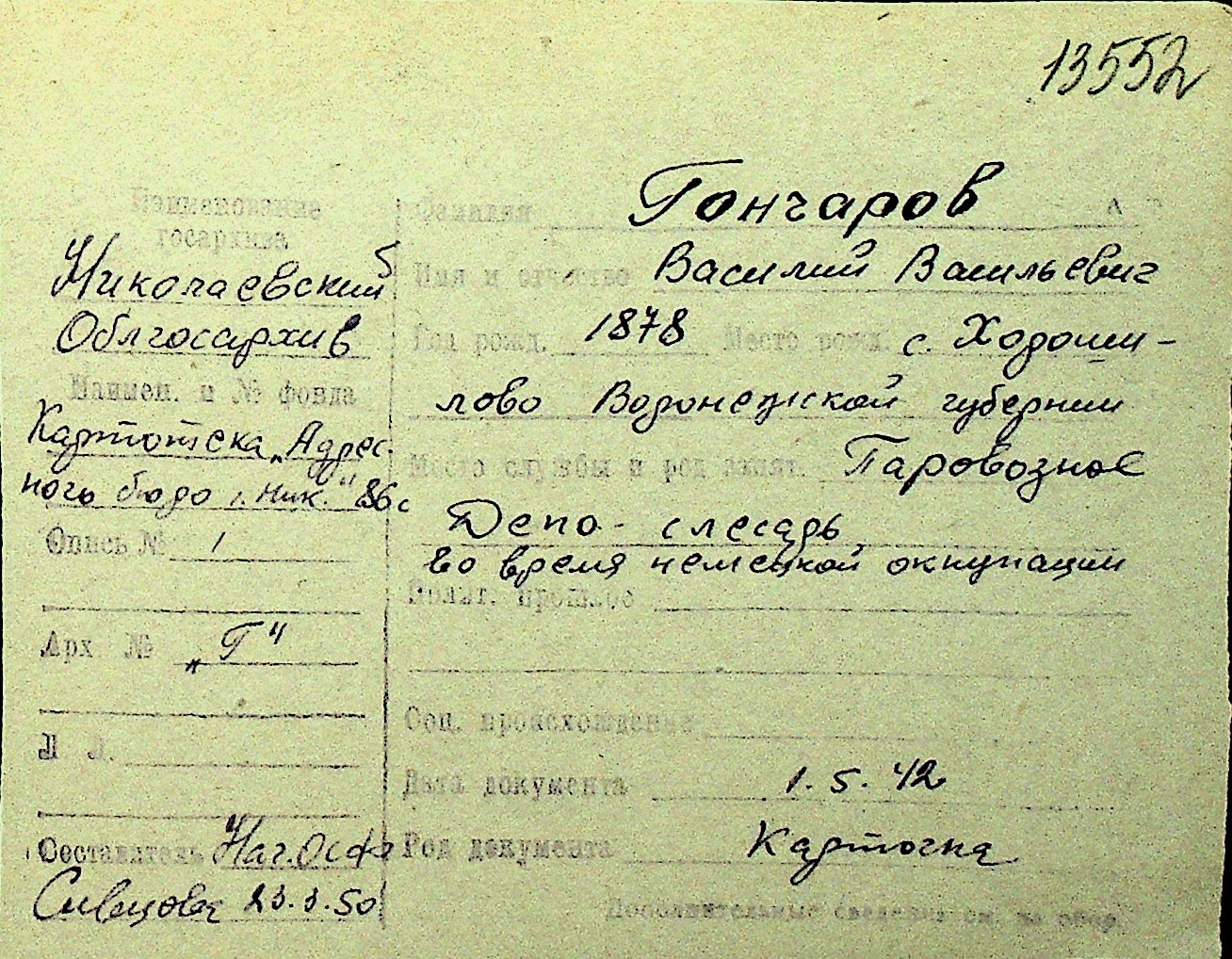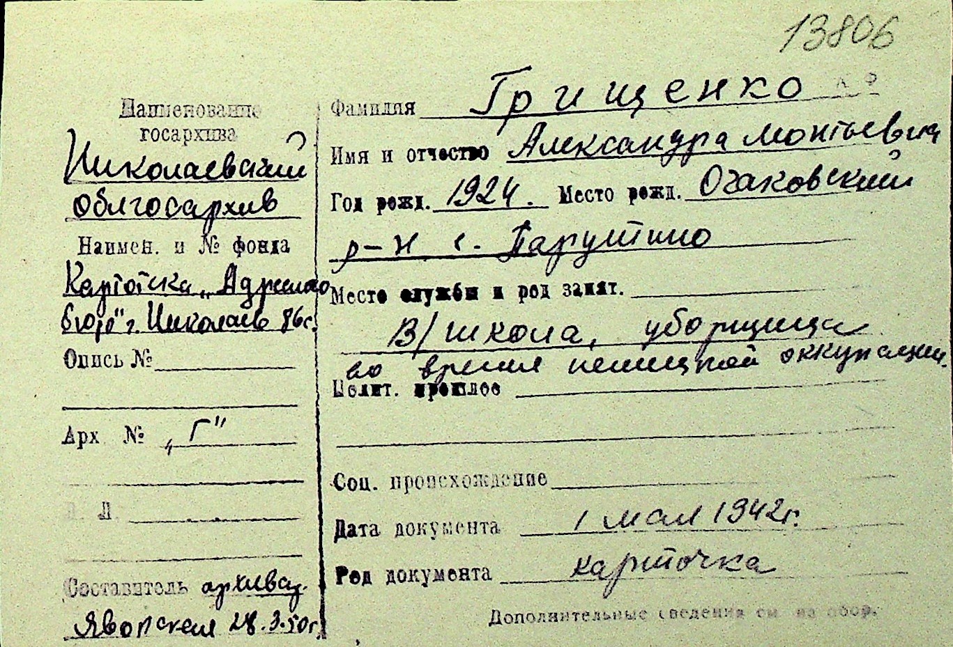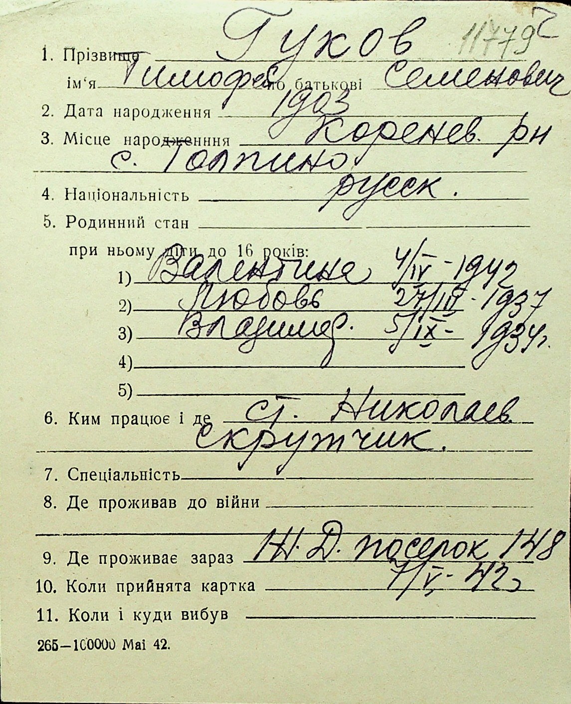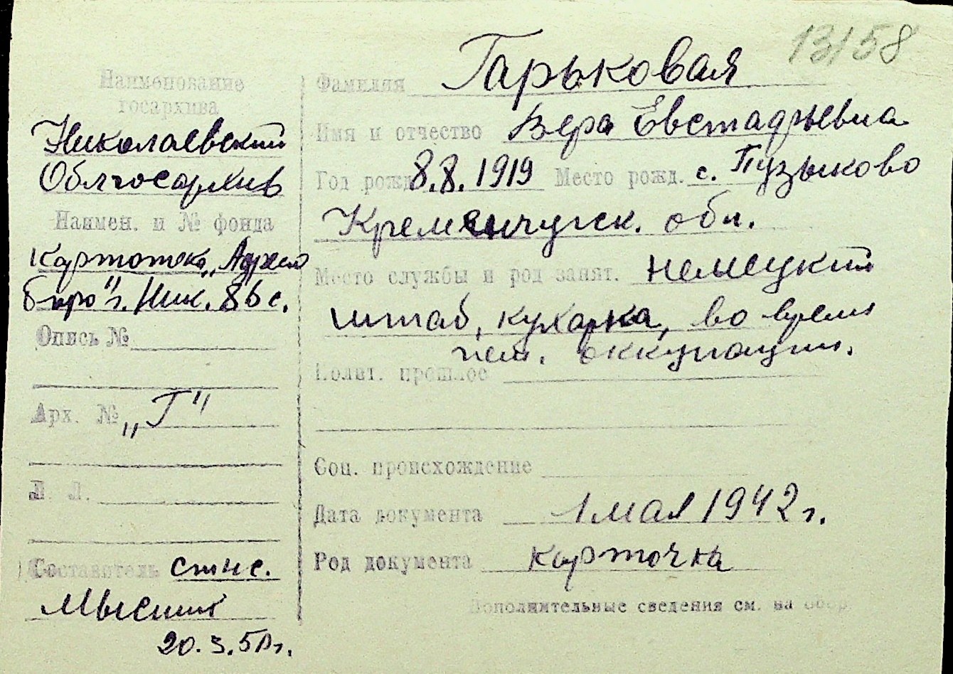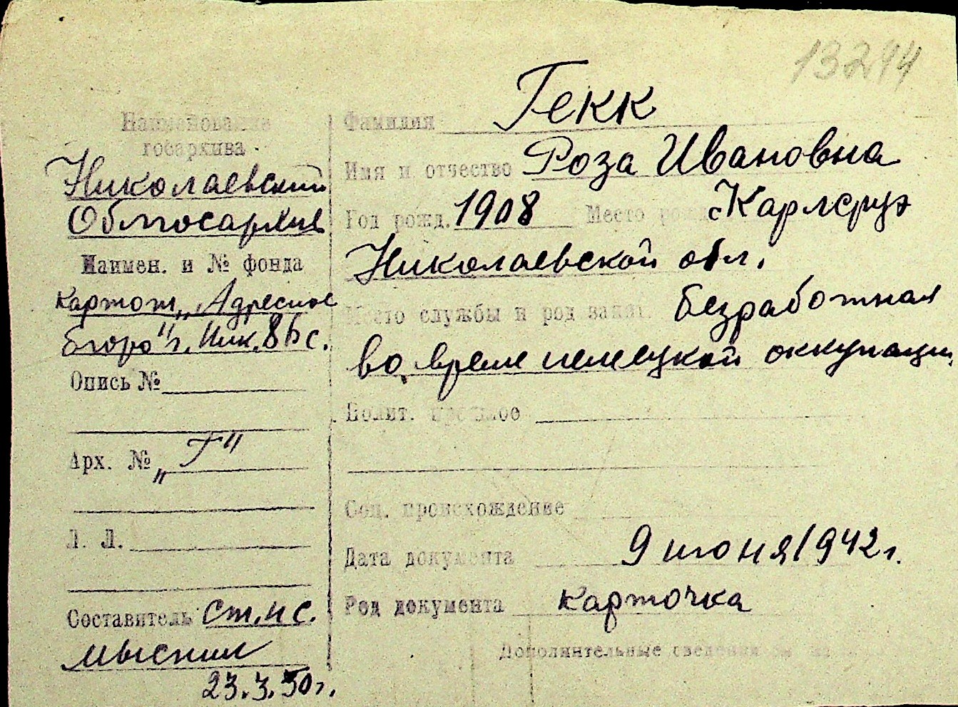 • • Перелік карток до фонду № Н-1016