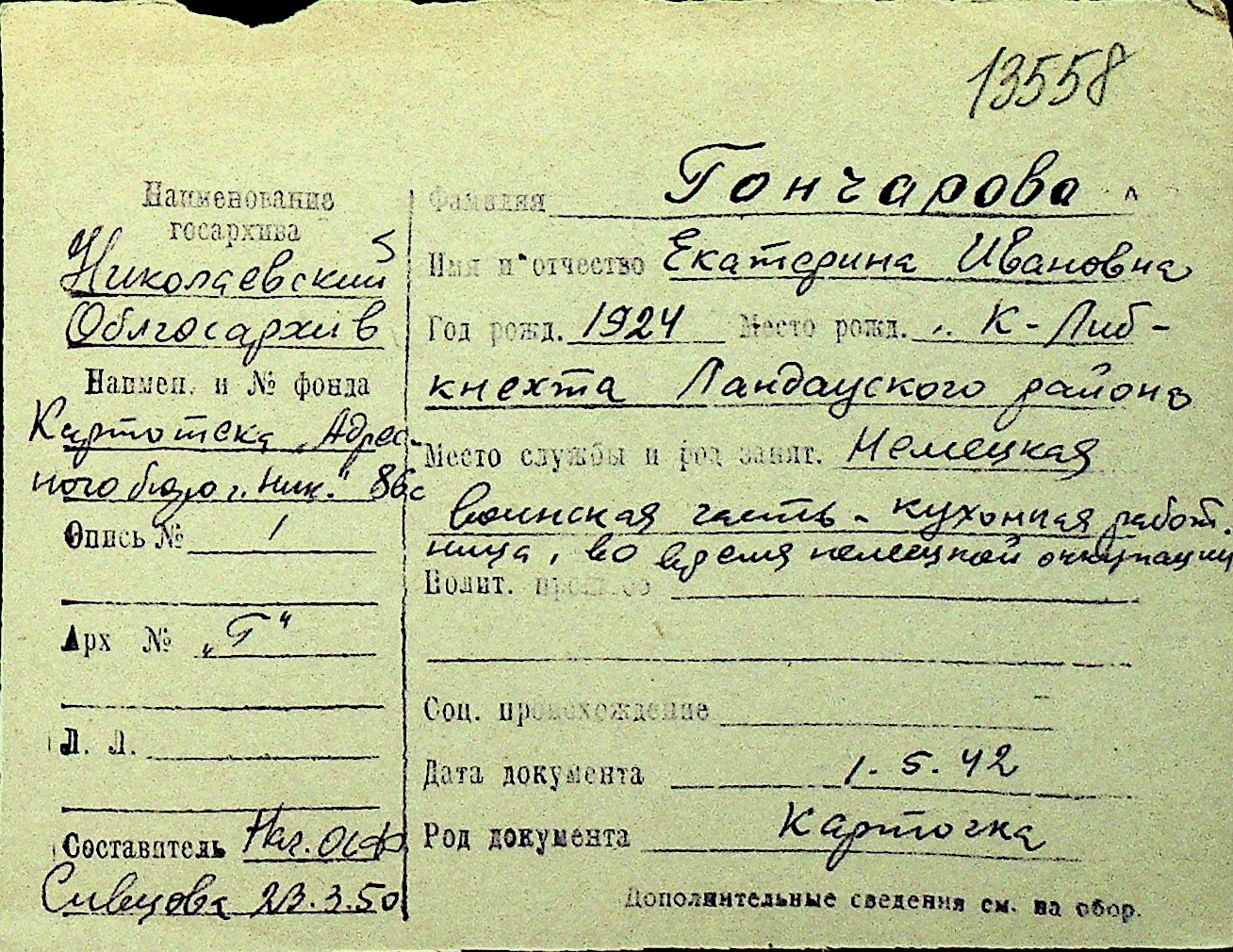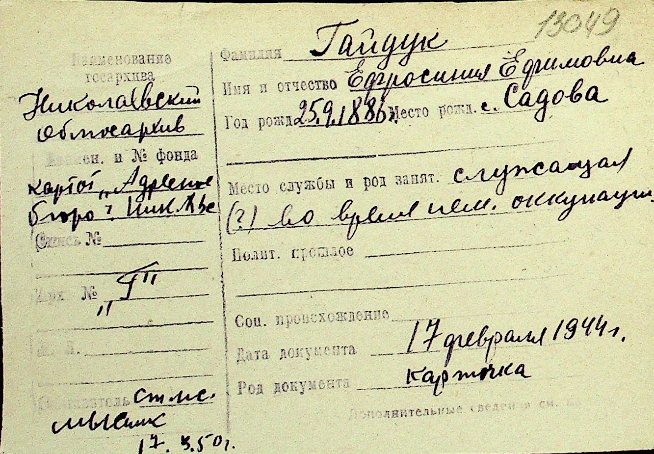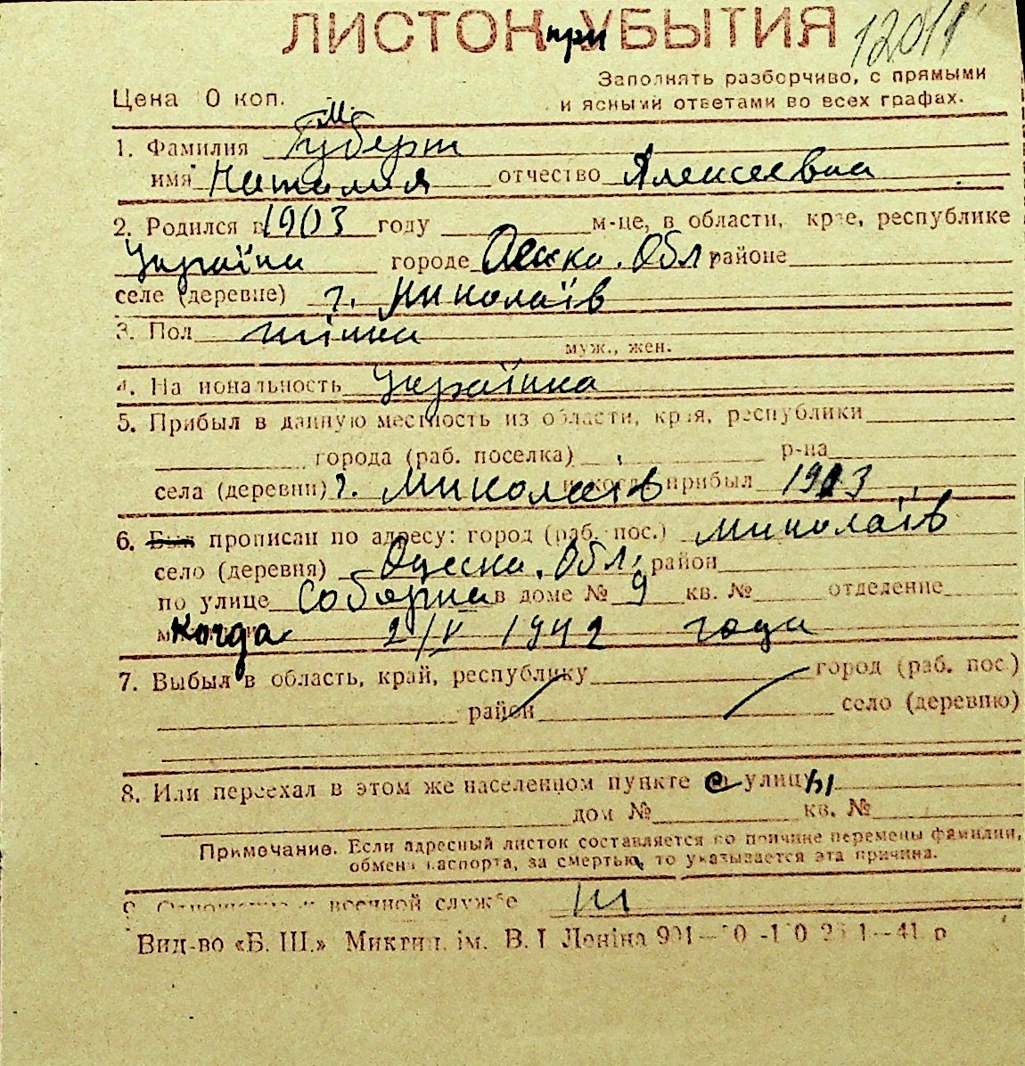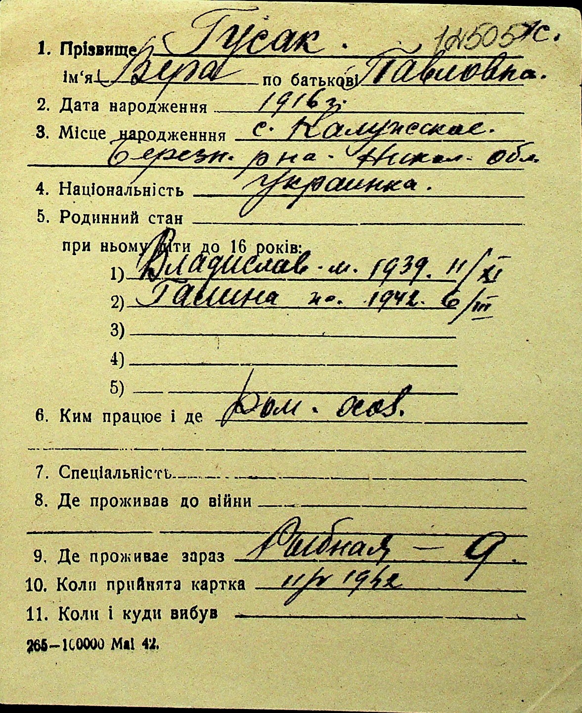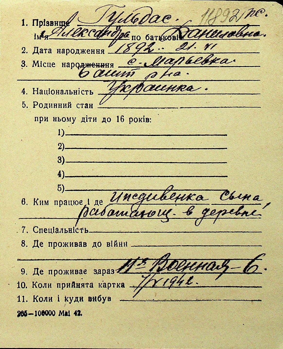 • • Перелік карток до фонду № Н-1016