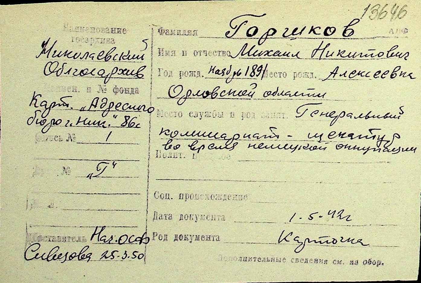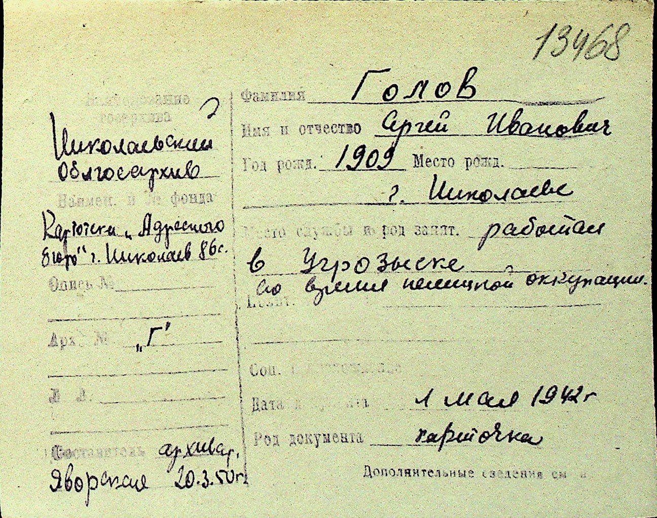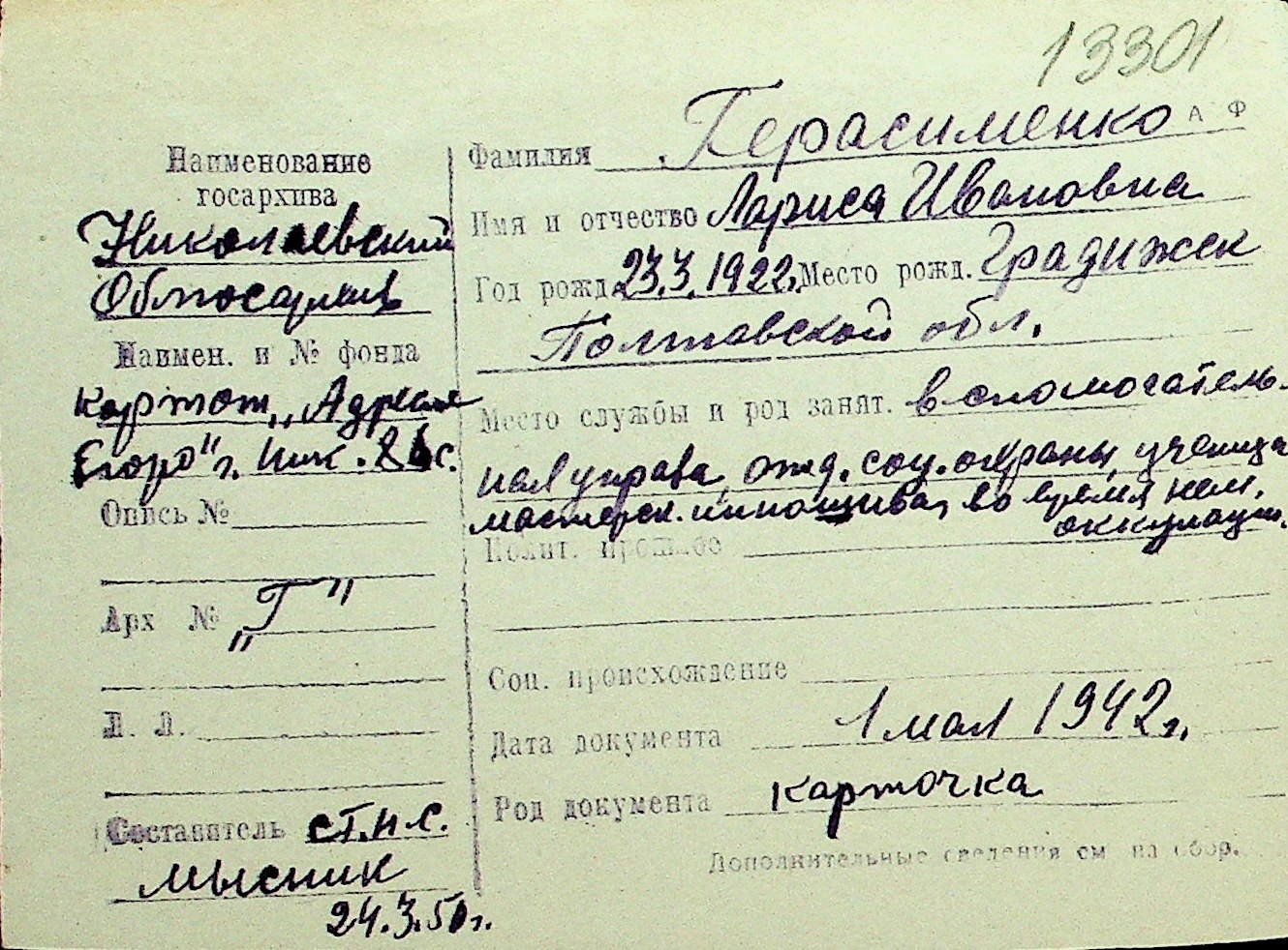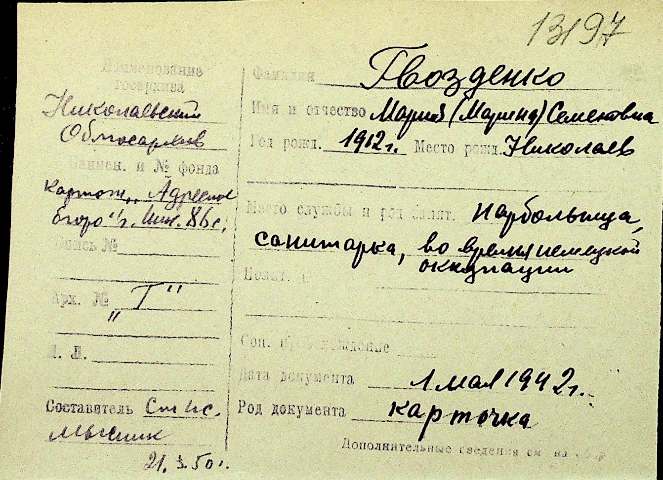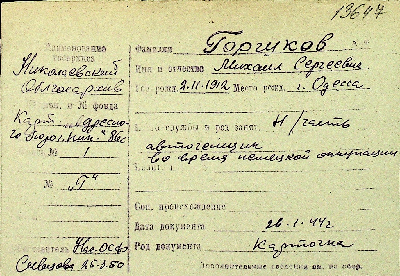 • • Перелік карток до фонду № Н-1016