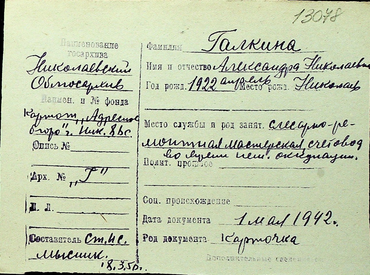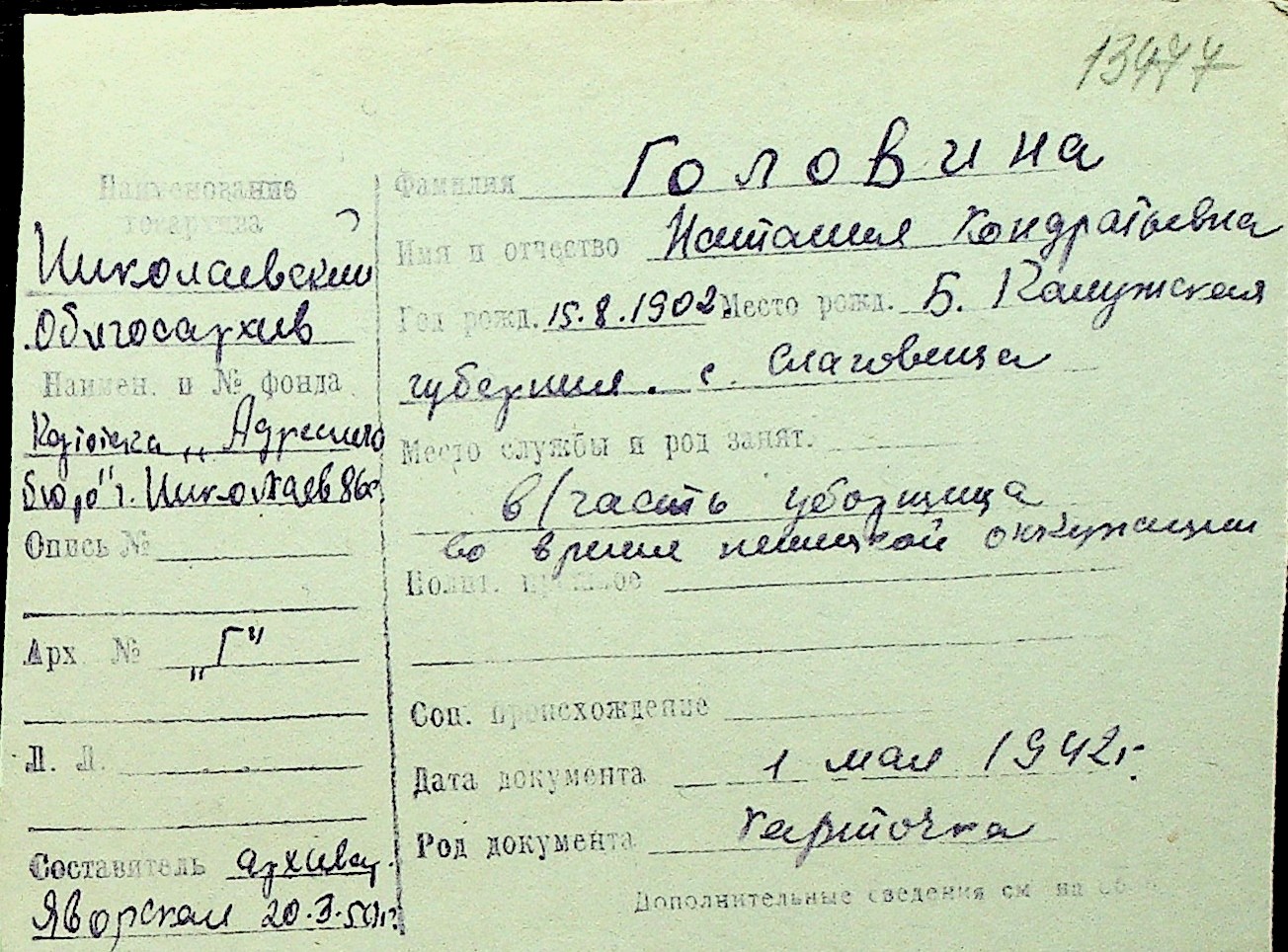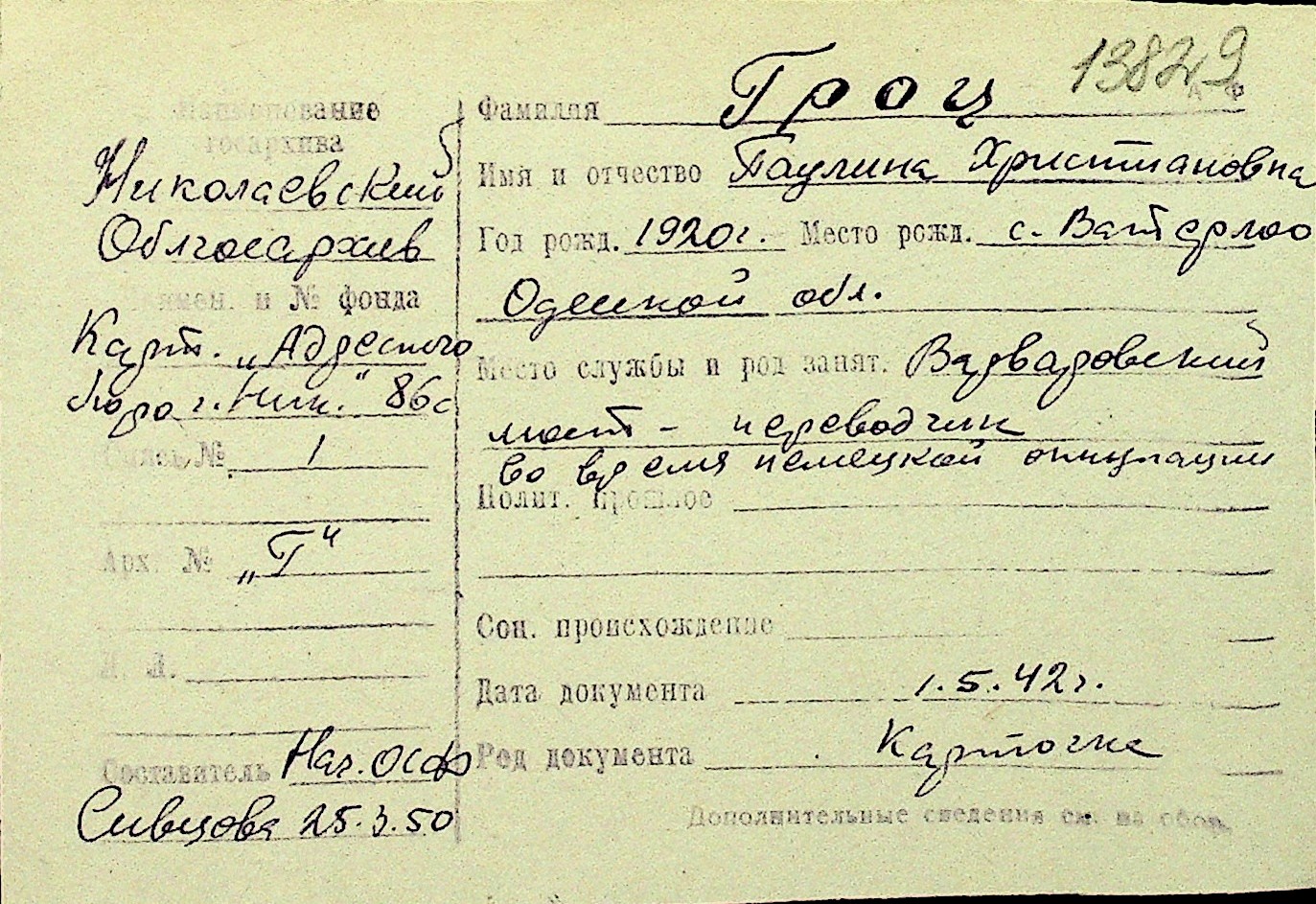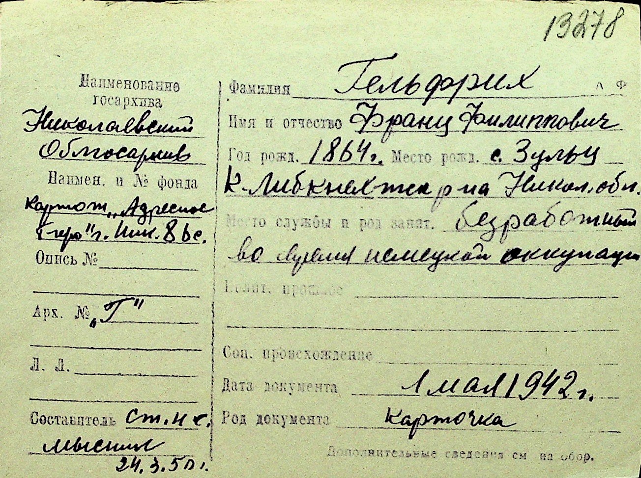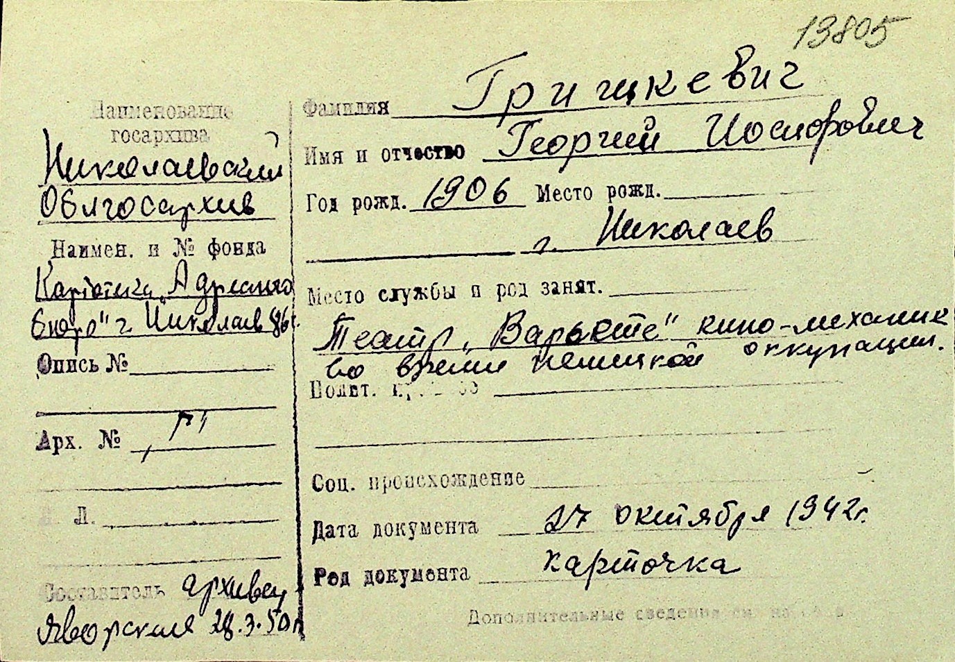 • • Перелік карток до фонду № Н-1016