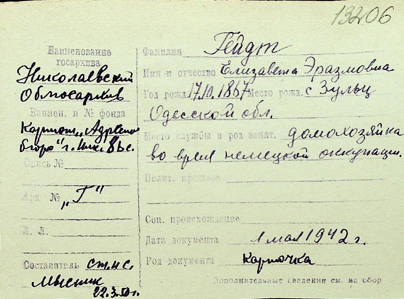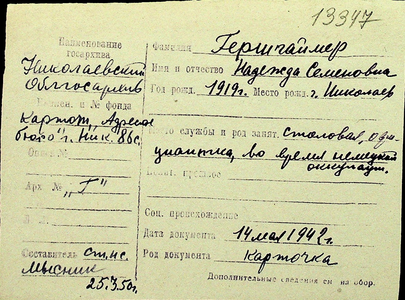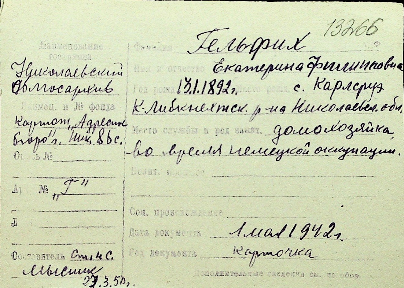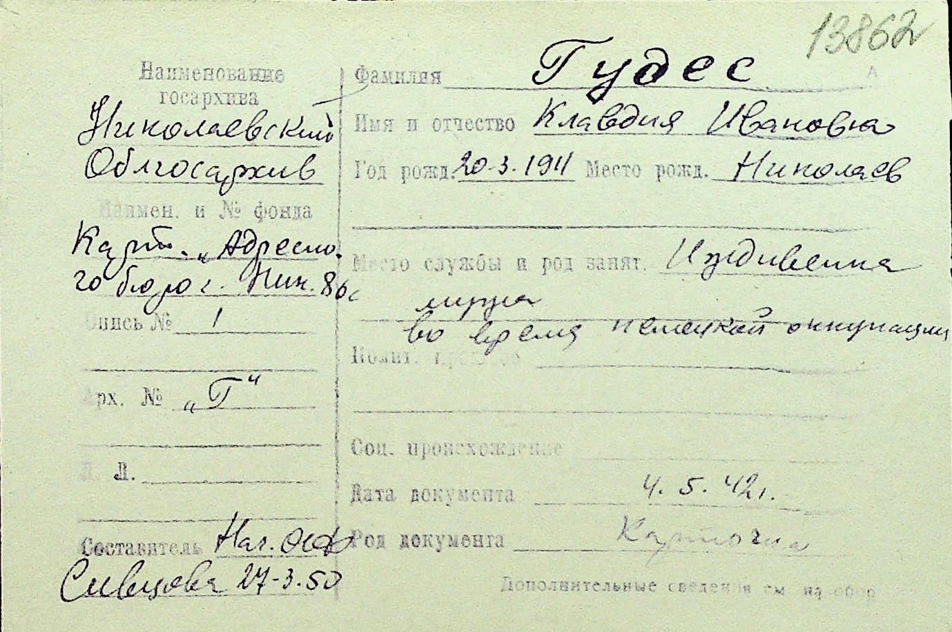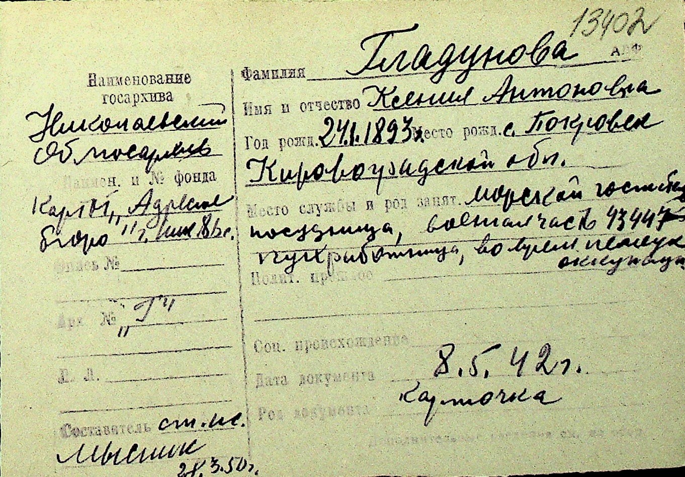 • • Перелік карток до фонду № Н-1016