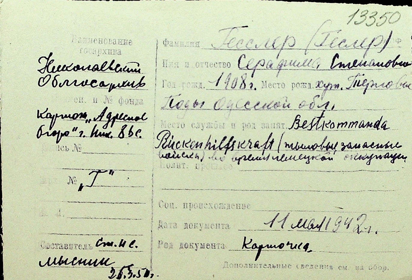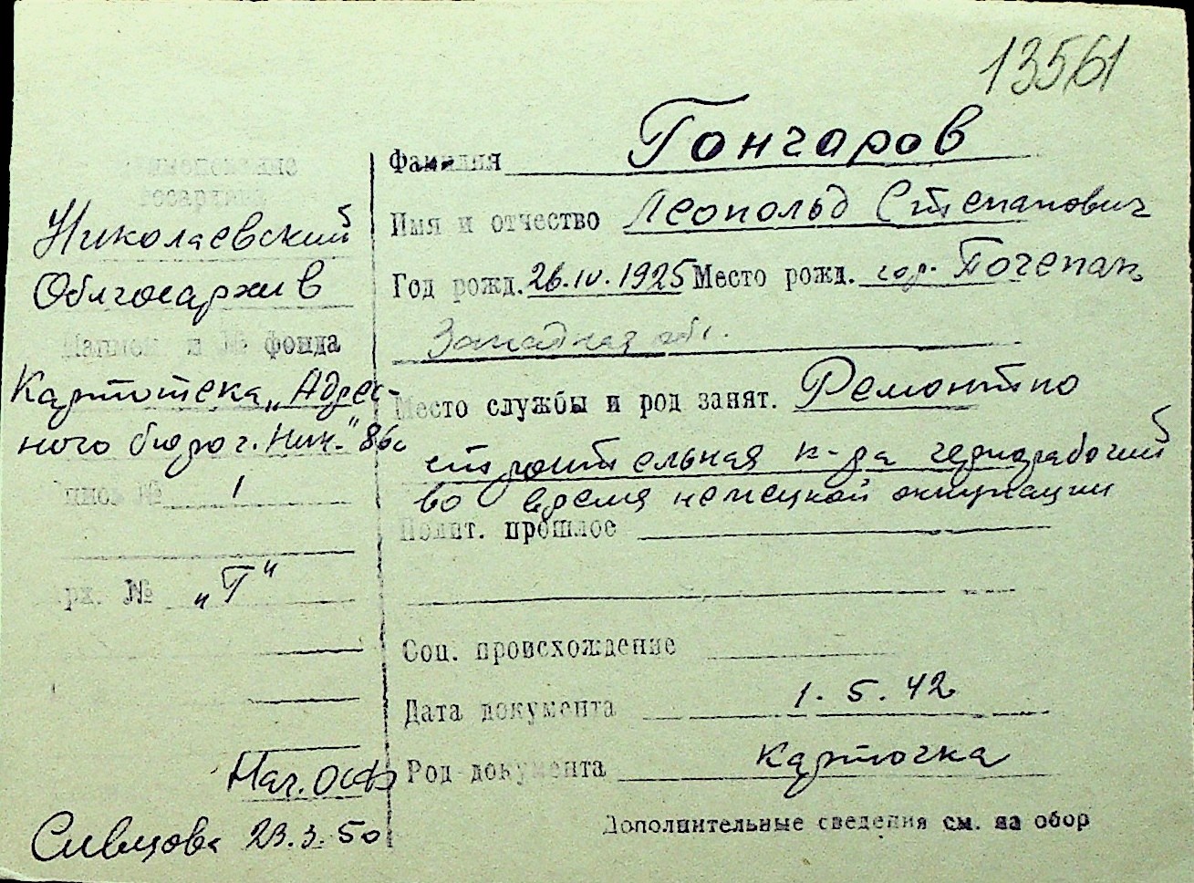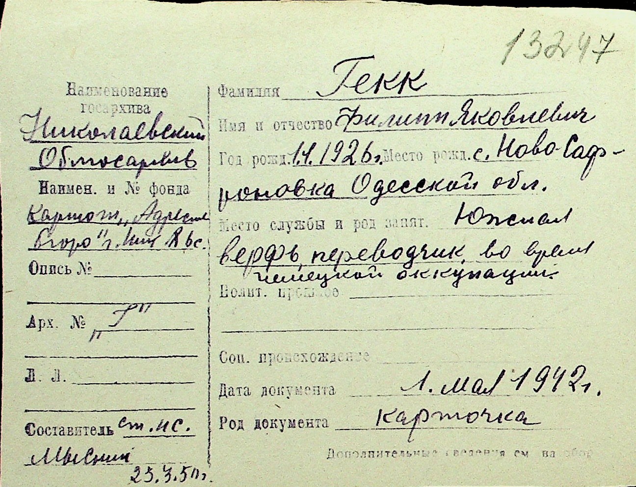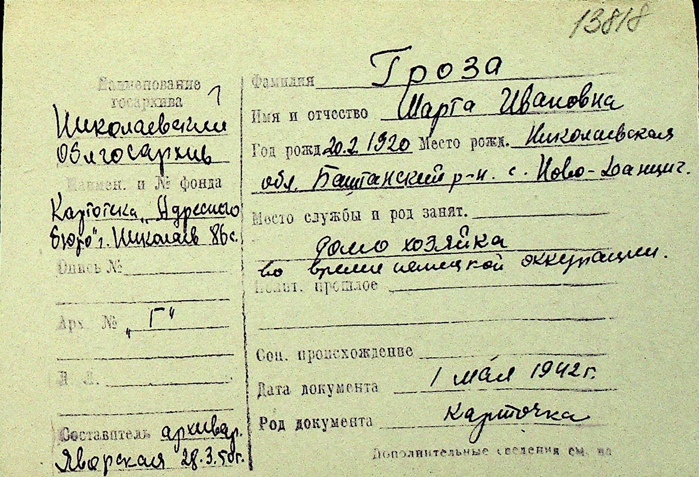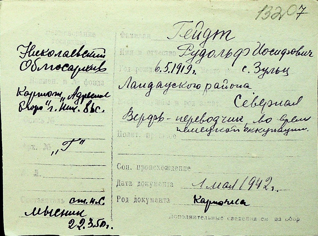 • • Перелік карток до фонду № Н-1016